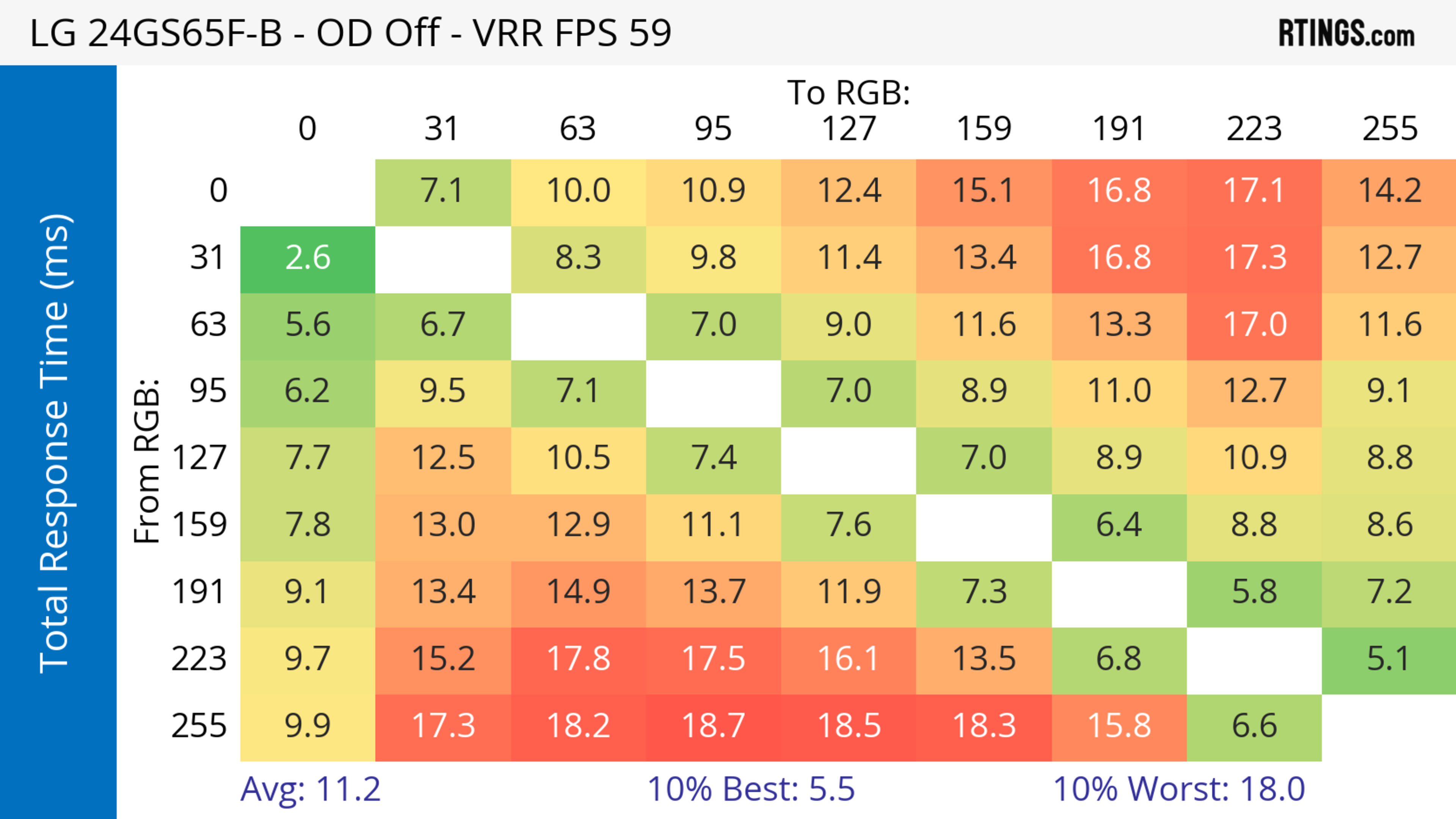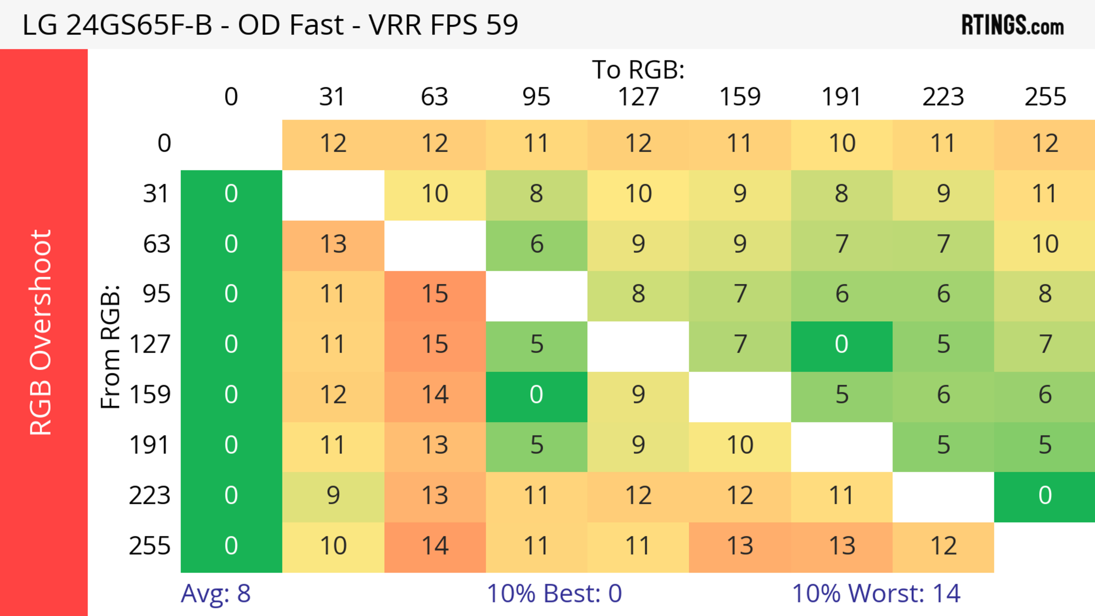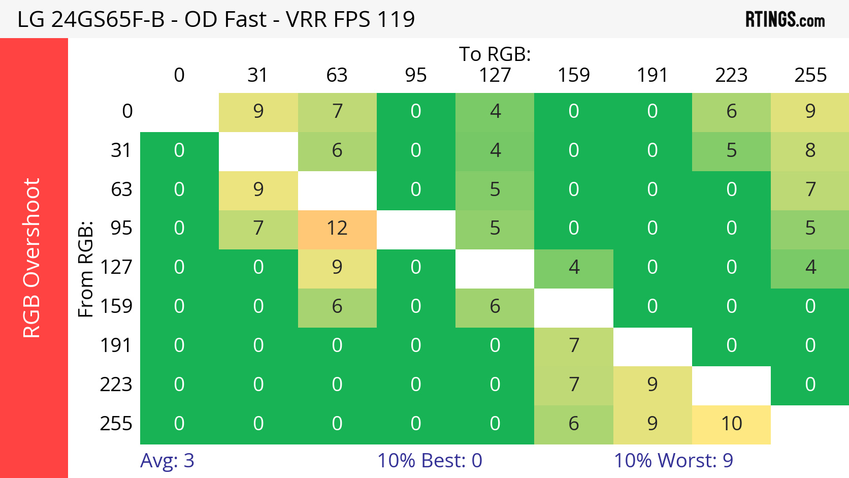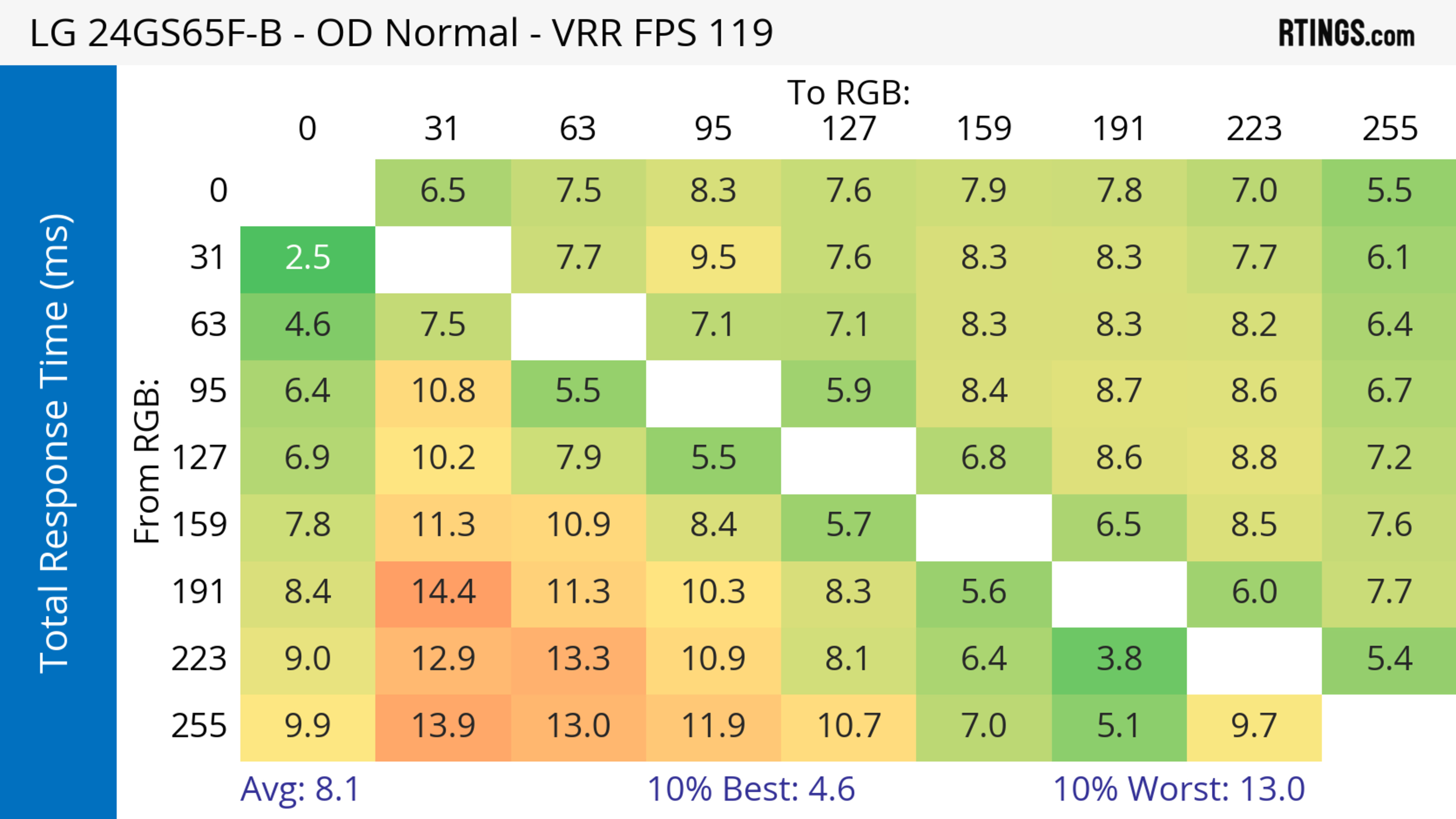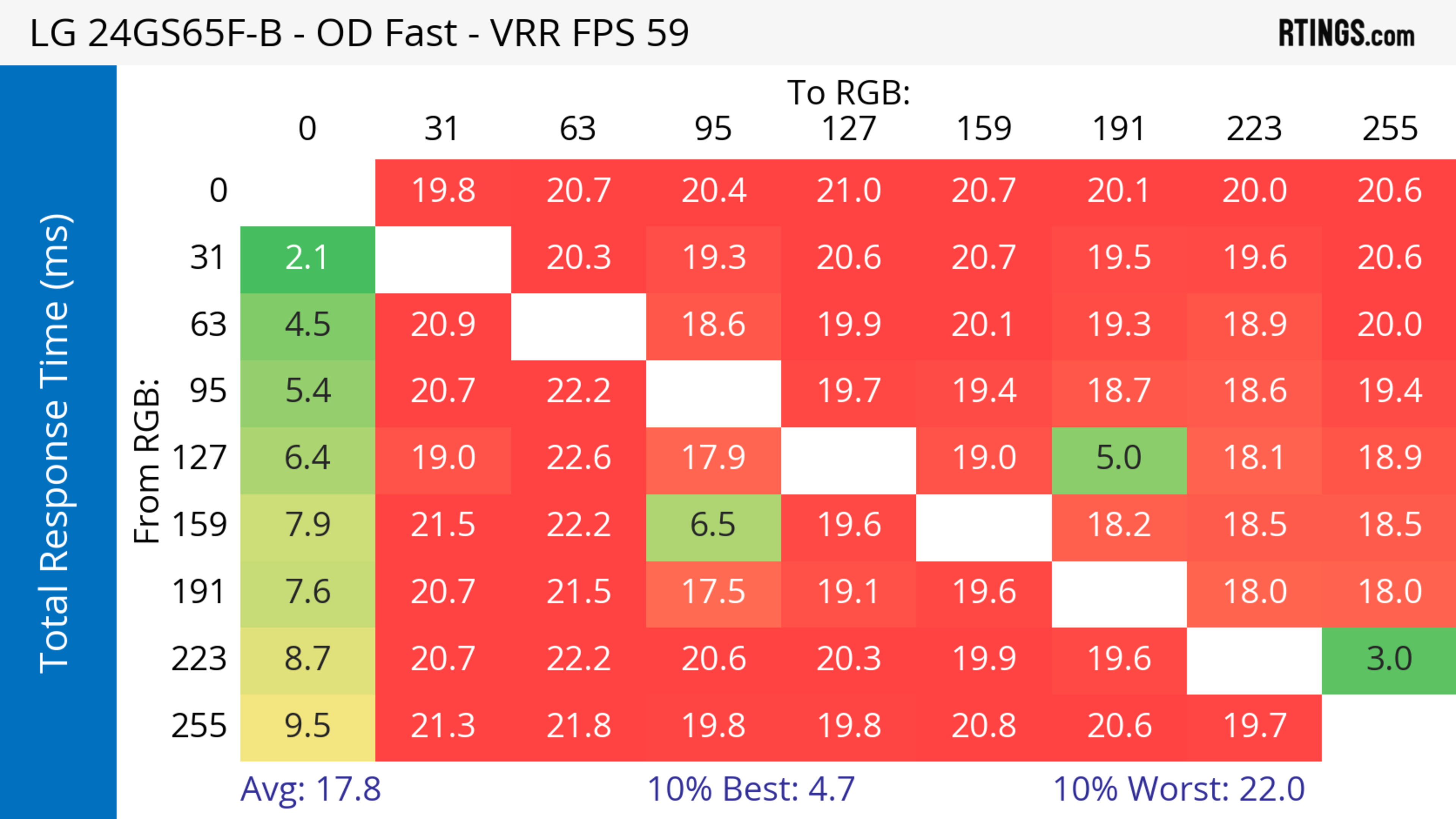 The LG 24GS65F-B has good motion handling across its VRR range. The 'Fast' Response Time setting performs the best at most refresh rates, with only a bit of blur, but it has more inverse ghosting than 'Normal' and 'Off' at low refresh rates. The 'Faster' setting has such high CAD that it passes the limits of our chart, which you can see in an alternative graph.