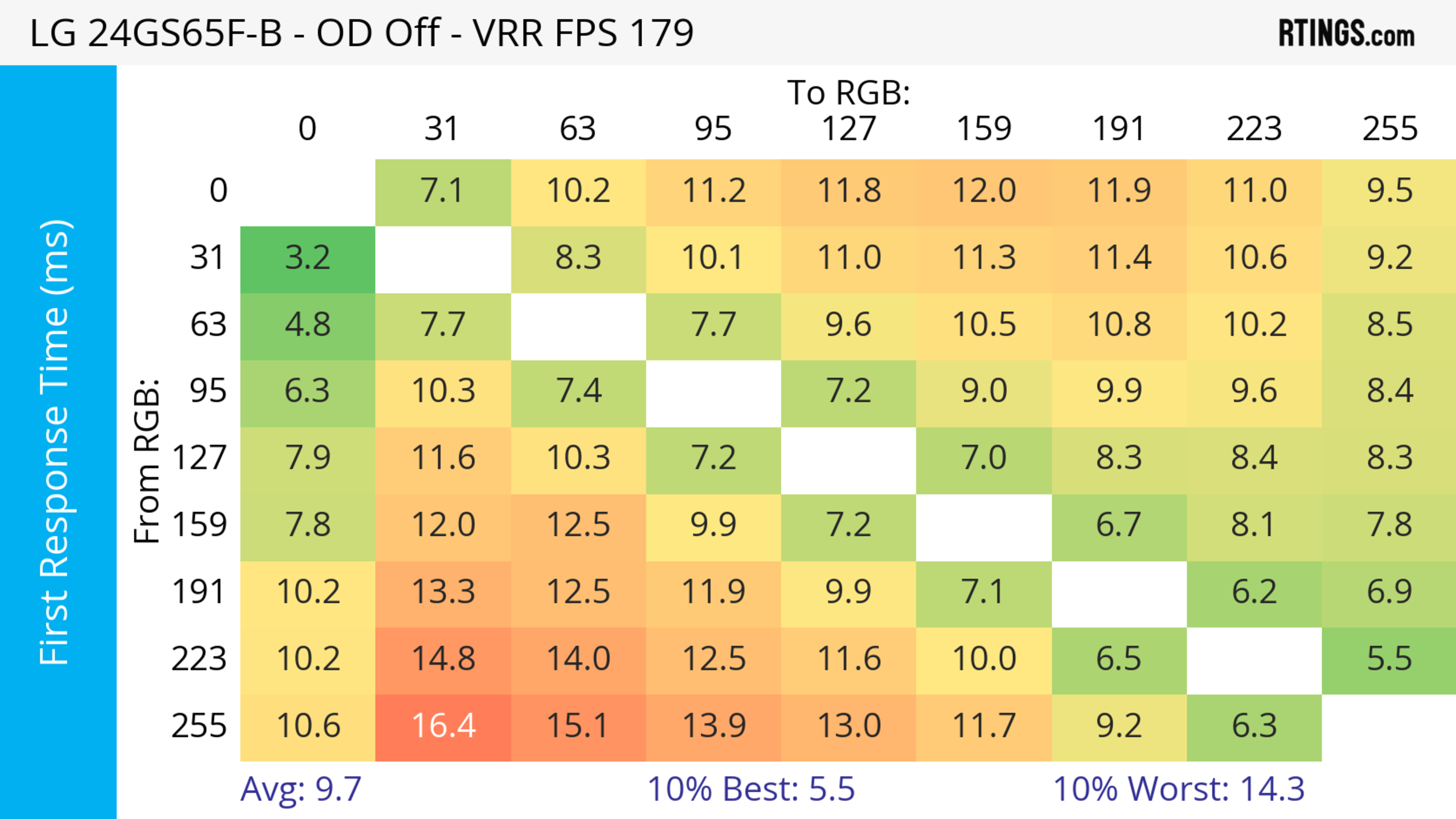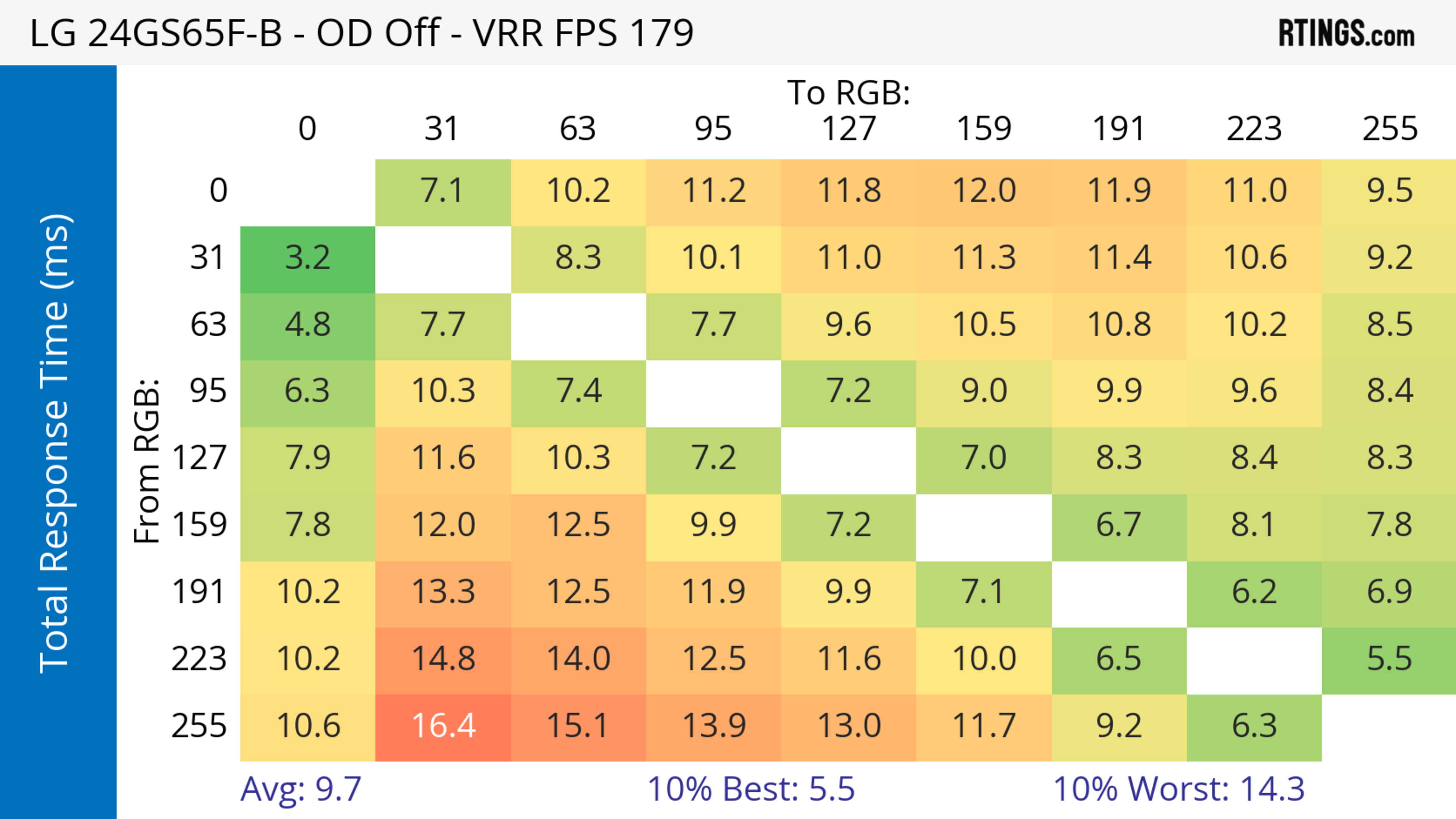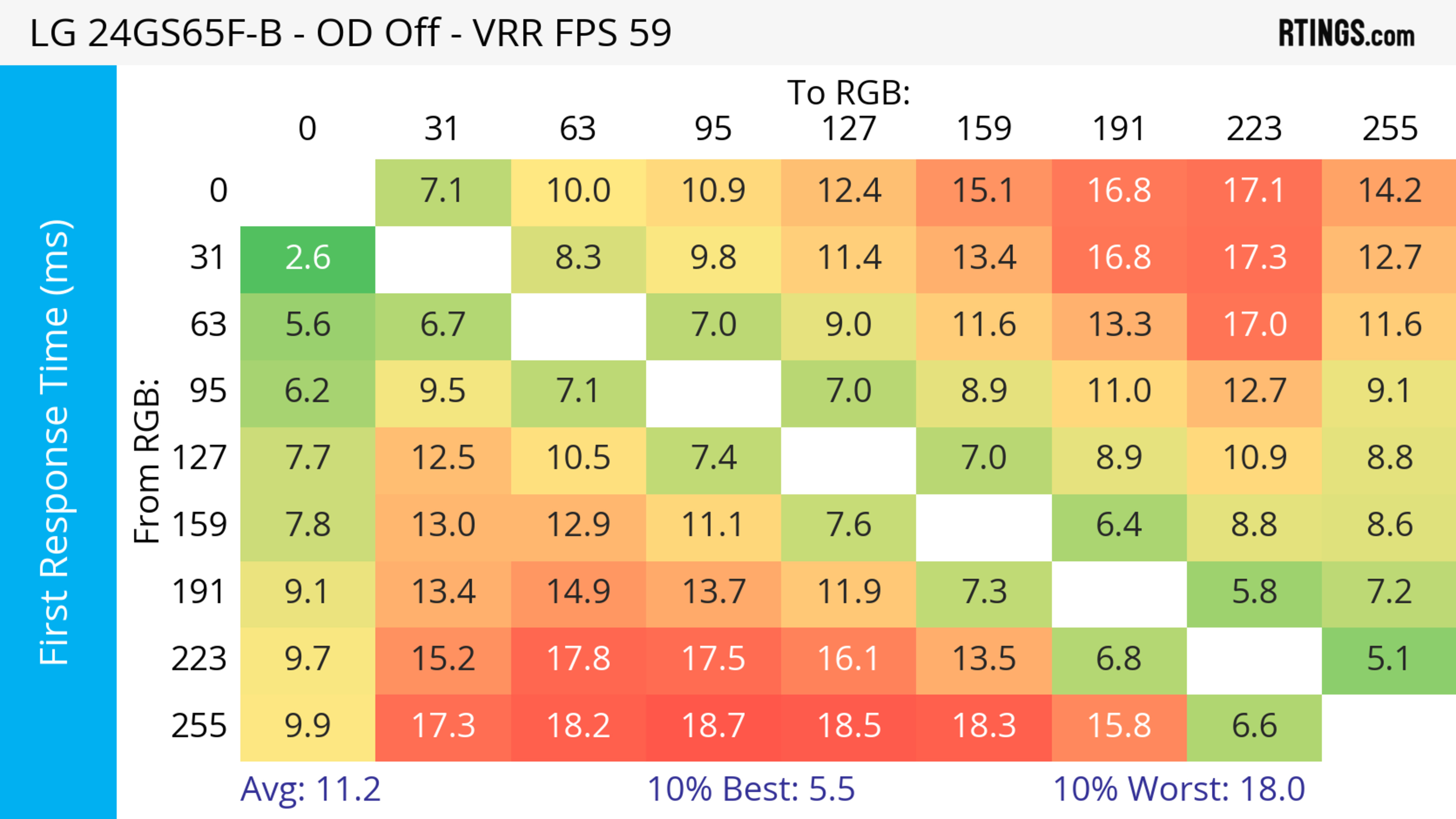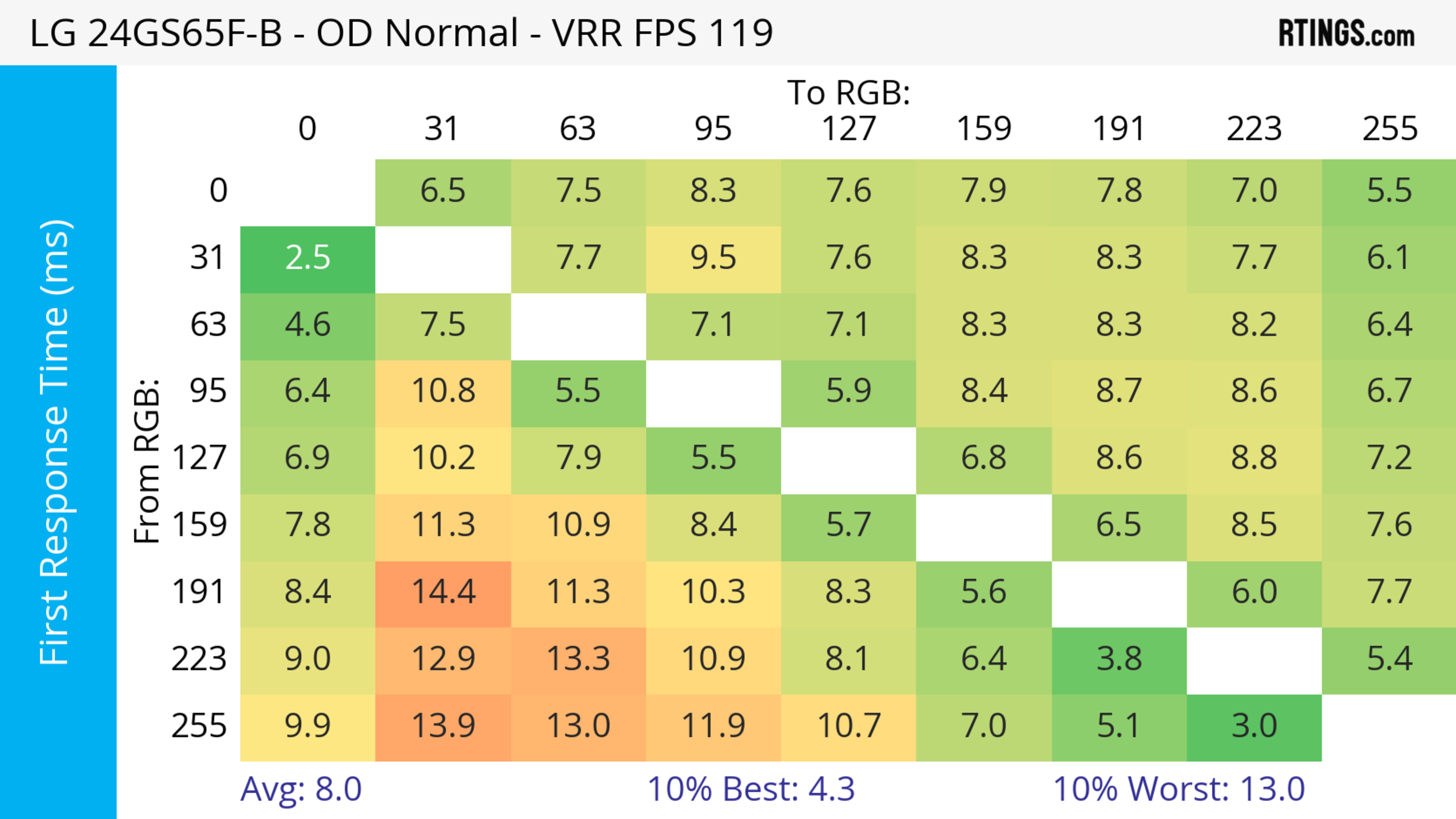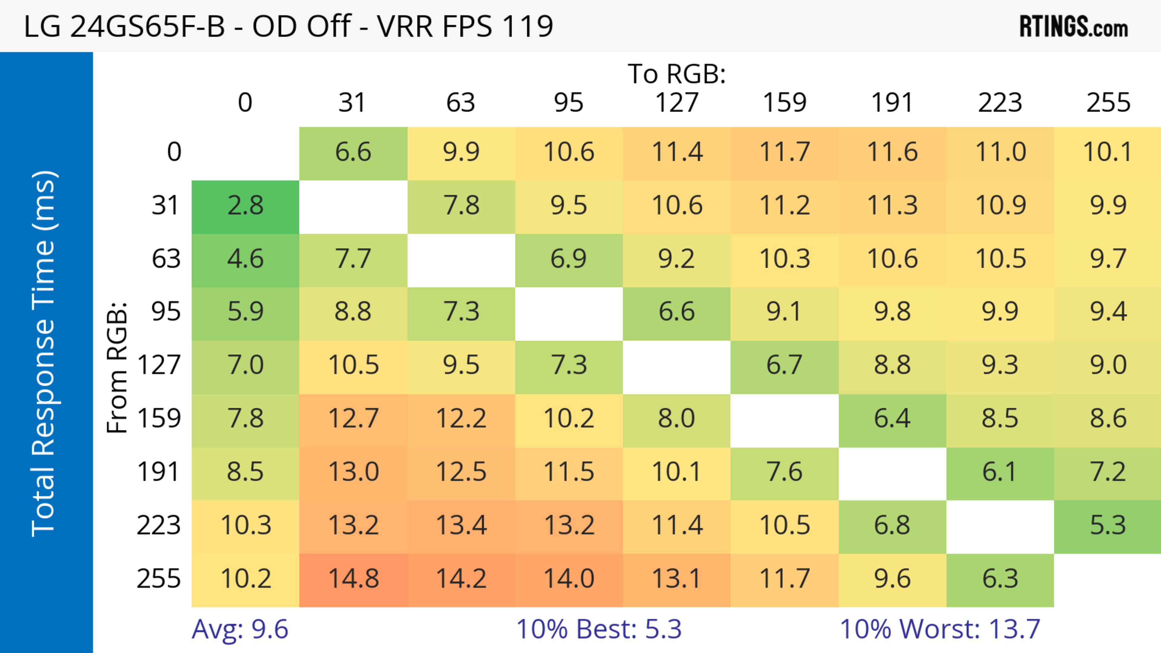 The LG 24GS65F-B has good motion handling across its VRR range. The 'Fast' Response Time setting performs the best at most refresh rates, with only a bit of blur, but it has more inverse ghosting than 'Normal' and 'Off' at low refresh rates. The 'Faster' setting has such high CAD that it passes the limits of our chart, which you can see in an alternative graph.