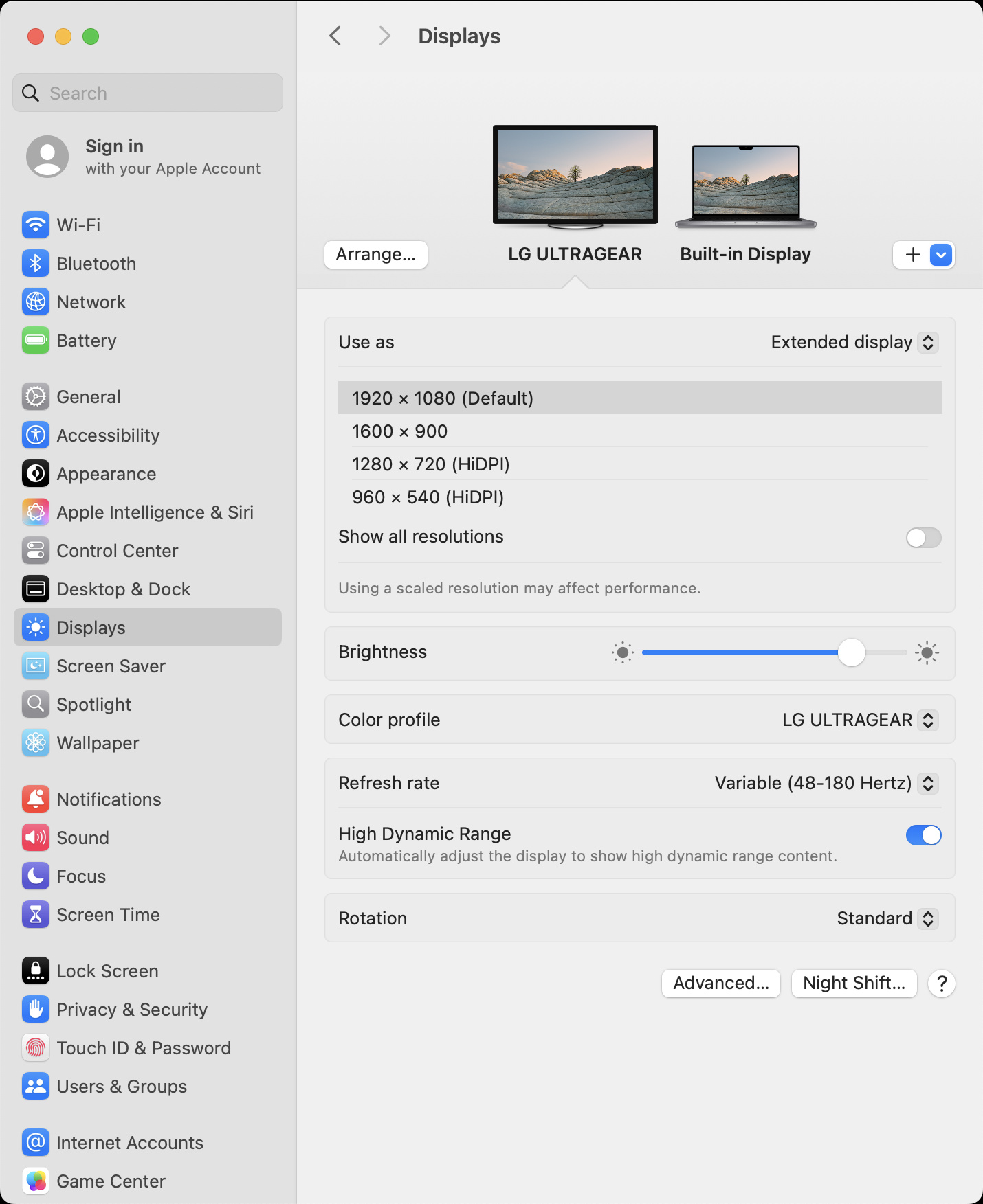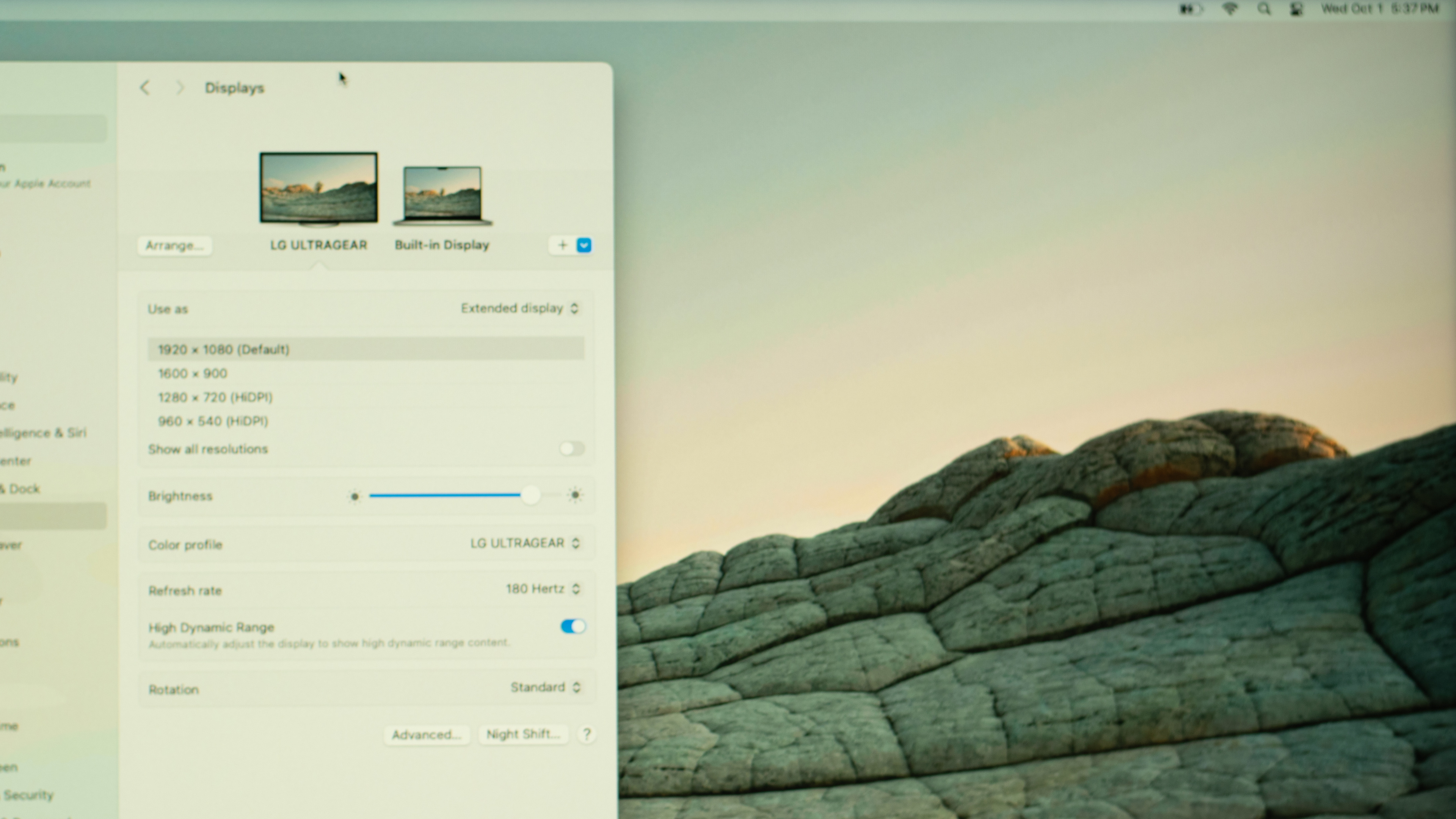If you're using a MacBook with either connection, the 'Gamer 1' and 'RTS' Game Modes in HDR look closest to the laptop's display, but the monitor has a warmer color temperature. If you have the MacBook plugged into power, you can close the lid and continue using the monitor. However, without the MacBook plugged into power, the monitor goes into idle mode when you close the lid. When reopening the lid or waking the laptop up from sleep, windows return to their original positions.