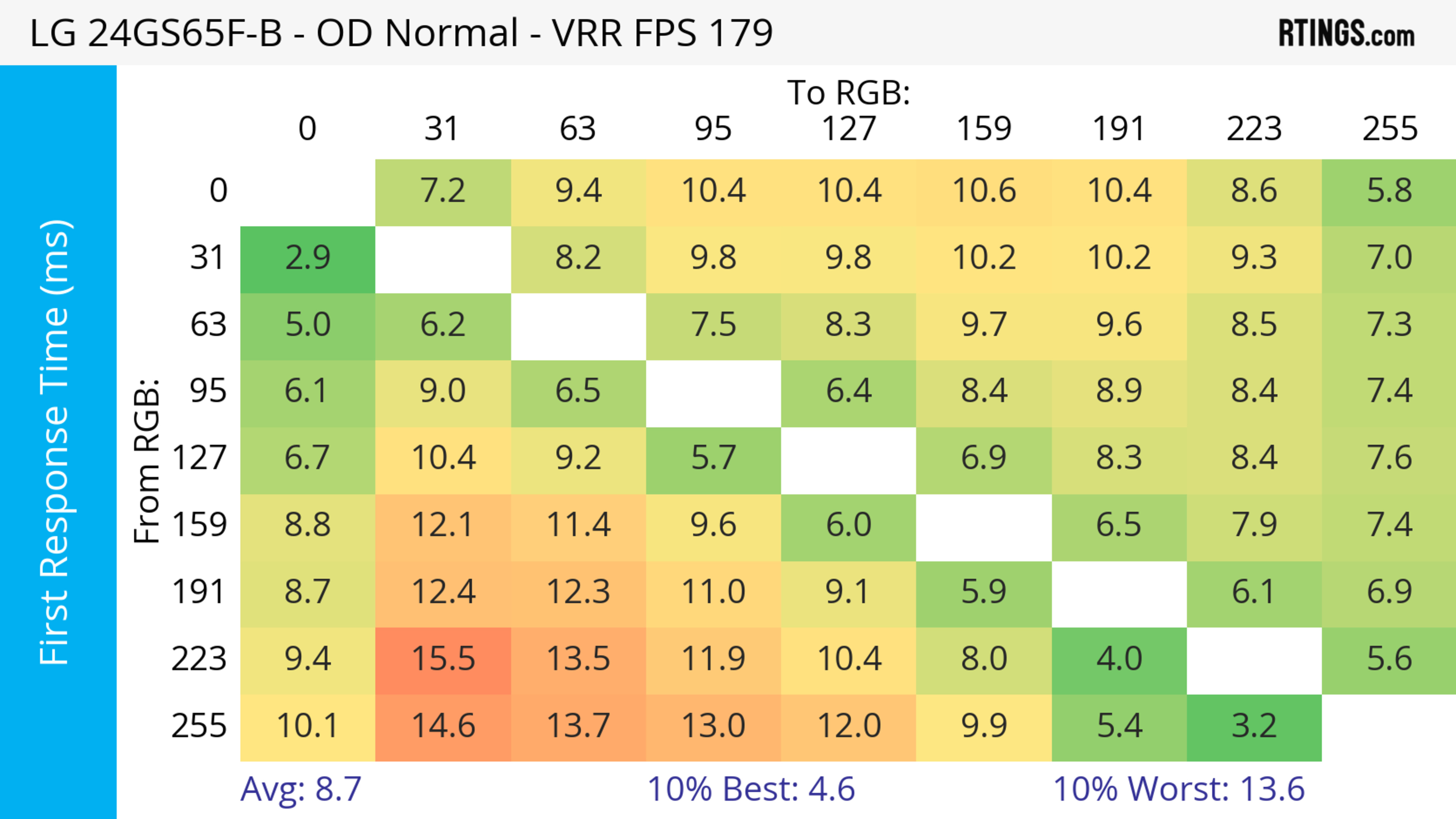 The LG 24GS65F-B is an entry-level 1080p gaming monitor that you can get for cheap. It has typical features that you'd expect to find in a gaming display, like a 180Hz refresh rate and VRR support, but it doesn't have high-end perks, like HDMI 2.1 bandwidth, and it has disappointing picture quality. It's also decent for gaming, as it has low input lag and a consistent response time at any refresh rate, but fast-moving objects still have blur. There isn't anything in particular that makes this monitor stand out against the rest of the market, but it offers solid performance at a cheap price. If you're looking for a basic gaming monitor and you're on a limited budget, there isn't much to knock against it at this price point. That said, you can get other options with higher refresh rates, like with the ViewSonic XG2431, if you're willing to spend just a bit more.