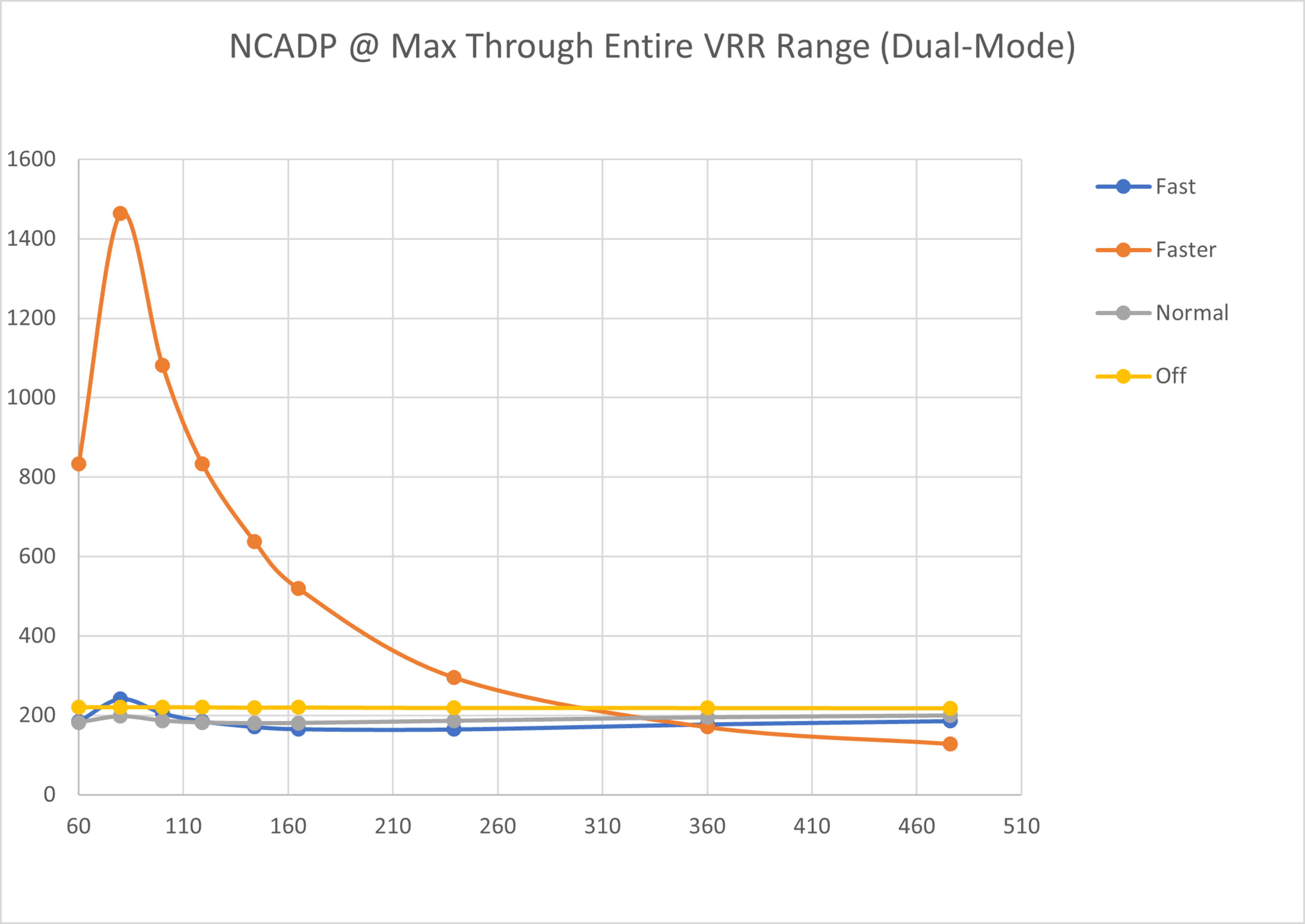 The CAD at 60Hz is okay. It's the same with Dual-Mode on or off because using a fixed 60Hz signal doesn't activate LFC like if the refresh rate would drop down to 60Hz from a higher refresh rate rate. The 'Normal' Response Time setting performs the best, but it has more inverse ghosting than 'Off,' which is better to use if that bothers you, although it has more blur.