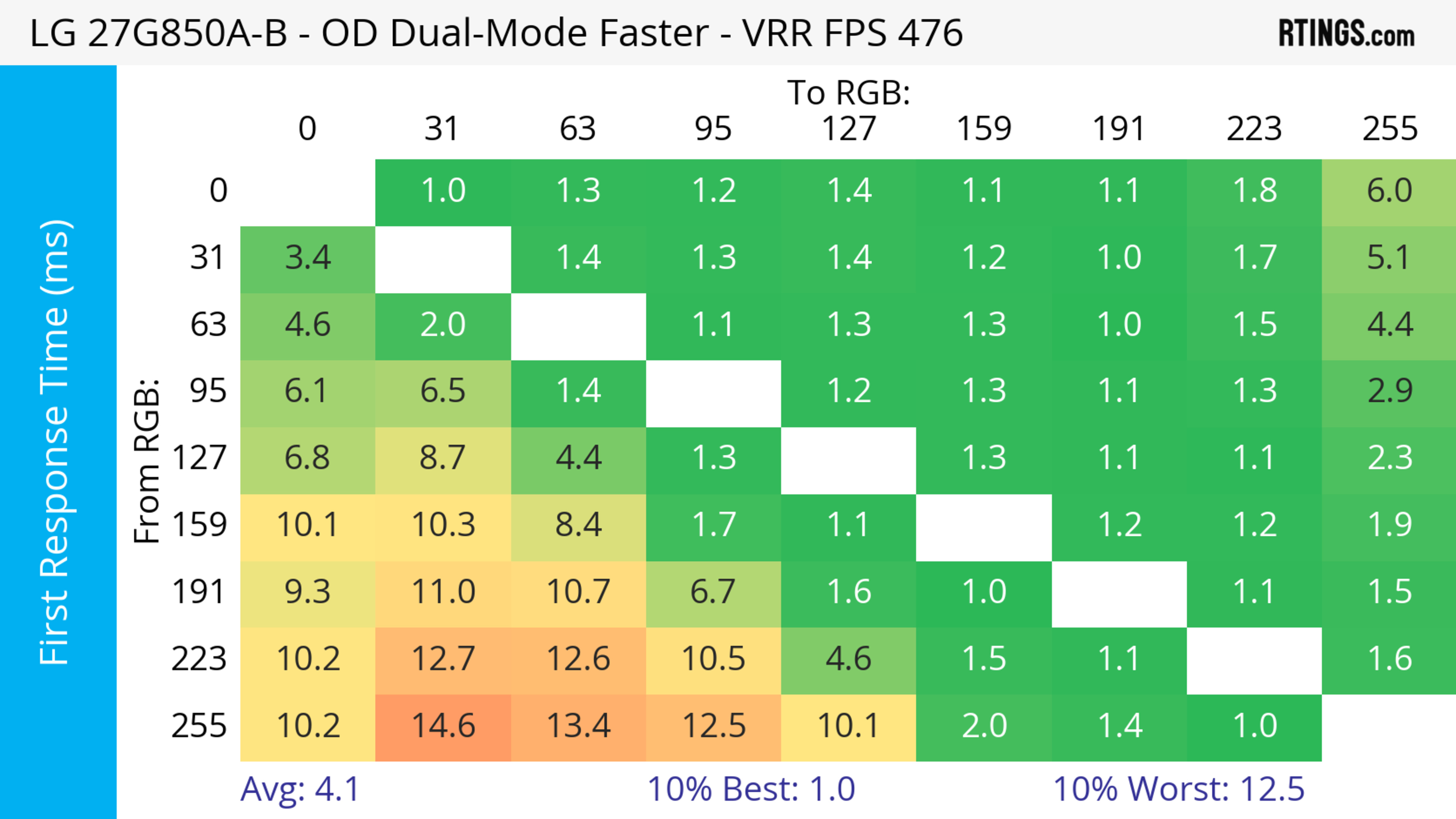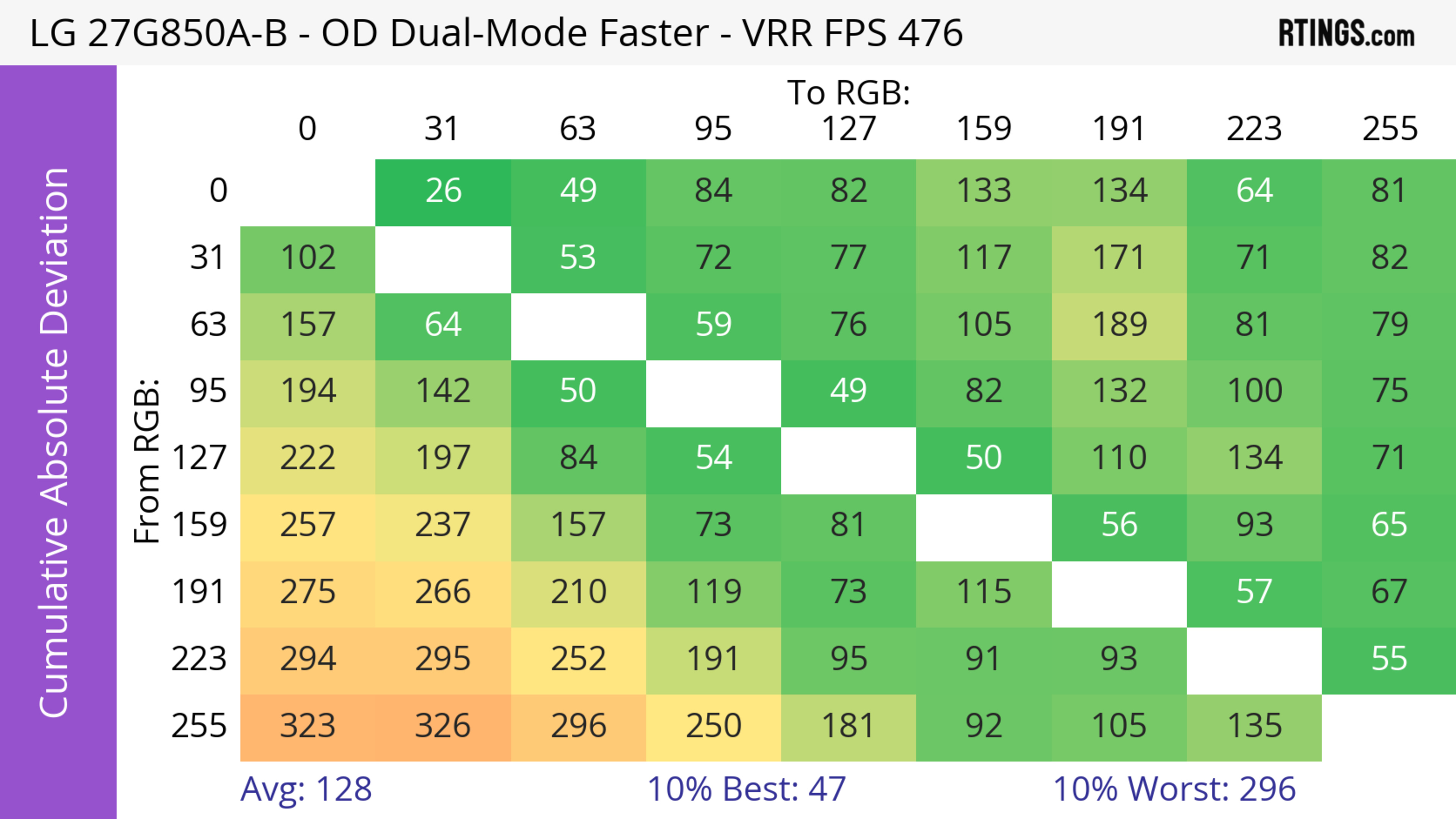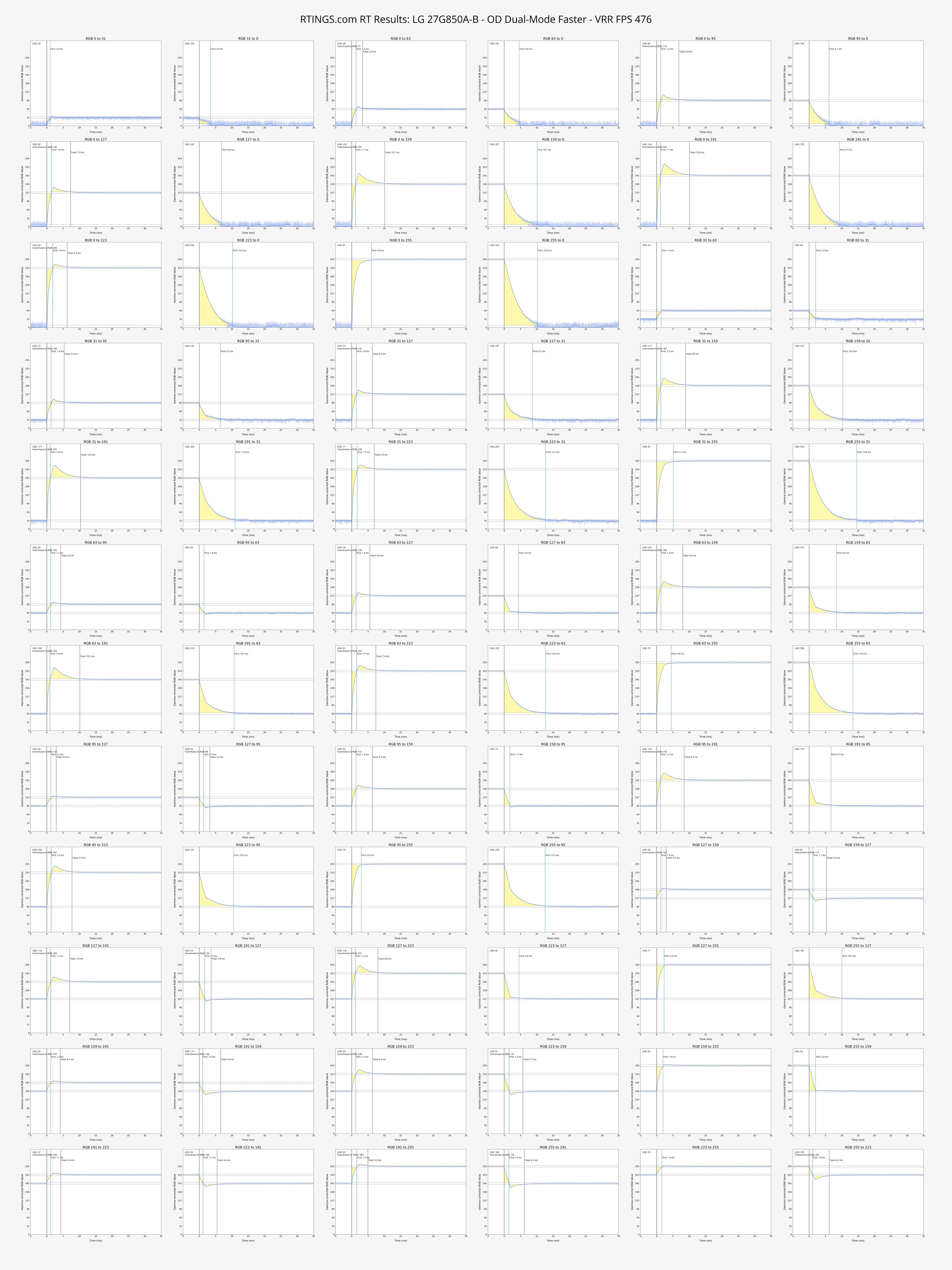The refresh rate compliance is decent. The monitor makes most full-color transitions at low frame rates, but it struggles a lot more at high frame rates, like if you're using its 480Hz Dual-Mode. These results are with Dual-Mode off, but they're similar in the Dual-Mode at the same frame rates.