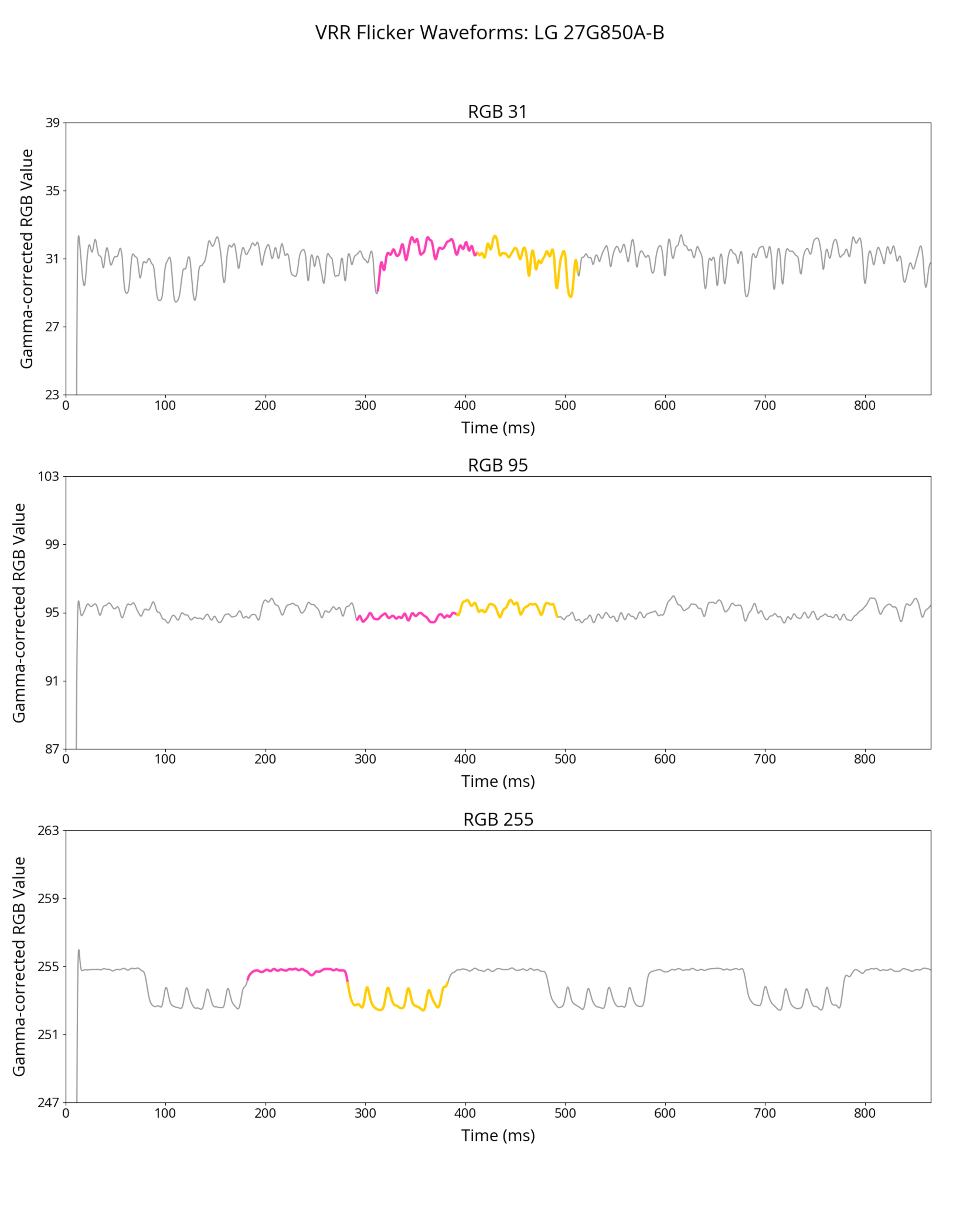 There's minimal VRR flicker with changing frame rates on the LG 27G850A. While it has some flicker with the Dual-Mode off in dark scenes, it isn't distracting. That said, there's a bit more flicker when using the 480Hz Dual-Mode due to the larger refresh rate range. You can see the results below: