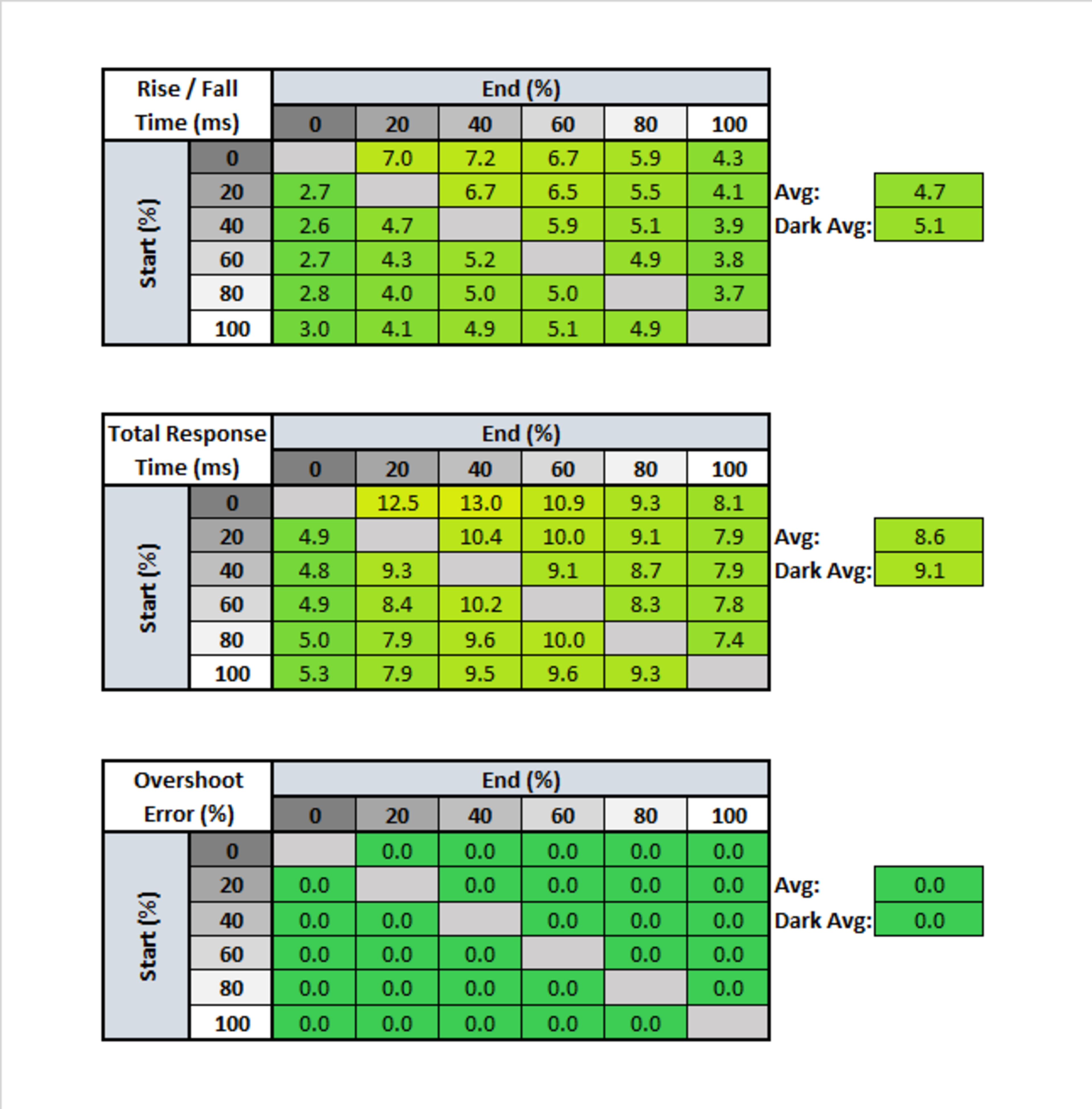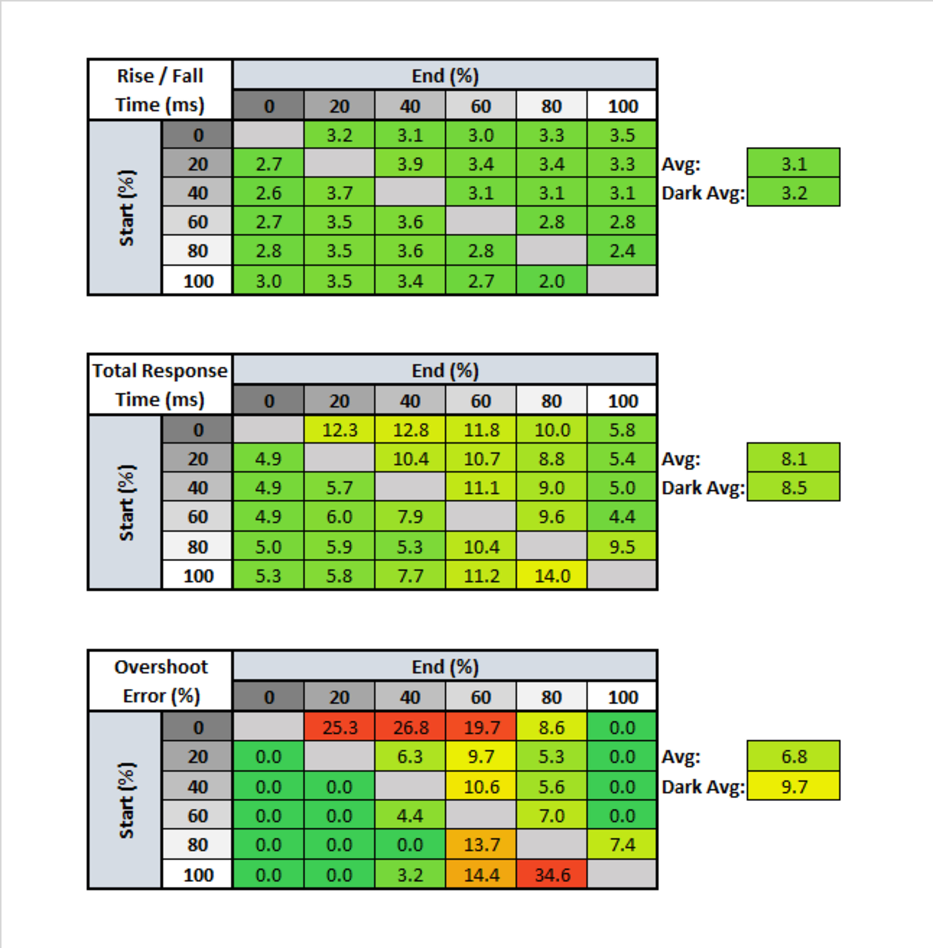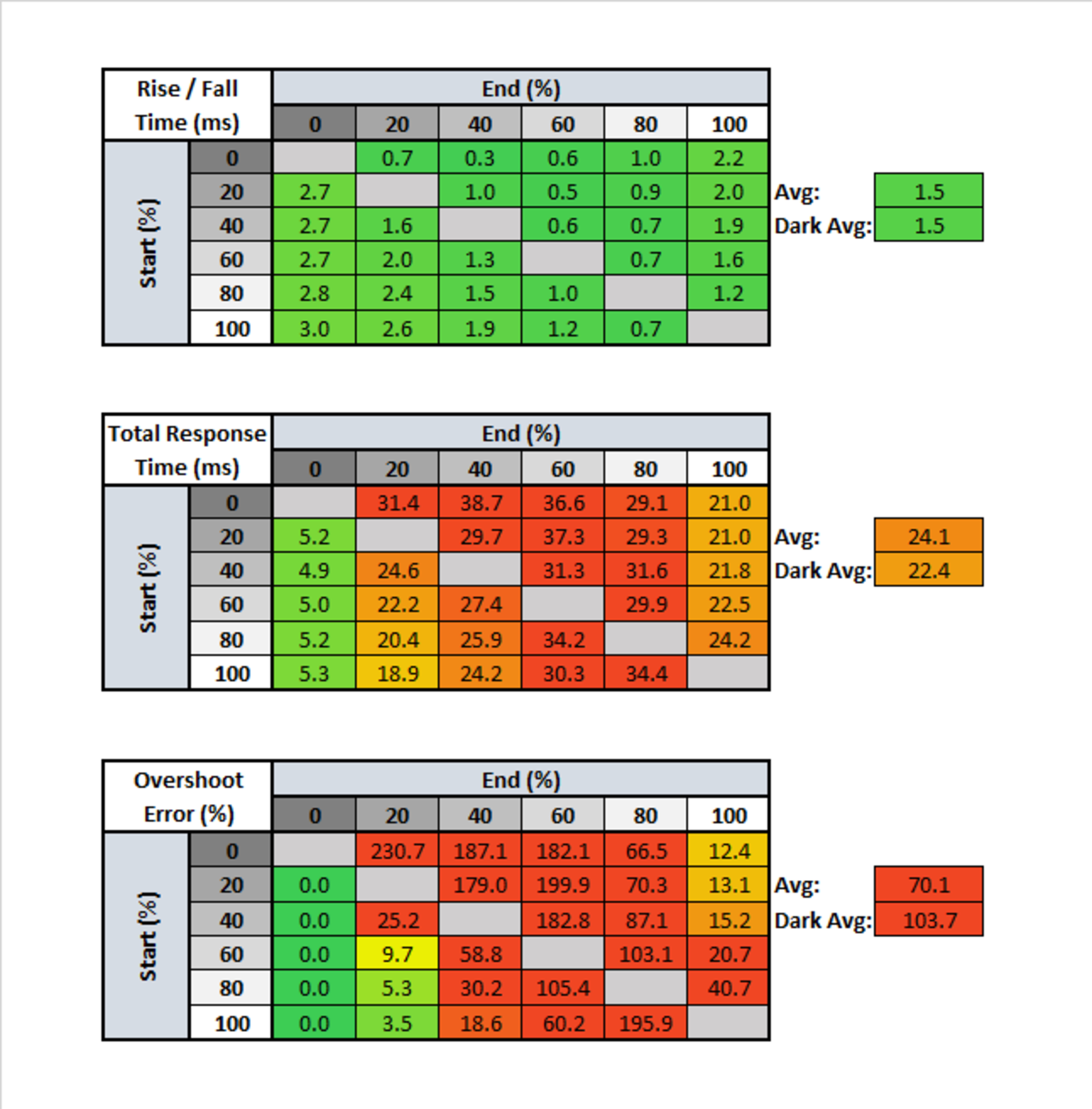 | Overdrive Setting | Response Time Chart | Response Time Tables | Motion Blur Photo |