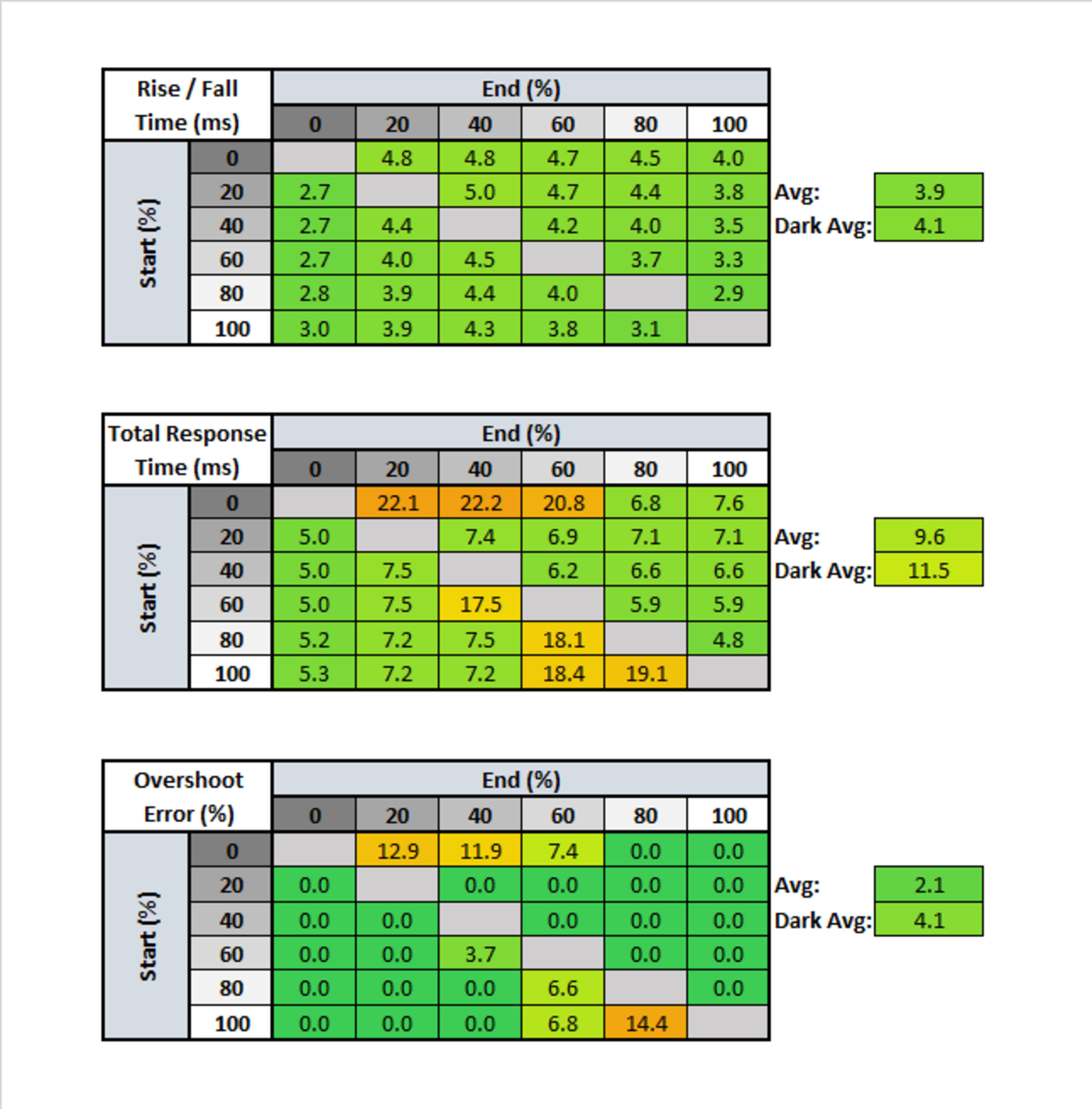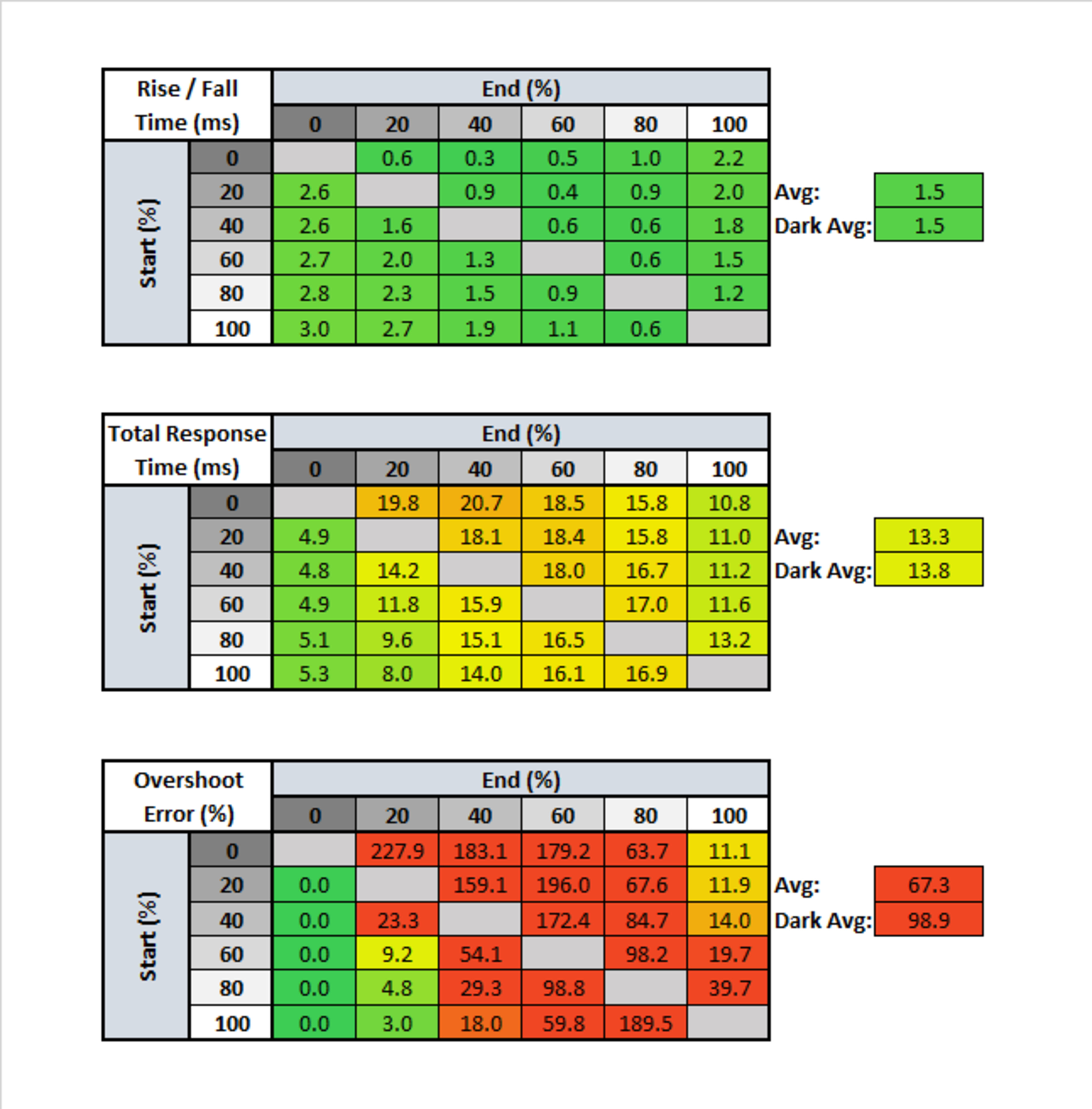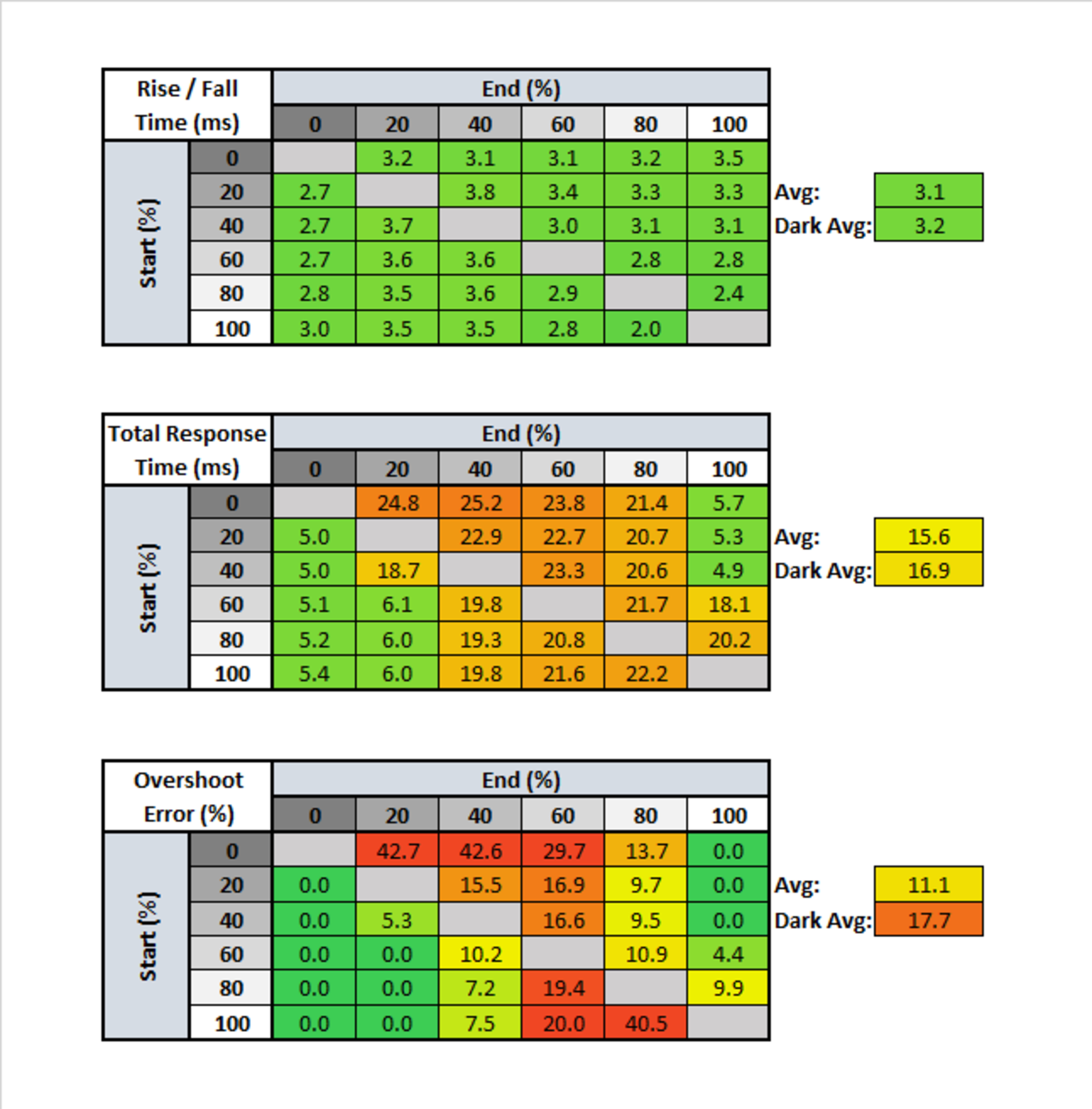 | Overdrive Setting | Response Time Chart | Response Time Tables | Motion Blur Photo |