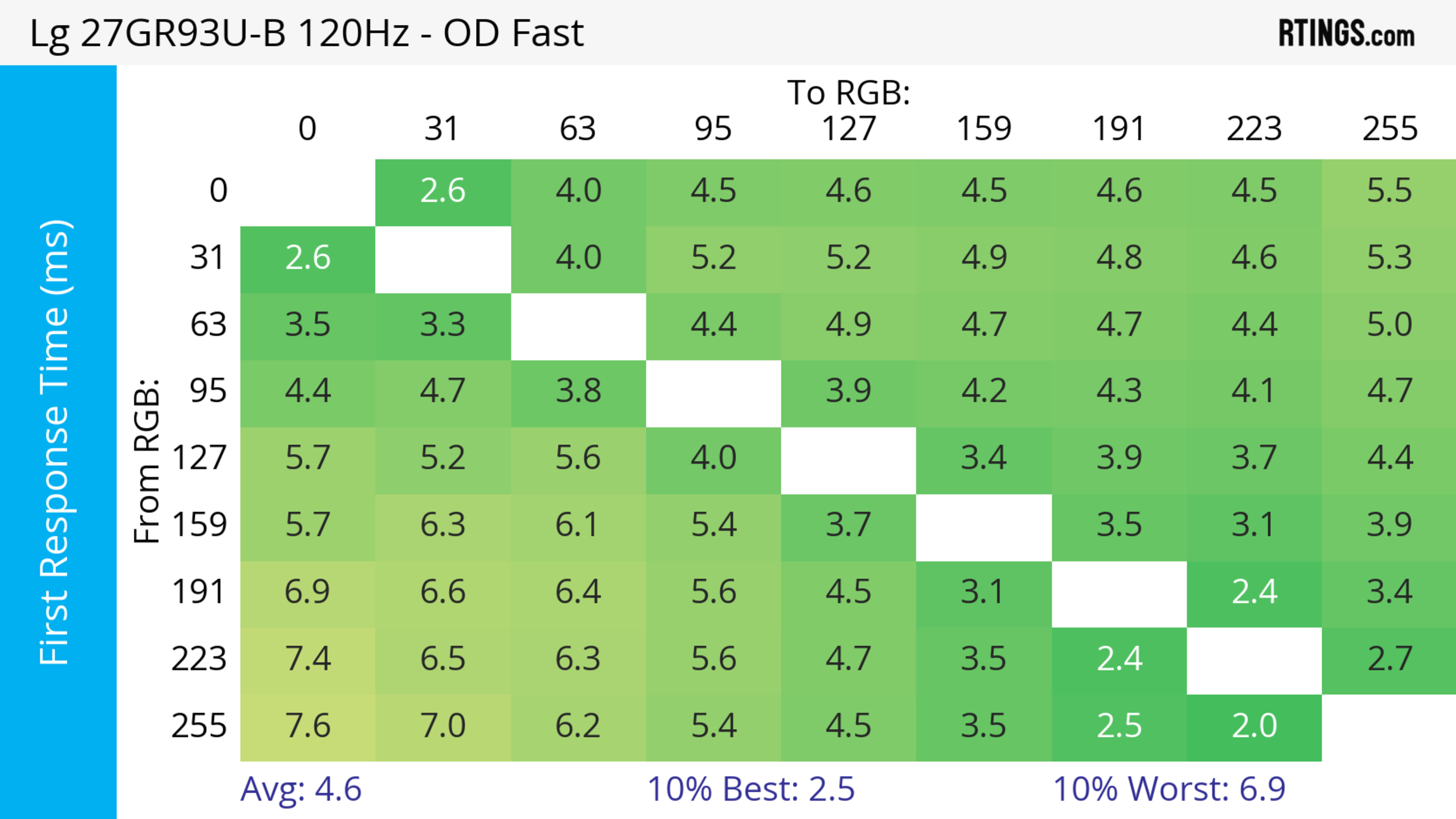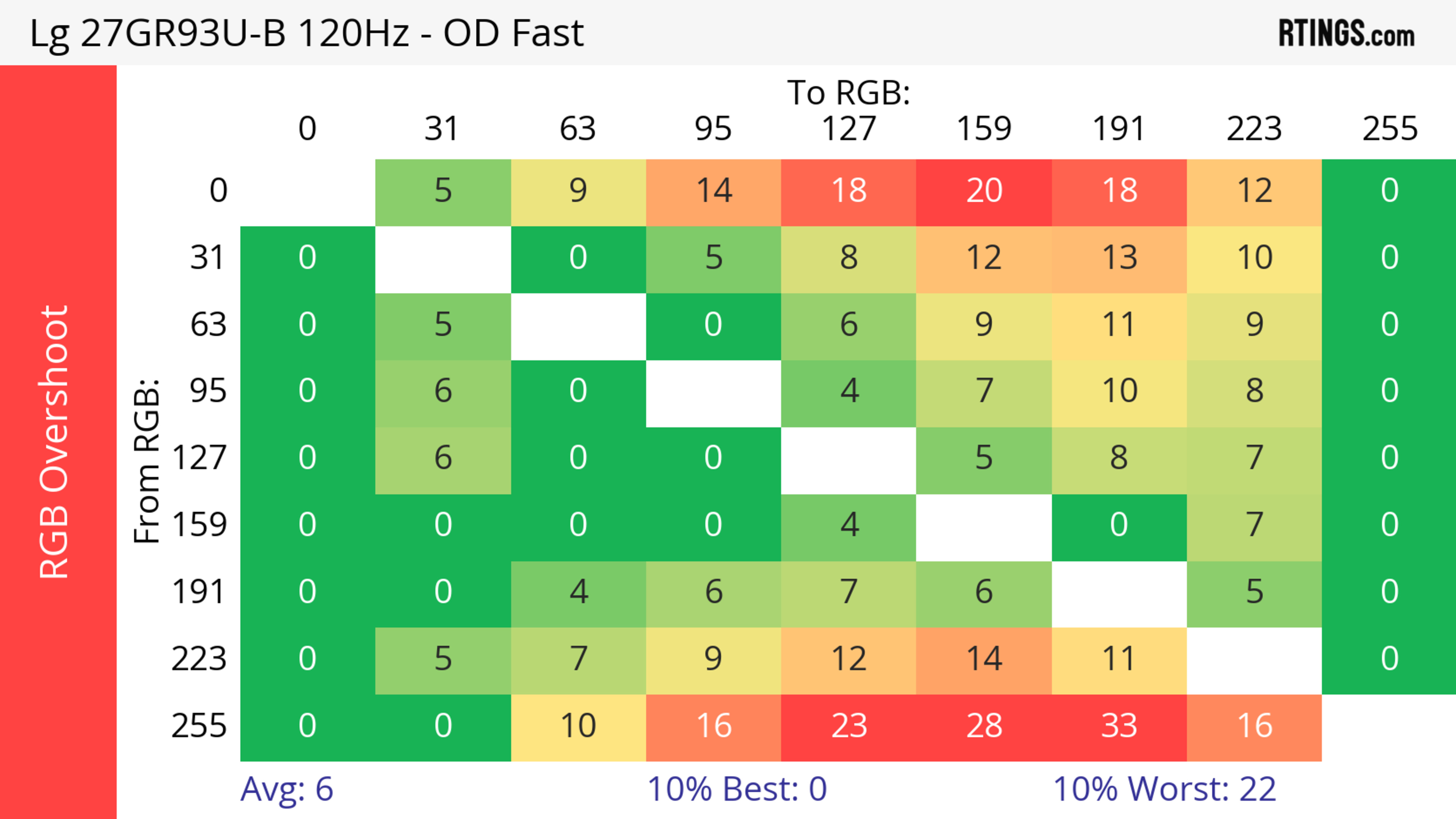 The CAD at 120Hz is very good. Unlike at its max refresh rate, the 'Normal' overdrive setting has the lowest CAD, which means you may have to change the setting if the frame rate of your game drops or you change games. 'Fast' actually has the same CAD, but there's more overshoot causing inverse ghosting.