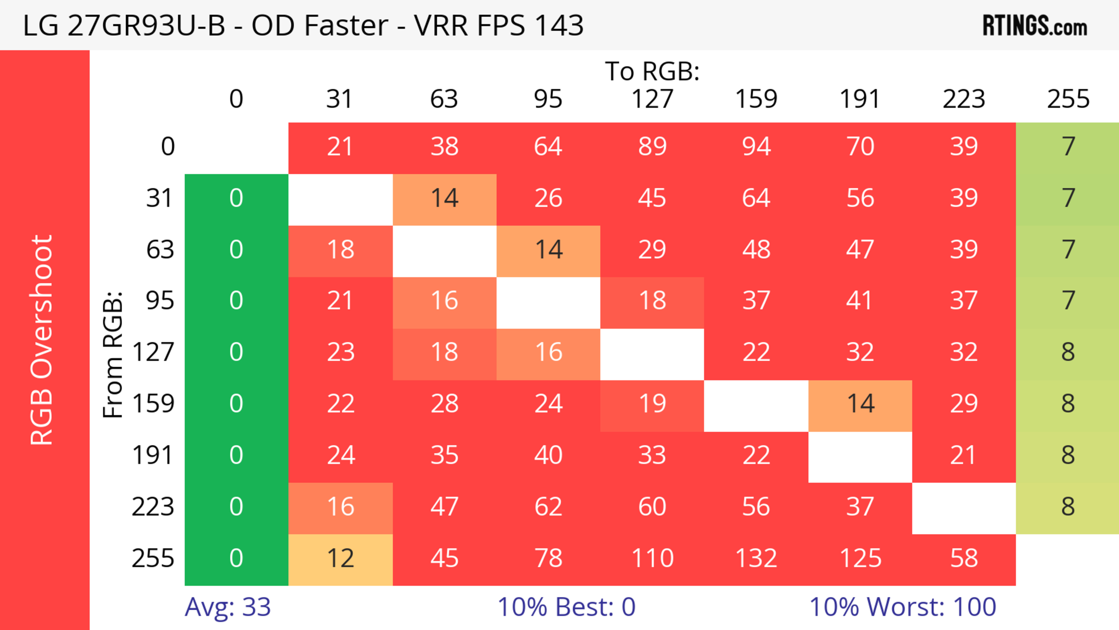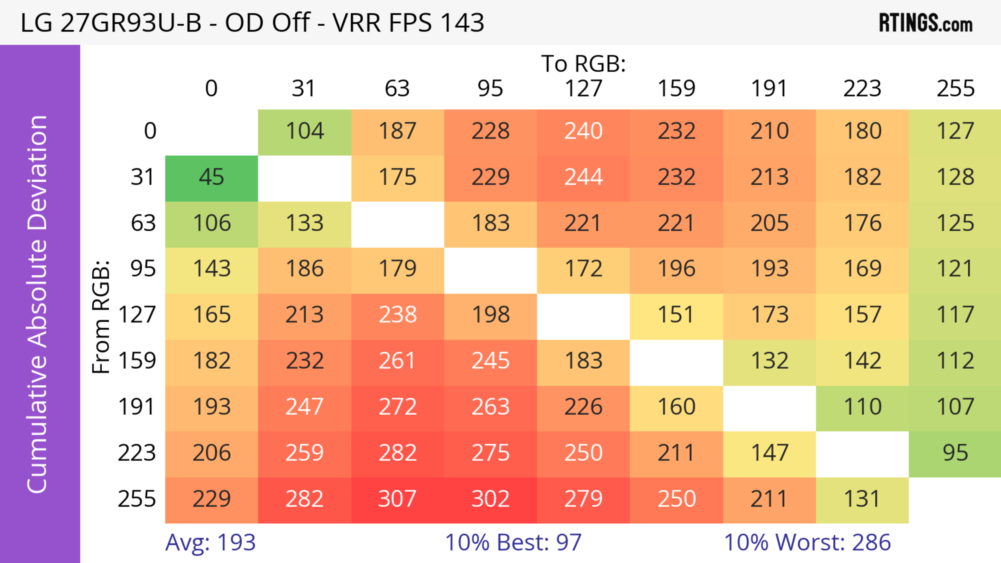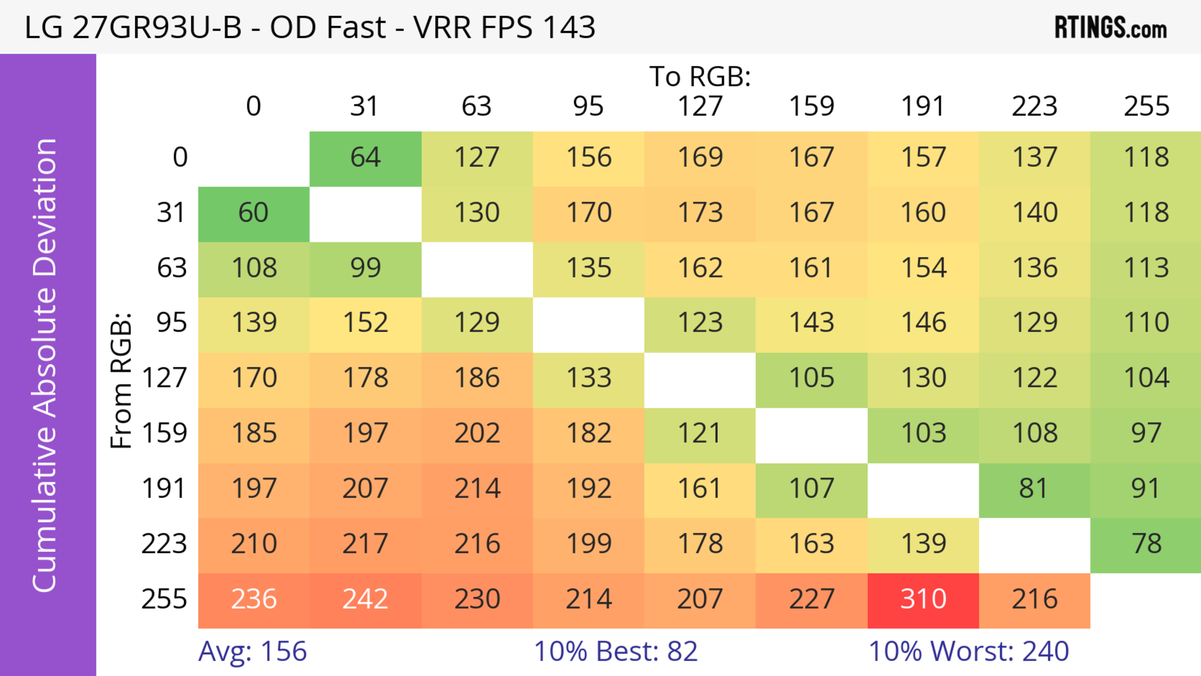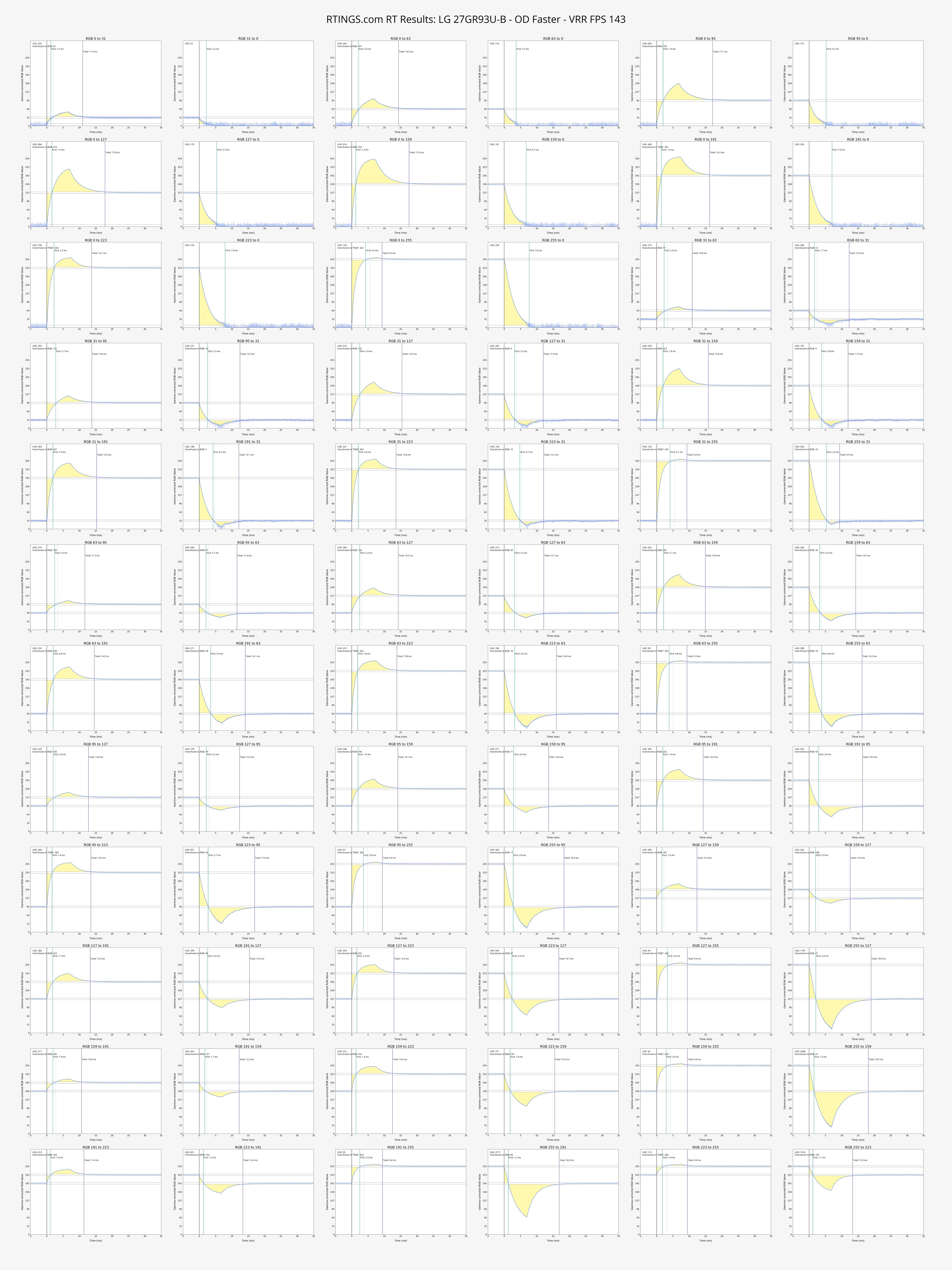 The LG 27GR93U-B has good motion handling across its entire refresh rate range with VRR enabled. Although the 'Fast' overdrive setting performs best at its max refresh rate, the 'Normal' setting is the most consistent as the refresh rate drops, with good CAD and not too much motion blur. The 'Faster' overdrive setting performs so badly that it passes the limits of the graph, as you can see here.