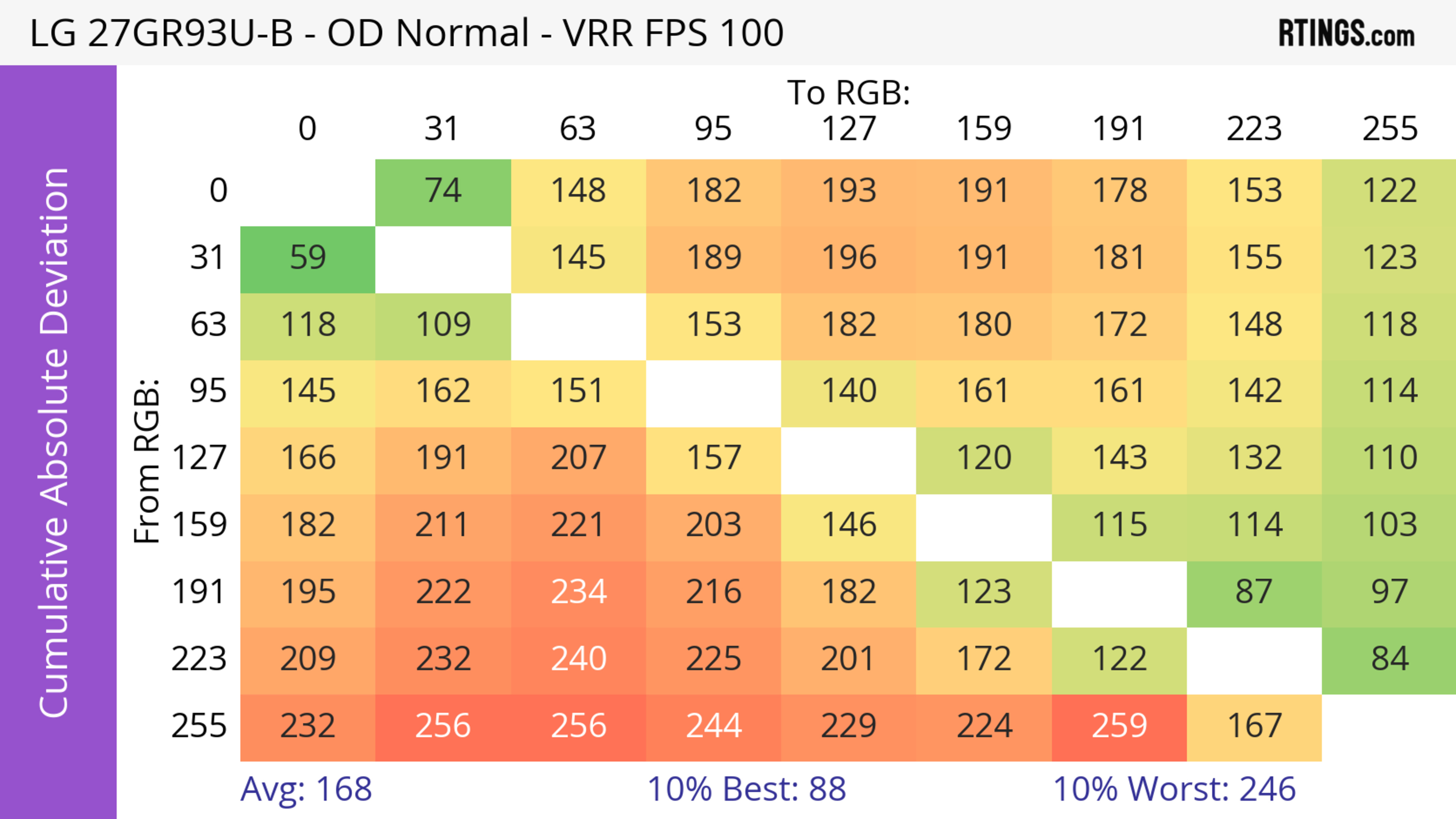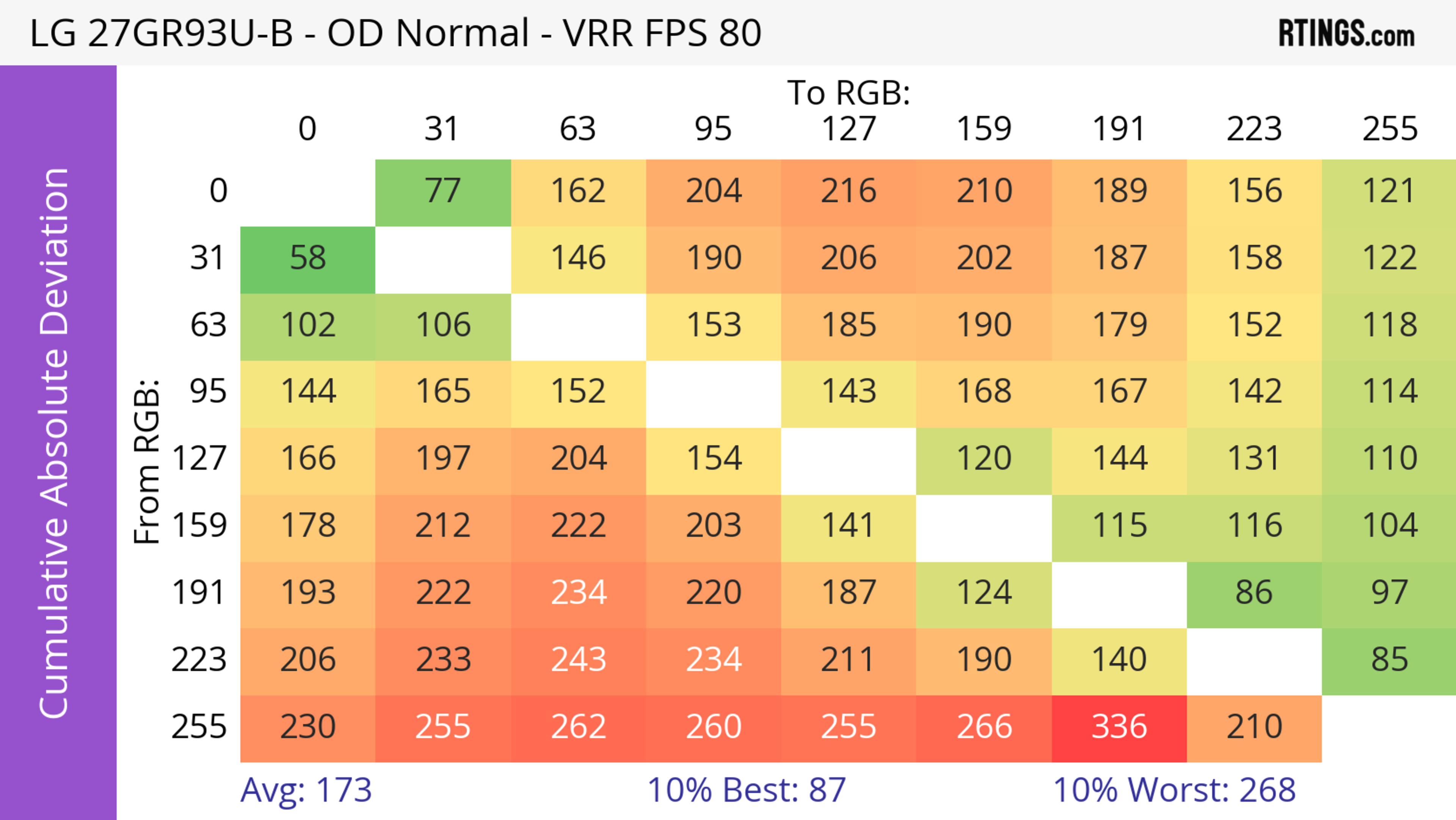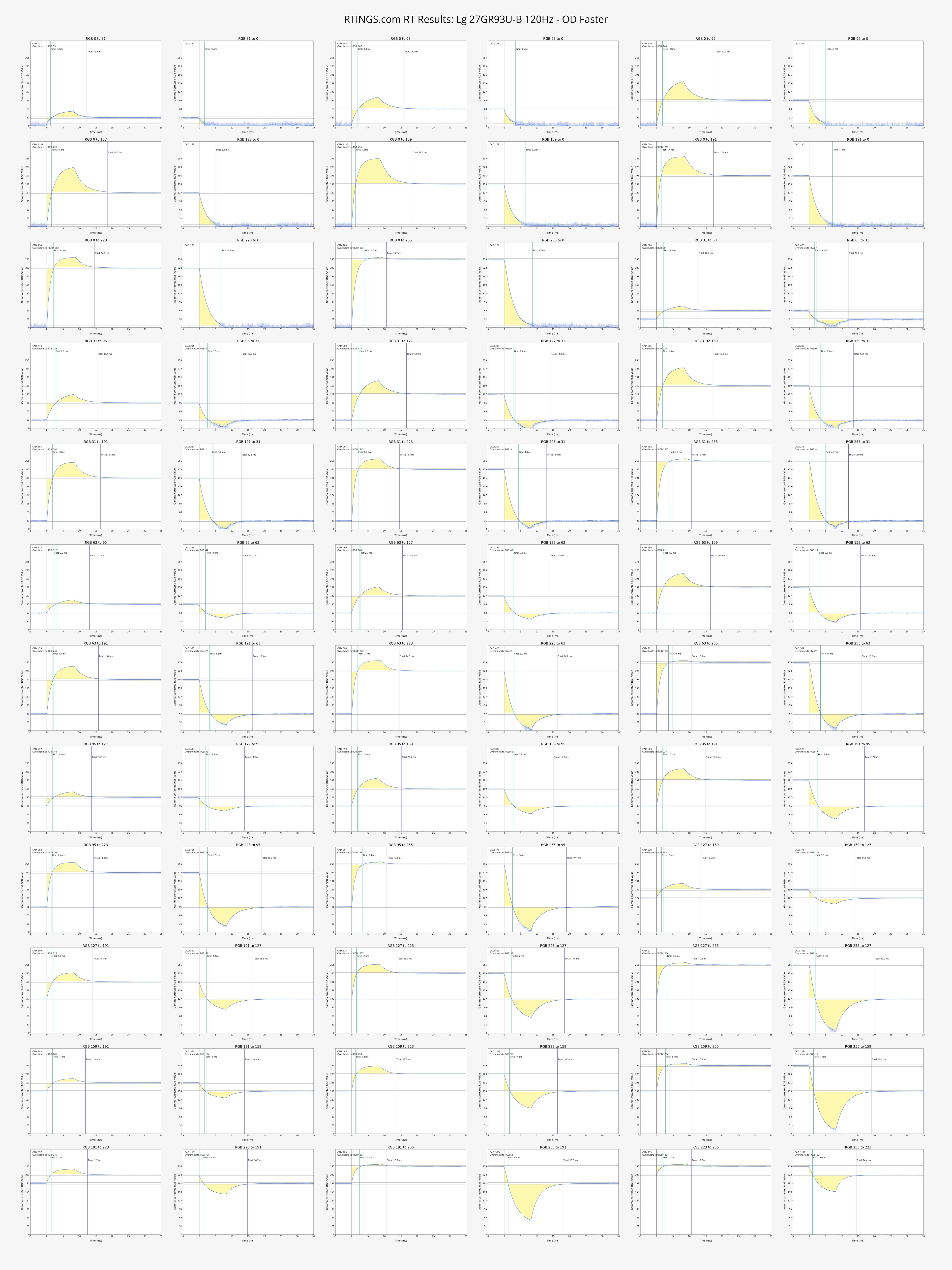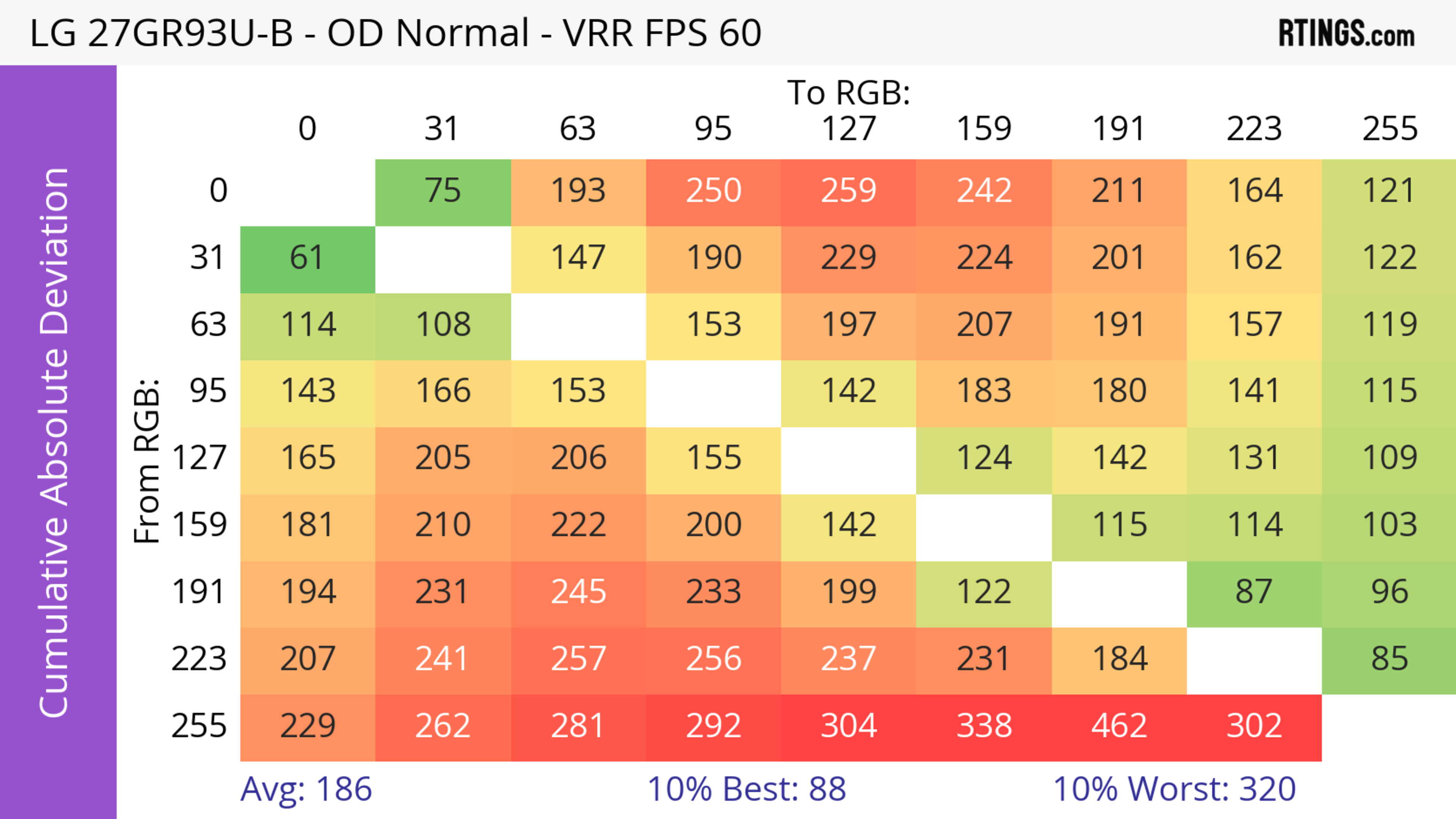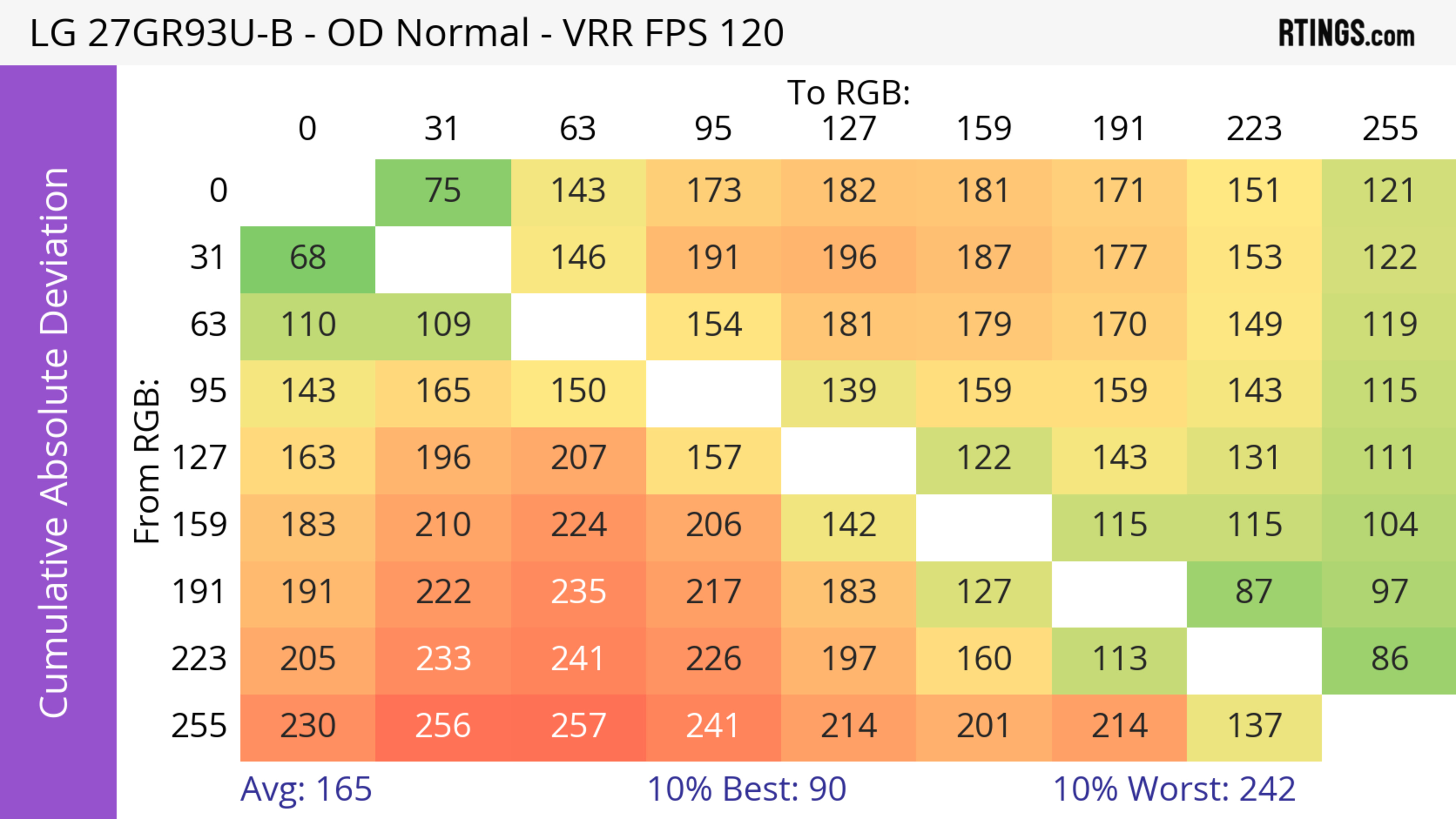 The LG 27GR93U-B has good motion handling across its entire refresh rate range with VRR enabled. Although the 'Fast' overdrive setting performs best at its max refresh rate, the 'Normal' setting is the most consistent as the refresh rate drops, with good CAD and not too much motion blur. The 'Faster' overdrive setting performs so badly that it passes the limits of the graph, as you can see here.