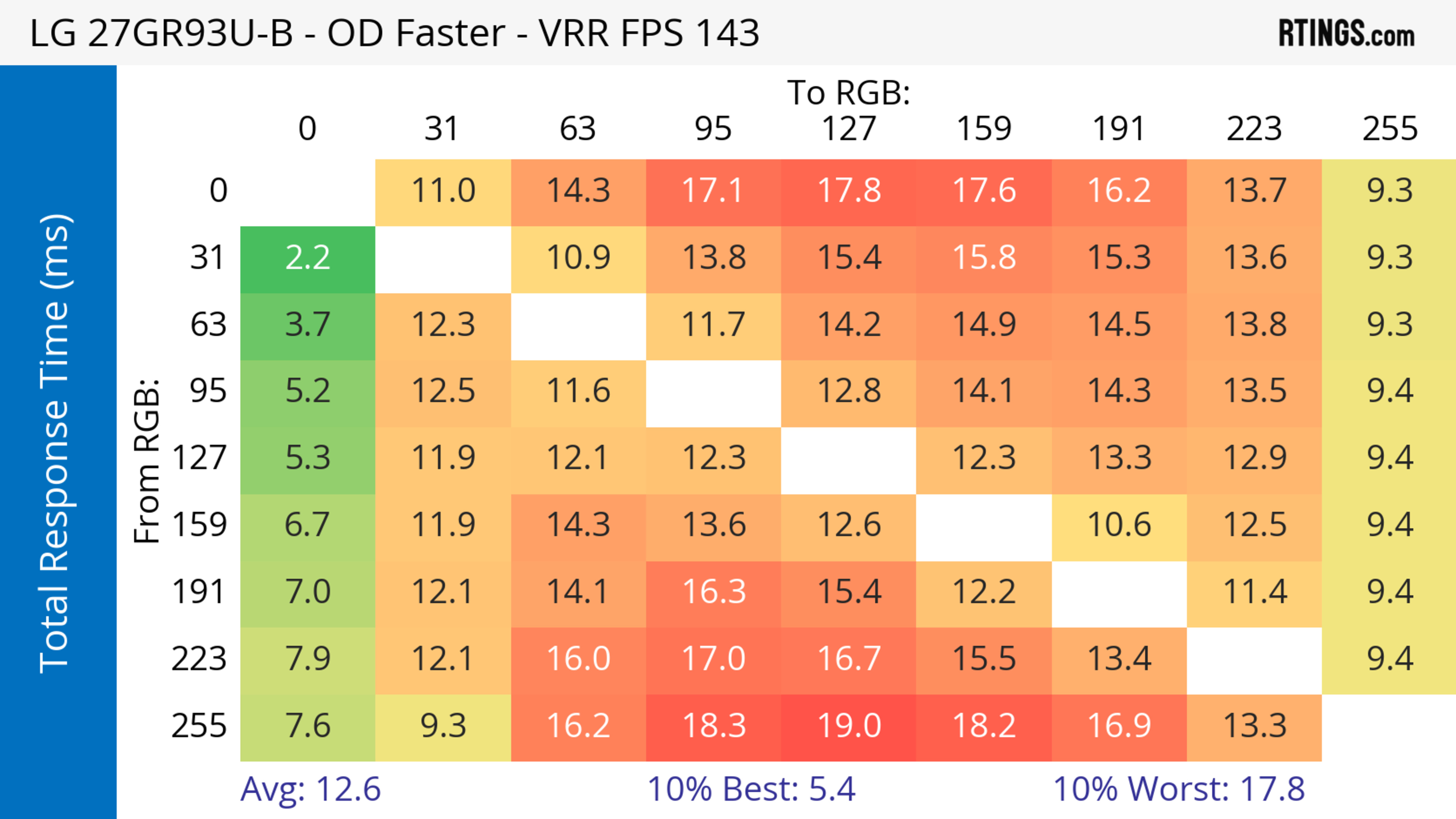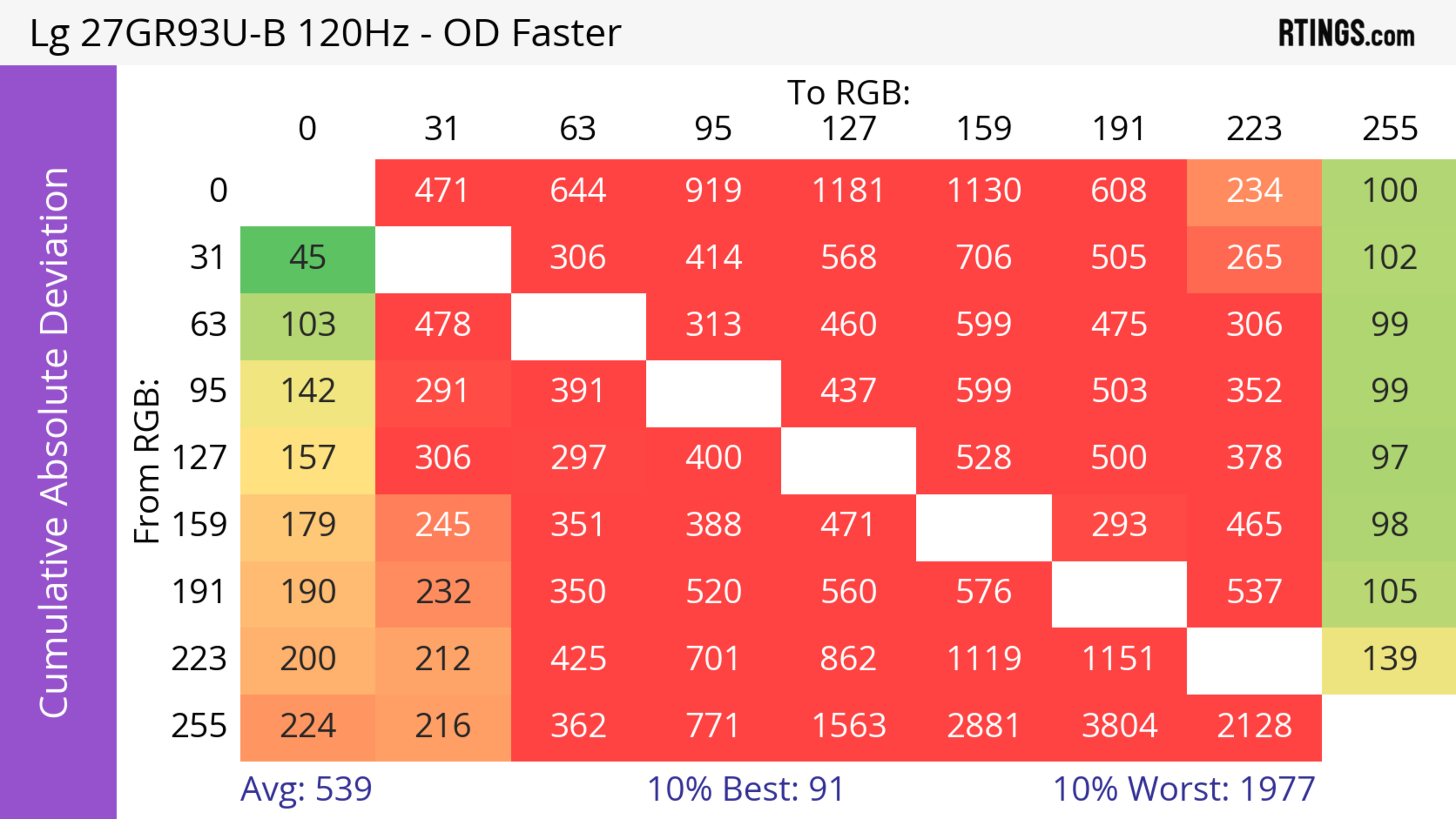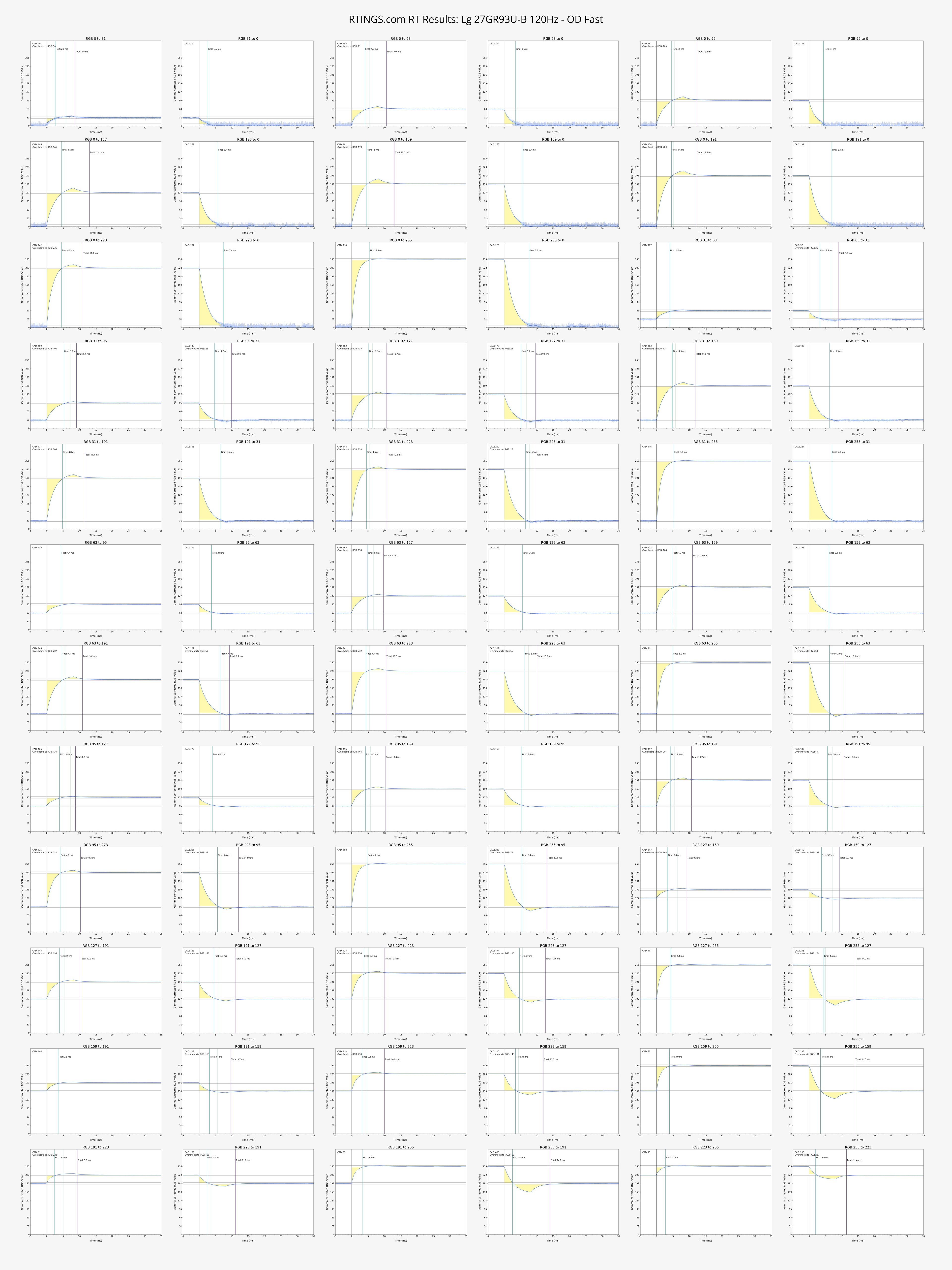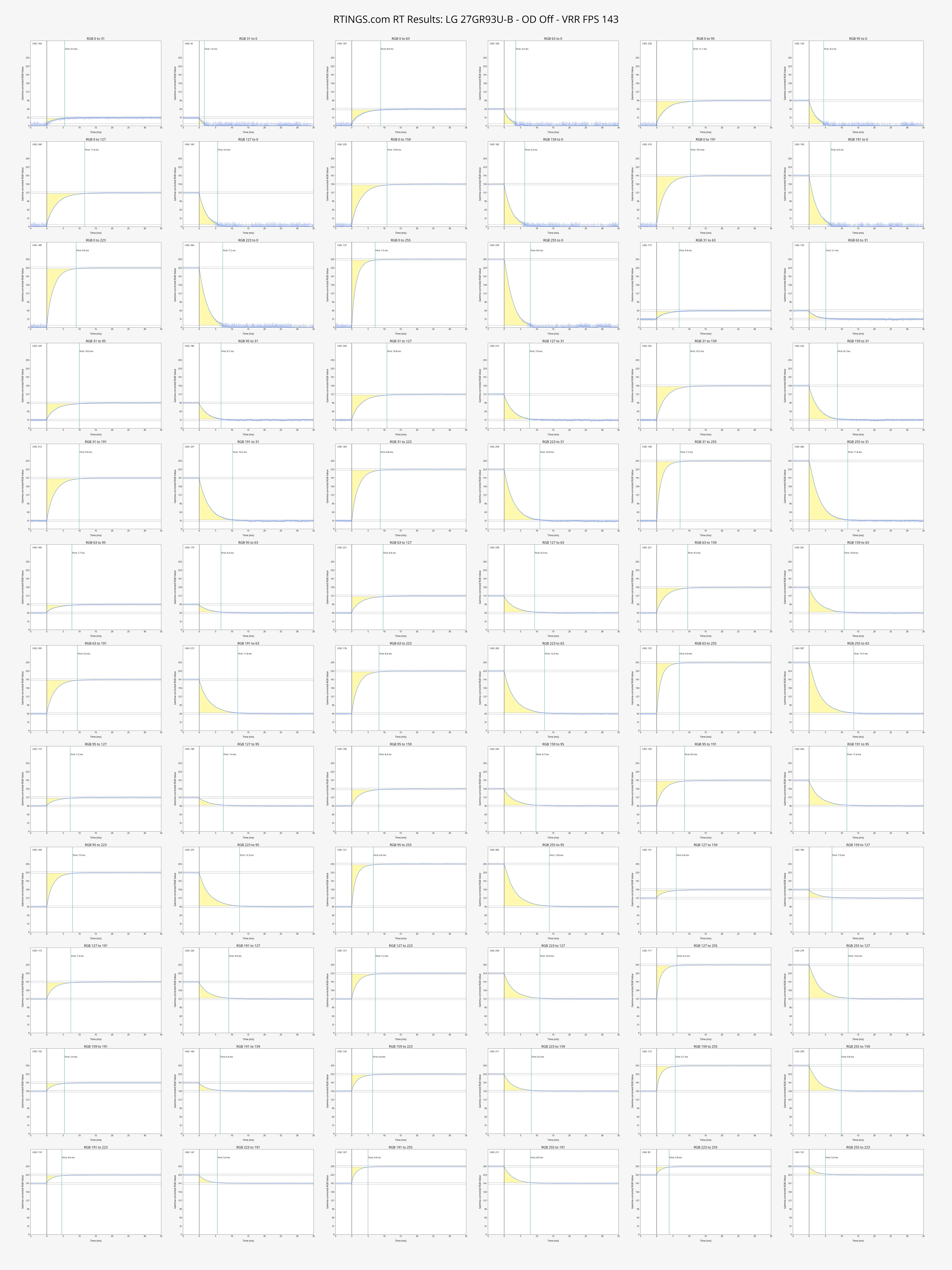 The LG 27GR93U-B has good motion handling across its entire refresh rate range with VRR enabled. Although the 'Fast' overdrive setting performs best at its max refresh rate, the 'Normal' setting is the most consistent as the refresh rate drops, with good CAD and not too much motion blur. The 'Faster' overdrive setting performs so badly that it passes the limits of the graph, as you can see here.