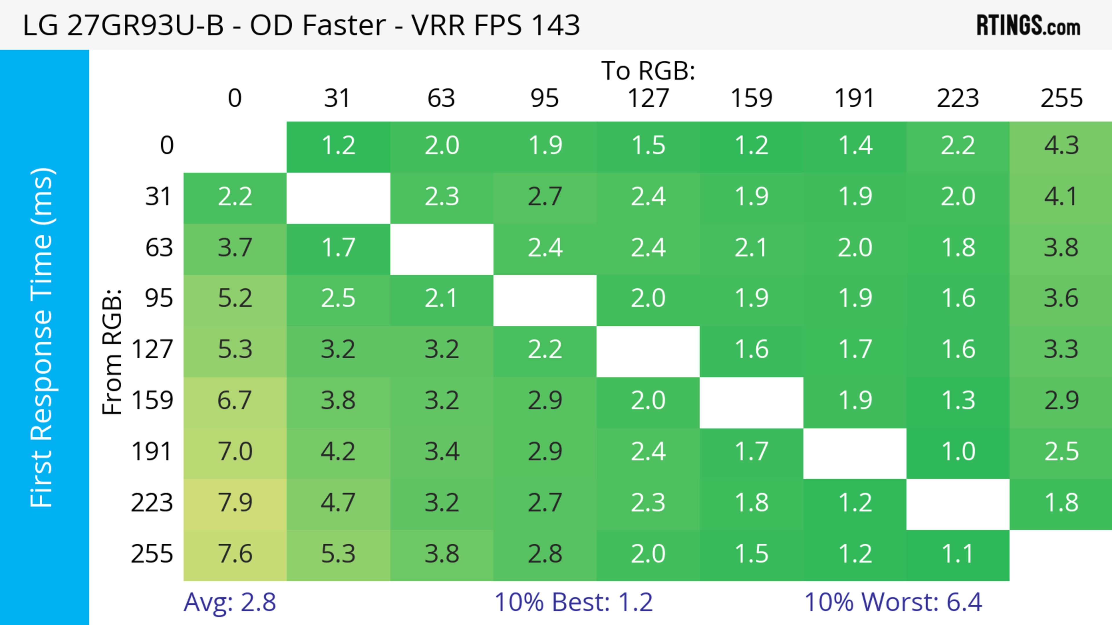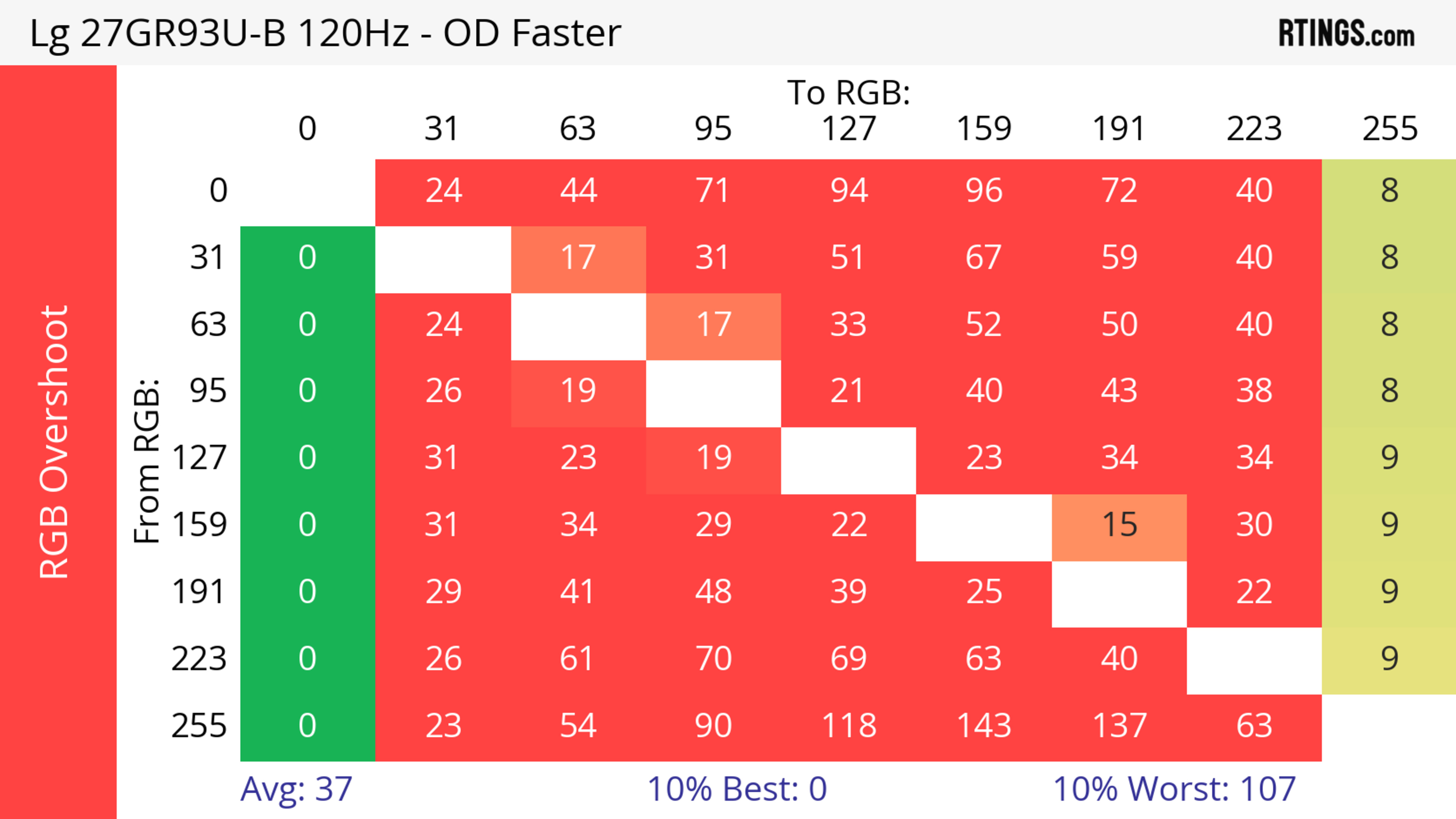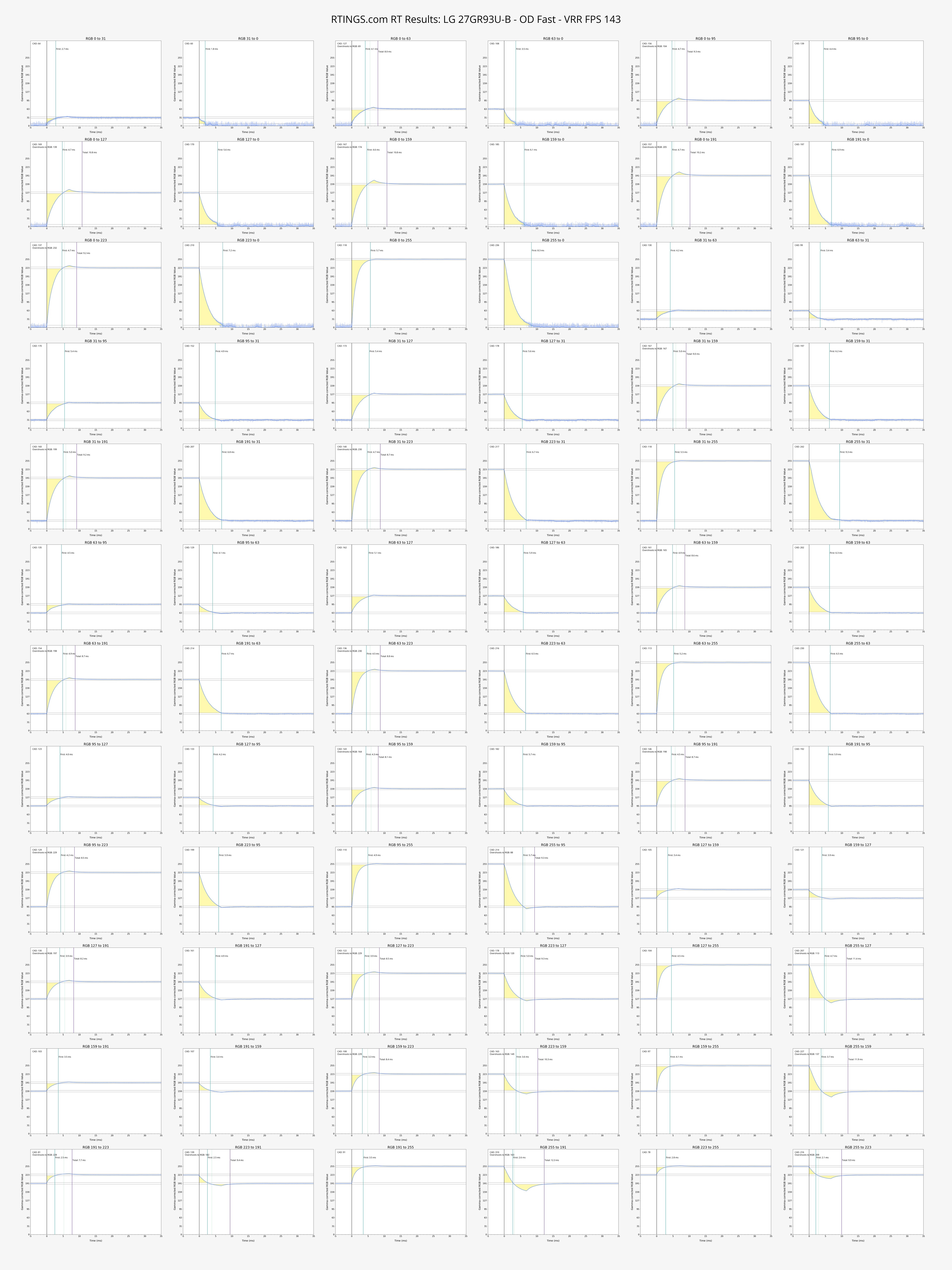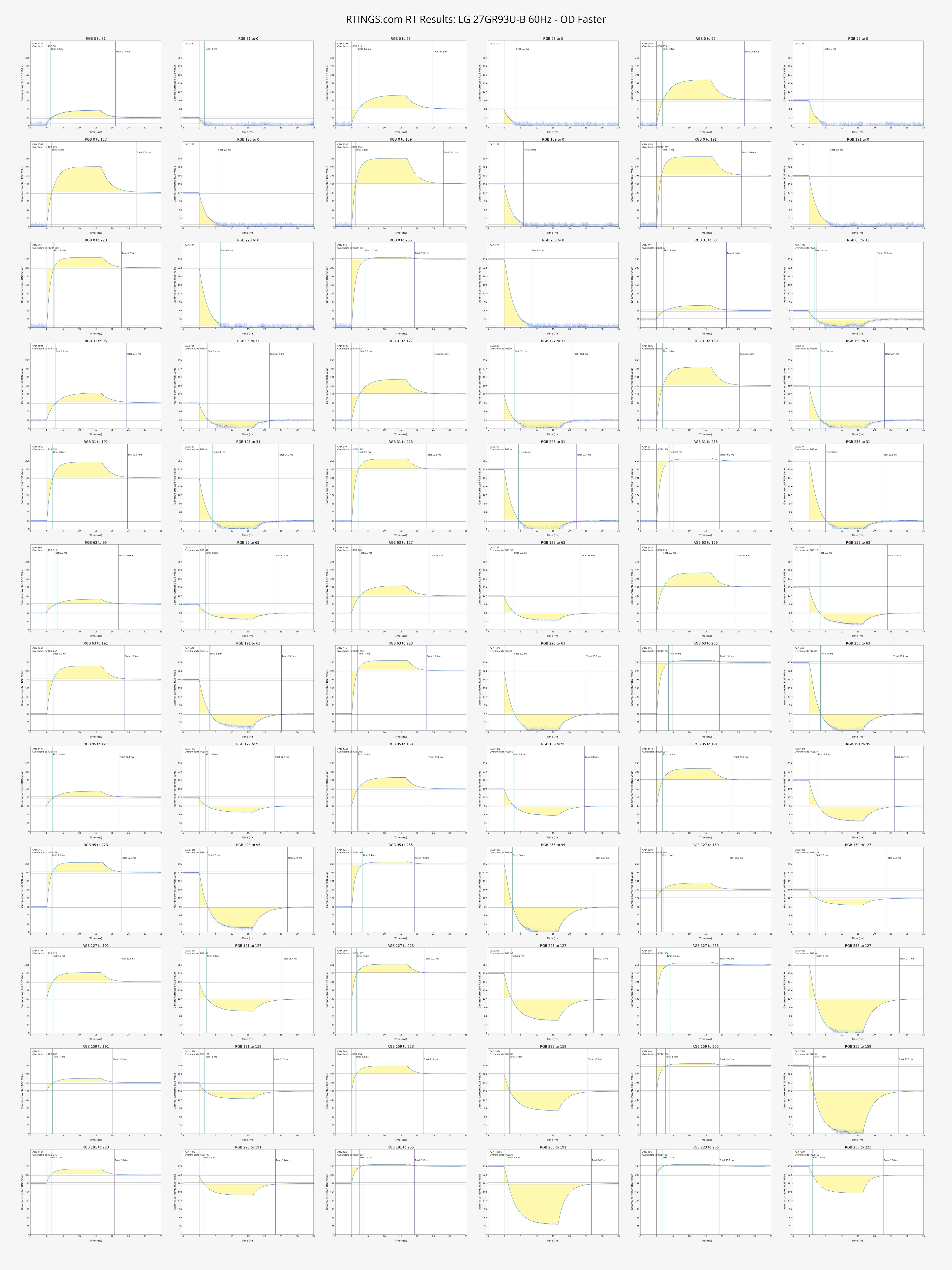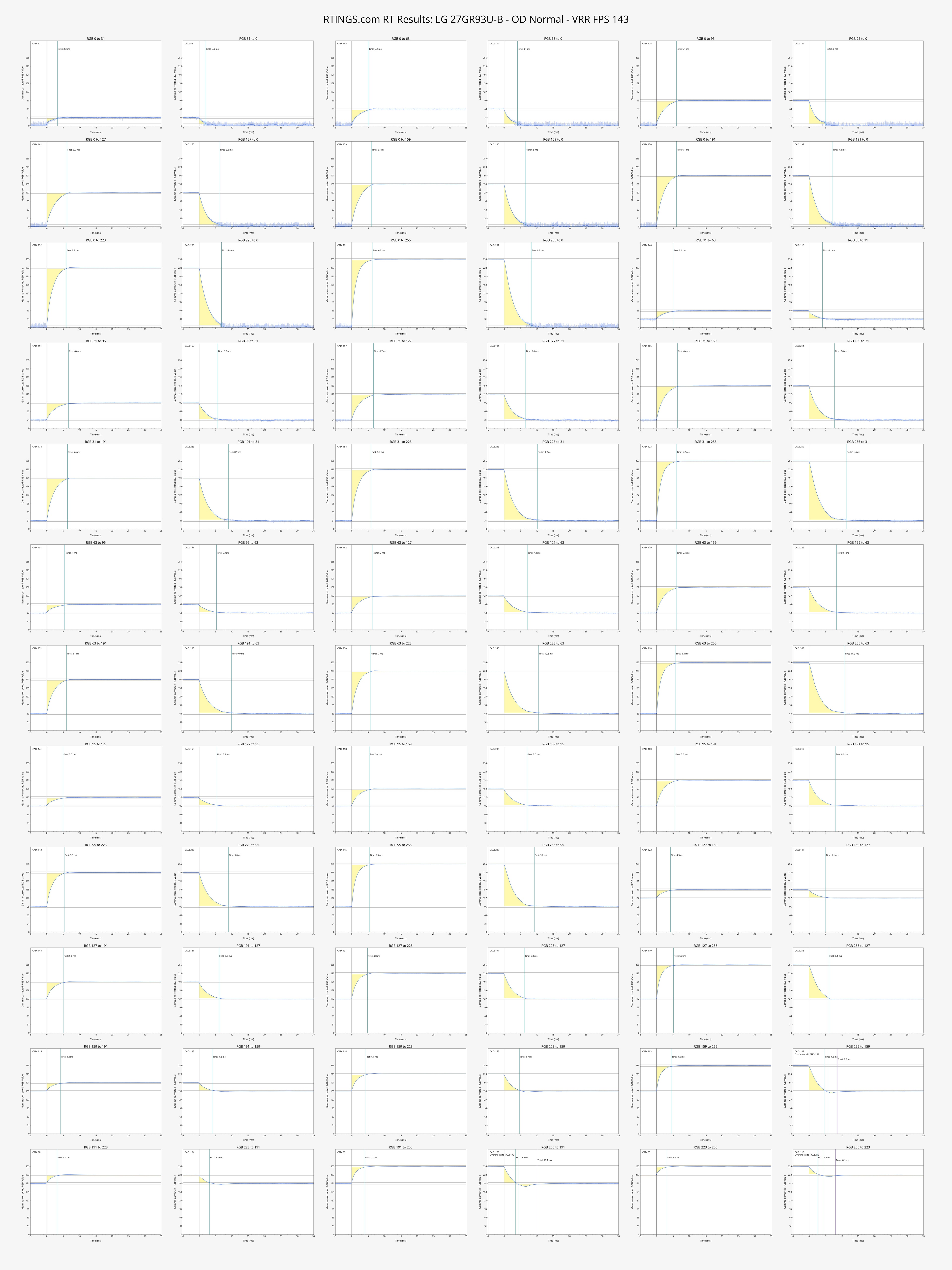The LG 27GR93U-B has good motion handling across its entire refresh rate range with VRR enabled. Although the 'Fast' overdrive setting performs best at its max refresh rate, the 'Normal' setting is the most consistent as the refresh rate drops, with good CAD and not too much motion blur. The 'Faster' overdrive setting performs so badly that it passes the limits of the graph, as you can see here.