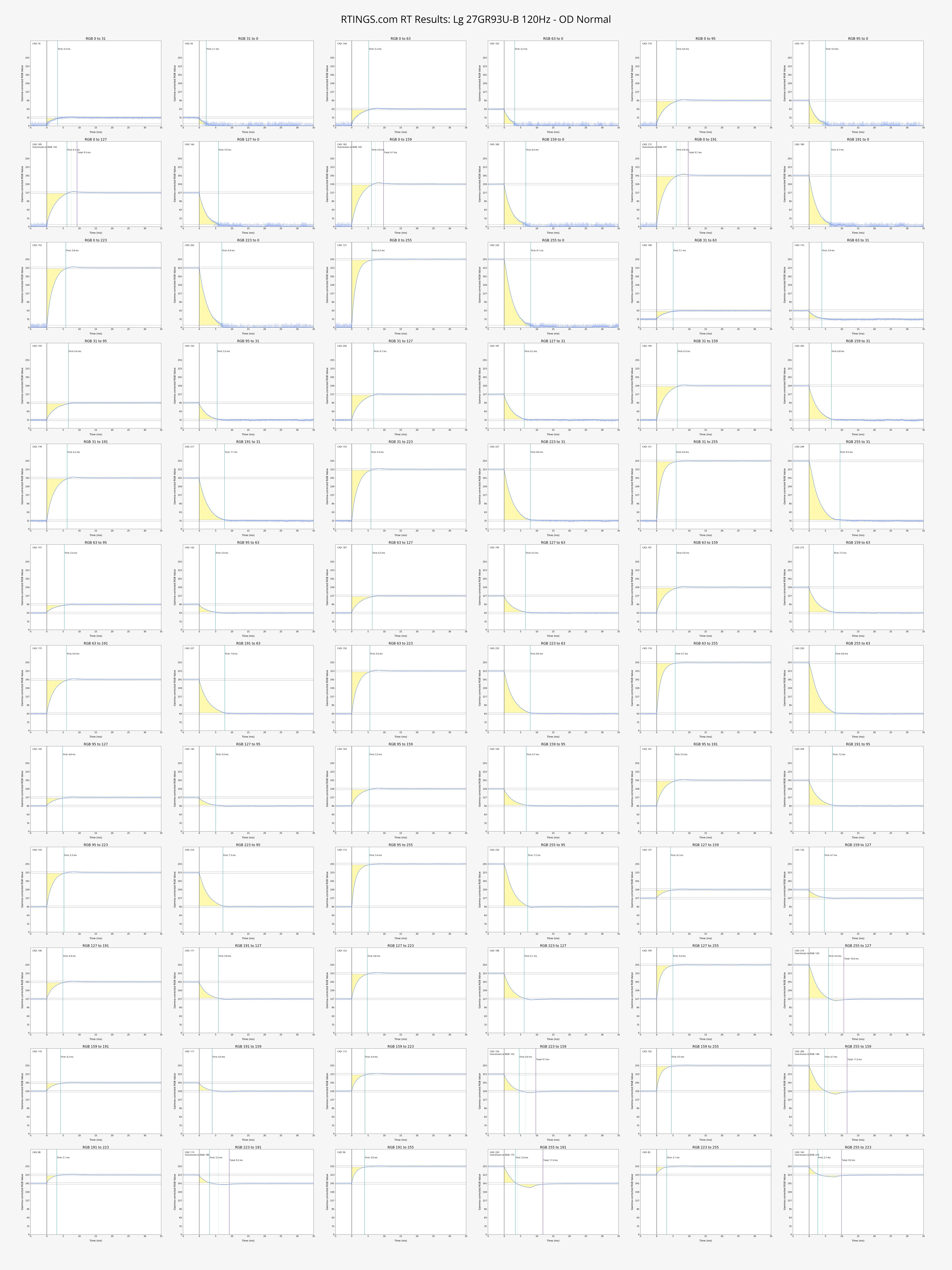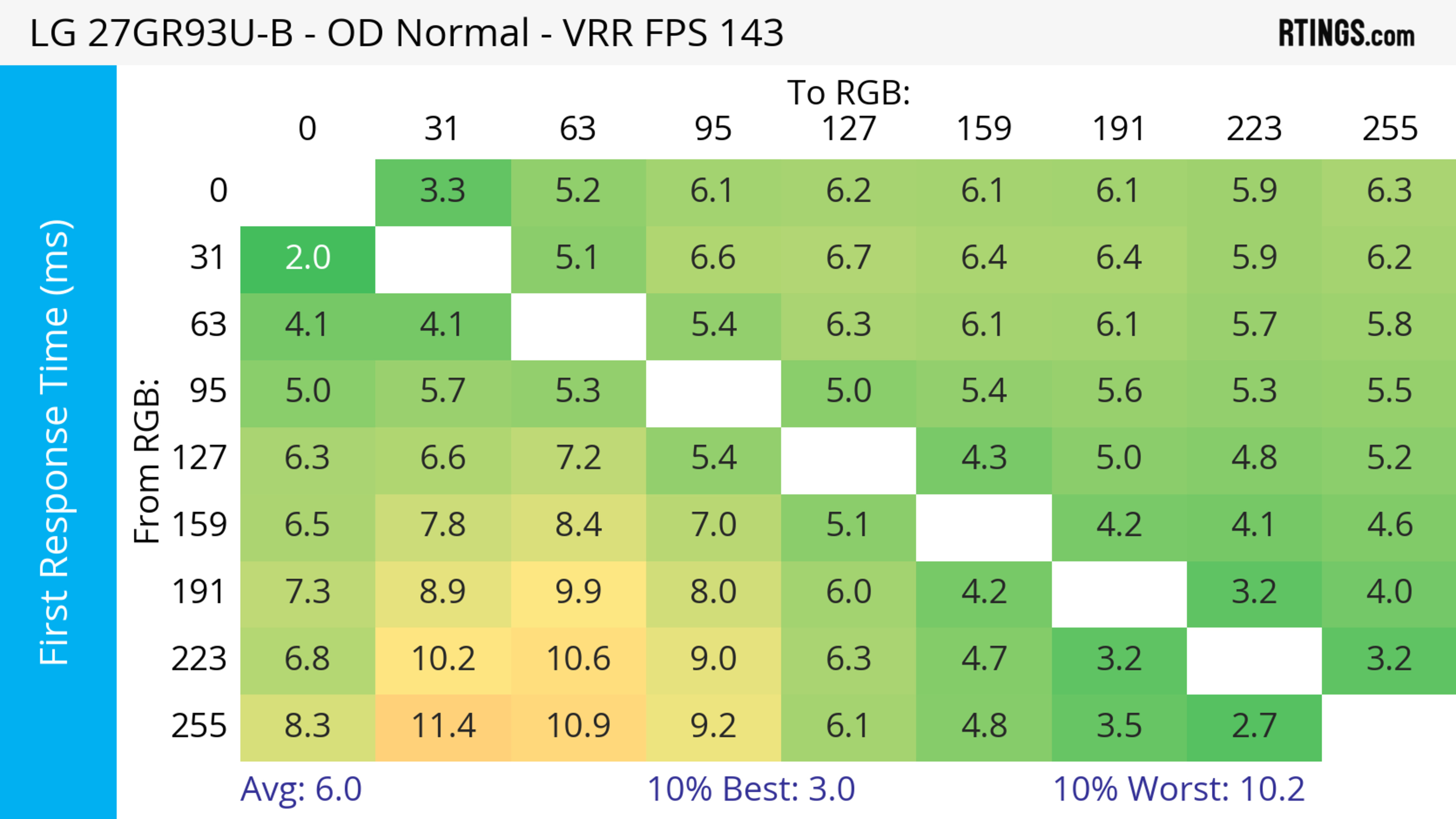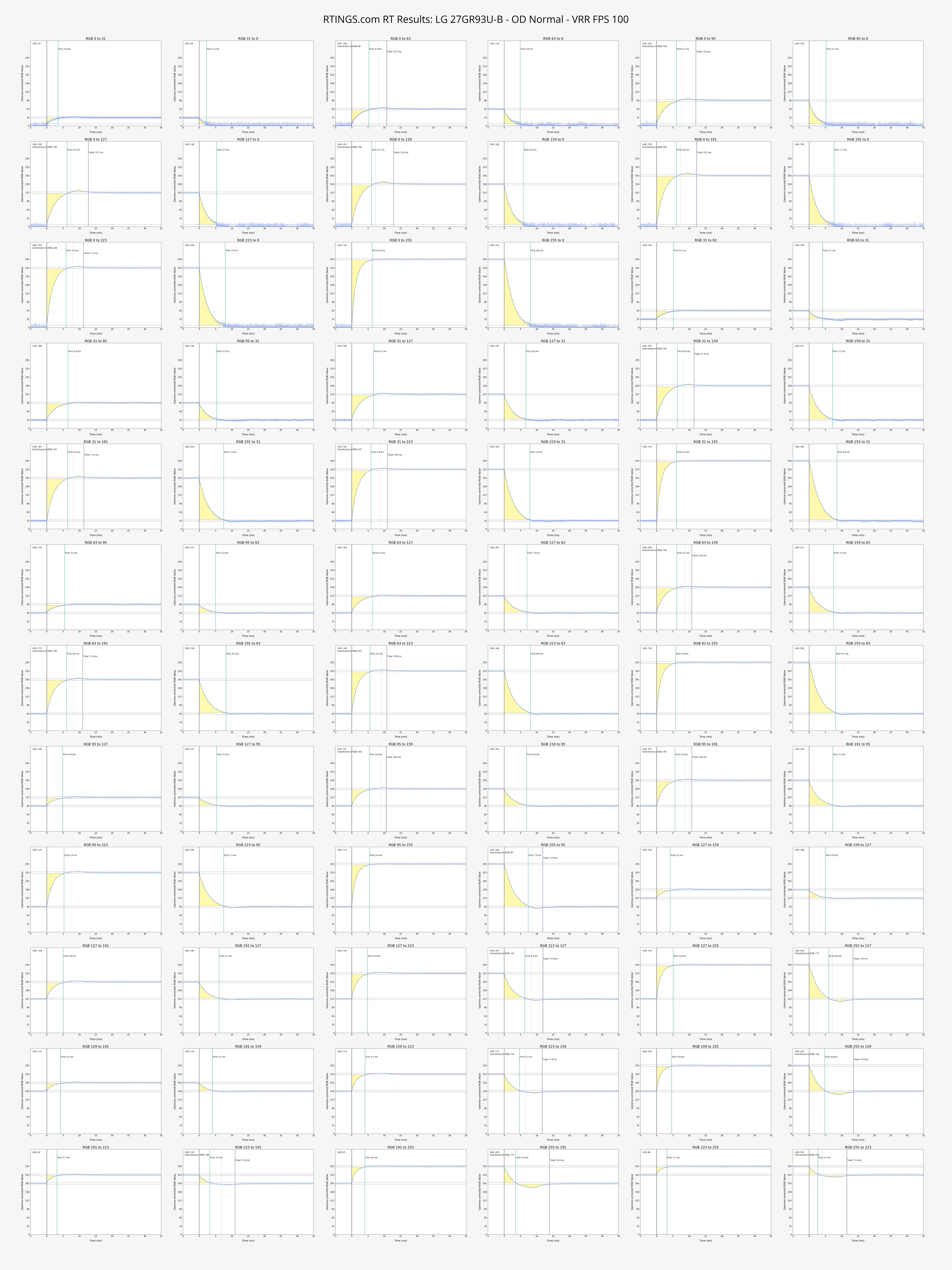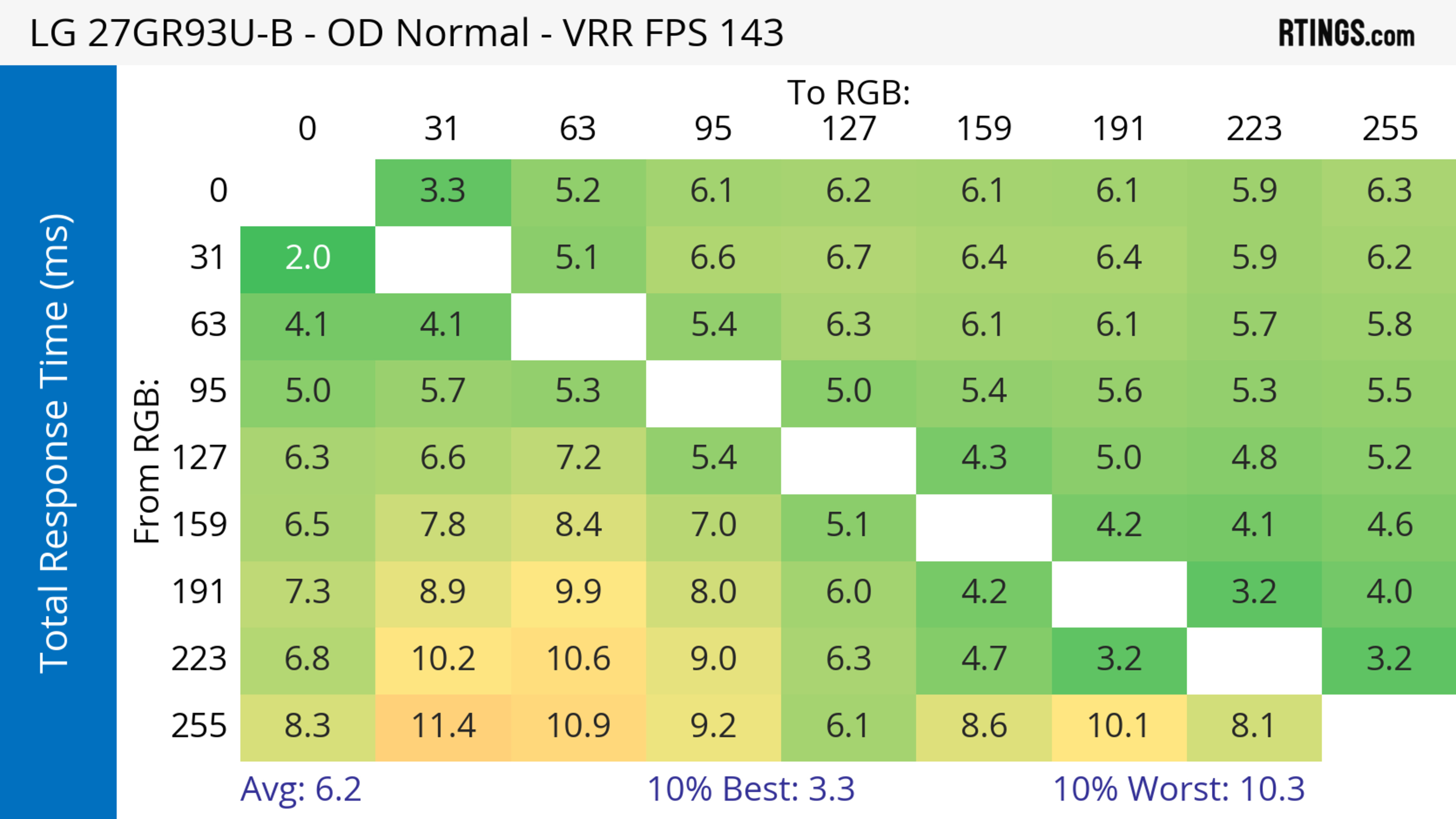 The LG 27GR93U-B has good motion handling across its entire refresh rate range with VRR enabled. Although the 'Fast' overdrive setting performs best at its max refresh rate, the 'Normal' setting is the most consistent as the refresh rate drops, with good CAD and not too much motion blur. The 'Faster' overdrive setting performs so badly that it passes the limits of the graph, as you can see here.