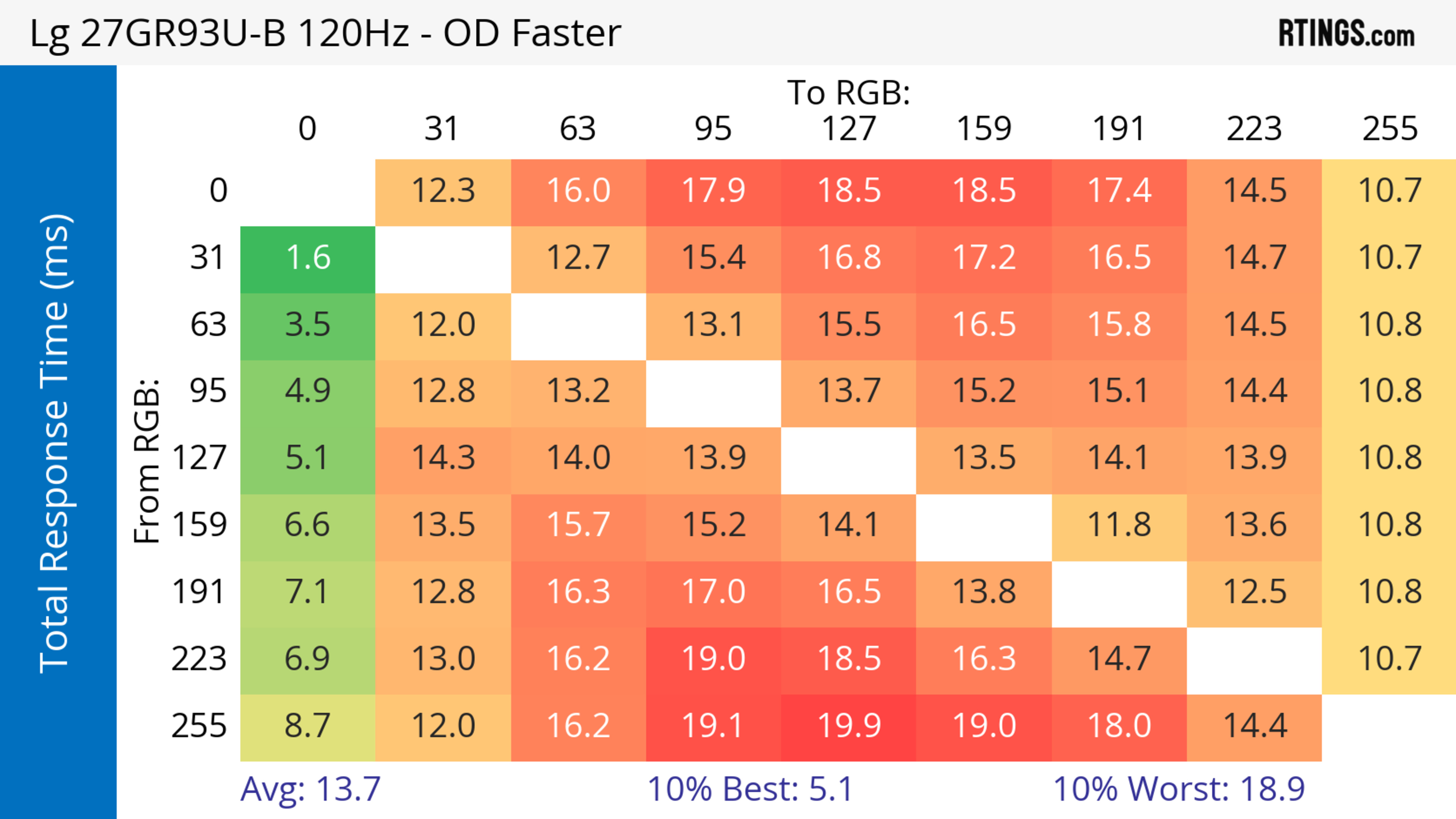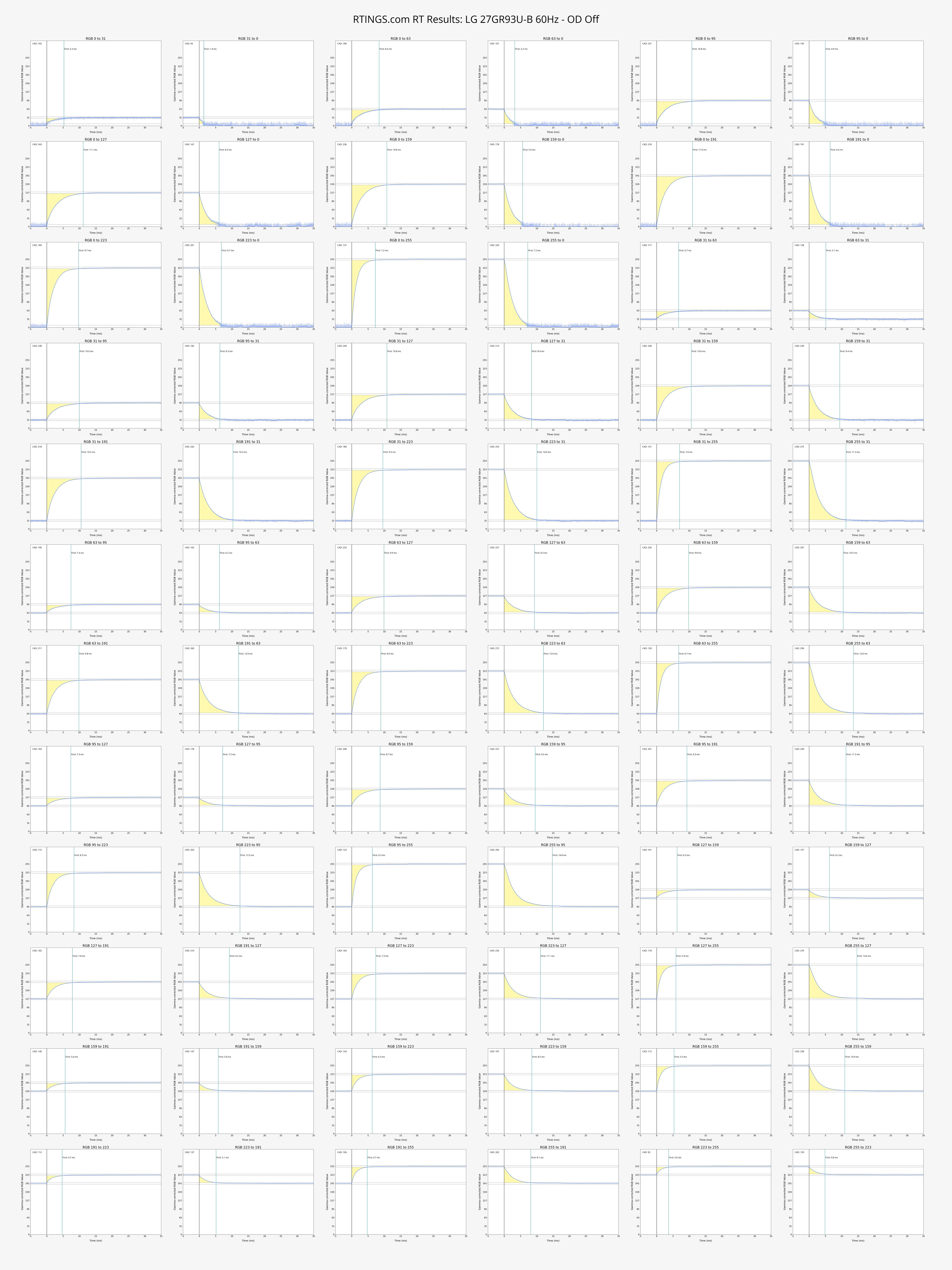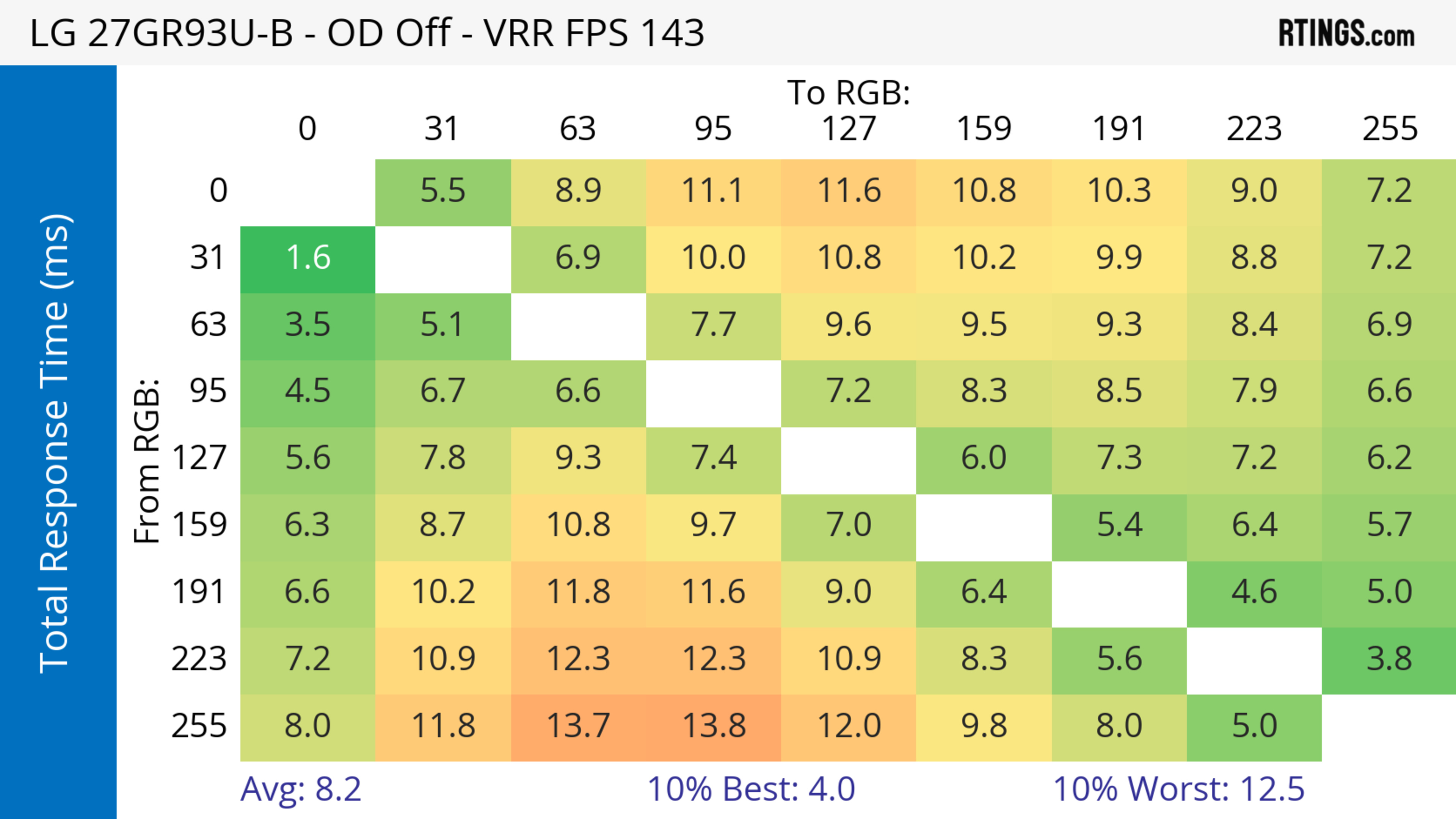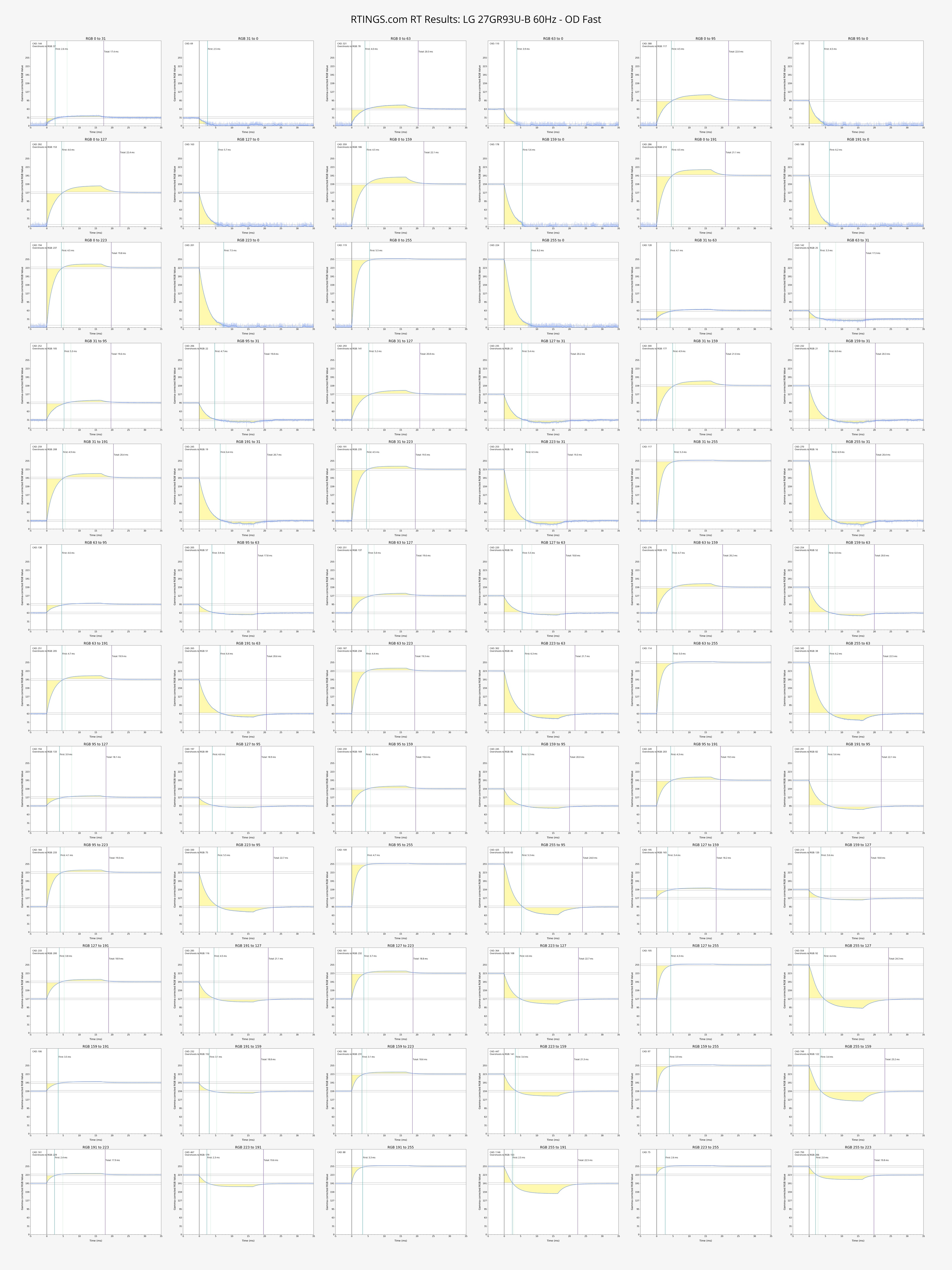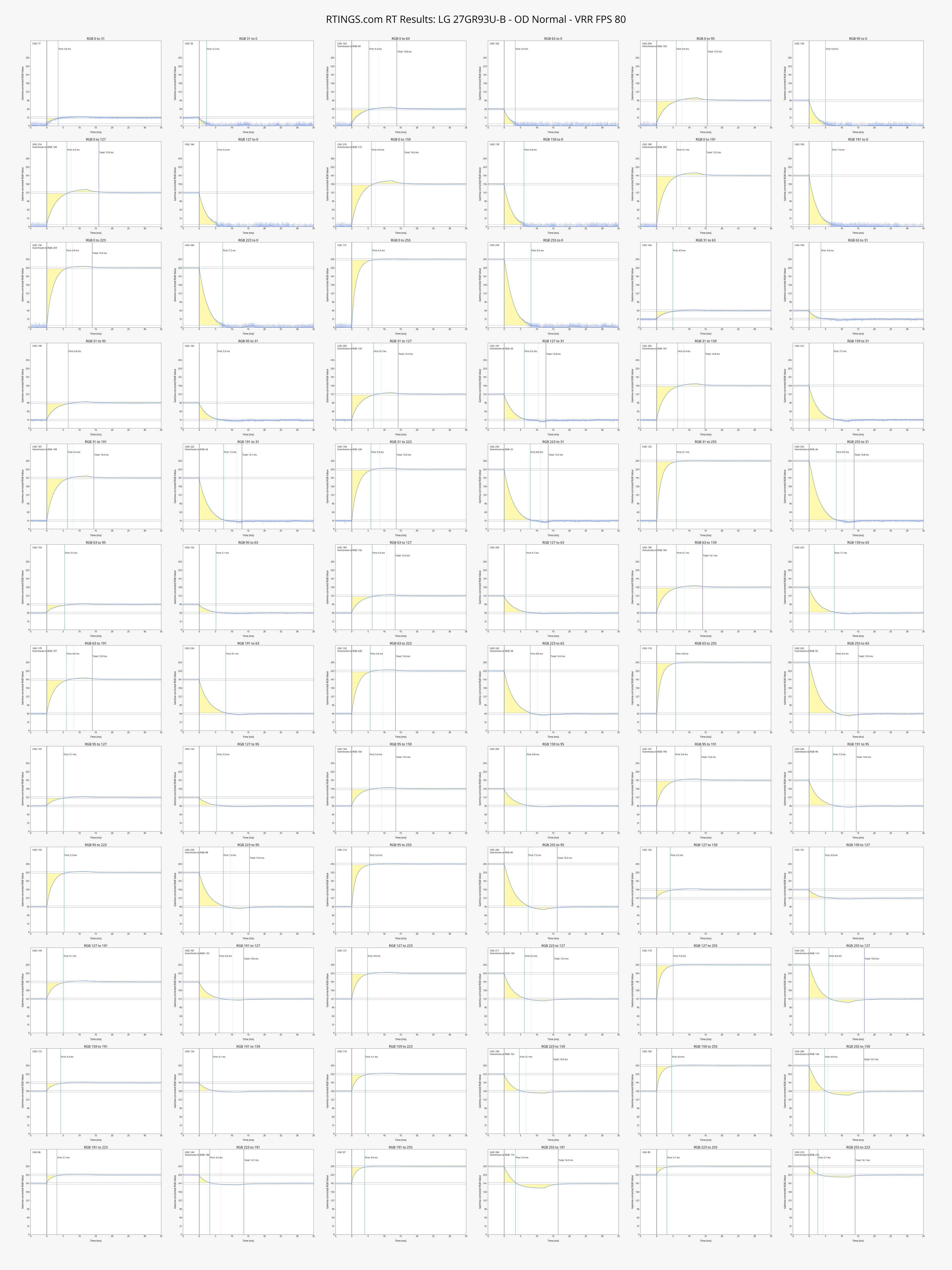 The LG 27GR93U-B has good motion handling across its entire refresh rate range with VRR enabled. Although the 'Fast' overdrive setting performs best at its max refresh rate, the 'Normal' setting is the most consistent as the refresh rate drops, with good CAD and not too much motion blur. The 'Faster' overdrive setting performs so badly that it passes the limits of the graph, as you can see here.