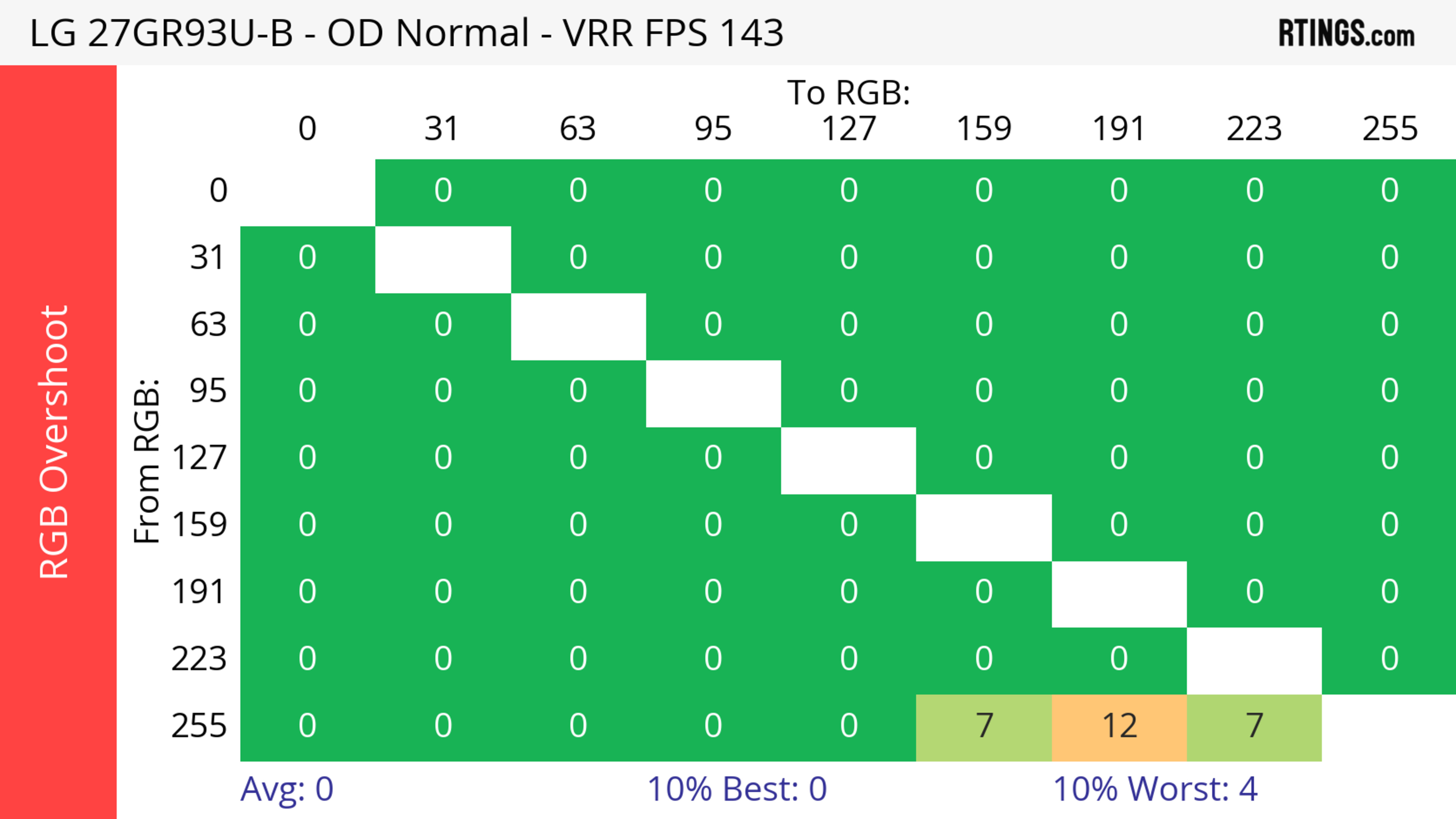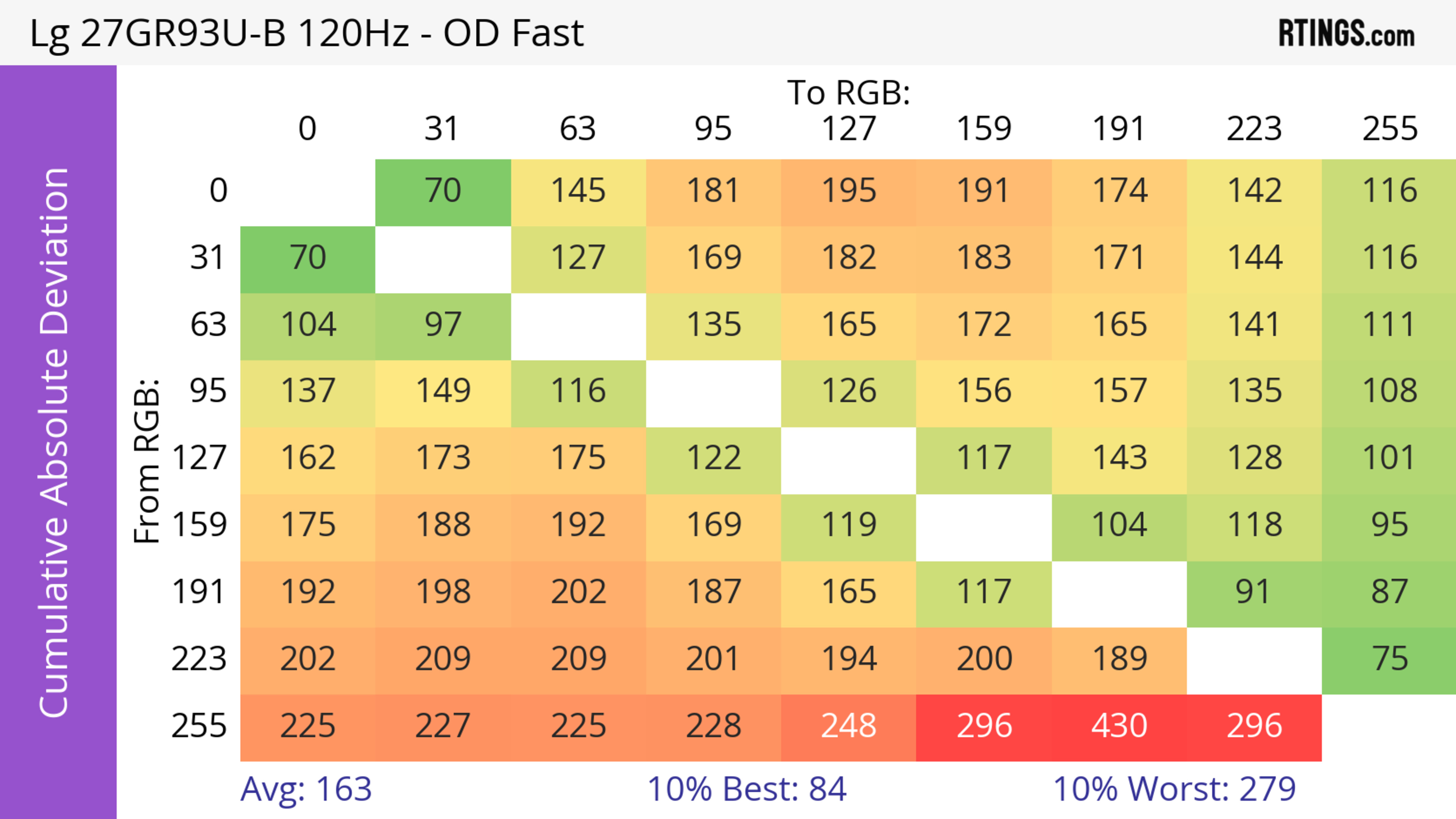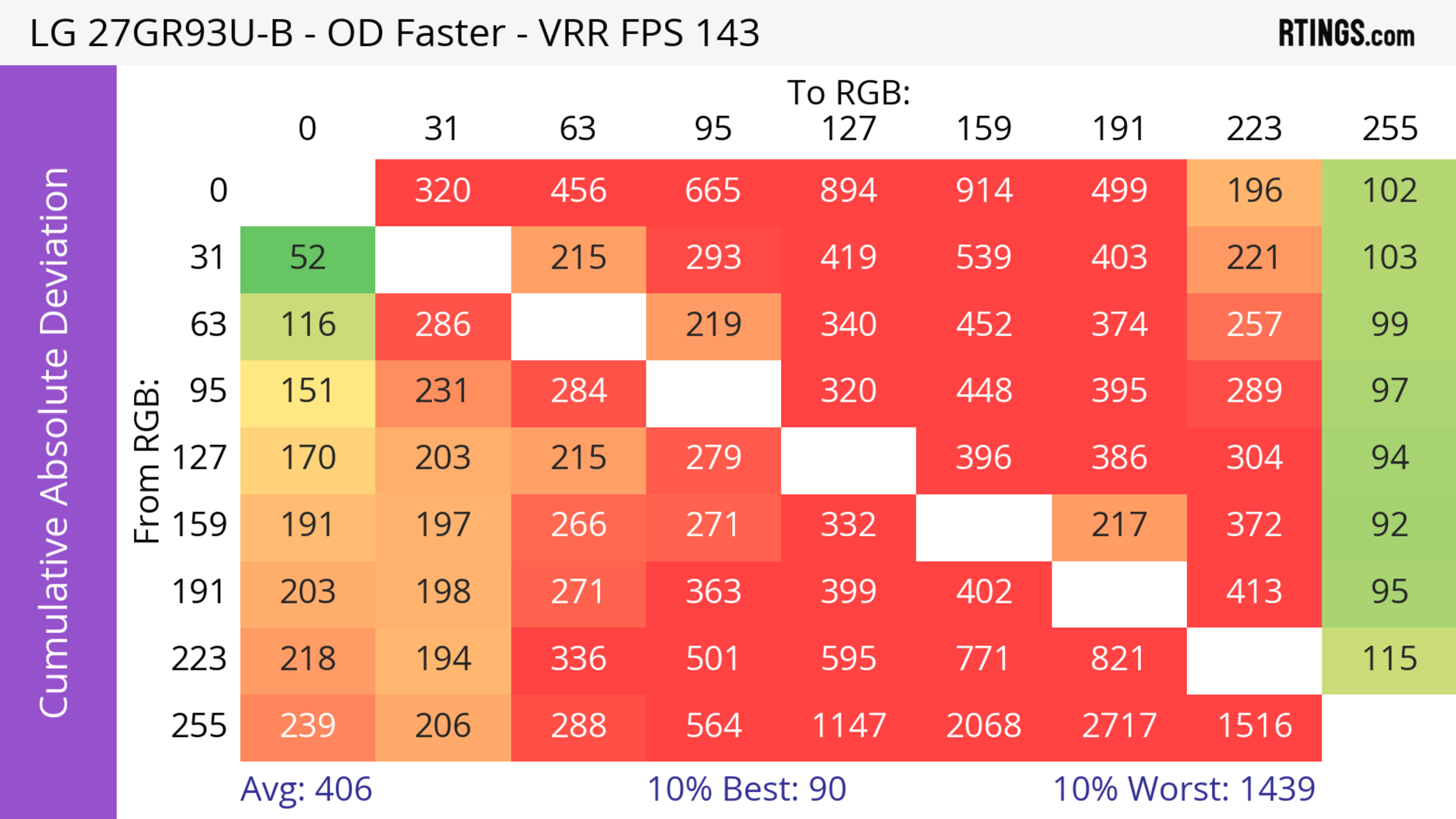 The CAD at the max refresh rate is very good. Even though the 'Fast' overdrive setting has a bit more overshoot than 'Normal', it's still within an acceptable an amount and has lower CAD, whereas the 'Faster' overdrive setting has too much overshoot.