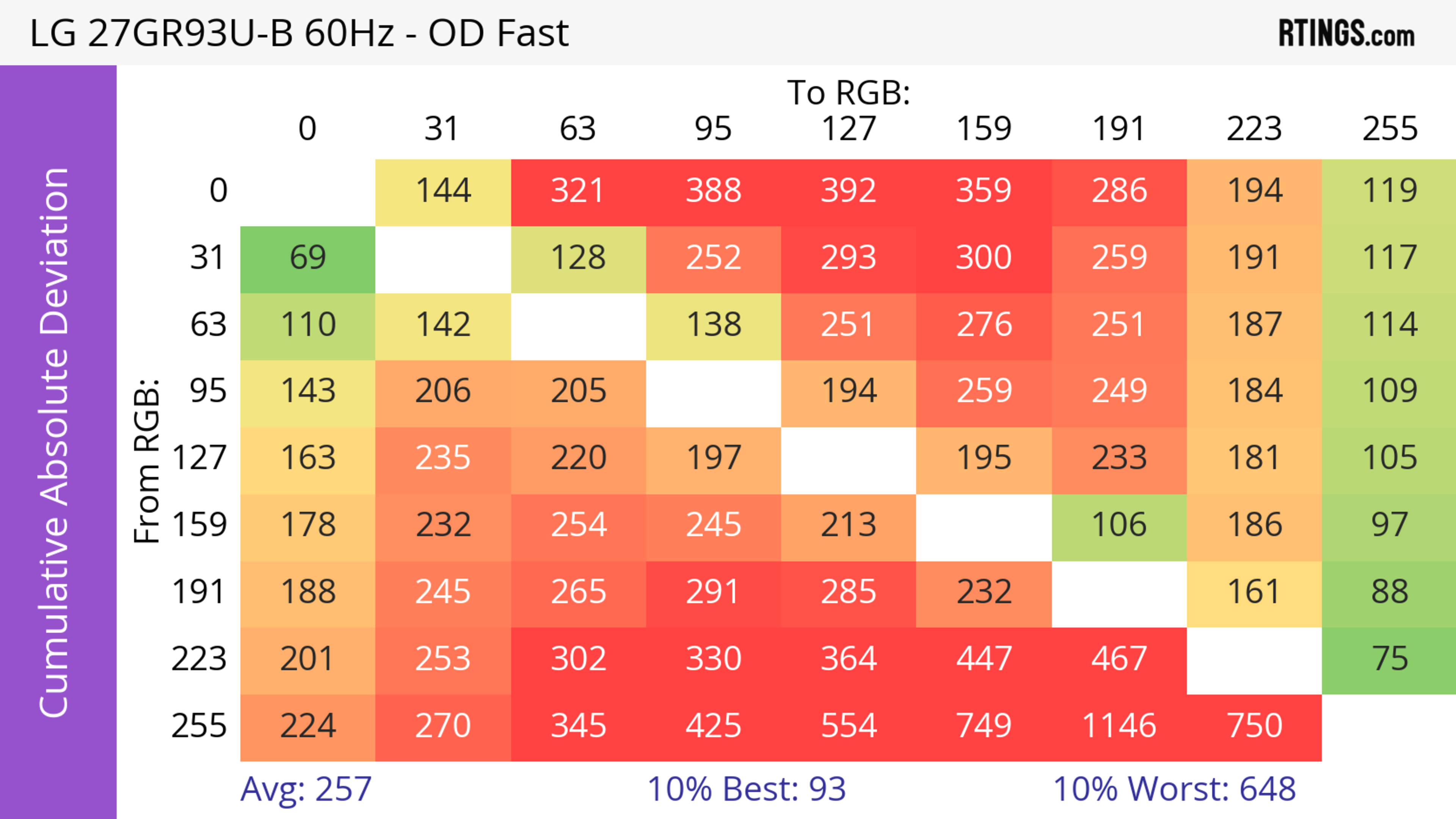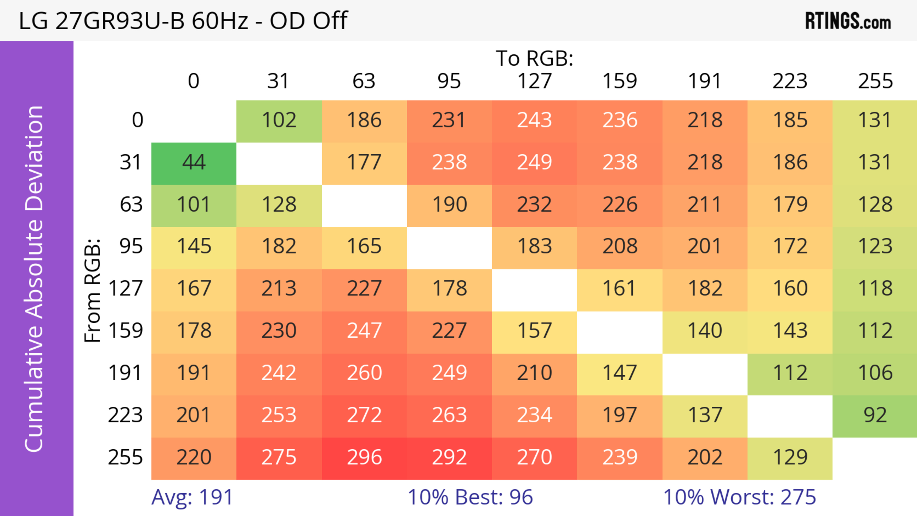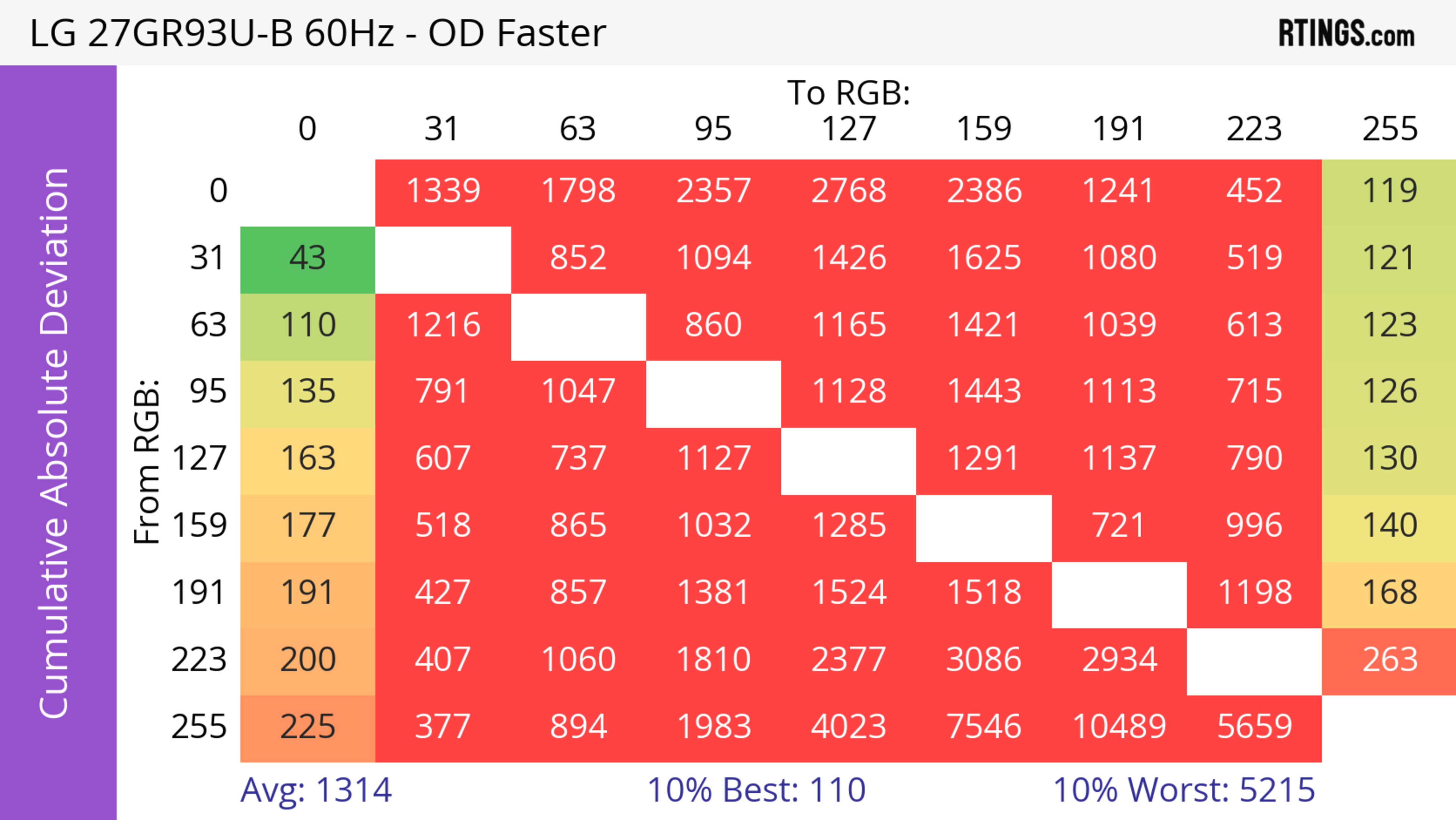The CAD at 60Hz is decent. Although the recommended overdrive setting of 'Normal' has the lowest CAD, it has some inverse ghosting, so if that bothers you, it's better to use the 'Off' setting, which has a similar CAD and has the fastest total response time.