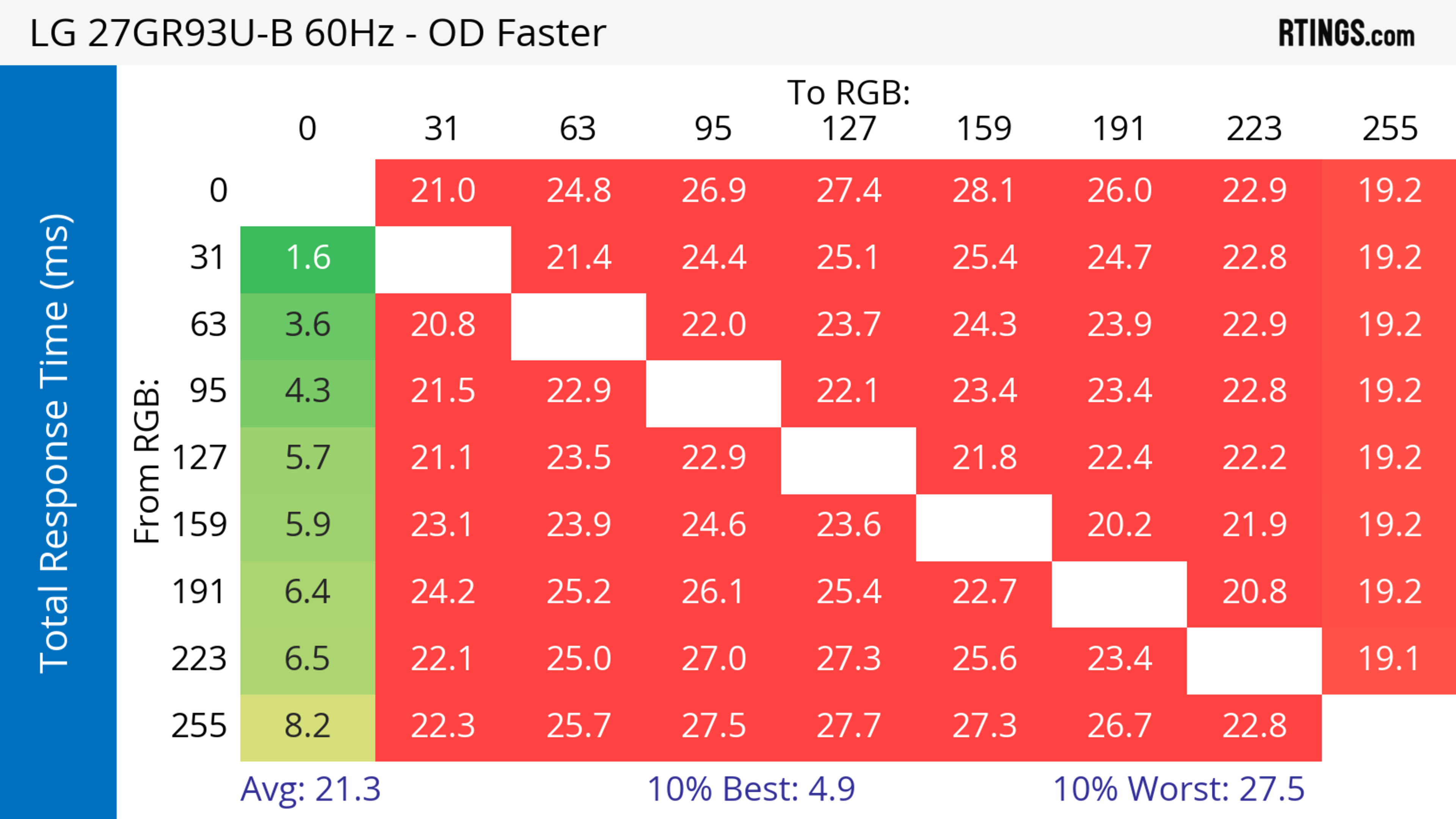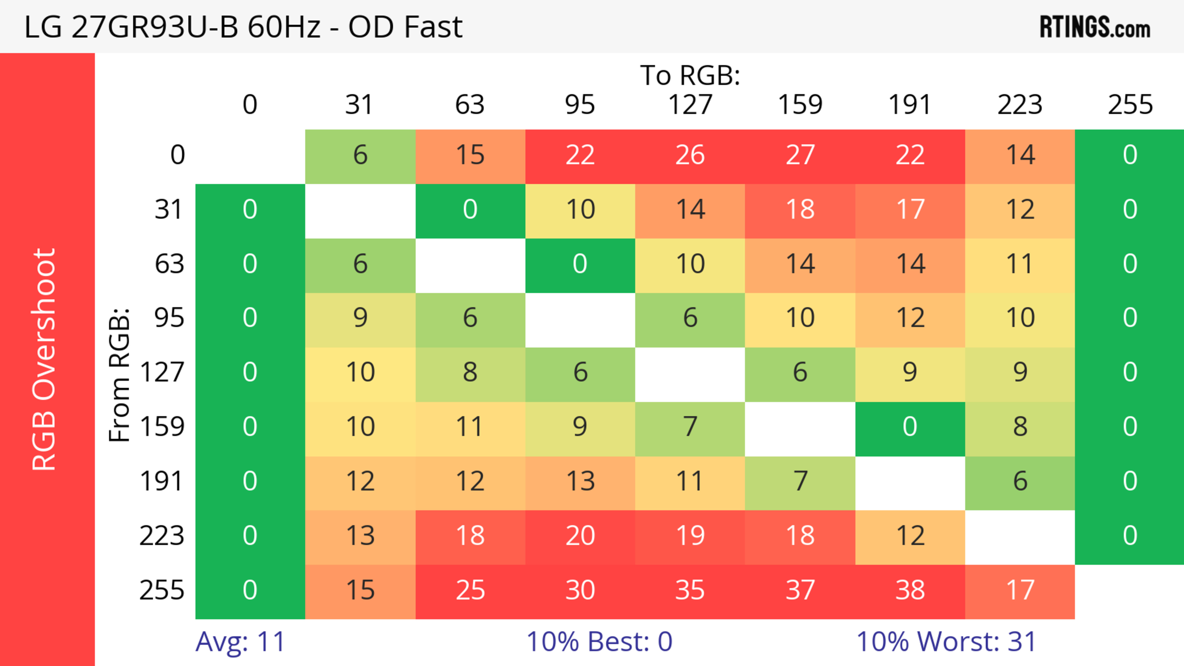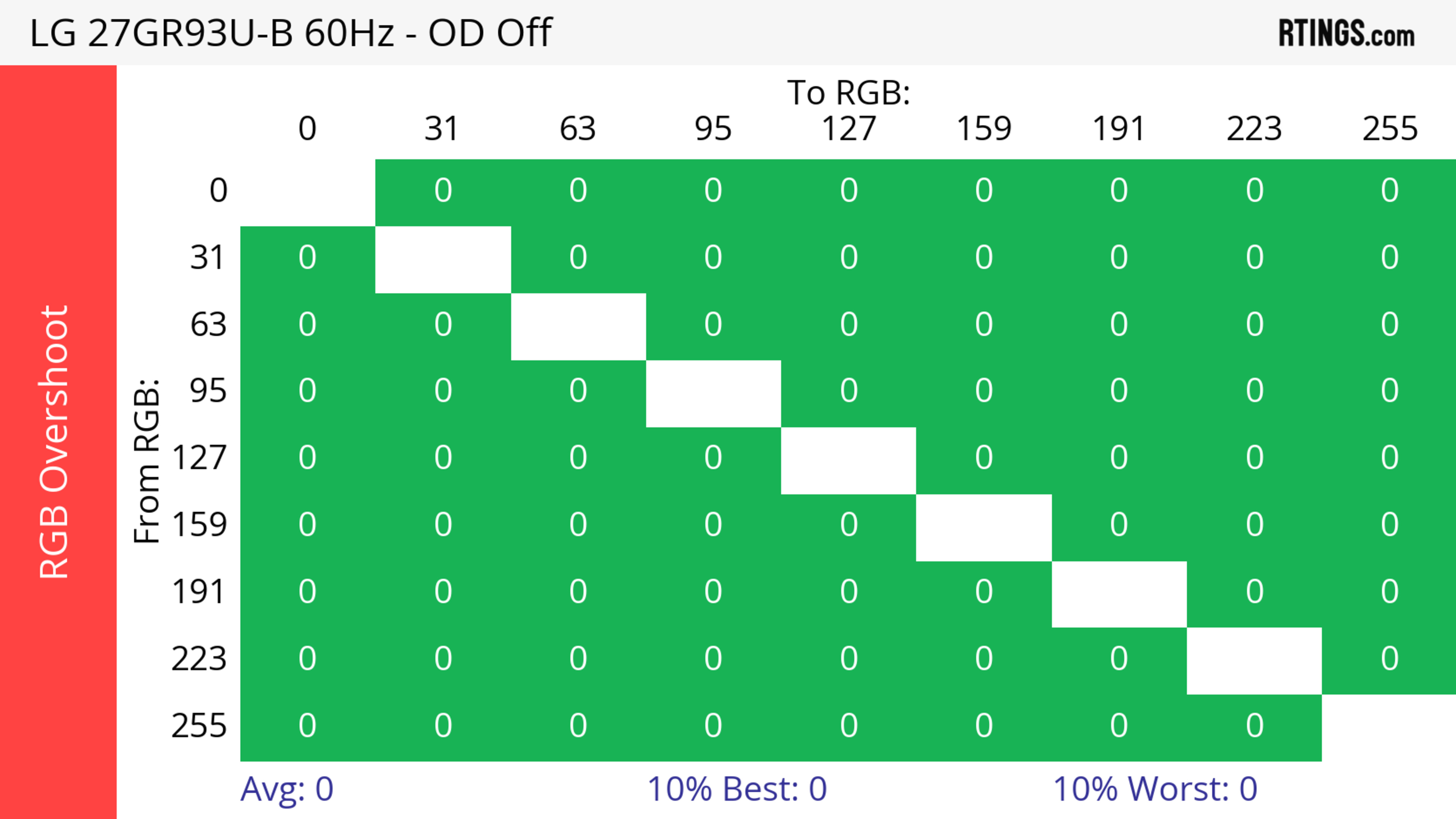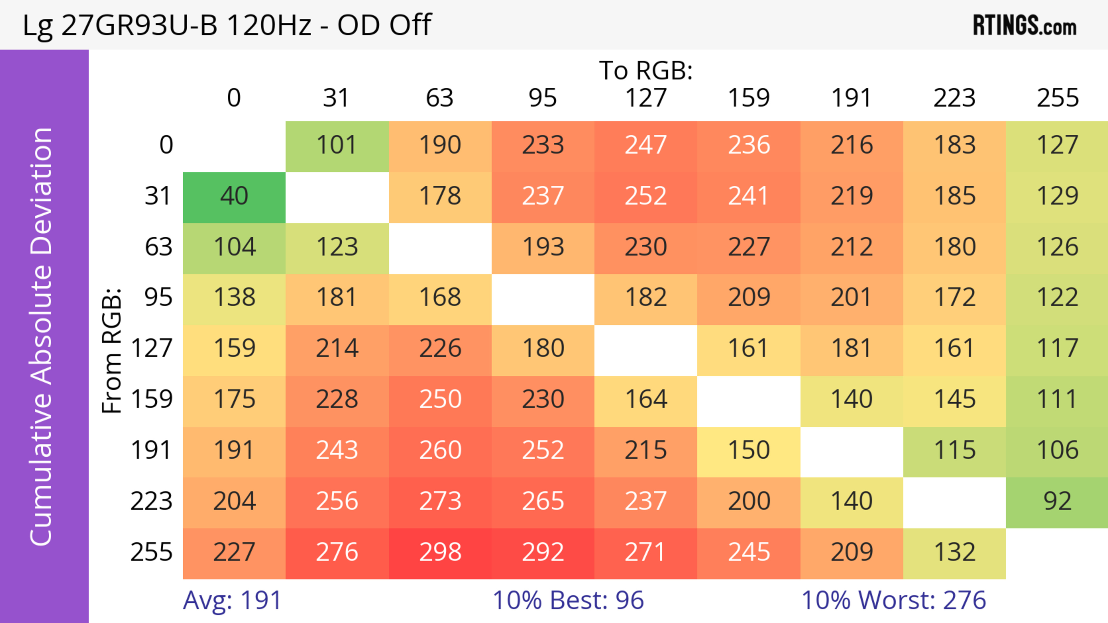 The CAD at 60Hz is decent. Although the recommended overdrive setting of 'Normal' has the lowest CAD, it has some inverse ghosting, so if that bothers you, it's better to use the 'Off' setting, which has a similar CAD and has the fastest total response time.