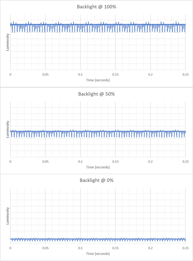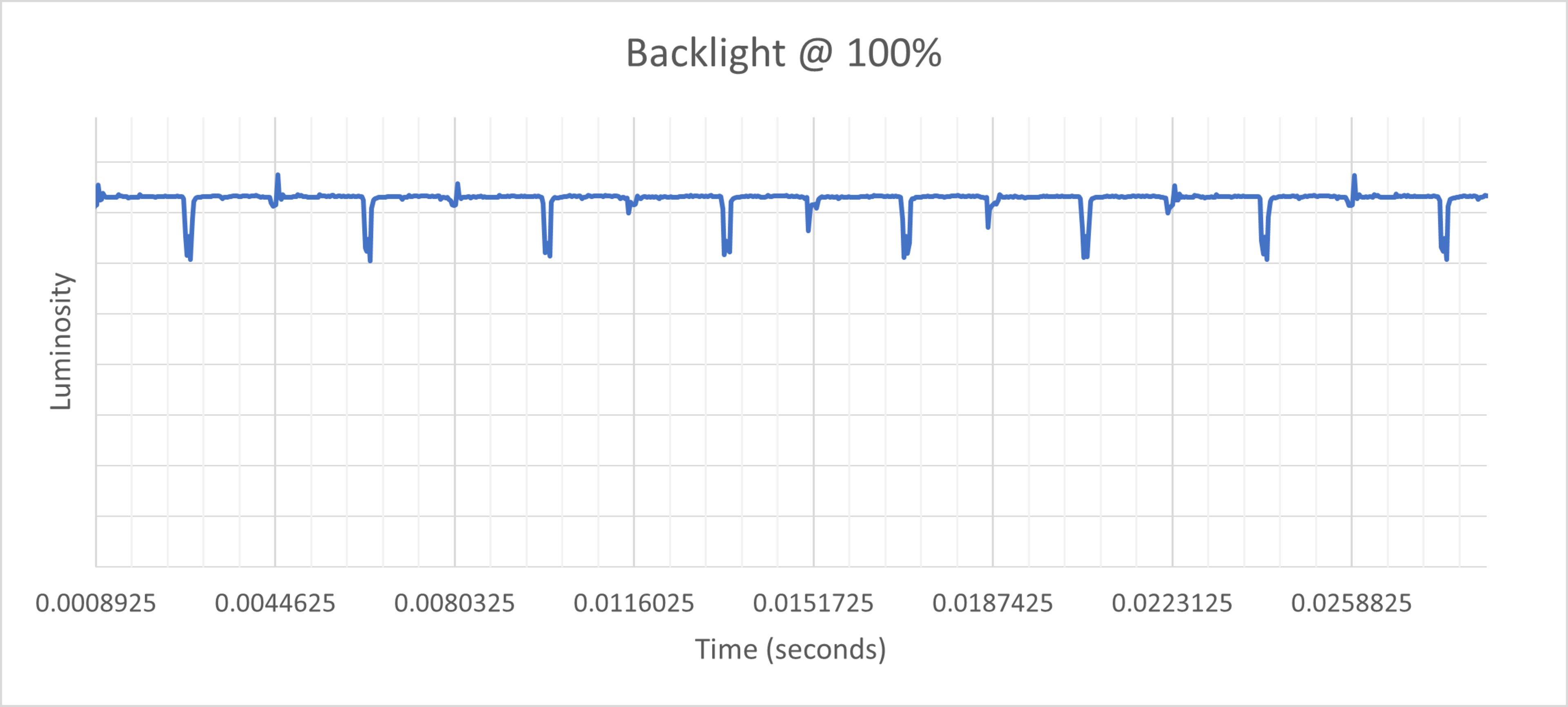 While not the same as pulse-width modulation (PWM), there's a slight dip in brightness that corresponds to the monitor's refresh rate. There's also an additional dip or jump halfway through the cycle.