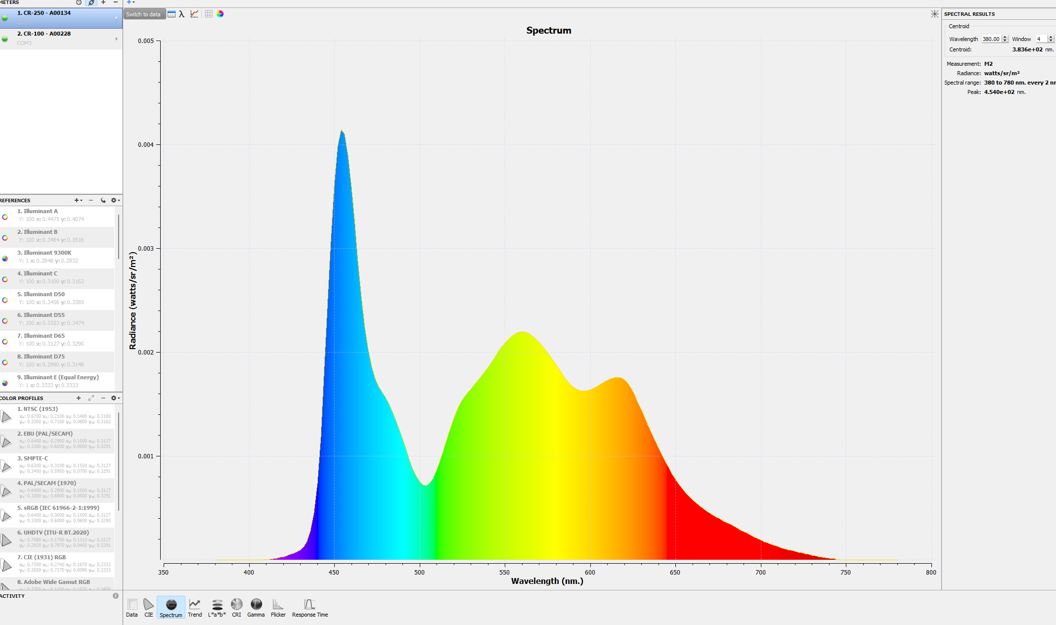 The RGB Tandem OLED panel allows for better color purity compared to previous-generation WOLED panels. You can see this with its spectral power distribution (SPD) graph compared to the SPD of the LG 27GX790A-B, which uses a third-gen WOLED panel.