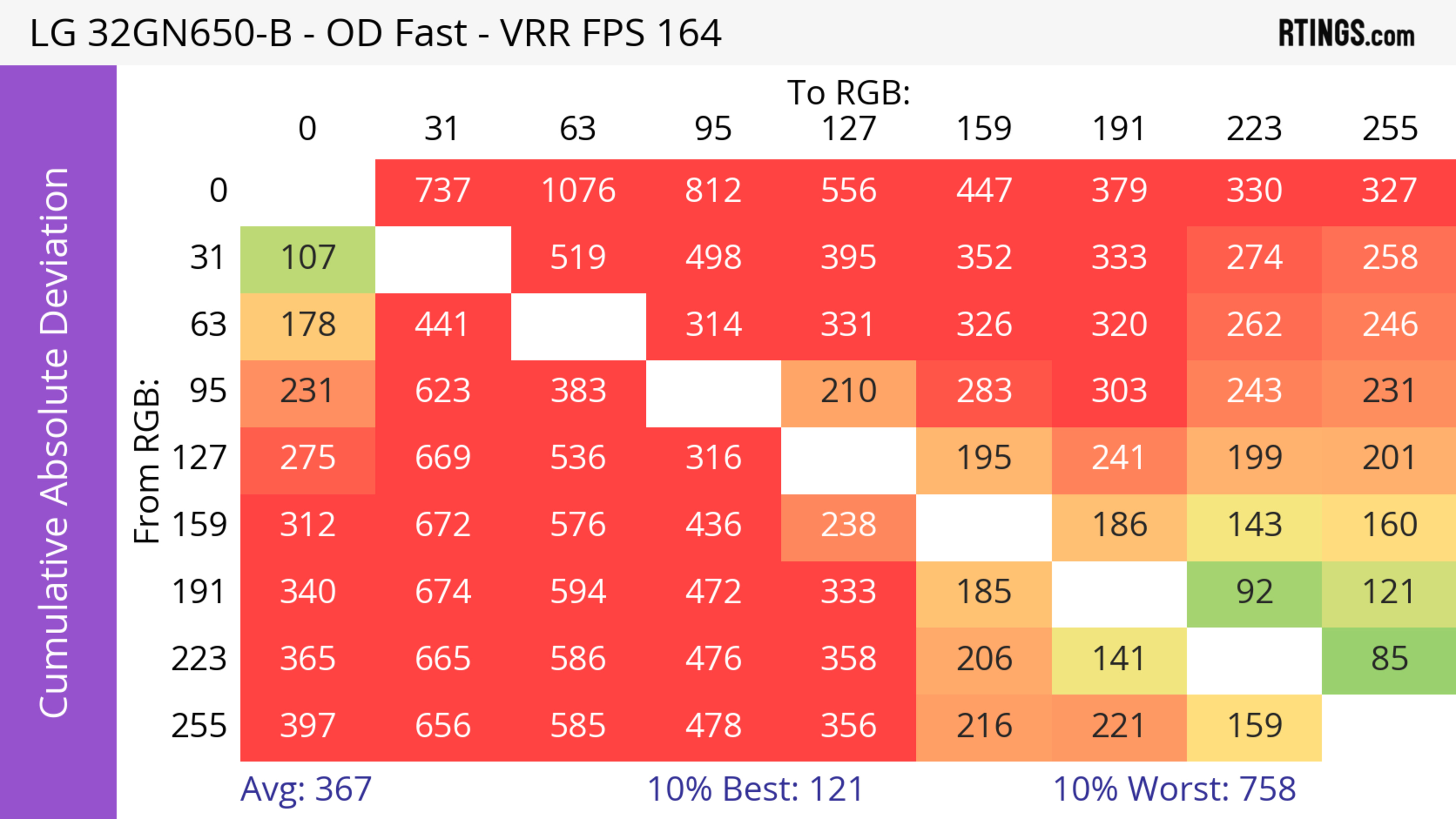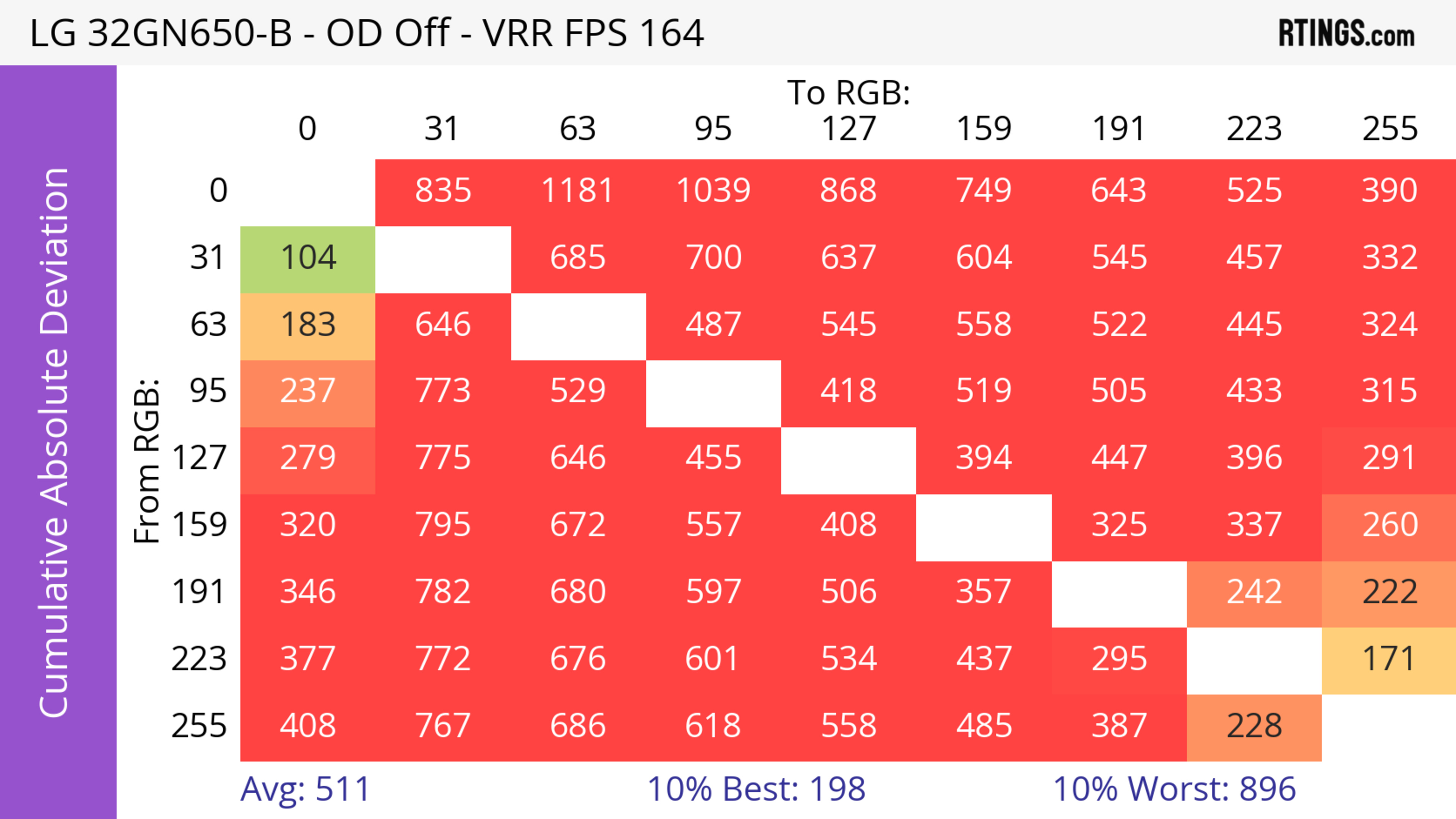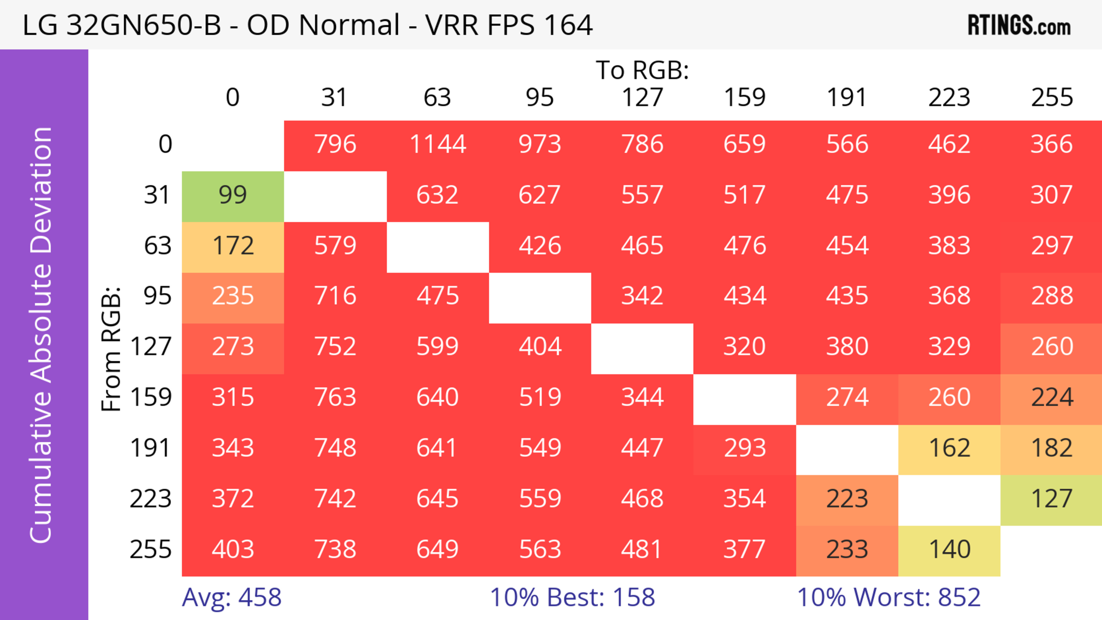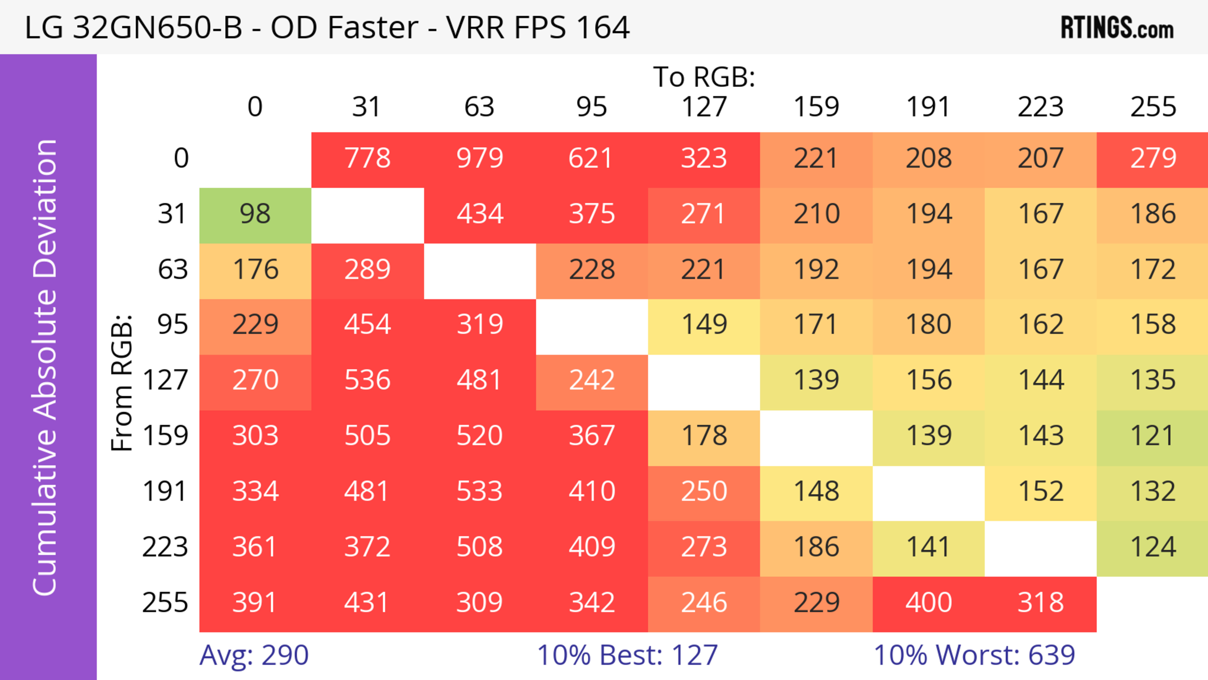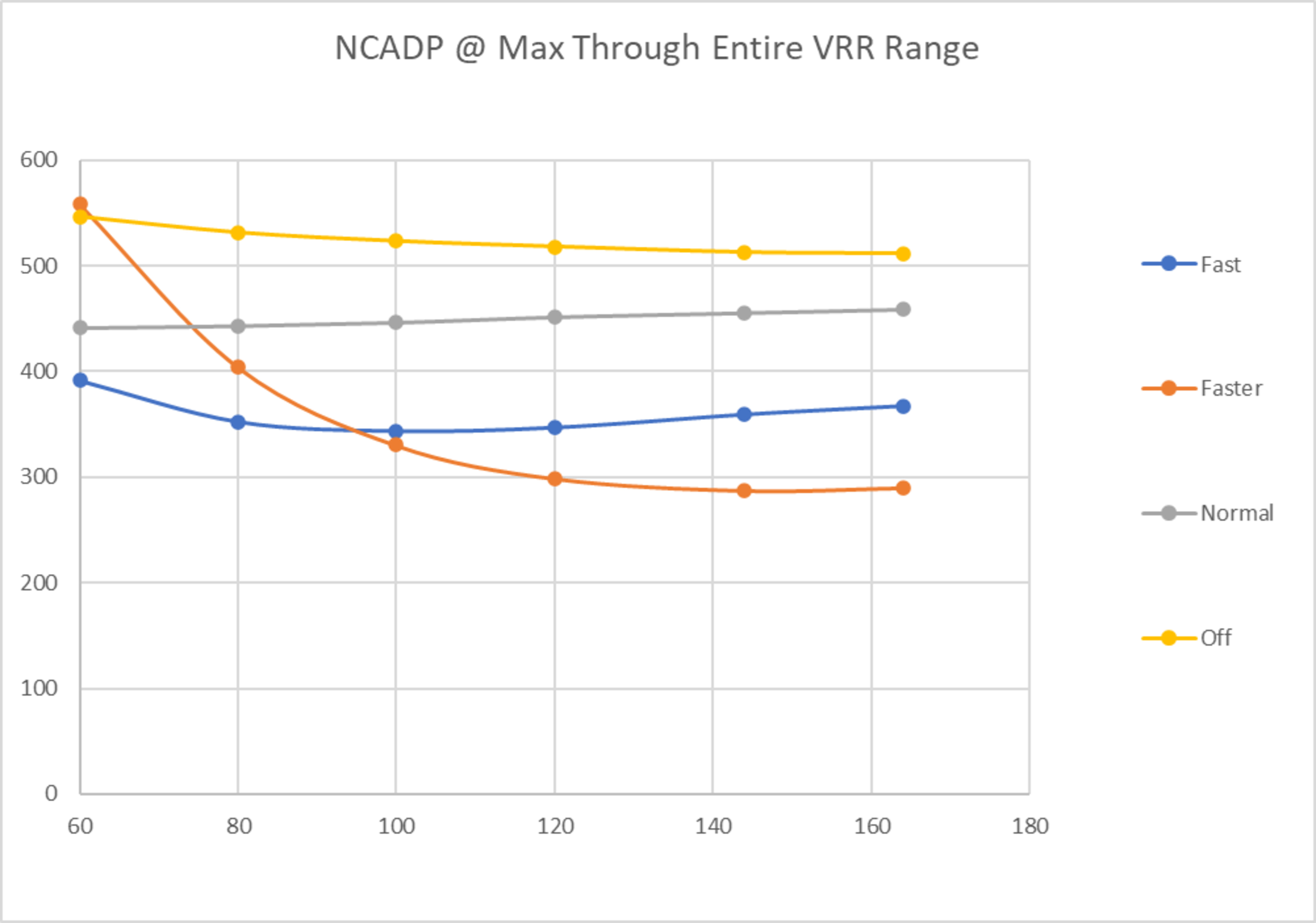 The motion handling is disappointing across the VRR range. There's noticeable smearing and blur, and there's more inverse ghosting at lower refresh rates. Although the 'Faster' overdrive setting is the best at high refresh rates, the 'Fast' setting is more consistent across the VRR range. The other settings have such high CAD that it passes the limits of the chart, and you can see an alternative chart here.