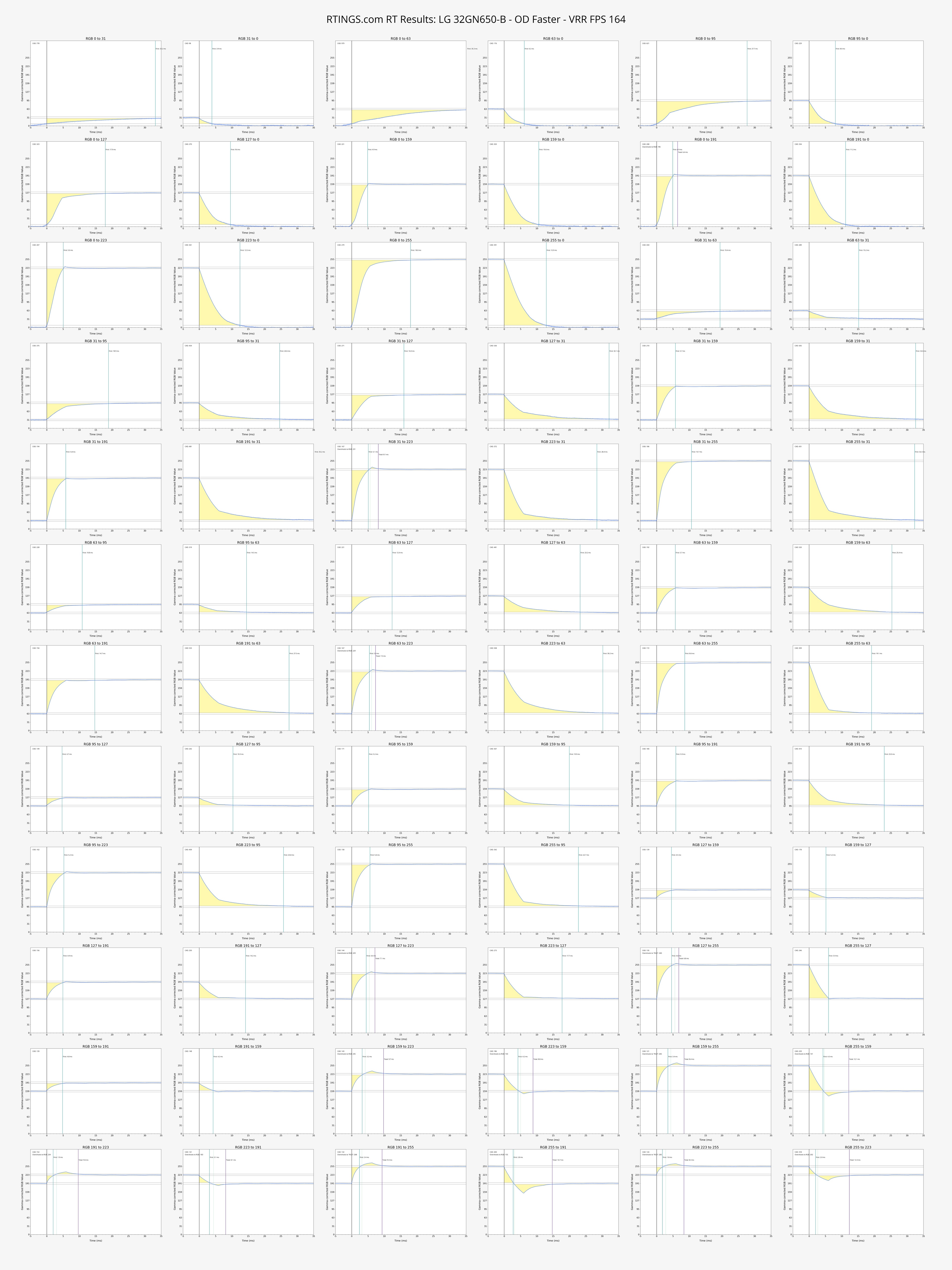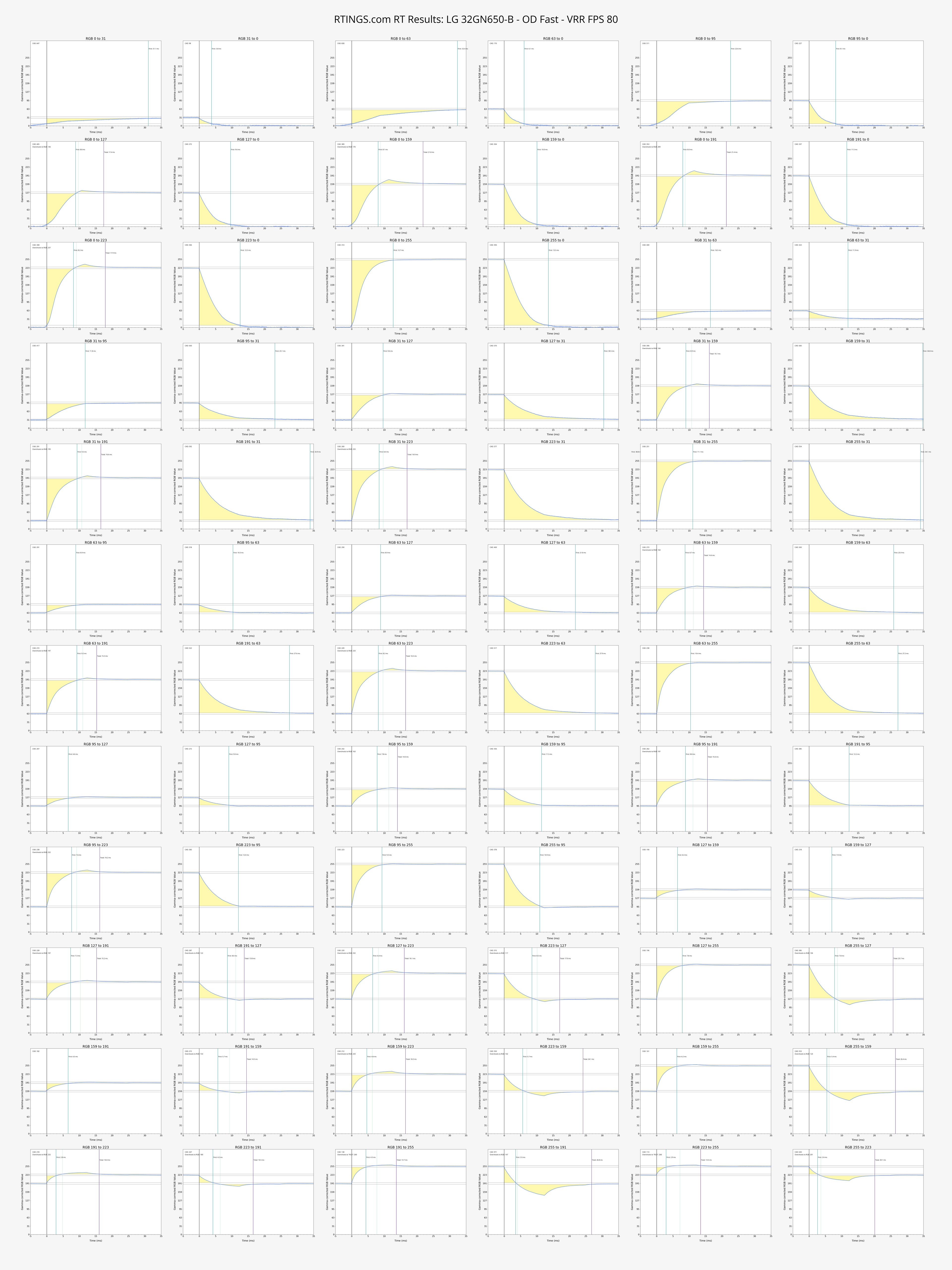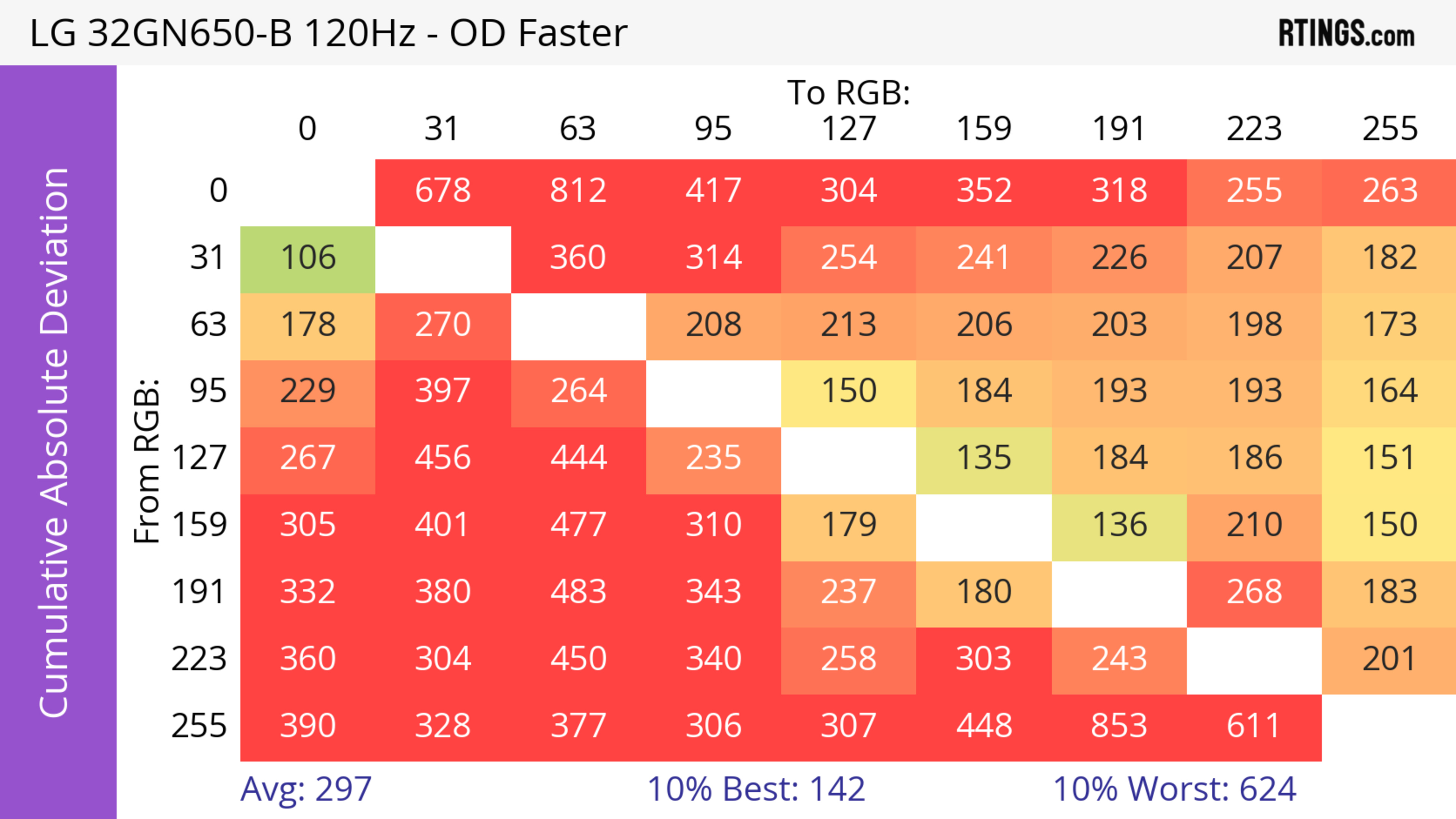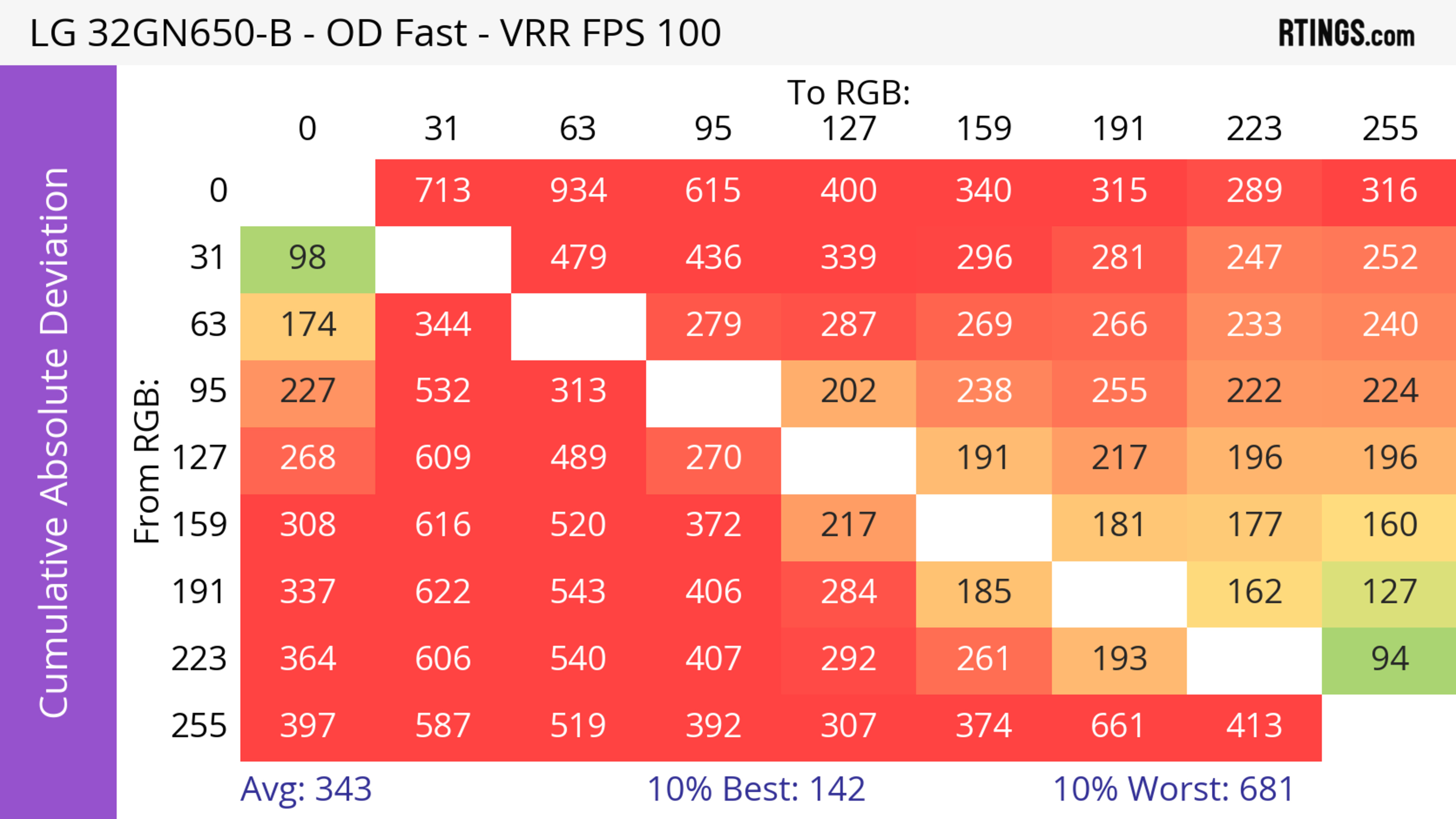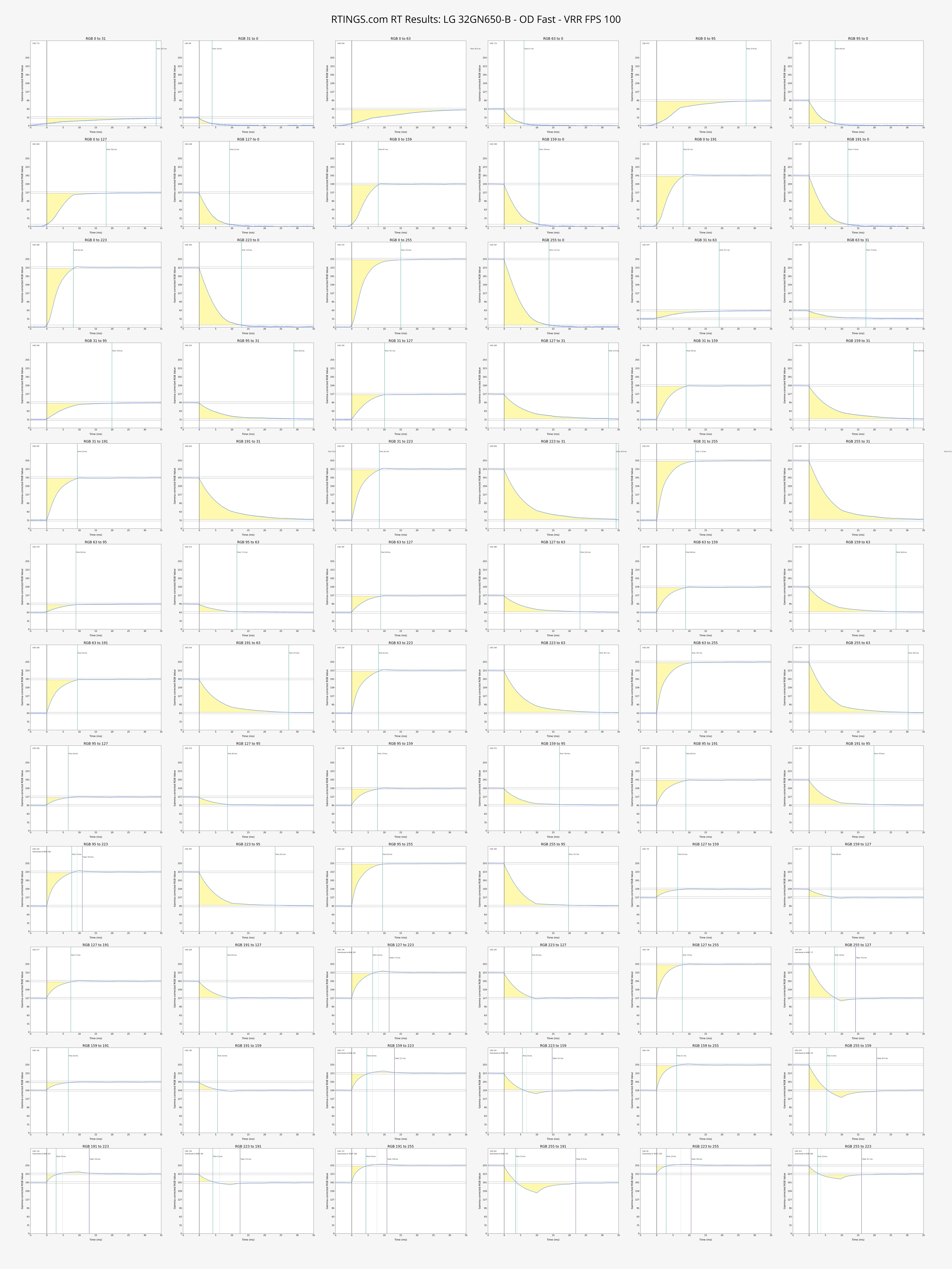 The motion handling is disappointing across the VRR range. There's noticeable smearing and blur, and there's more inverse ghosting at lower refresh rates. Although the 'Faster' overdrive setting is the best at high refresh rates, the 'Fast' setting is more consistent across the VRR range. The other settings have such high CAD that it passes the limits of the chart, and you can see an alternative chart here.