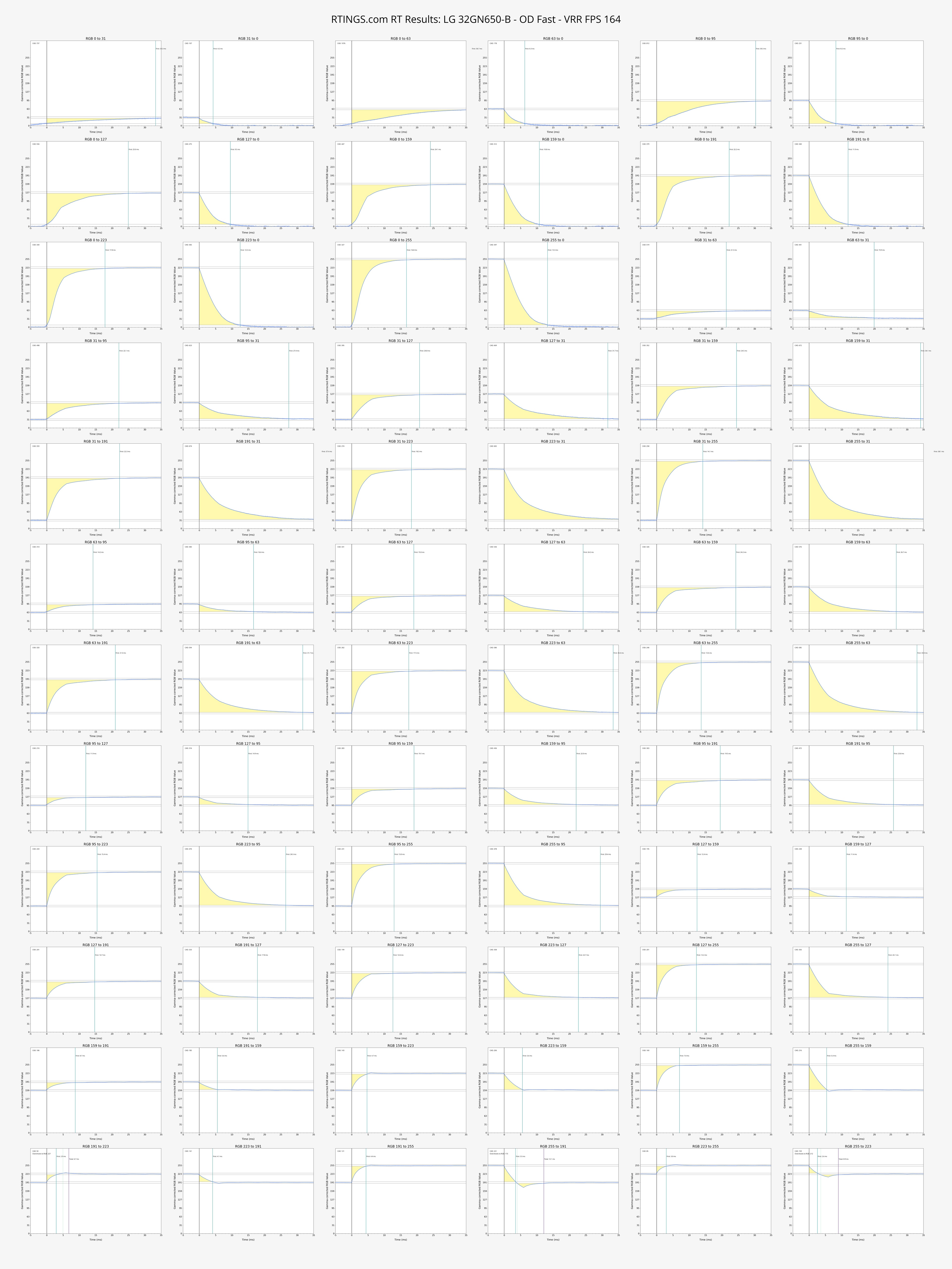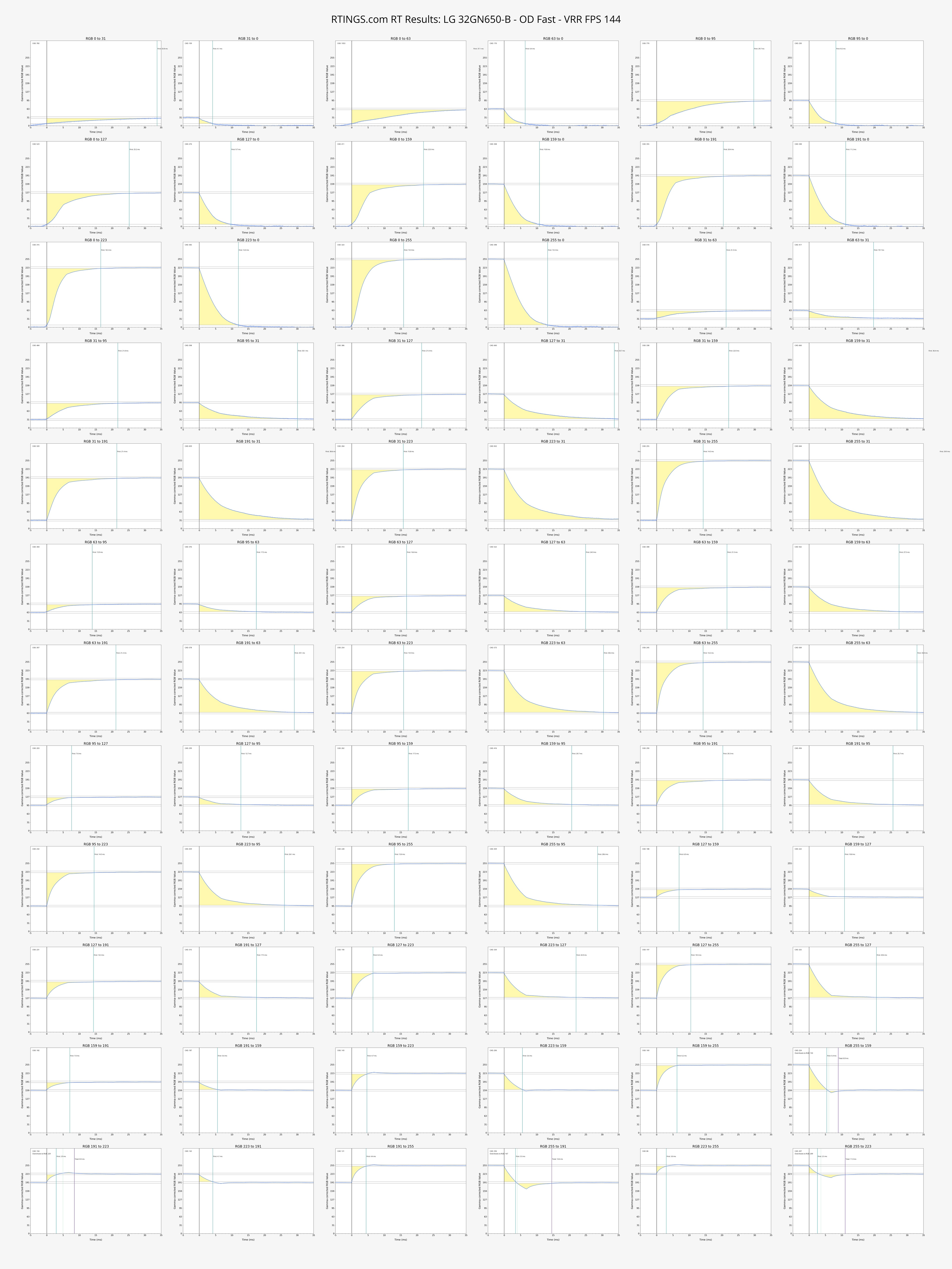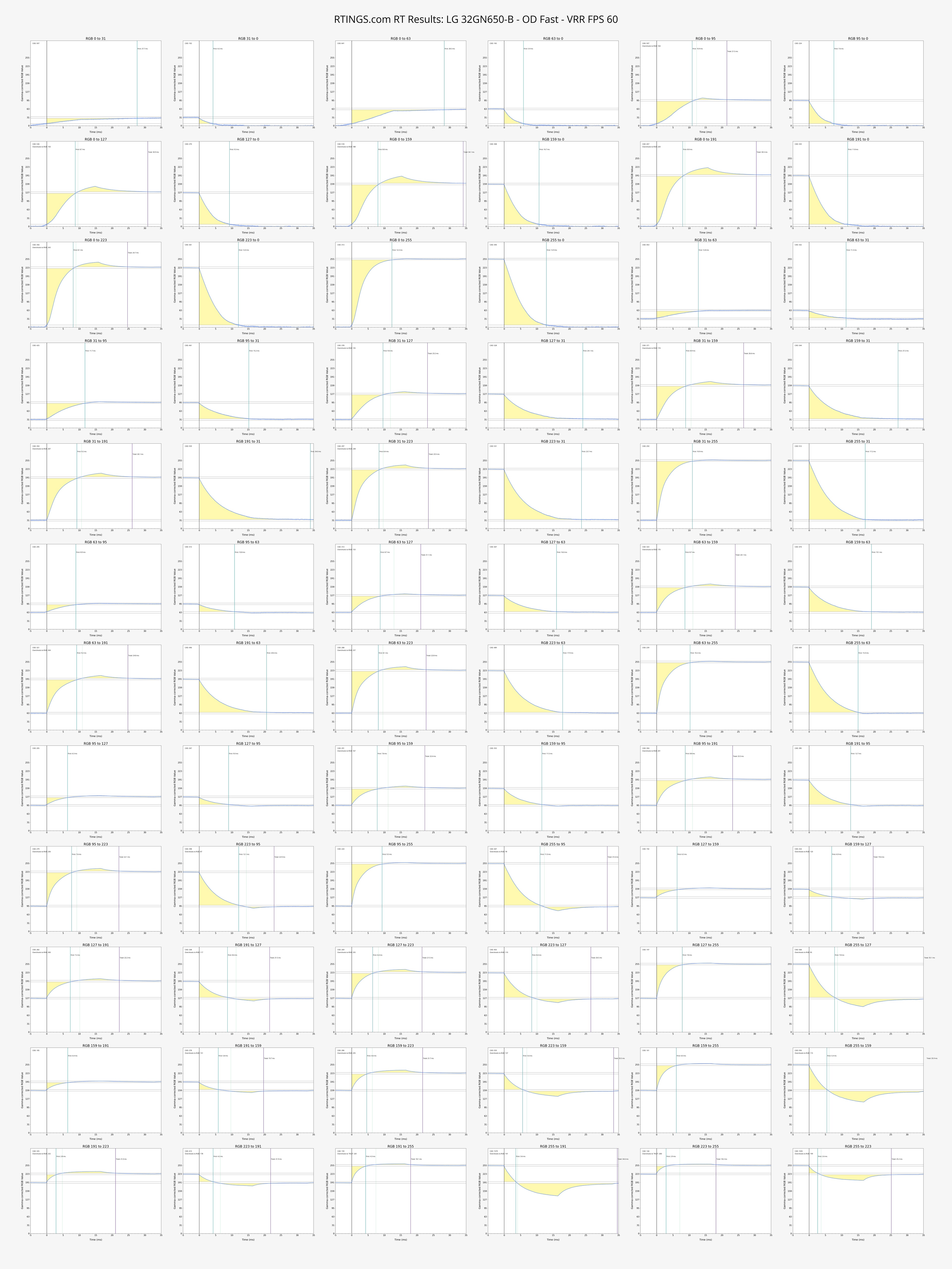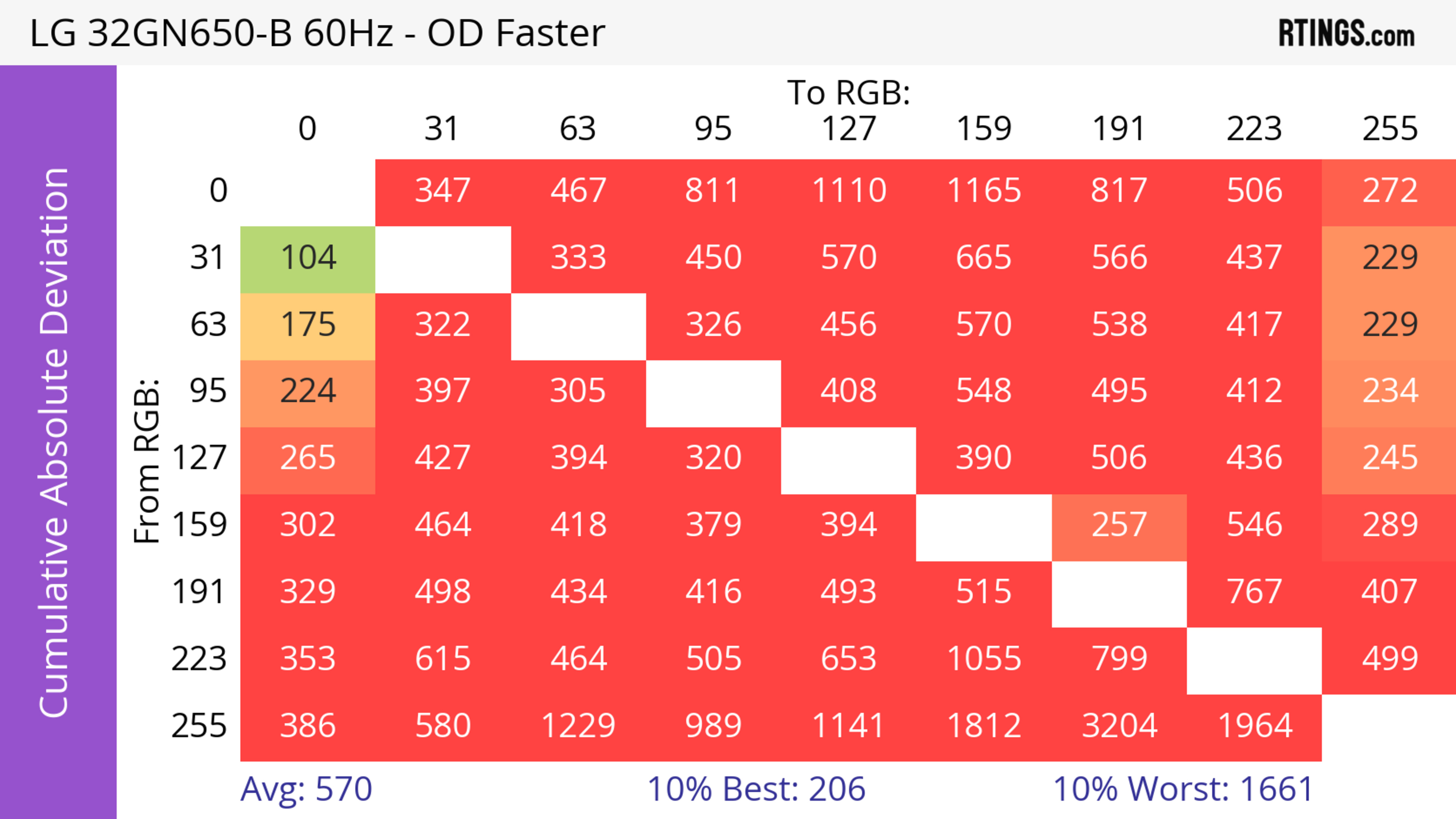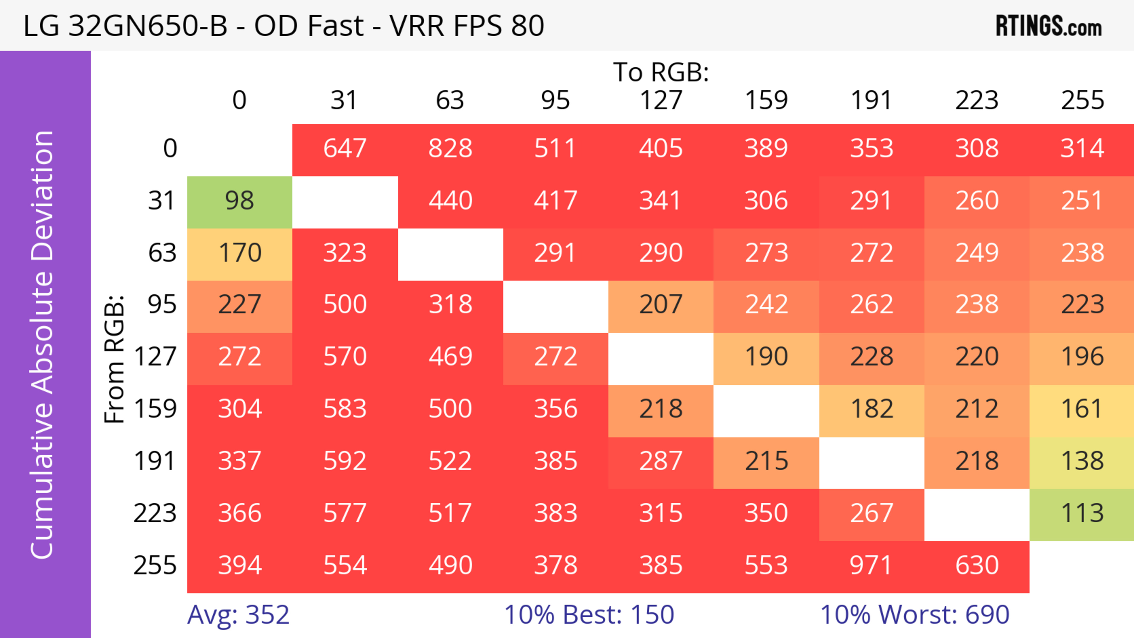 The motion handling is disappointing across the VRR range. There's noticeable smearing and blur, and there's more inverse ghosting at lower refresh rates. Although the 'Faster' overdrive setting is the best at high refresh rates, the 'Fast' setting is more consistent across the VRR range. The other settings have such high CAD that it passes the limits of the chart, and you can see an alternative chart here.