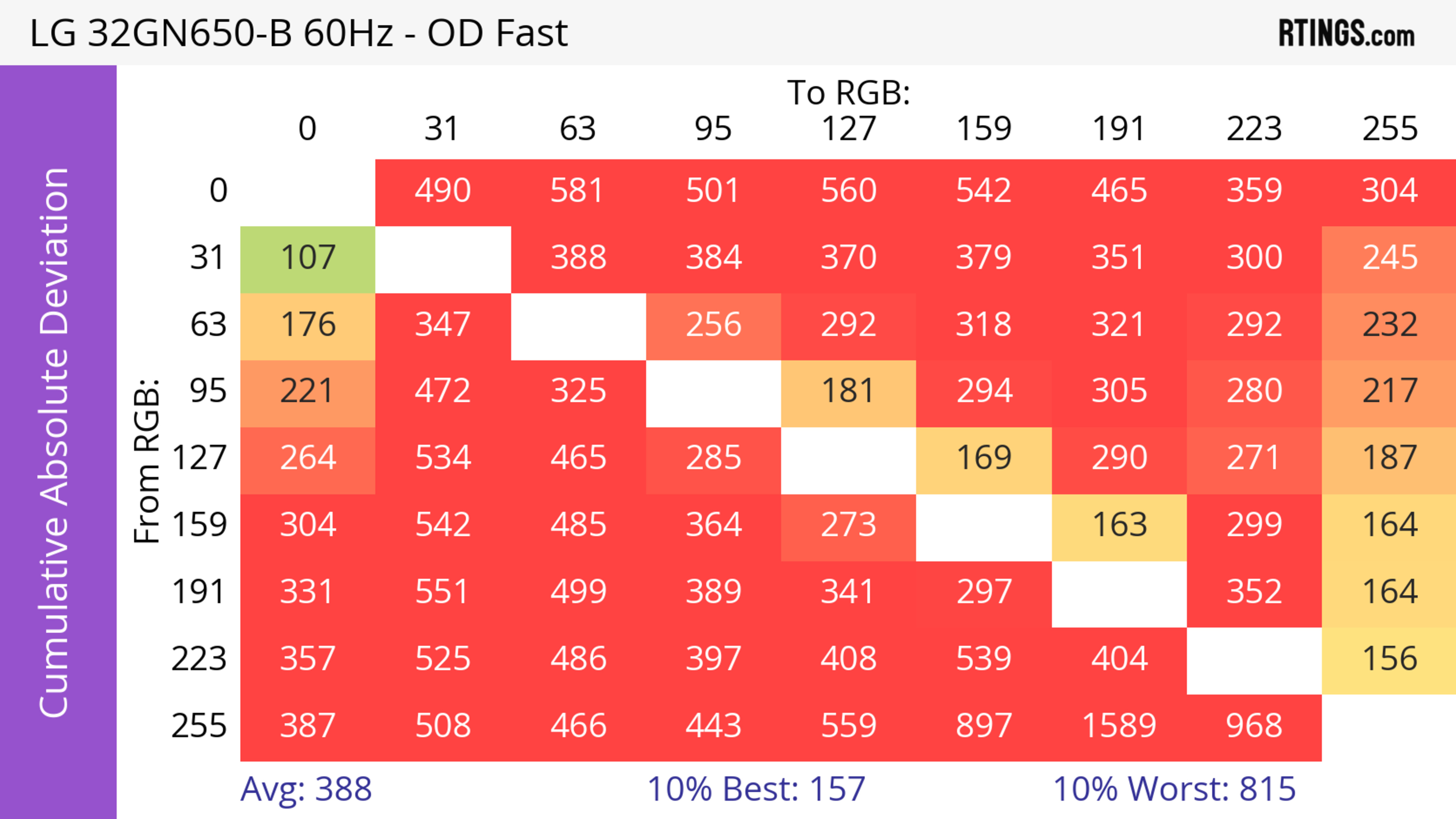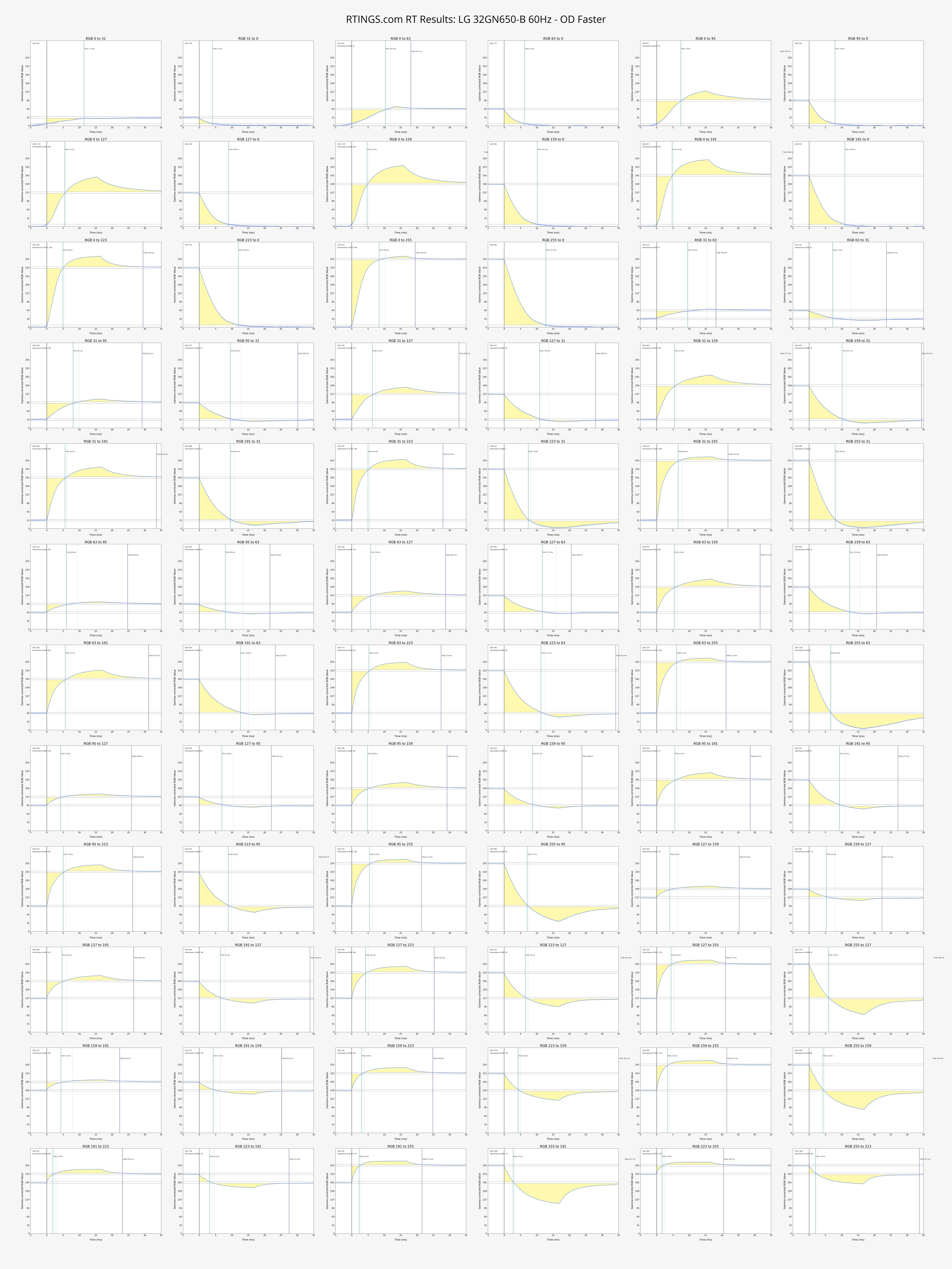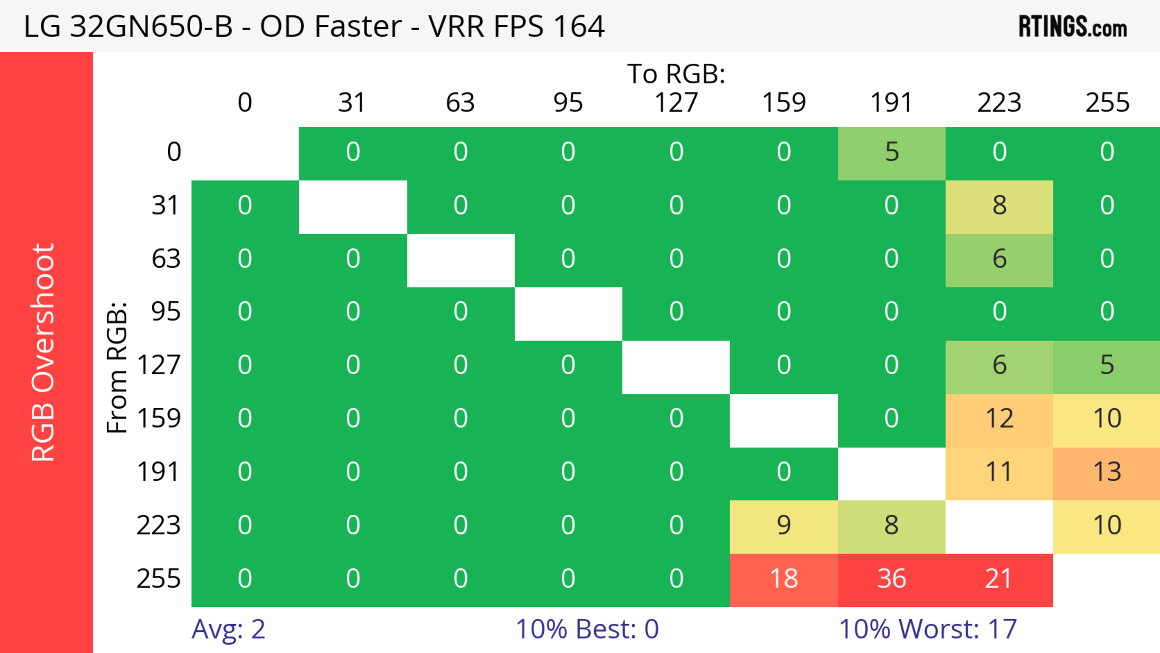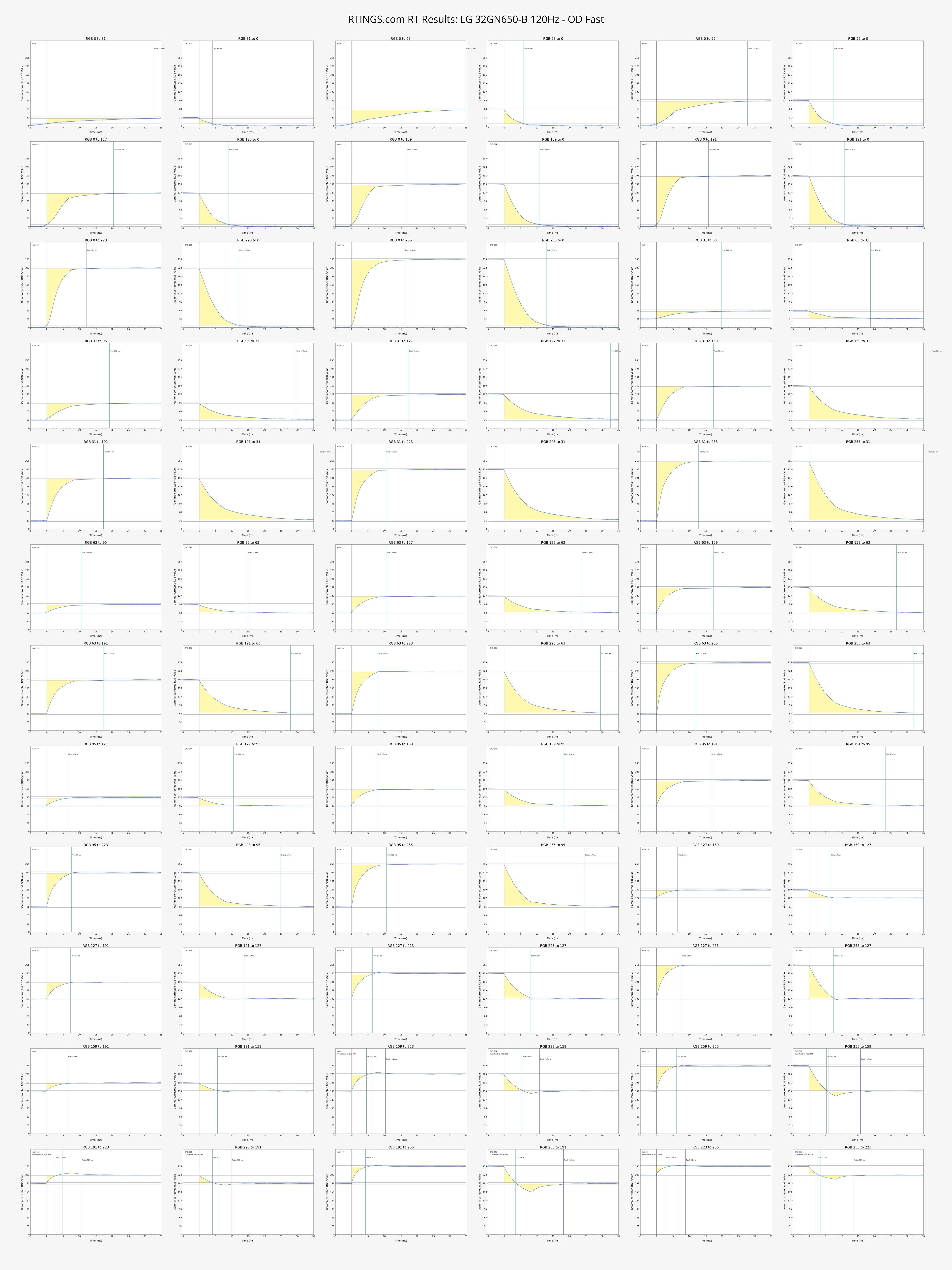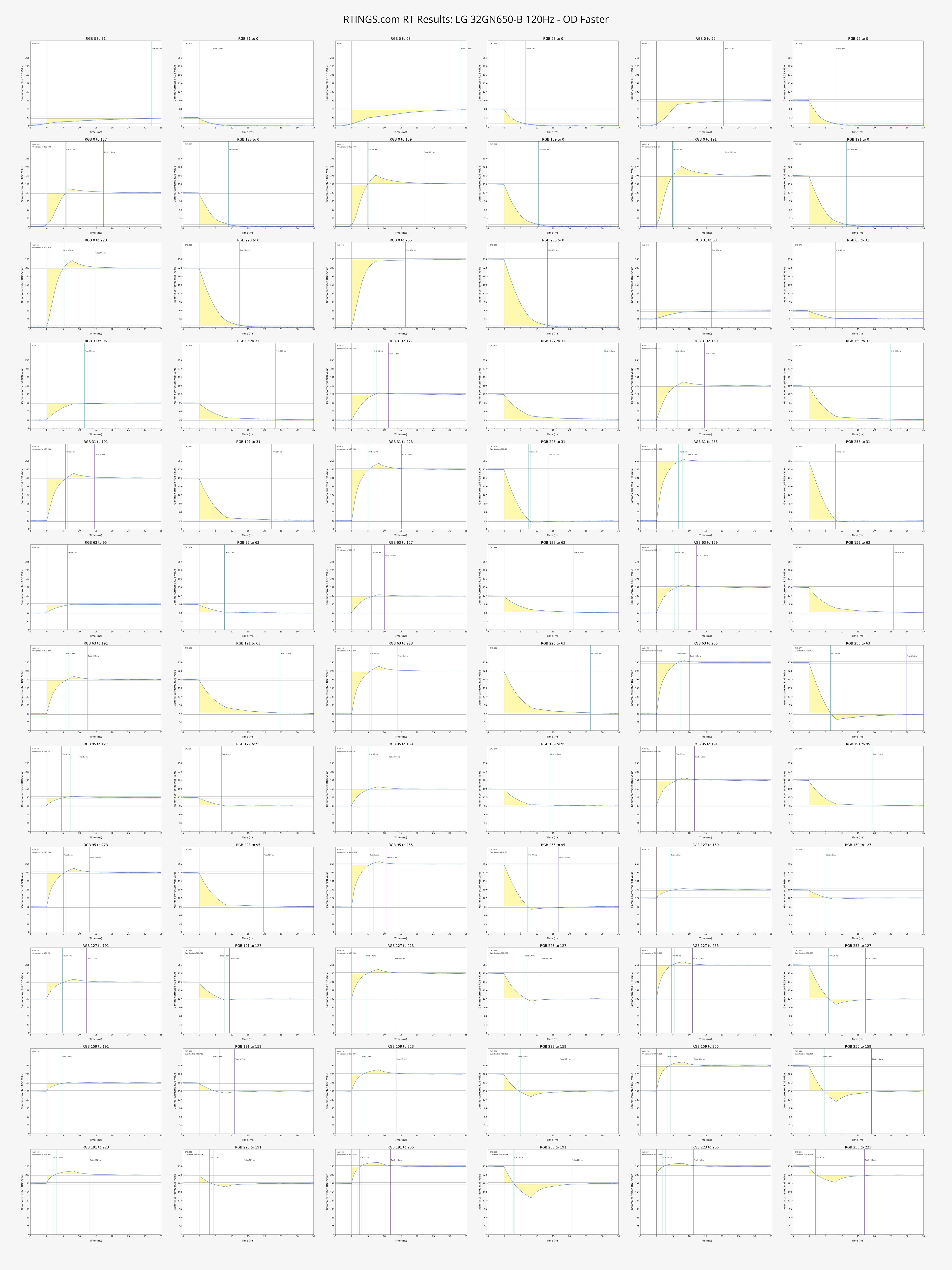 The motion handling is disappointing across the VRR range. There's noticeable smearing and blur, and there's more inverse ghosting at lower refresh rates. Although the 'Faster' overdrive setting is the best at high refresh rates, the 'Fast' setting is more consistent across the VRR range. The other settings have such high CAD that it passes the limits of the chart, and you can see an alternative chart here.