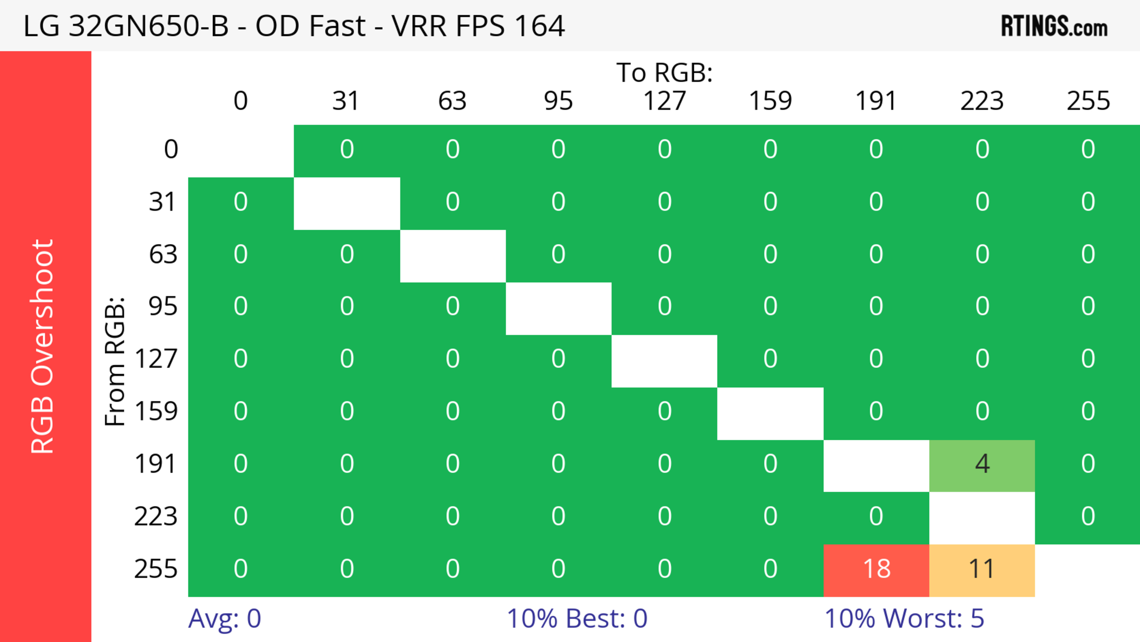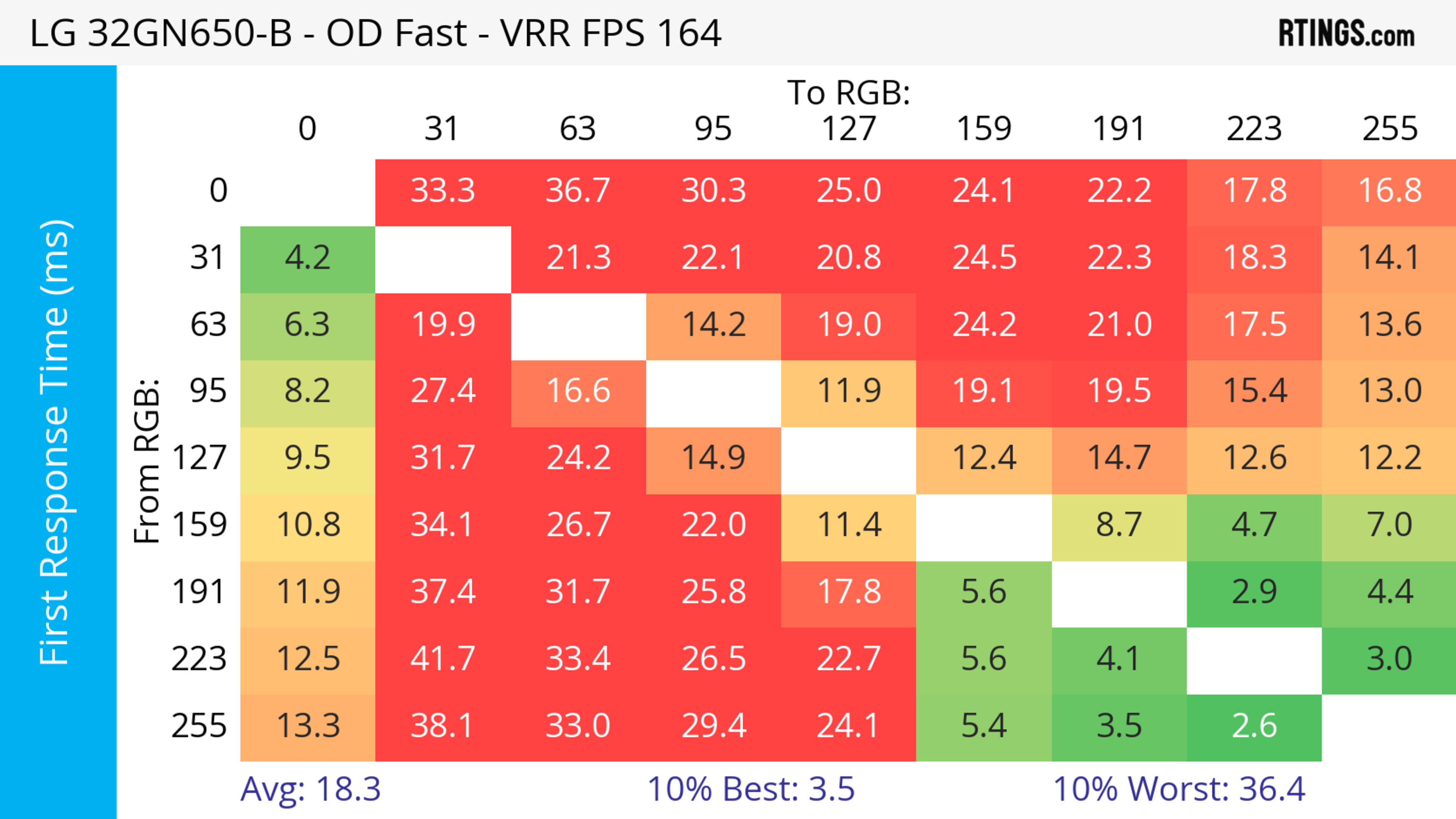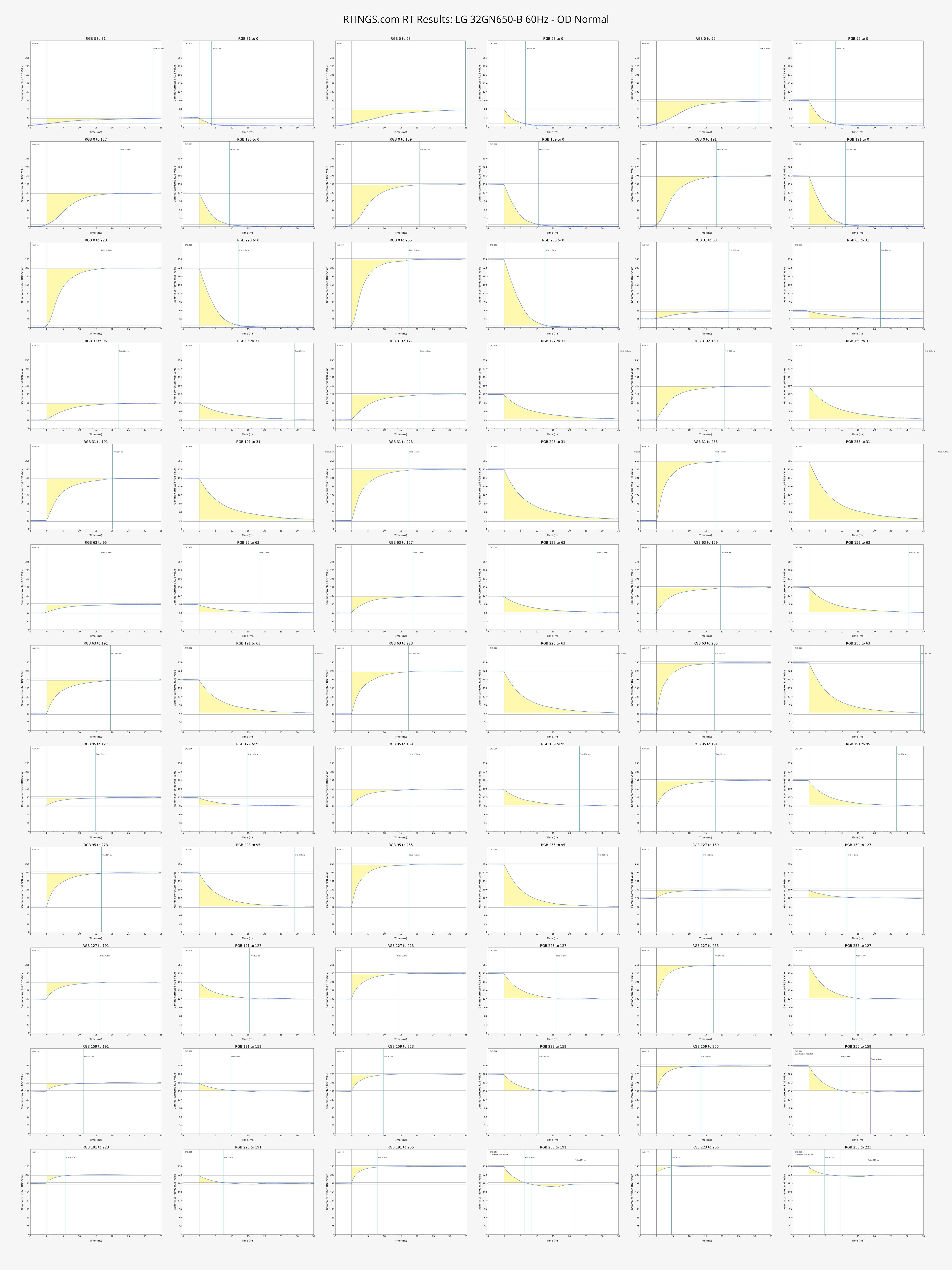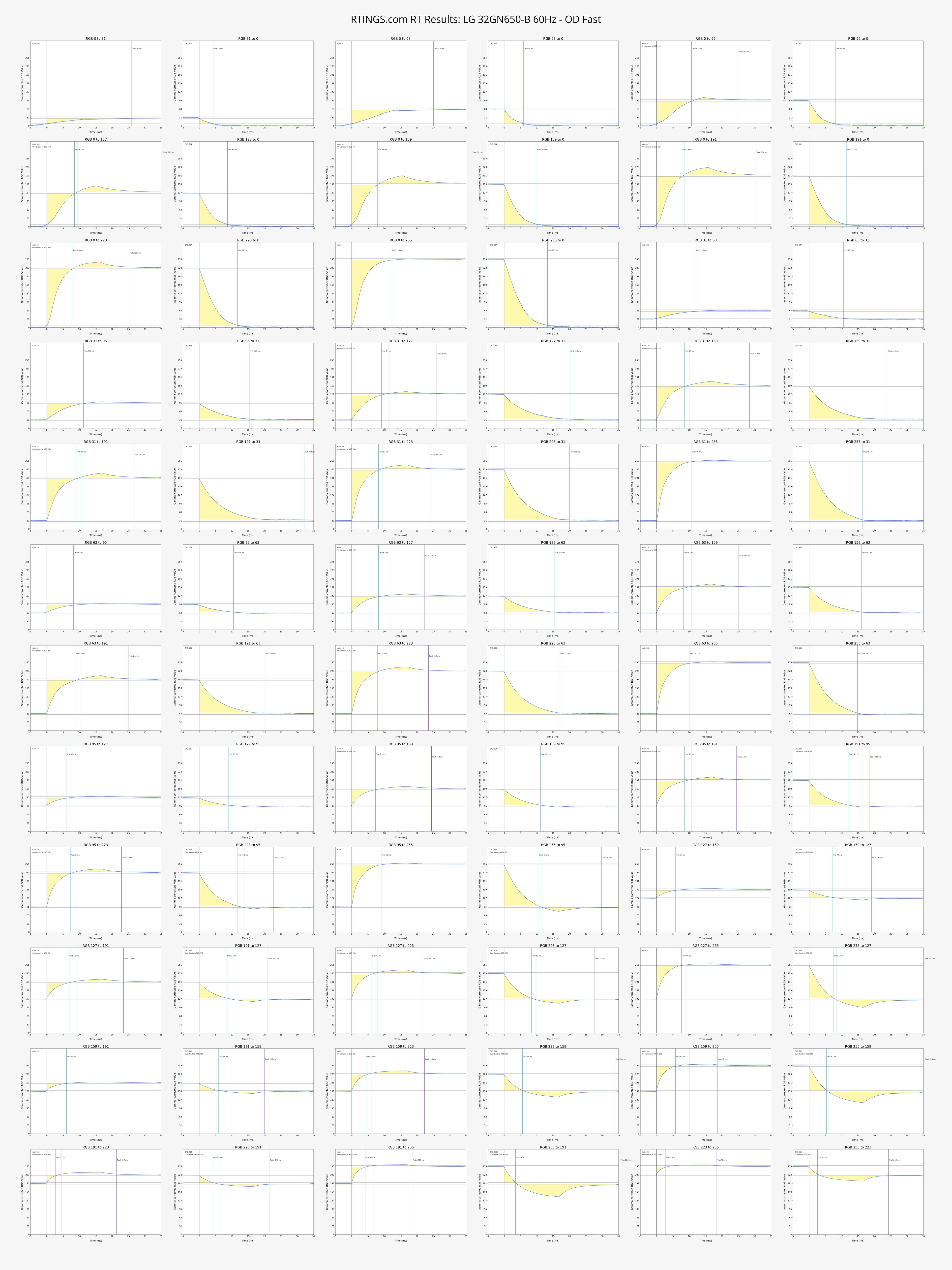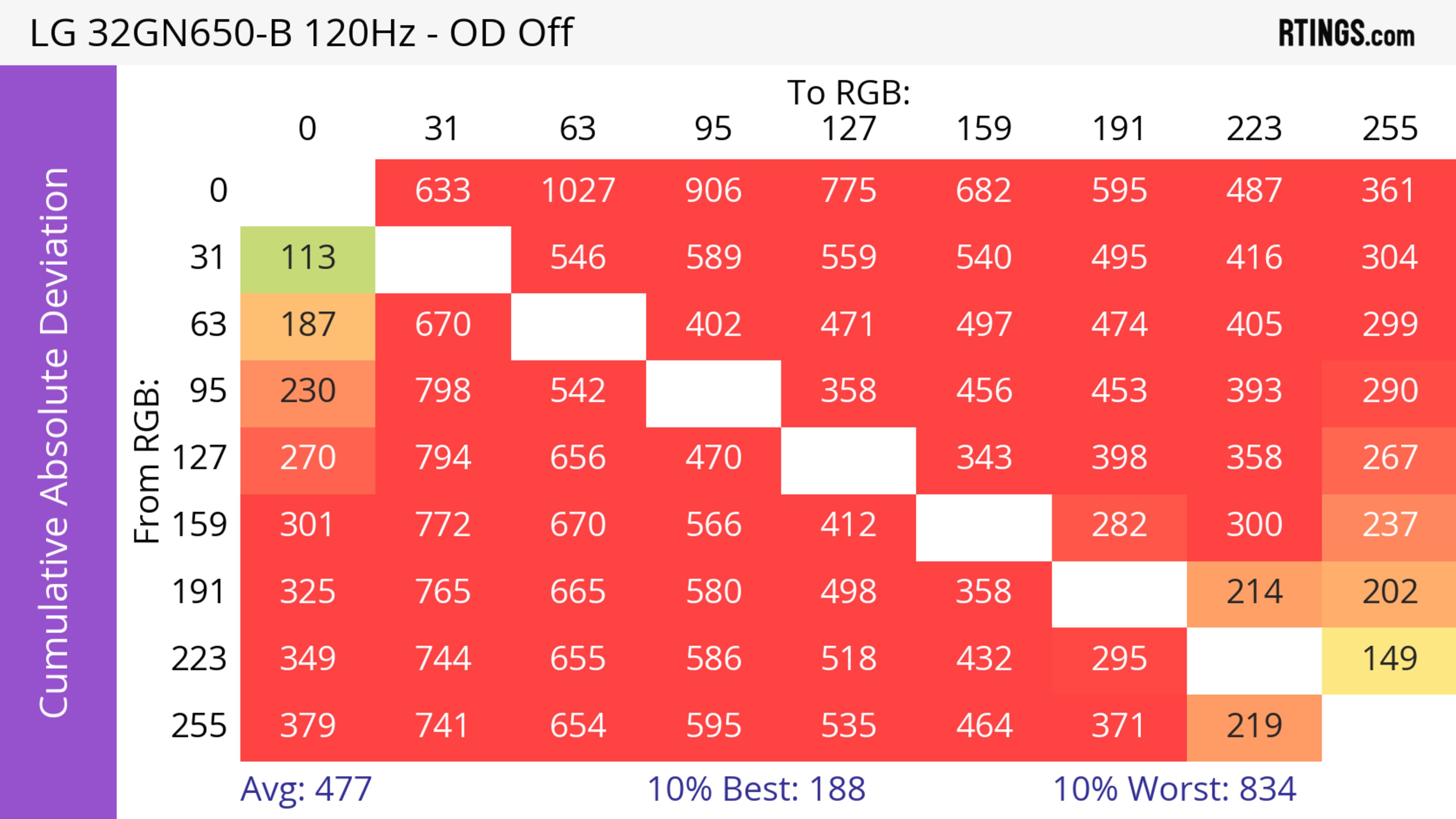 The motion handling is disappointing across the VRR range. There's noticeable smearing and blur, and there's more inverse ghosting at lower refresh rates. Although the 'Faster' overdrive setting is the best at high refresh rates, the 'Fast' setting is more consistent across the VRR range. The other settings have such high CAD that it passes the limits of the chart, and you can see an alternative chart here.