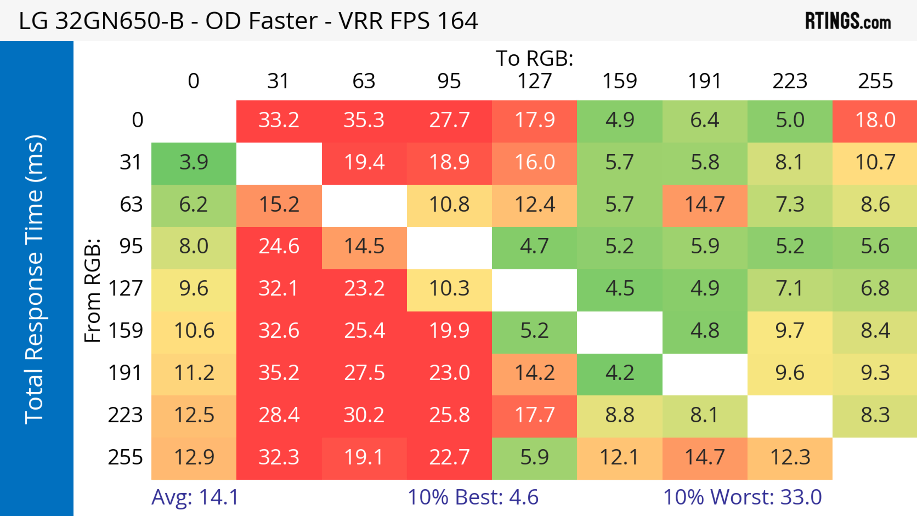 The LG 32GN63T has a disappointing response time. Motion looks blurry, and there's noticeable inverse ghosting as the refresh rate drops.