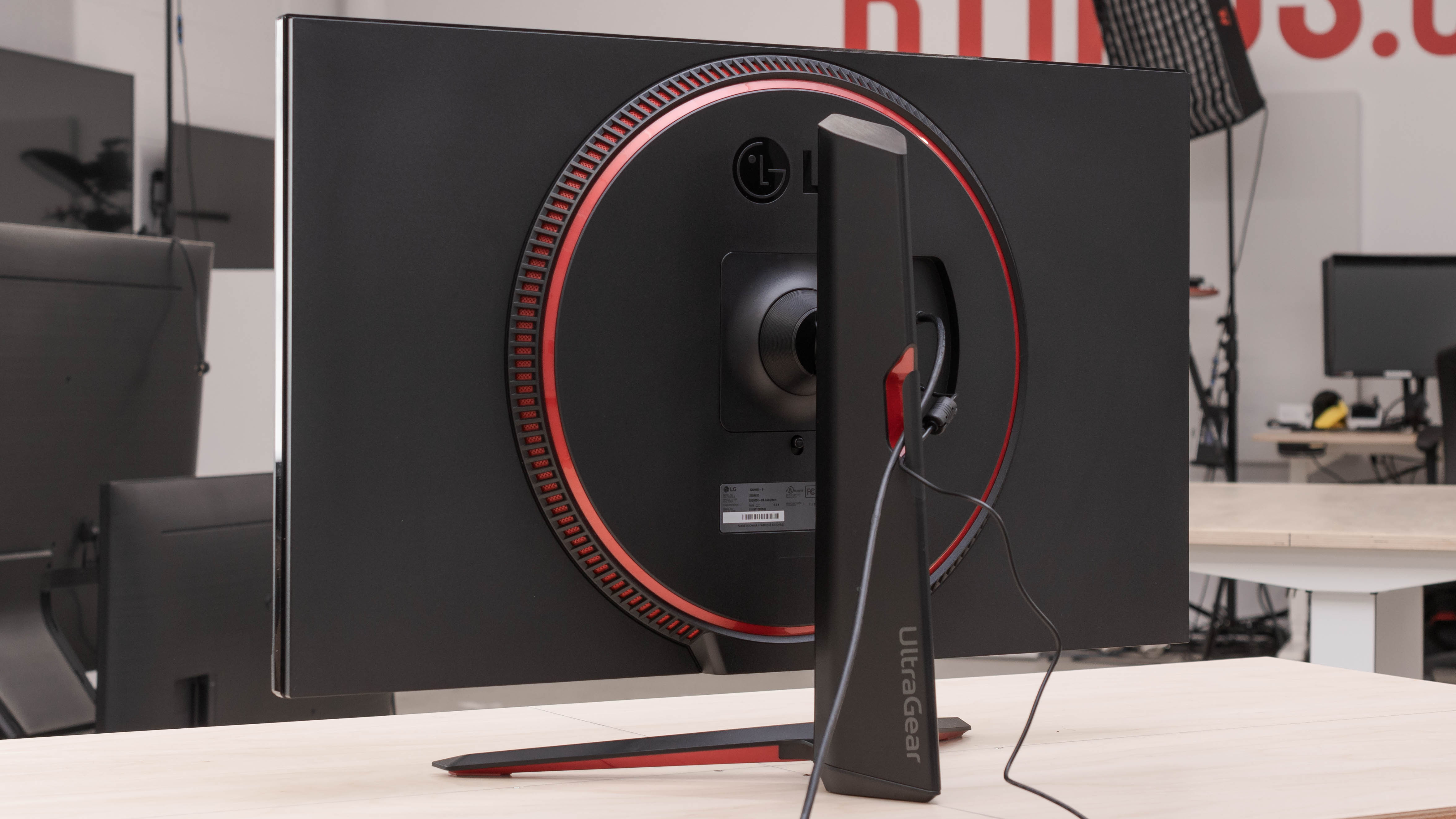 The ergonomics are decent. It's fine if you want to adjust the screen for yourself, but without swivel adjustment, it's hard to turn the screen to show someone else. The back of the monitor is simple, with a red circle similar to other UltraGear monitors. The stand features a clip for cable management.