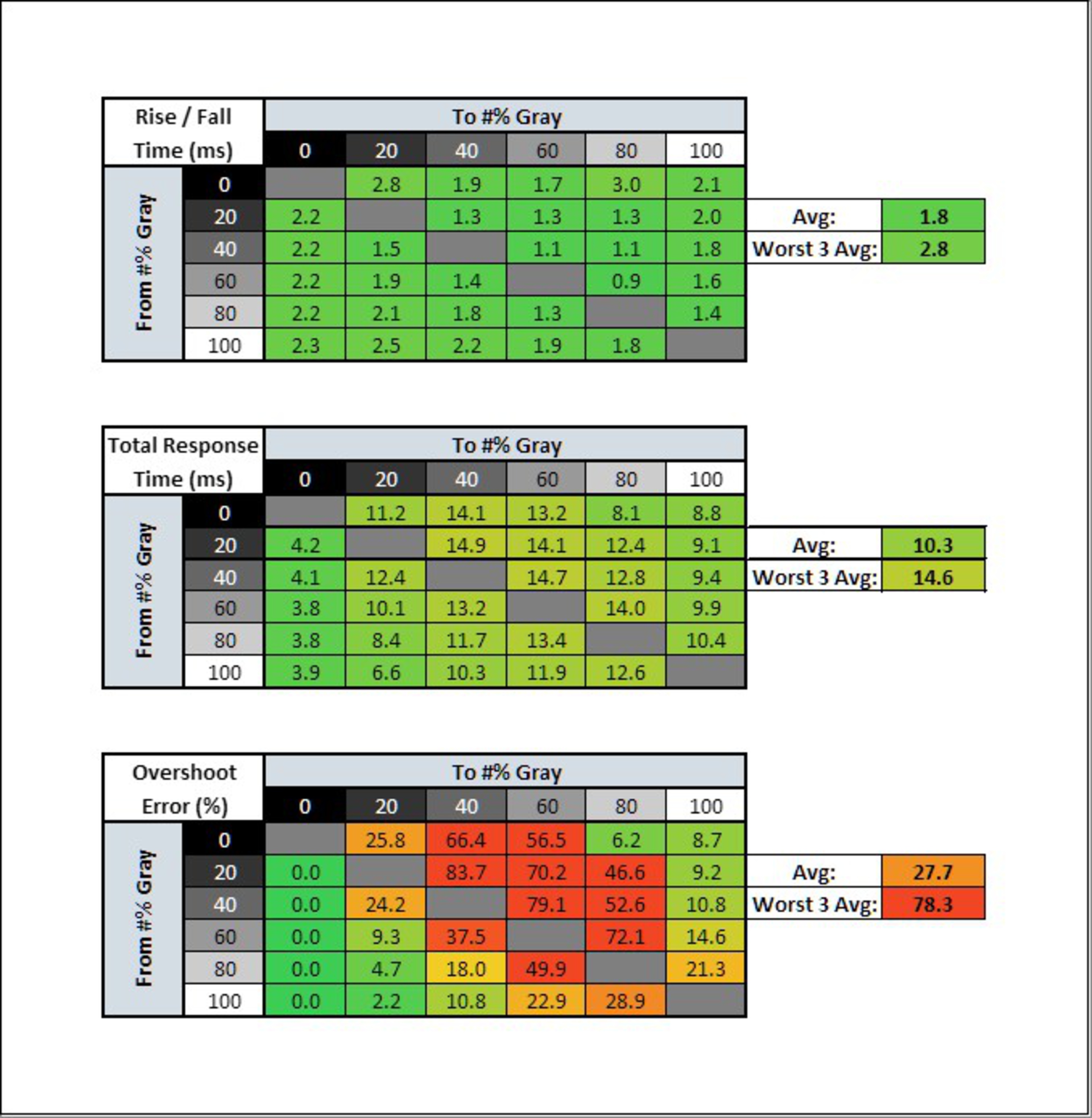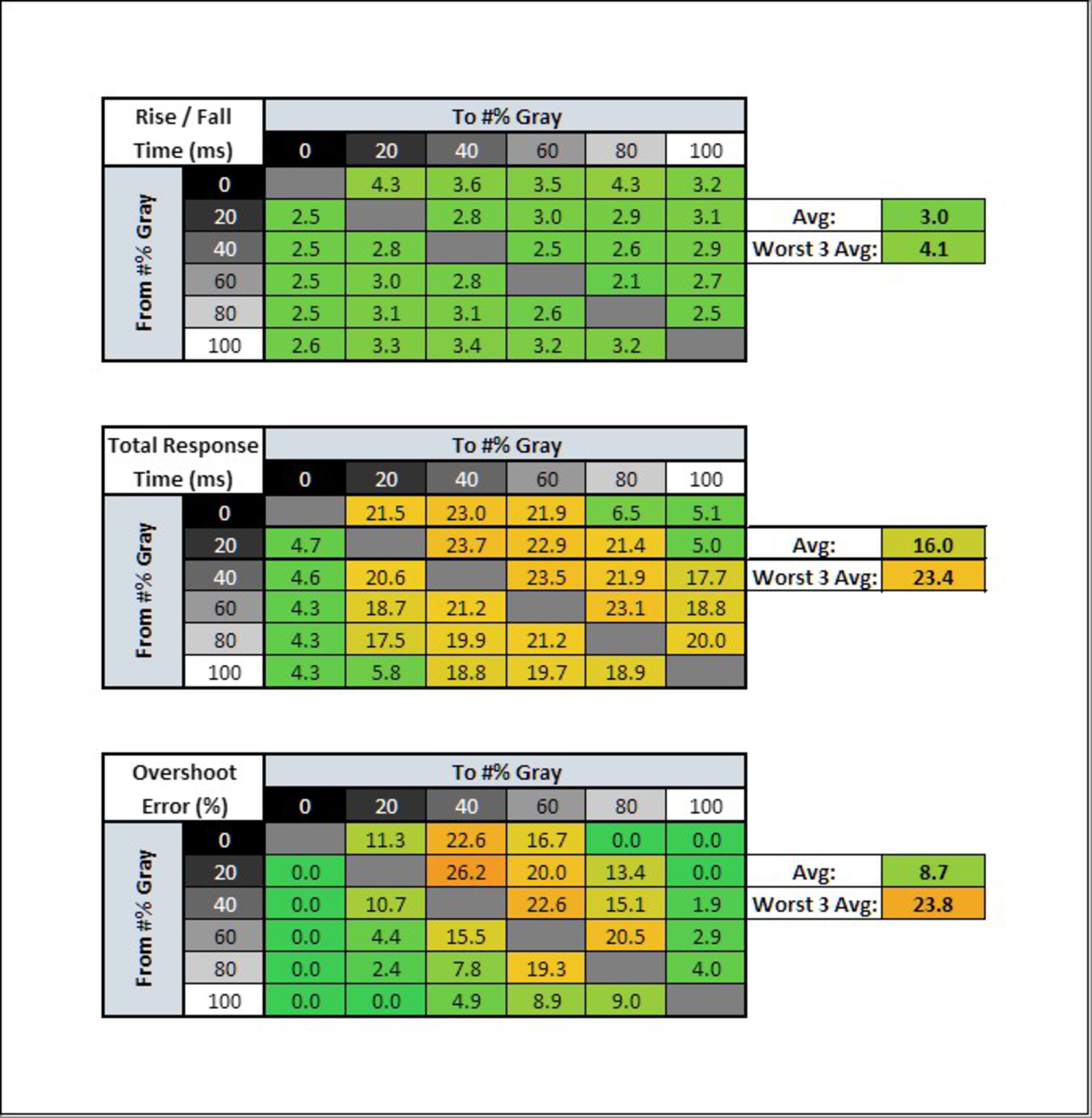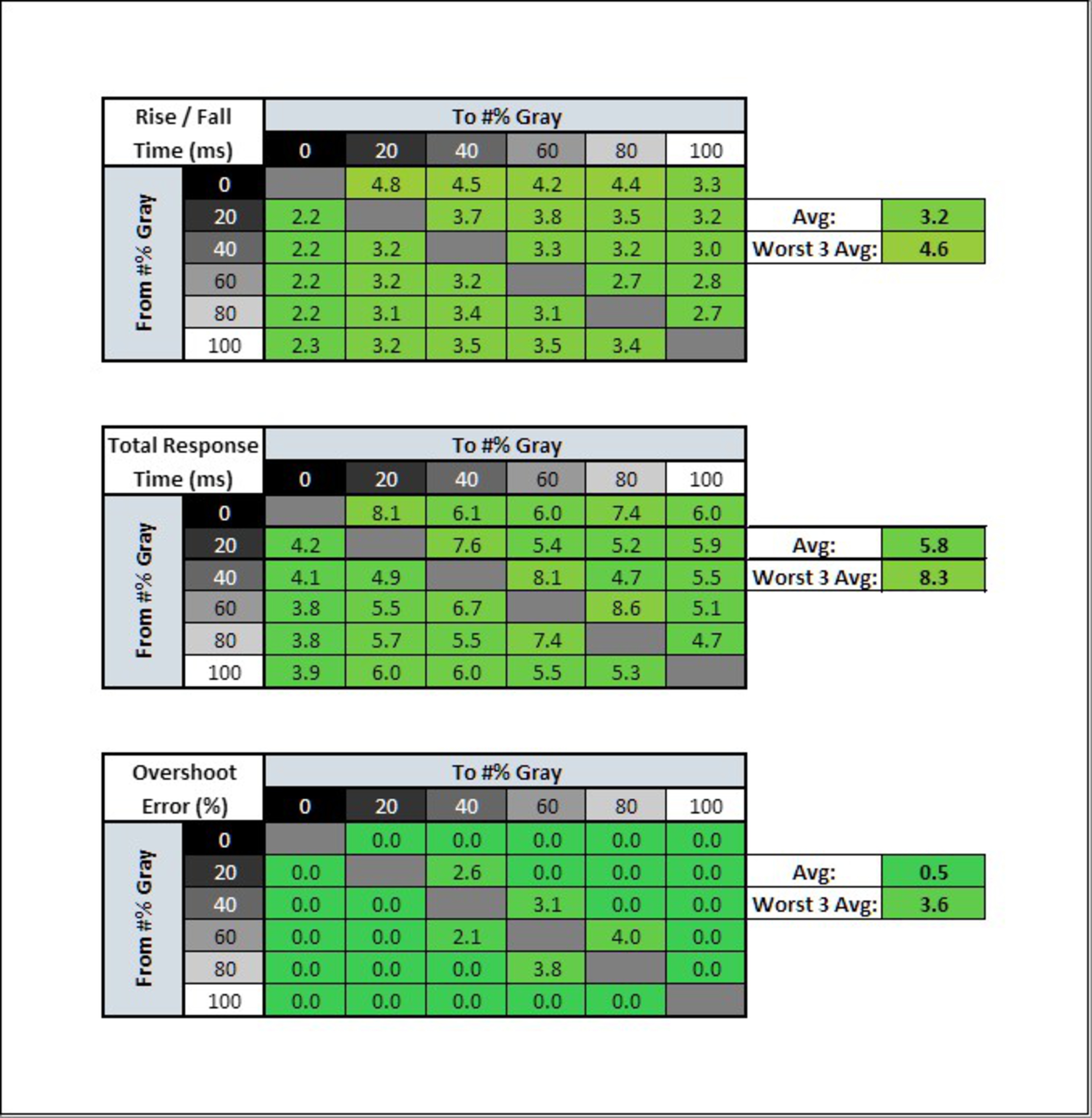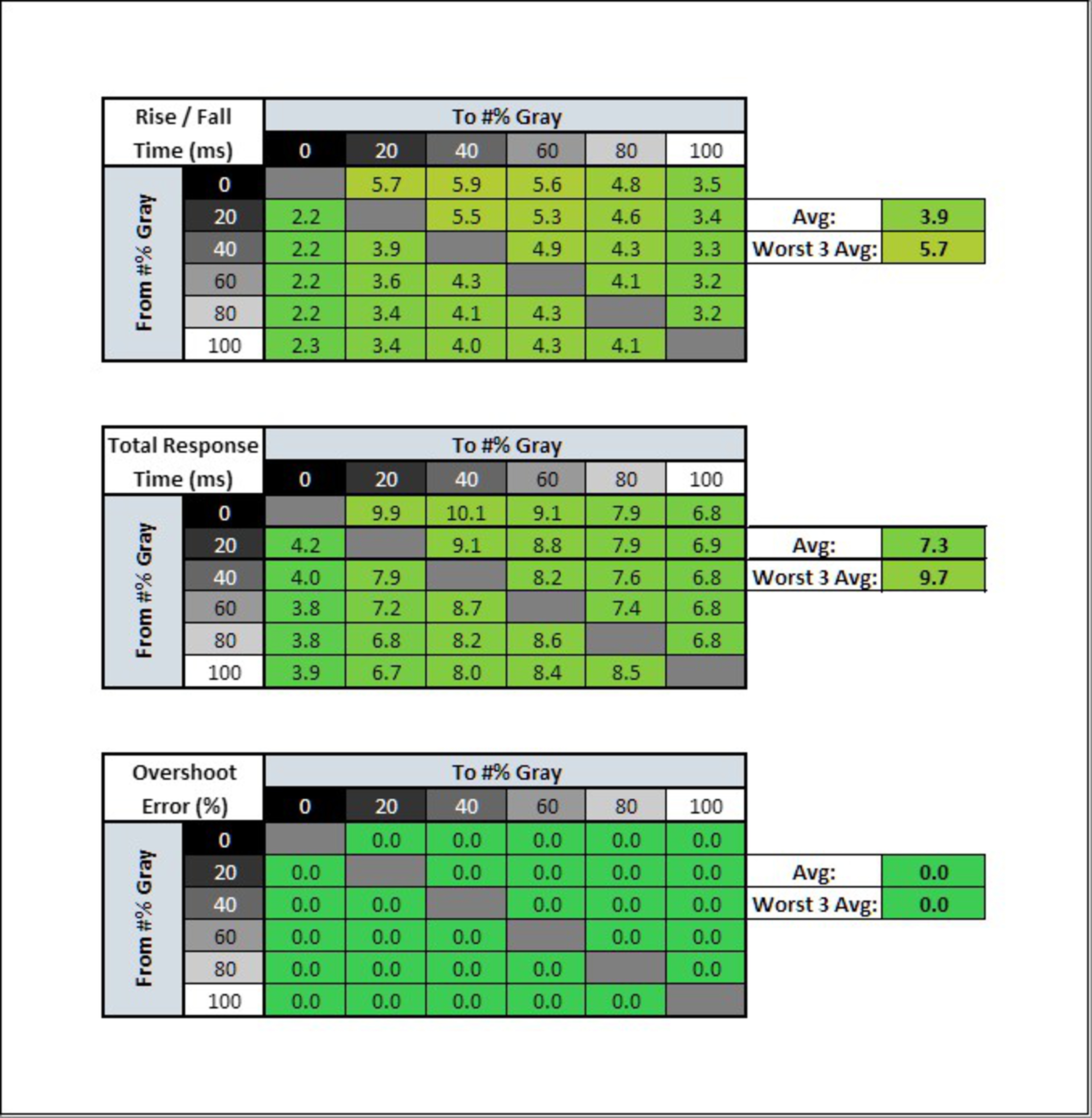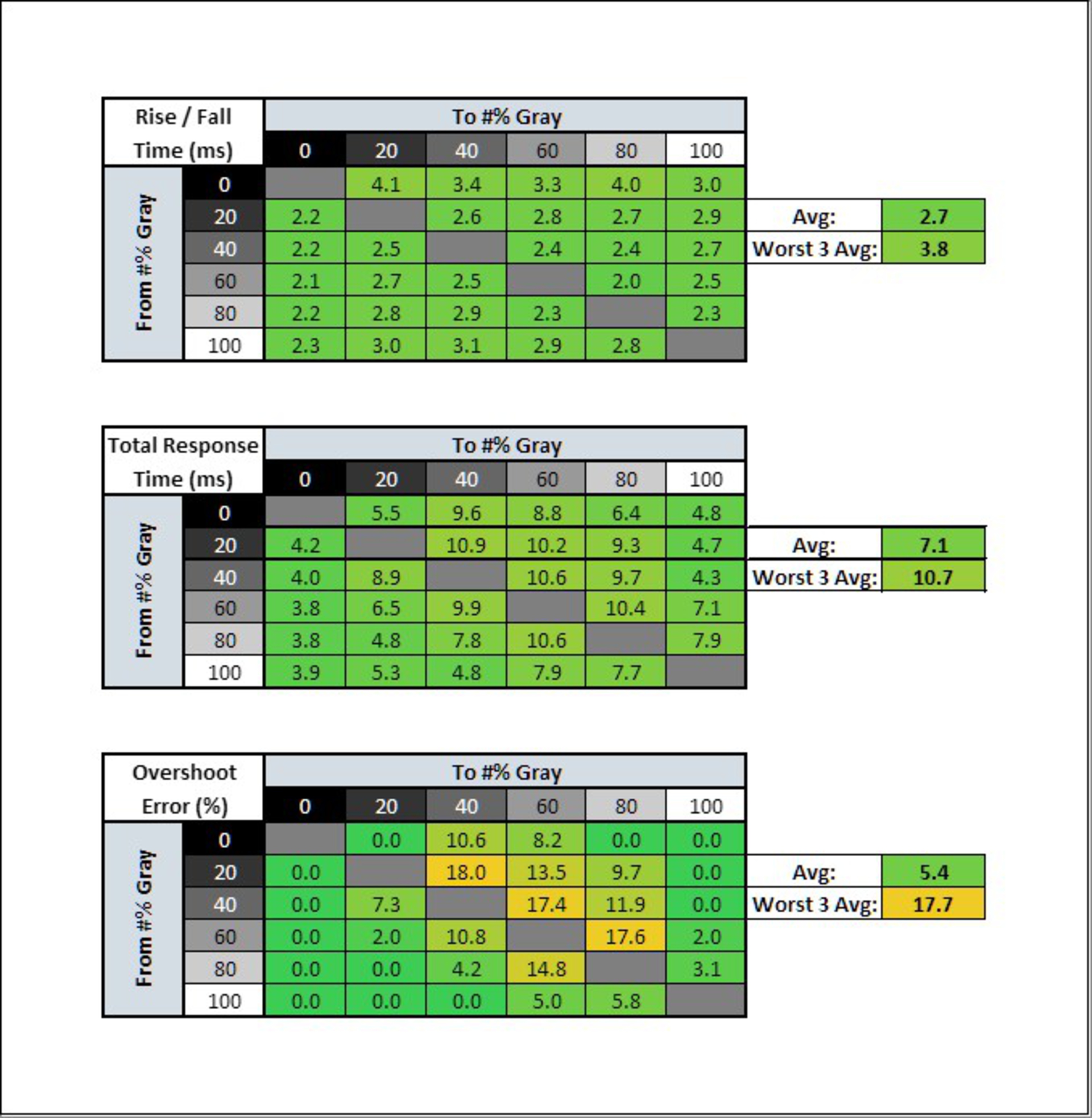 The refresh rate compliance is great. Although its response time isn't fast enough to make full color transitions before the monitor draws the next frame at the max refresh rate, it's better at lower refresh rates.