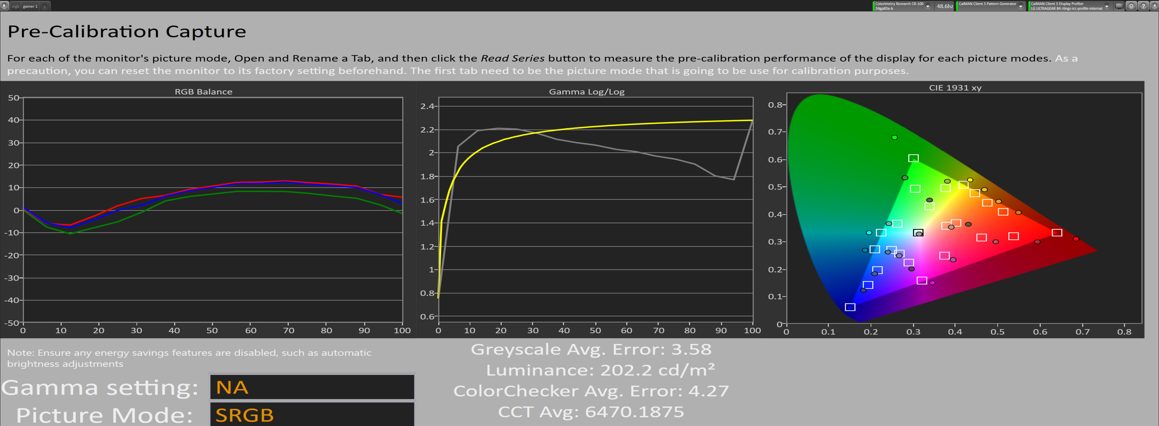 The accuracy before calibration is excellent. It clamps colors to the sRGB color space well, and though it slightly oversaturates most colors it has great color accuracy. Additionally, the color temperature is very close to the 6500K target, and the white balance is very good. However, the gamma is slightly off, as most parts of scenes are a bit too bright.