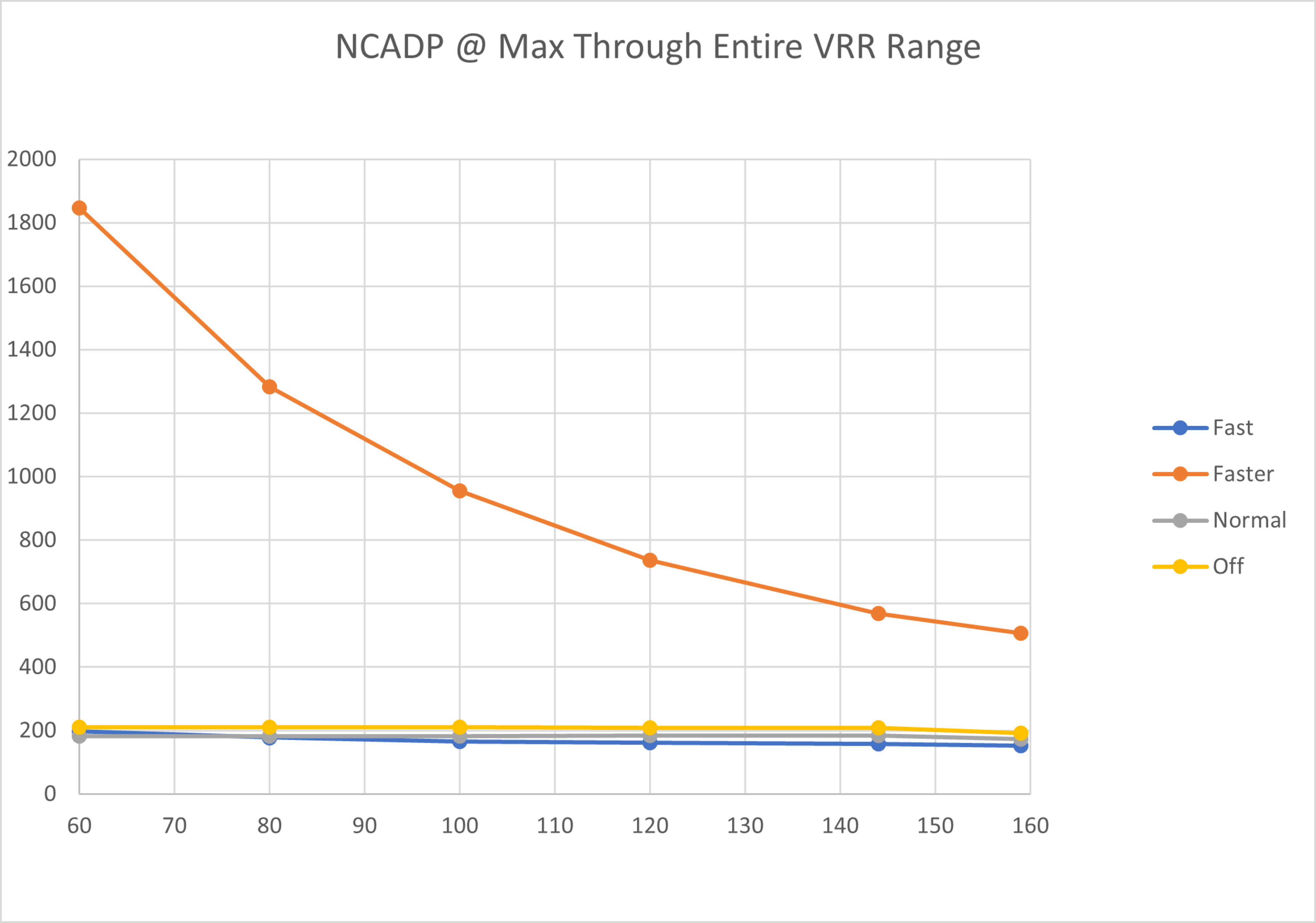 The CAD at the max refresh rate is good, but there's still some motion blur. The 'Normal' and 'Fast' overdrive settings have a similar total response time, but 'Fast' has less motion blur, while the 'Faster' setting has too much inverse ghosting.
