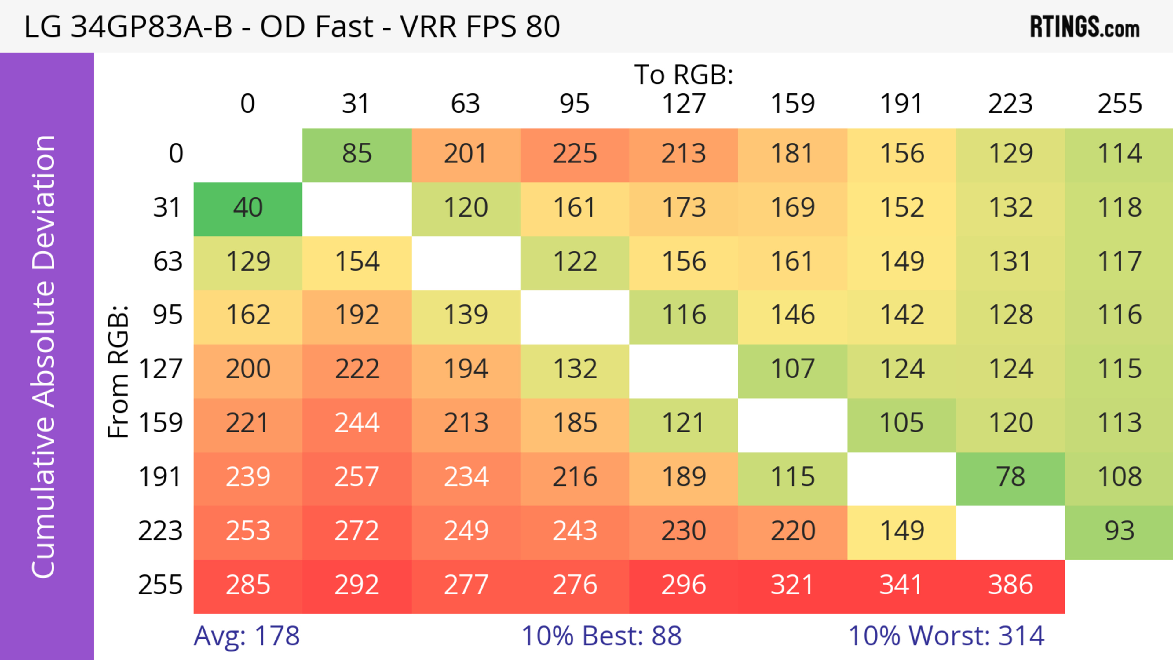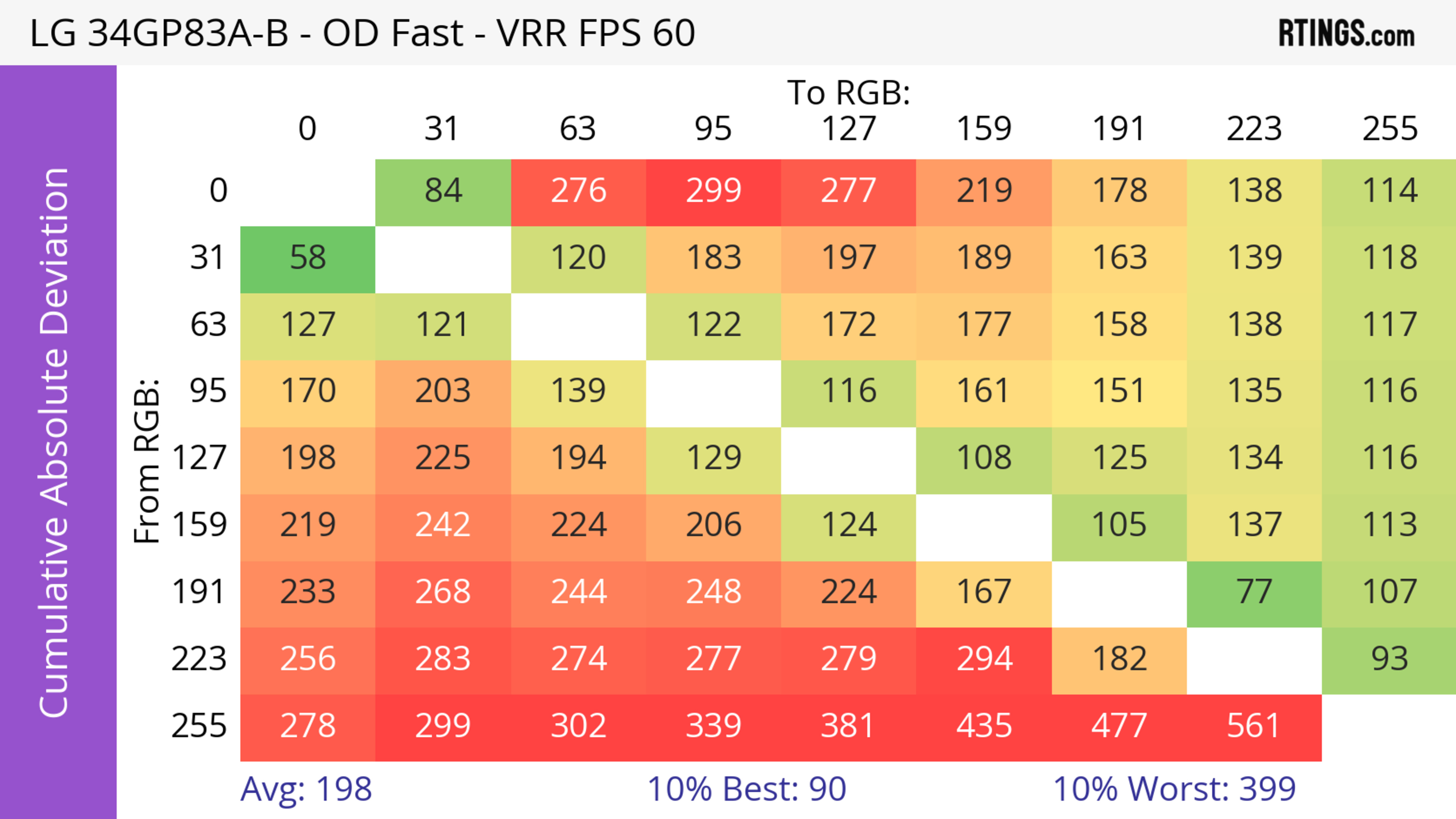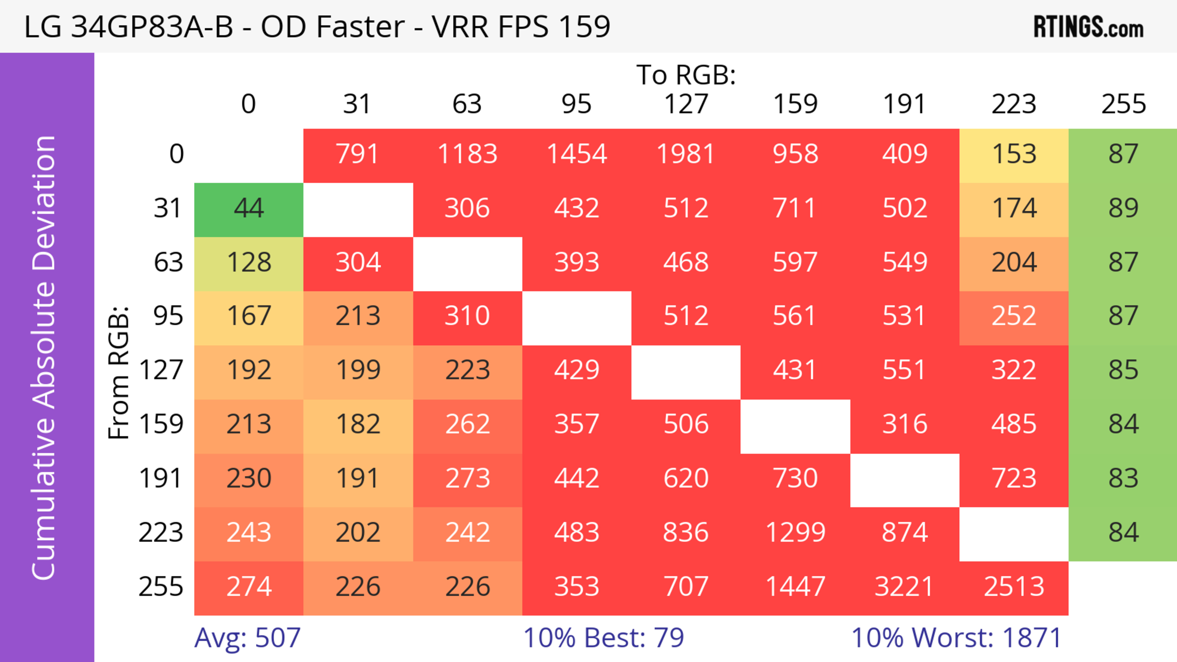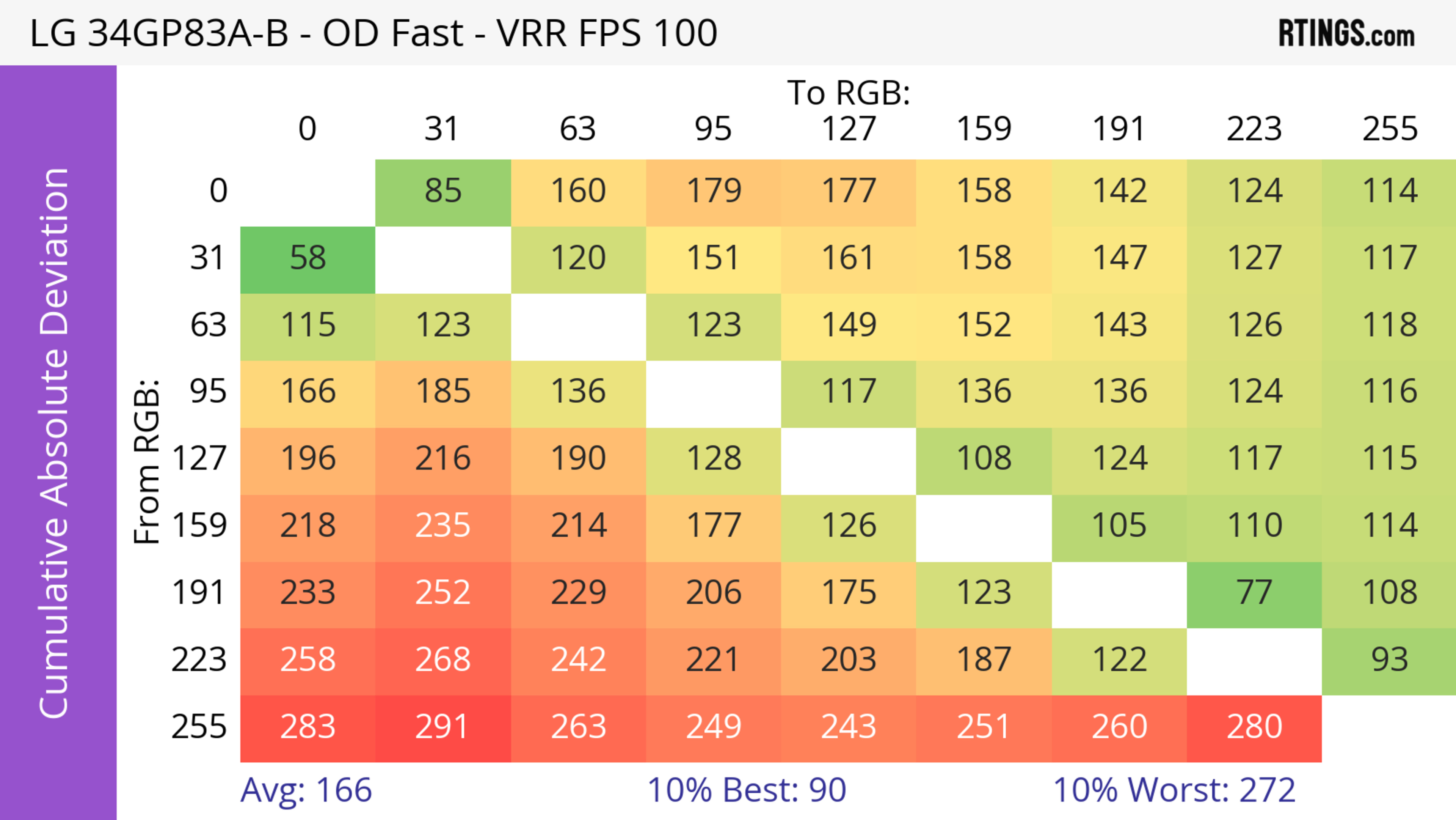 The LG UltraGear 34GP83A-B has good motion handling across its entire refresh rate range with VRR enabled in the recommended 'Fast' Response Time setting, though there's still some motion blur. The 'Fastest' overdrive setting has such a high CAD that it passes the limits of our chart, and you can see it in an alternative chart here.