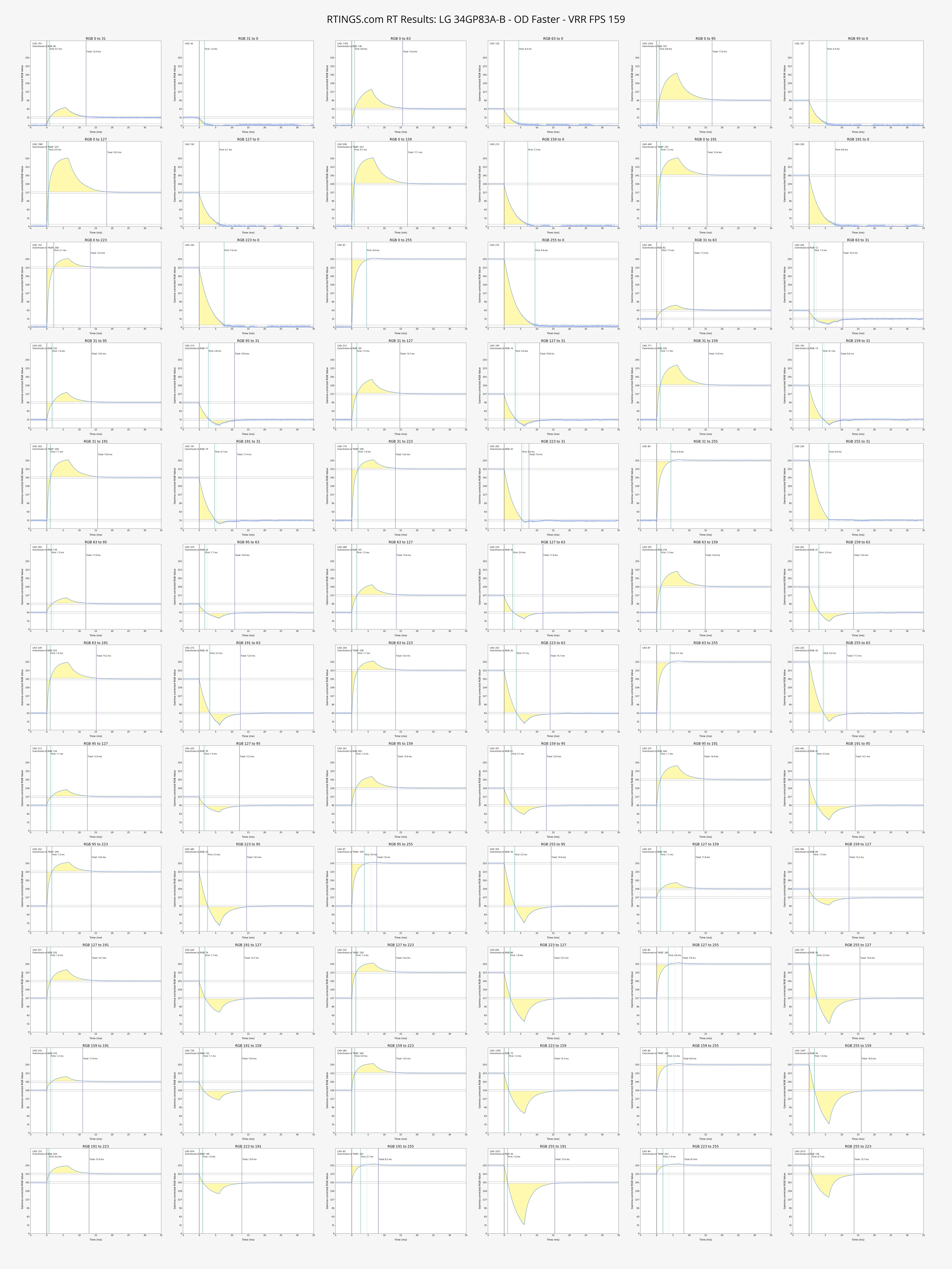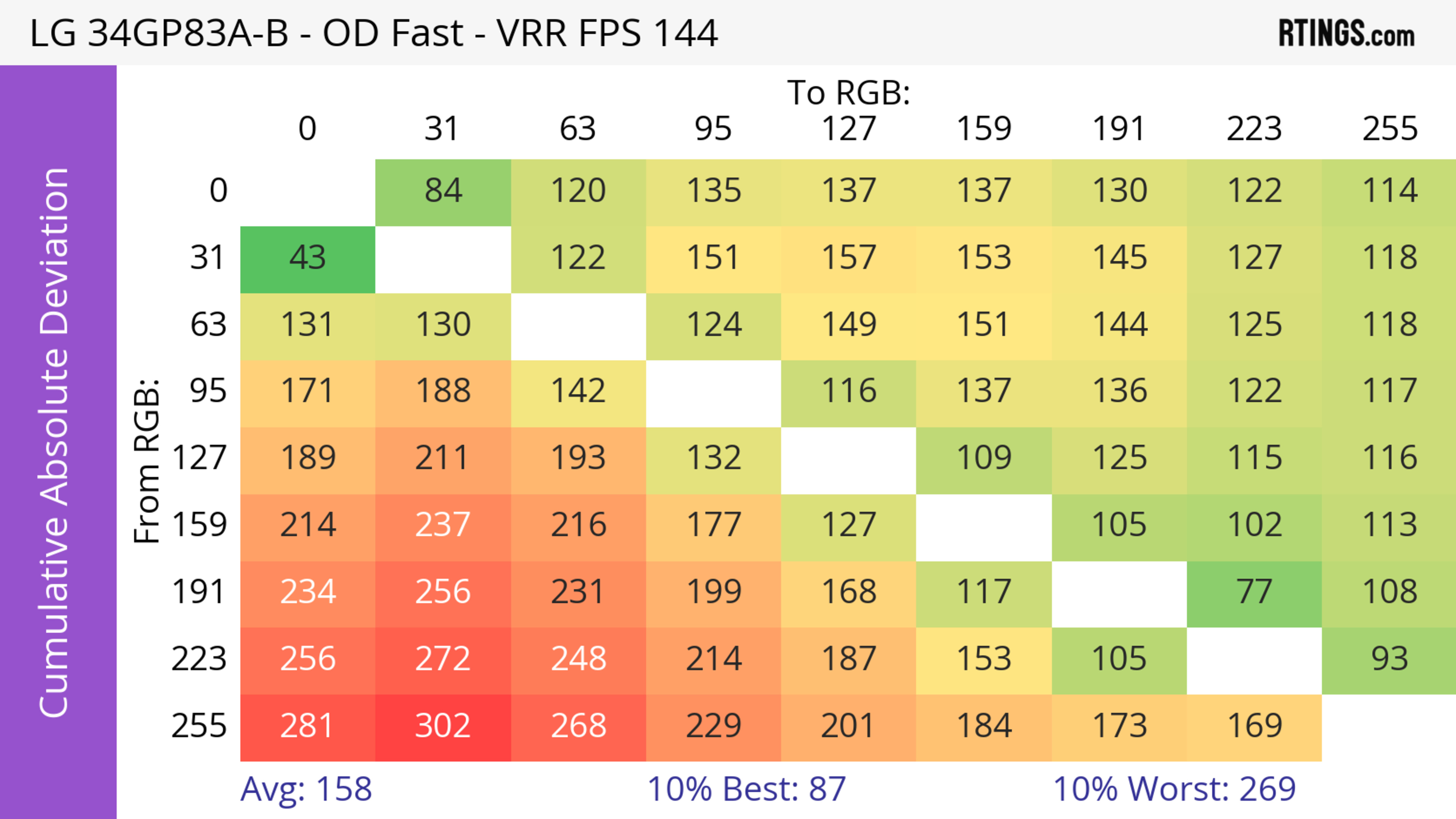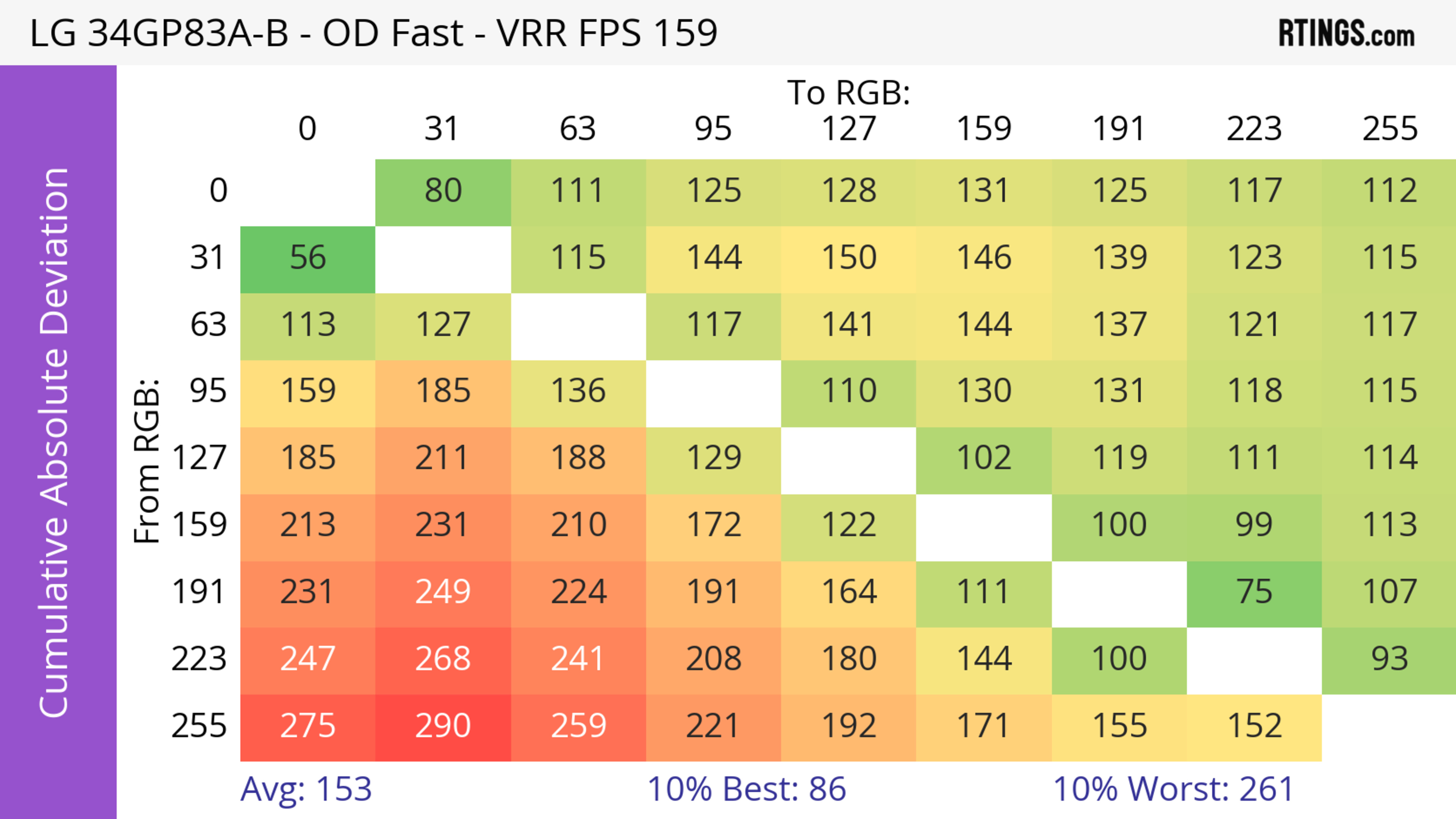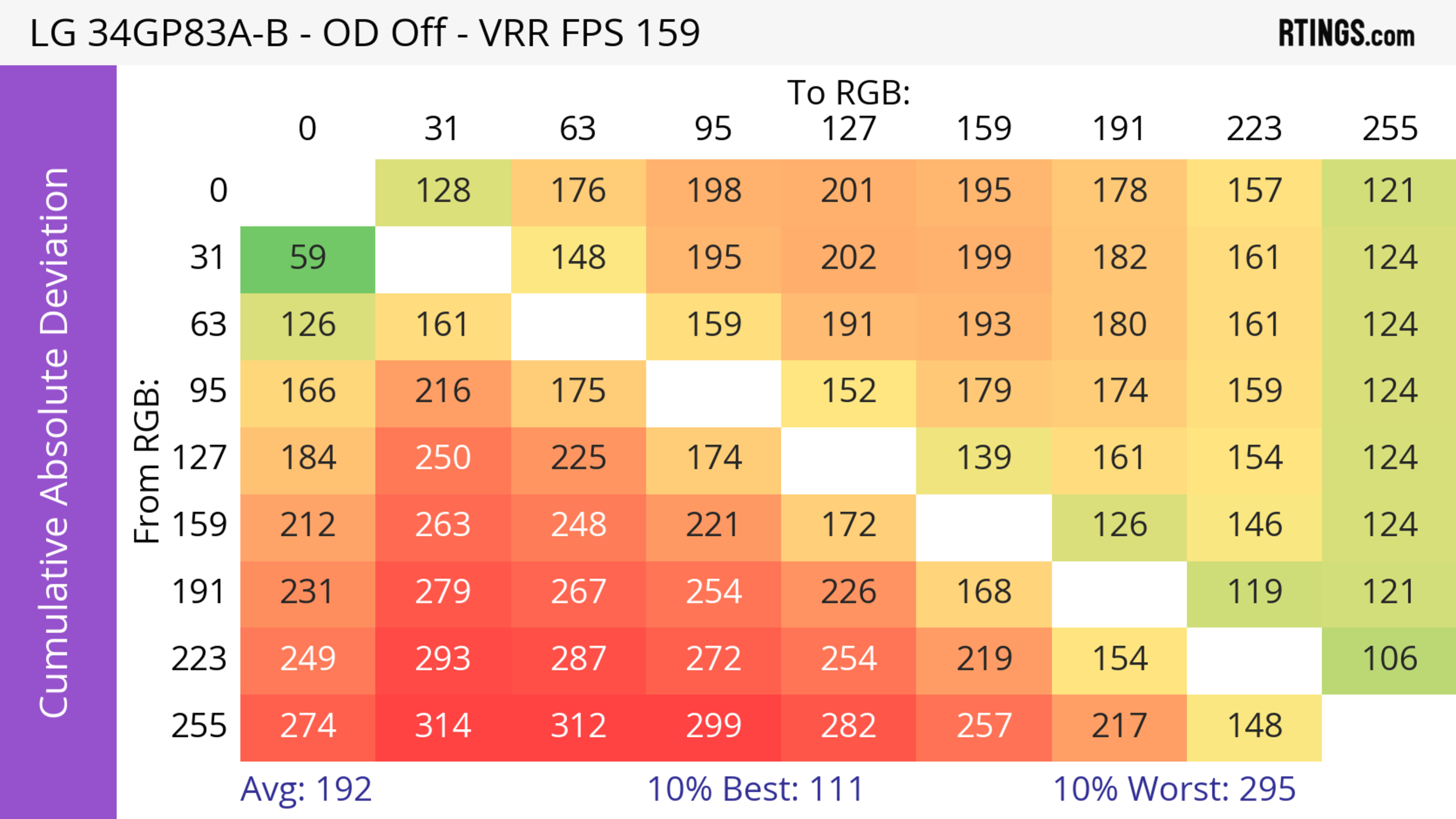 The LG UltraGear 34GP83A-B has good motion handling across its entire refresh rate range with VRR enabled in the recommended 'Fast' Response Time setting, though there's still some motion blur. The 'Fastest' overdrive setting has such a high CAD that it passes the limits of our chart, and you can see it in an alternative chart here.
