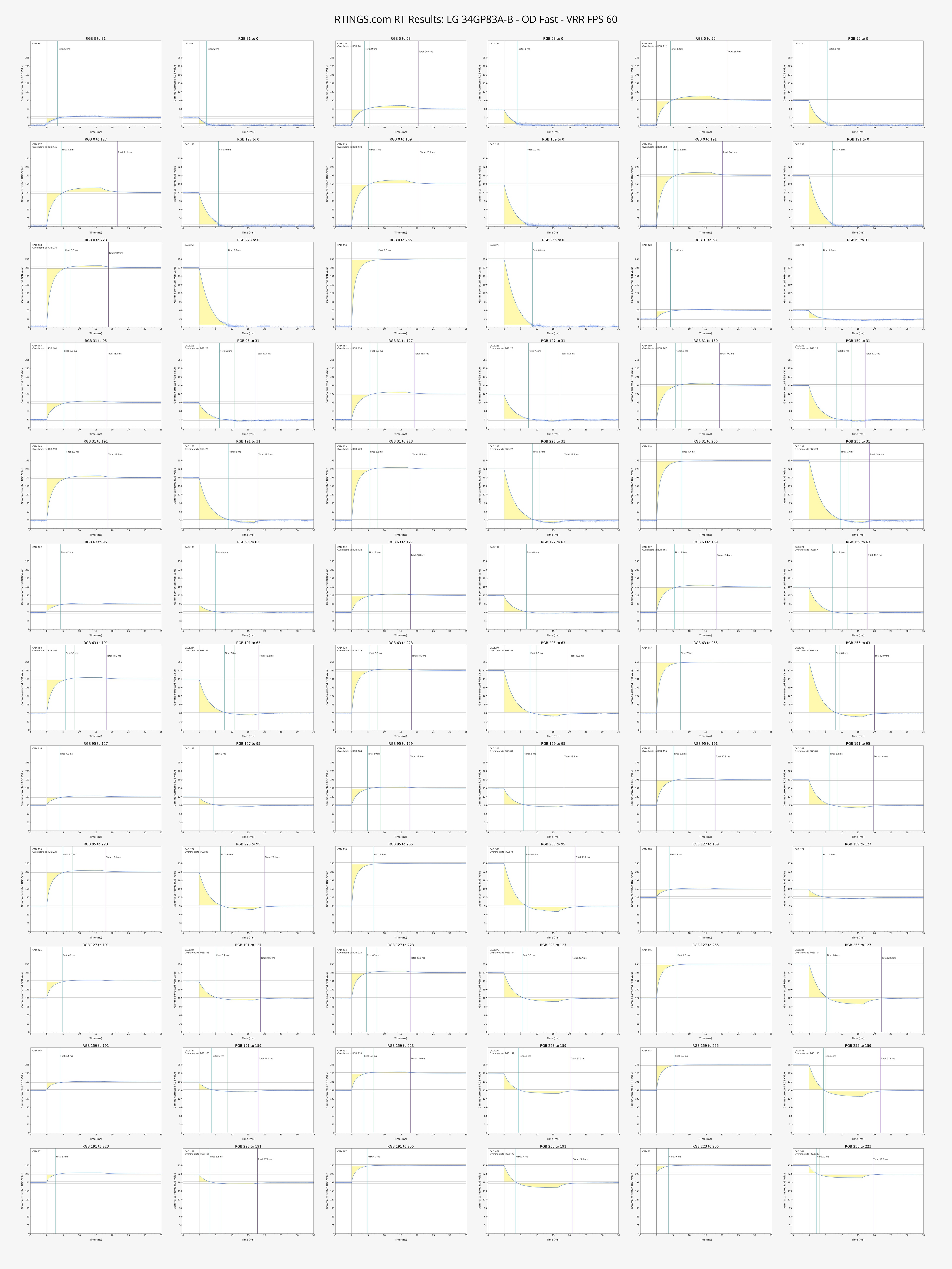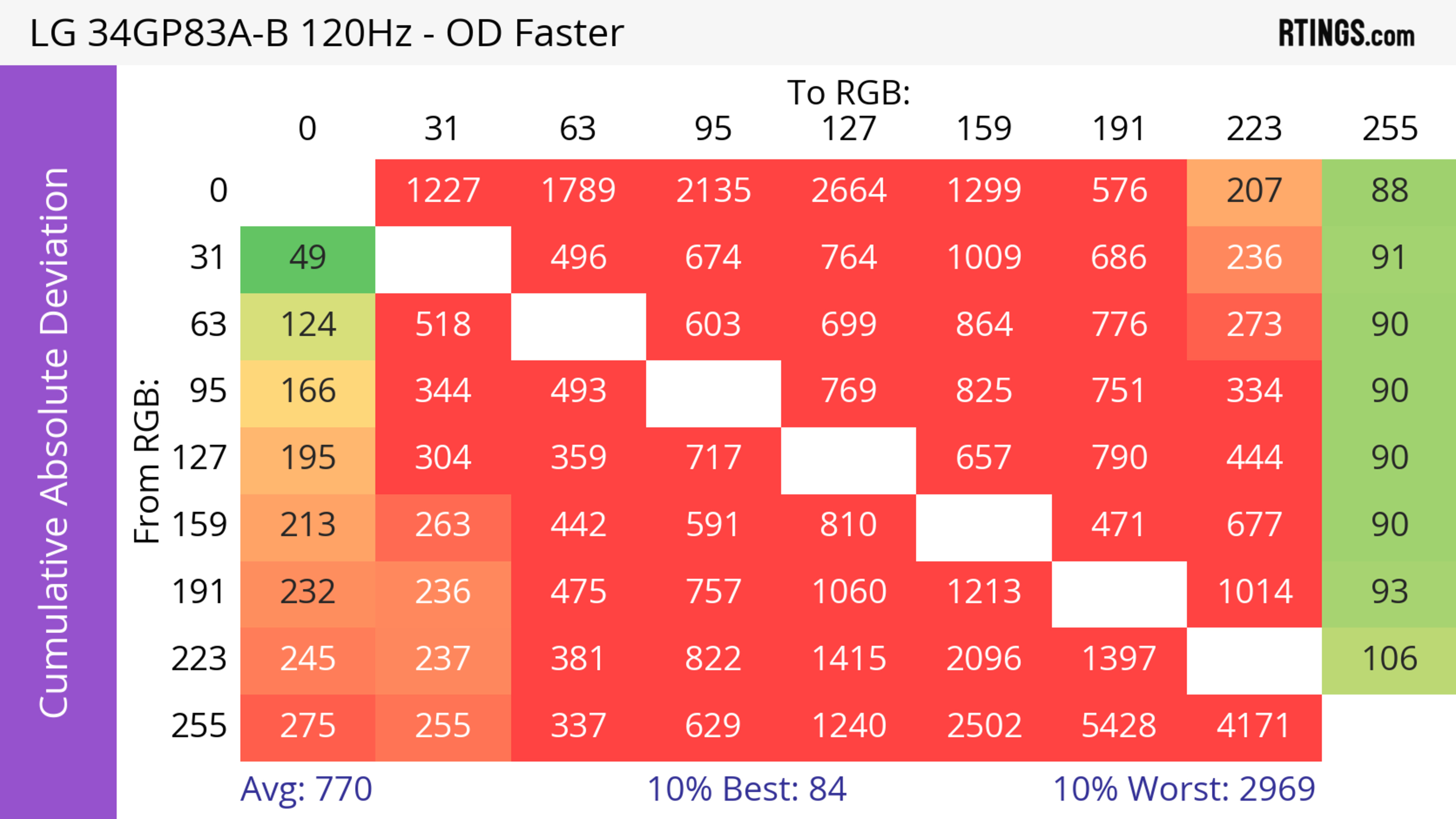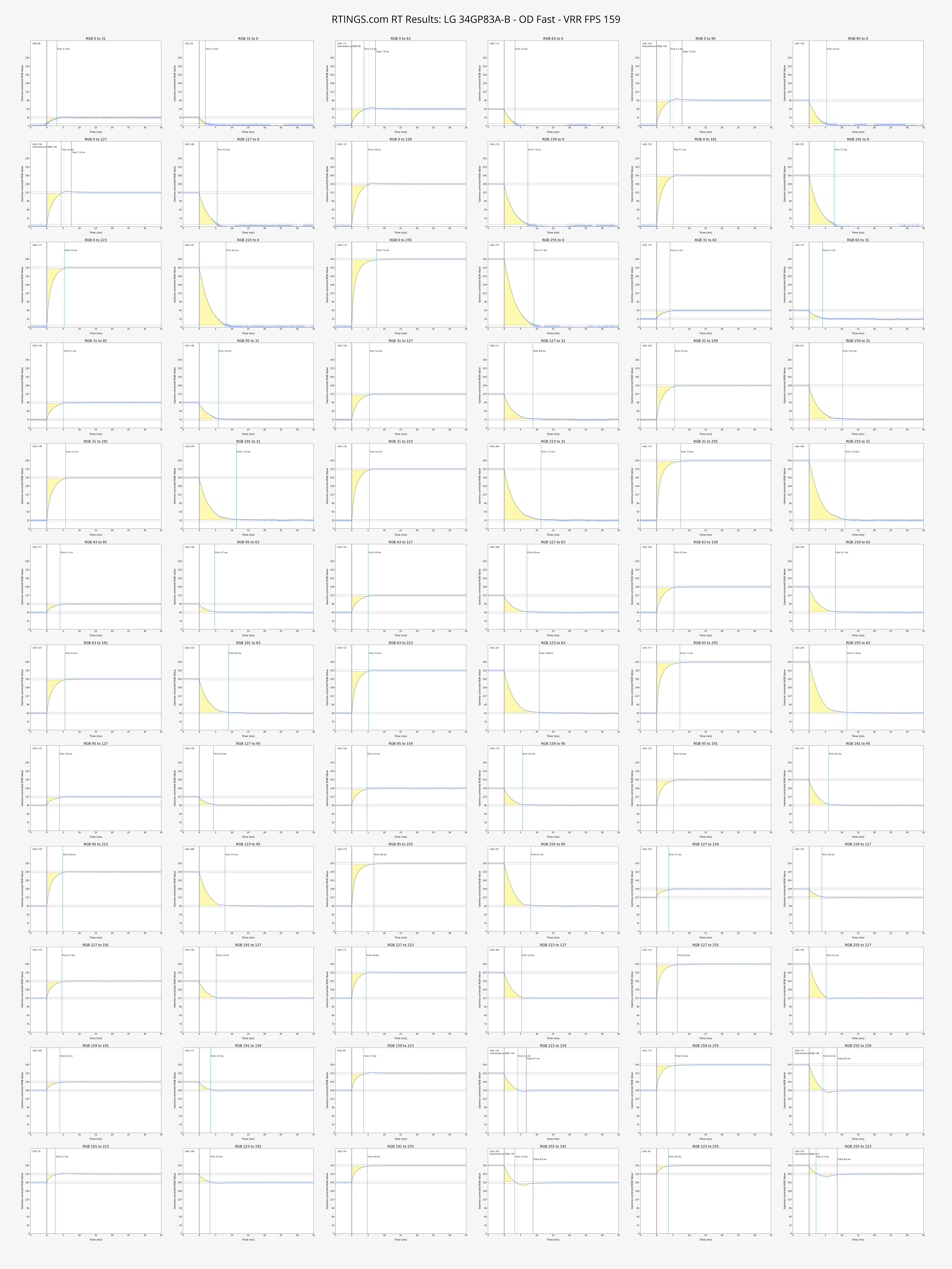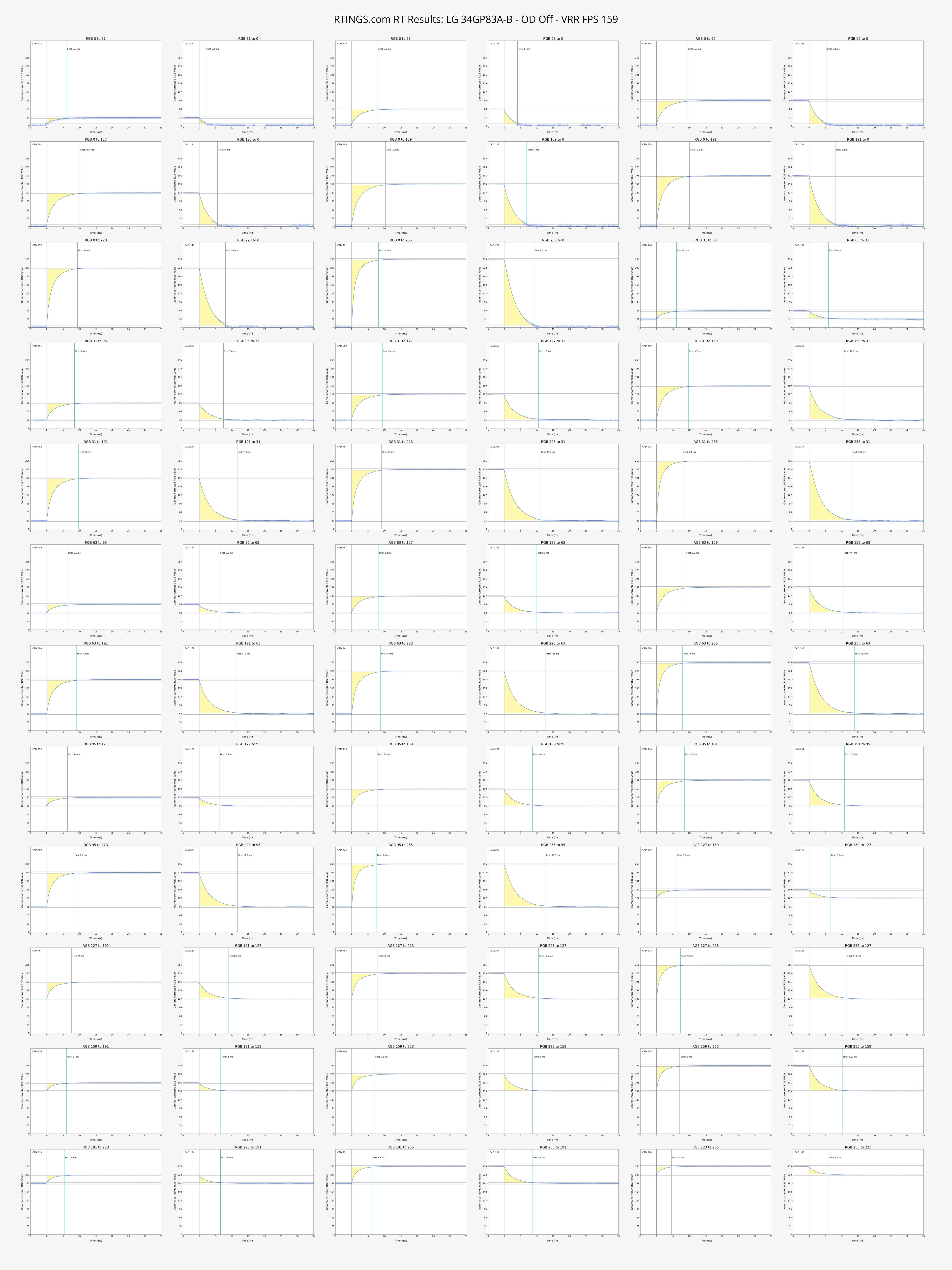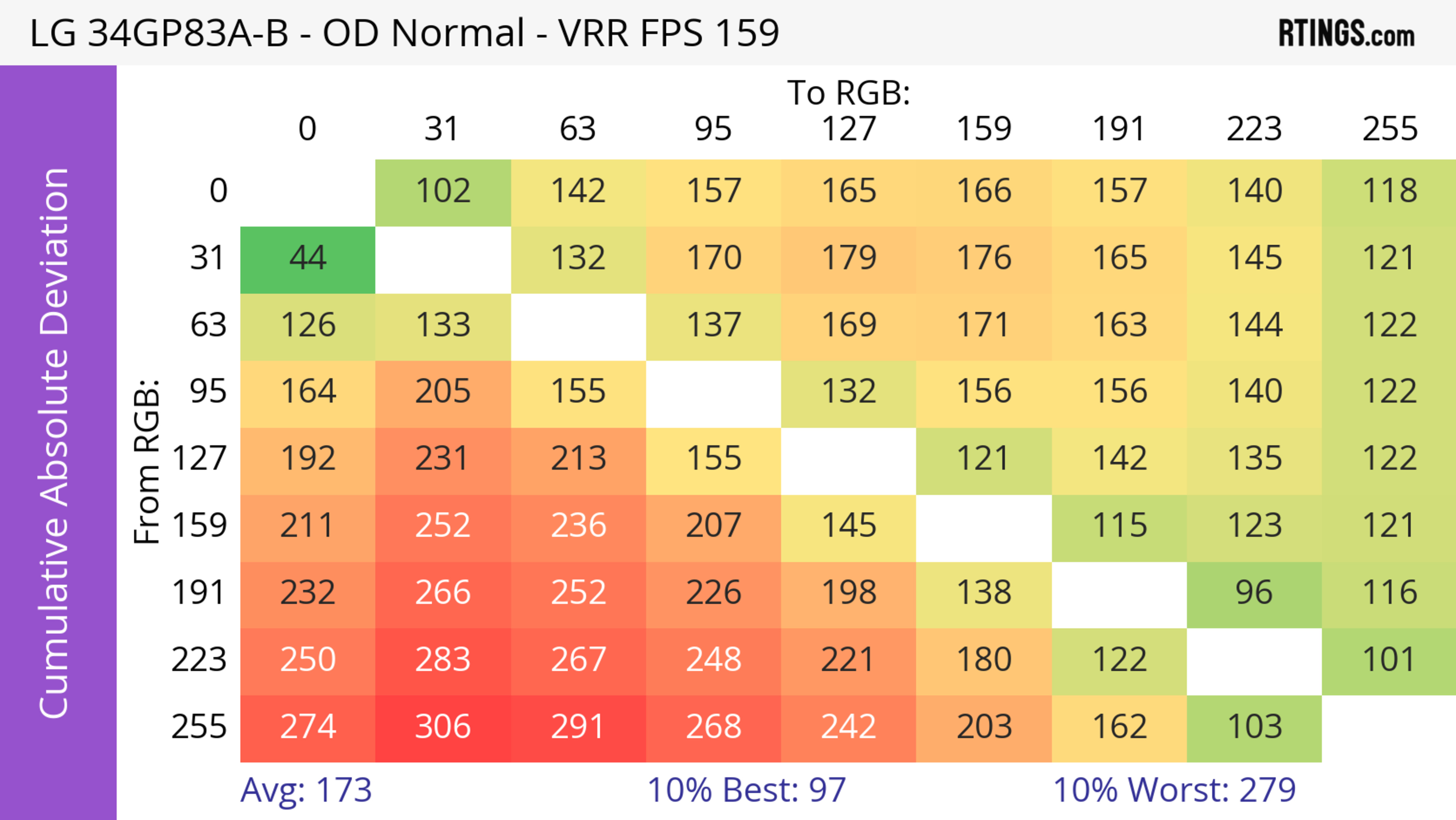 The LG UltraGear 34GP83A-B has good motion handling across its entire refresh rate range with VRR enabled in the recommended 'Fast' Response Time setting, though there's still some motion blur. The 'Fastest' overdrive setting has such a high CAD that it passes the limits of our chart, and you can see it in an alternative chart here.