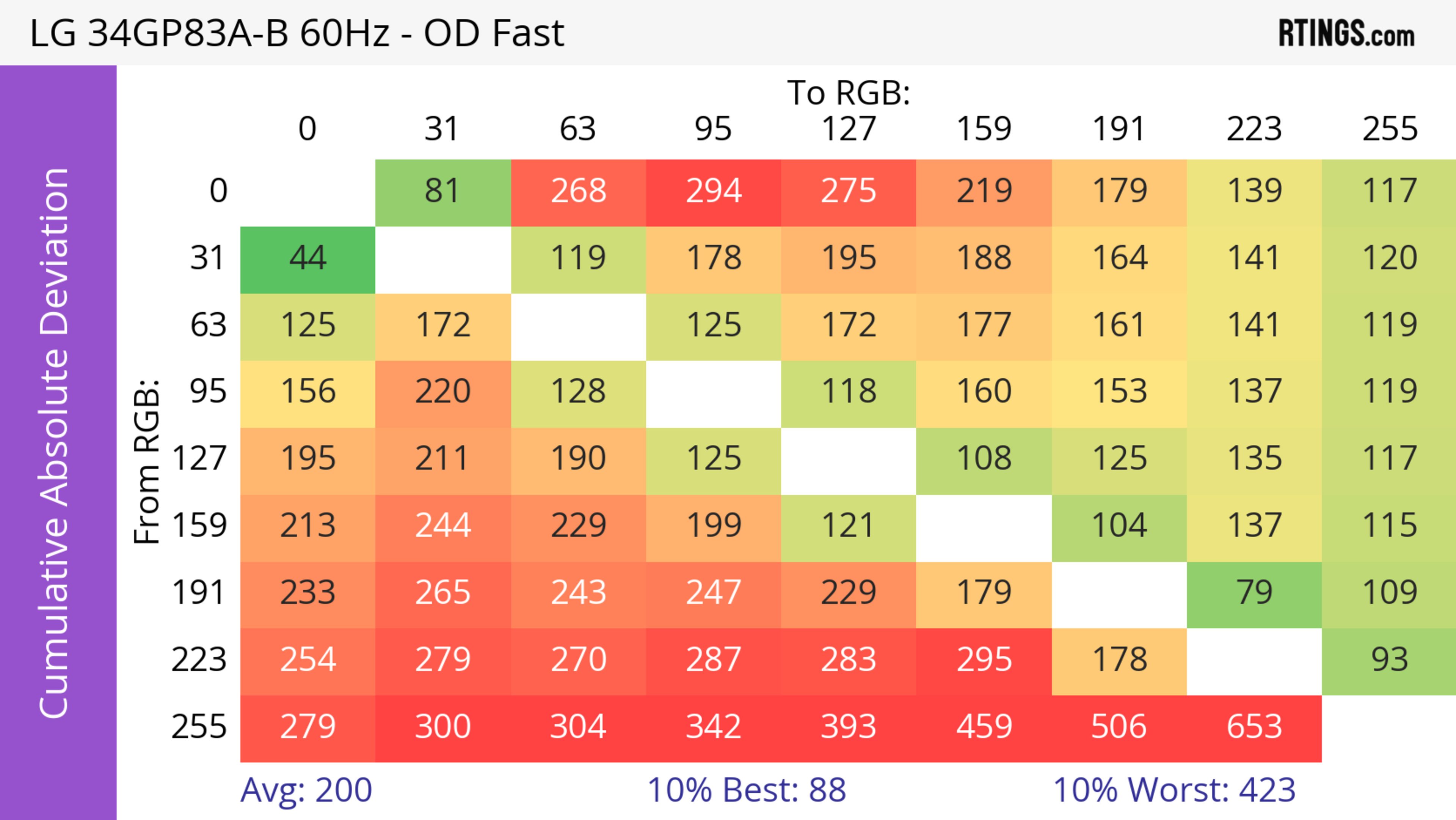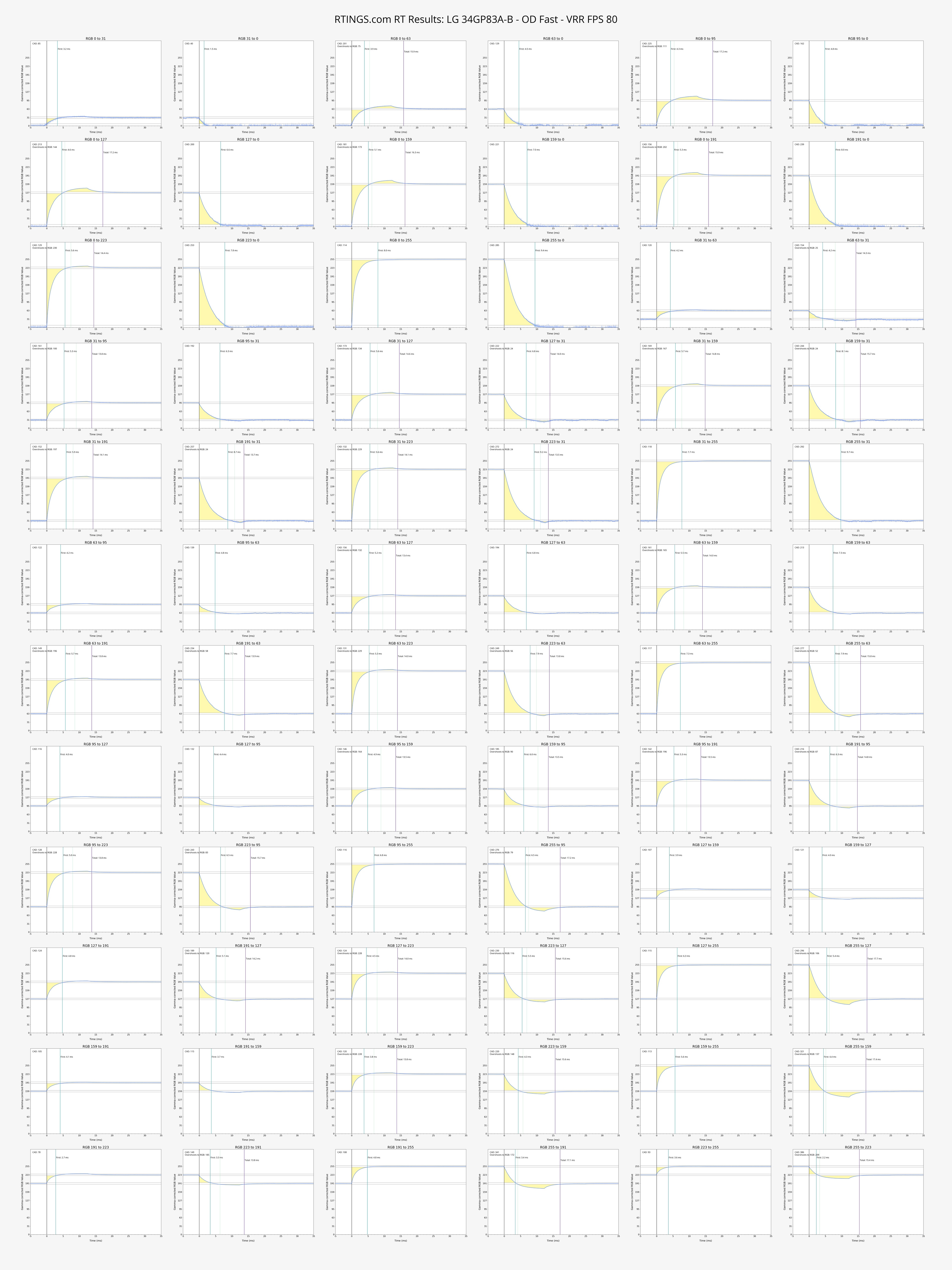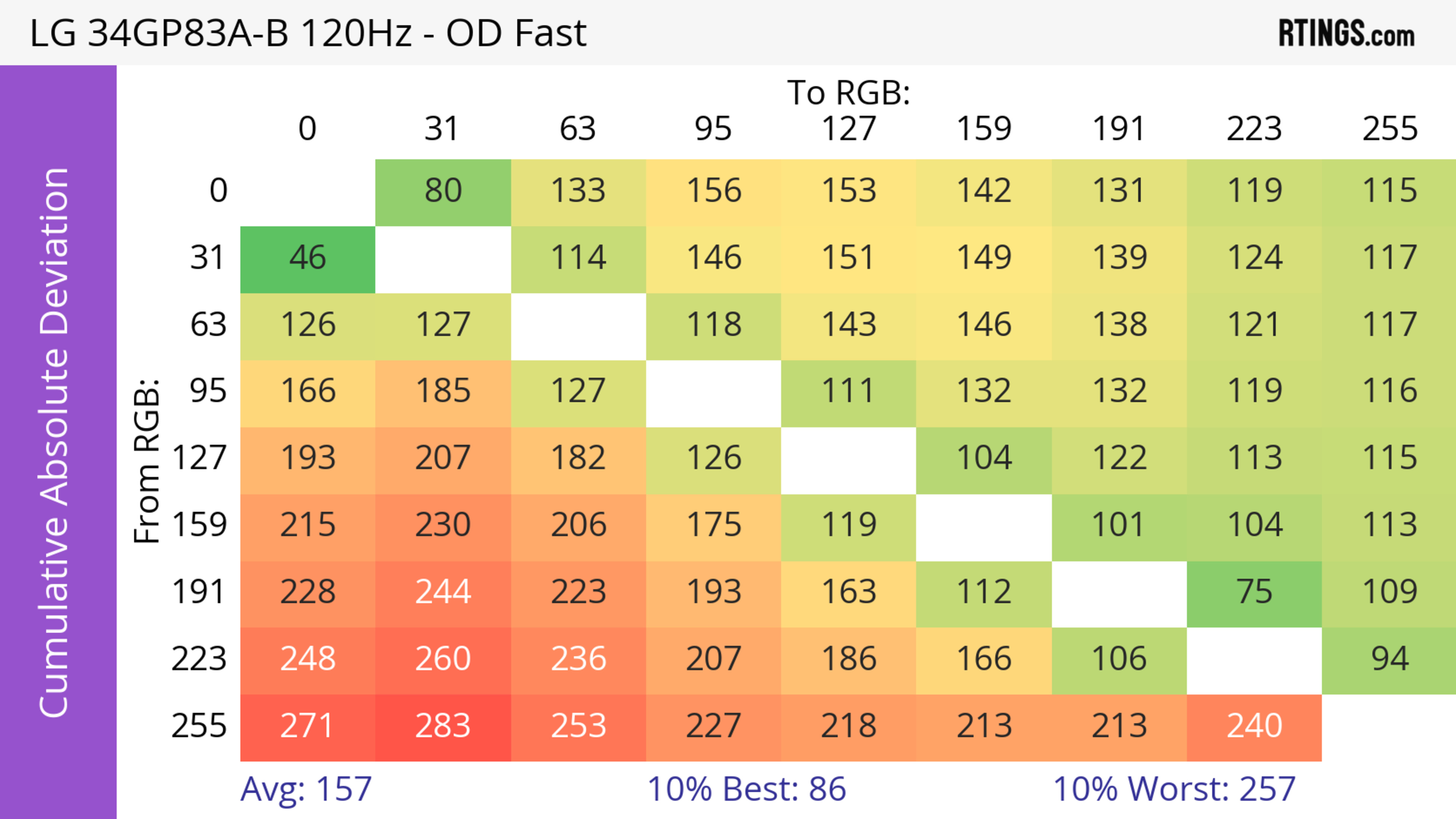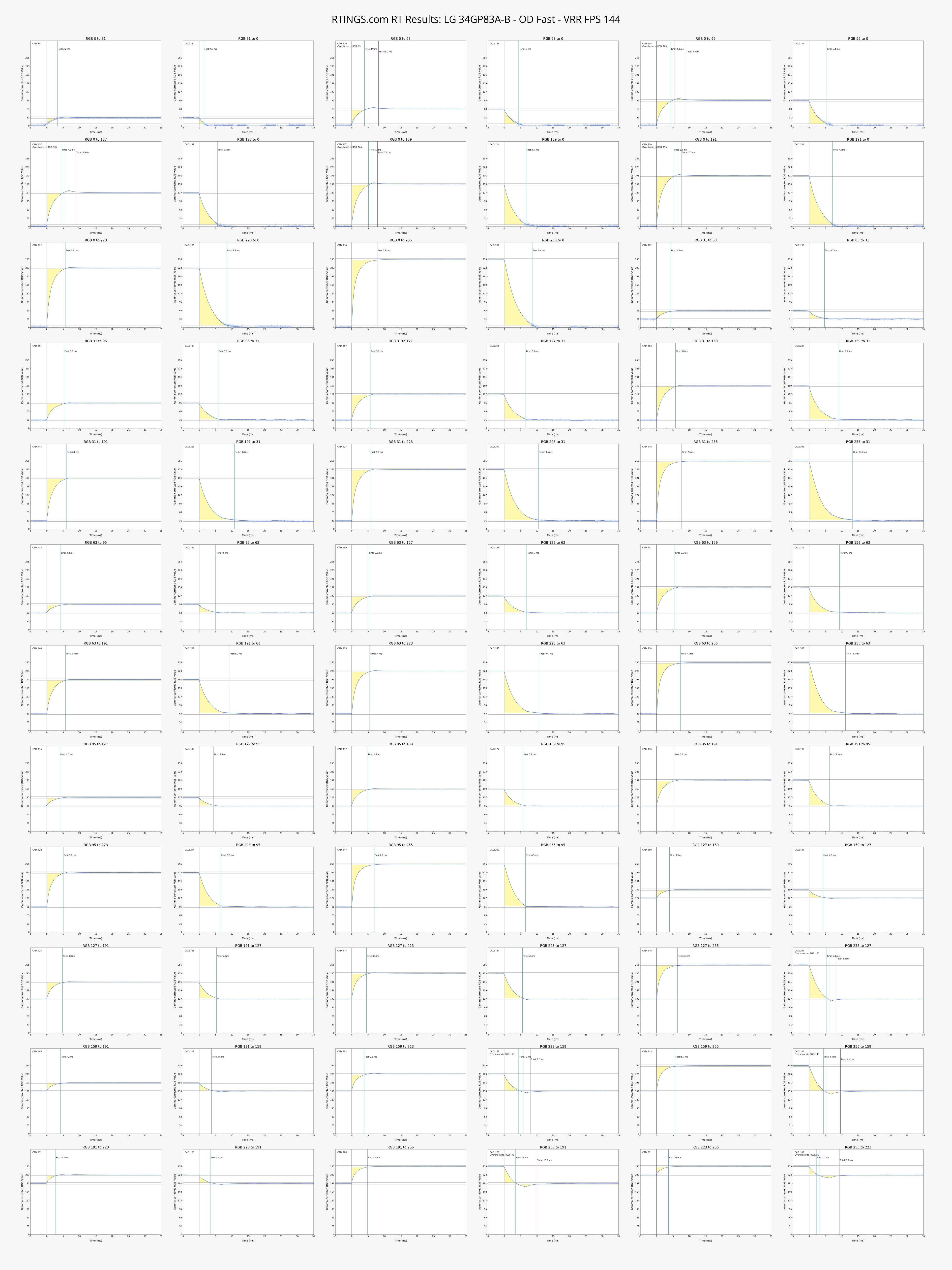 The LG UltraGear 34GP83A-B has good motion handling across its entire refresh rate range with VRR enabled in the recommended 'Fast' Response Time setting, though there's still some motion blur. The 'Fastest' overdrive setting has such a high CAD that it passes the limits of our chart, and you can see it in an alternative chart here.