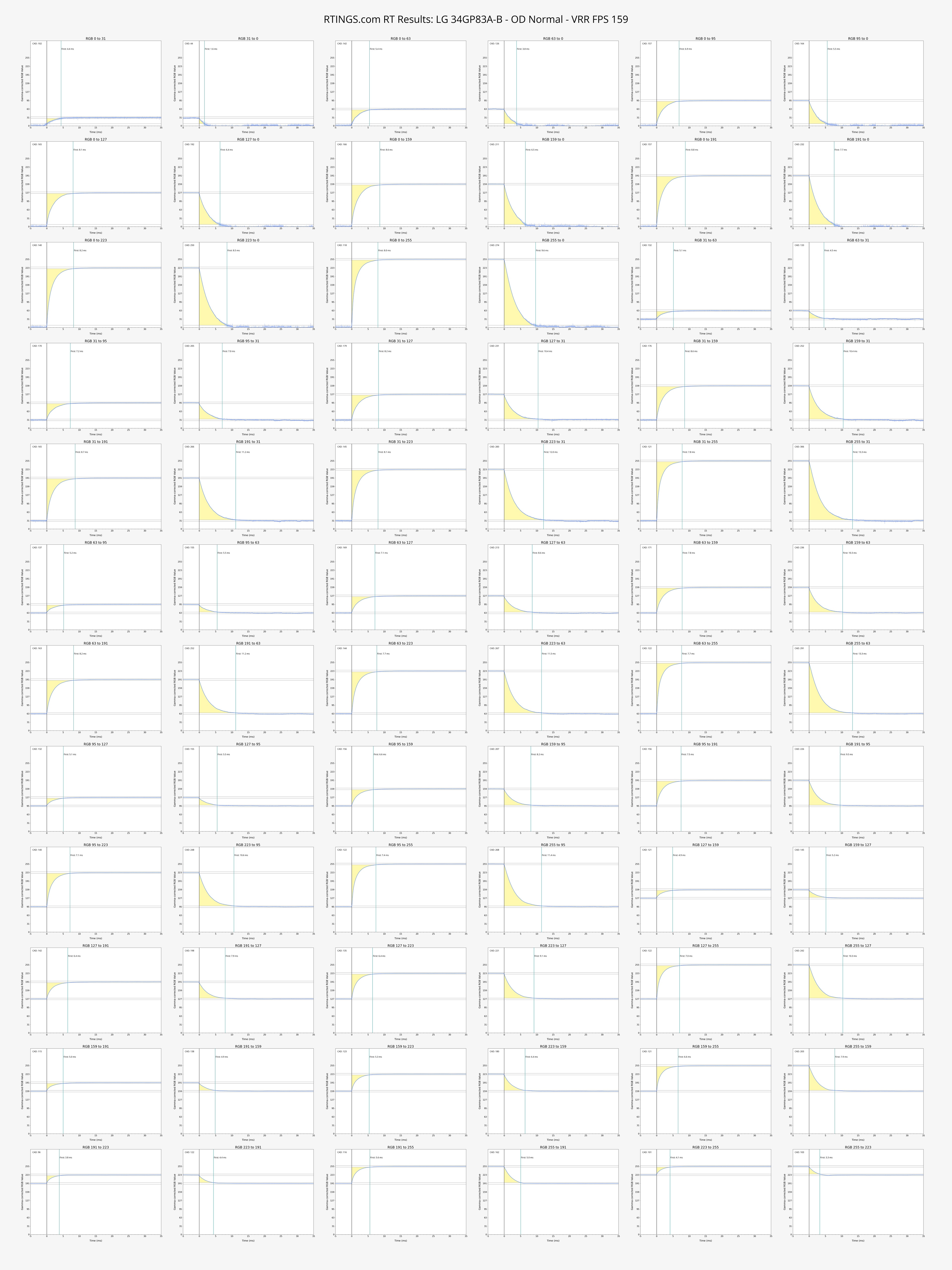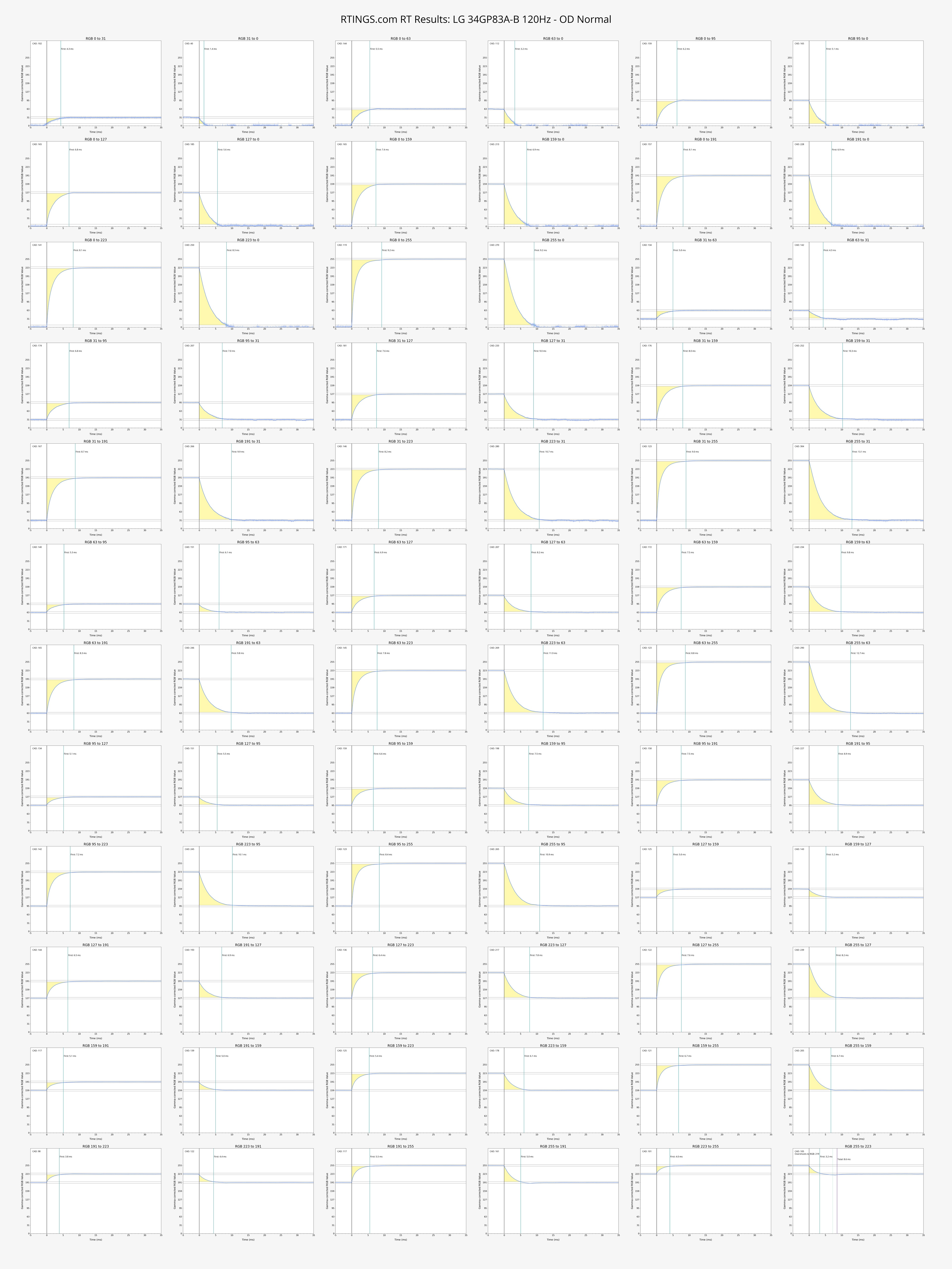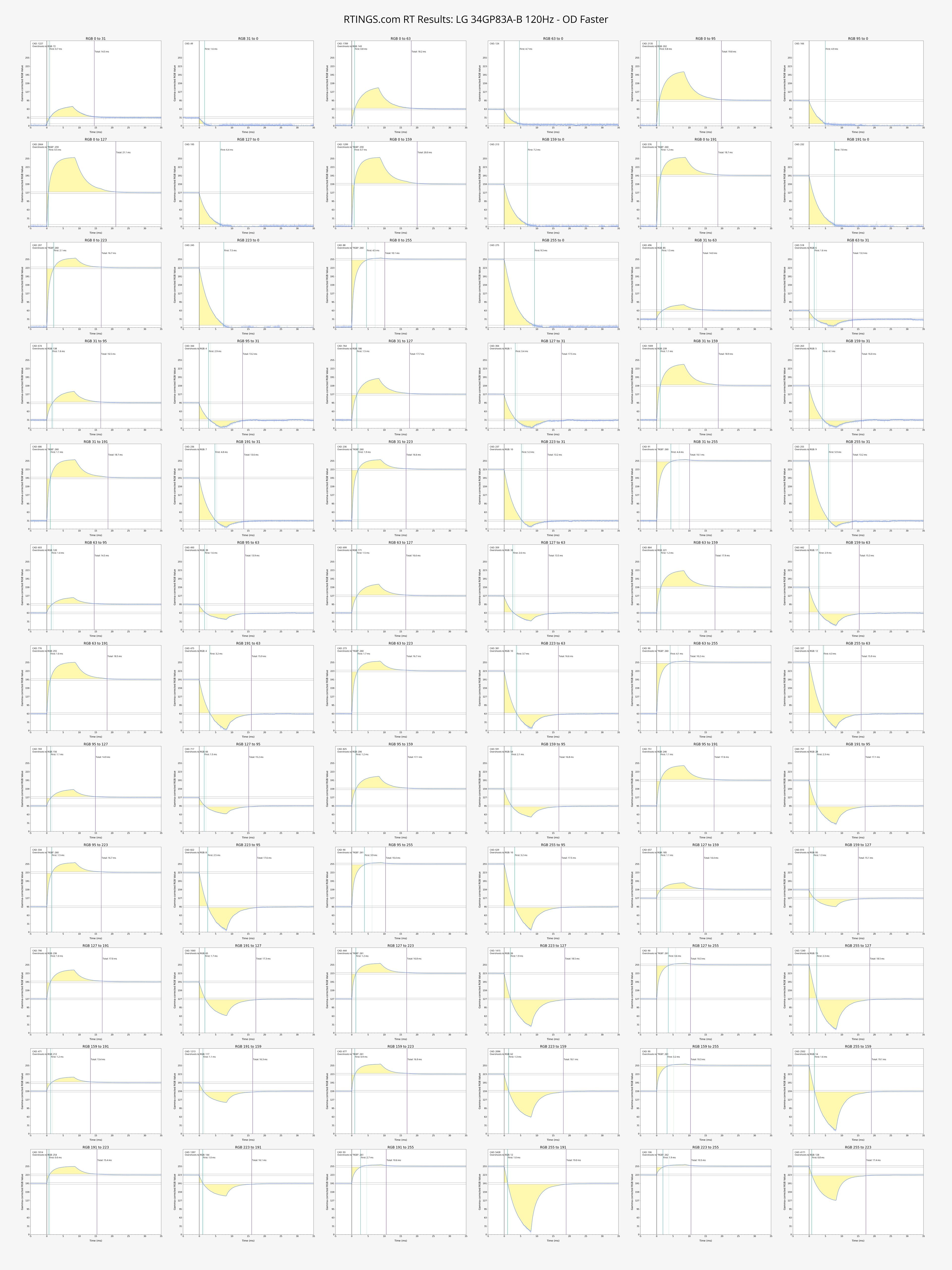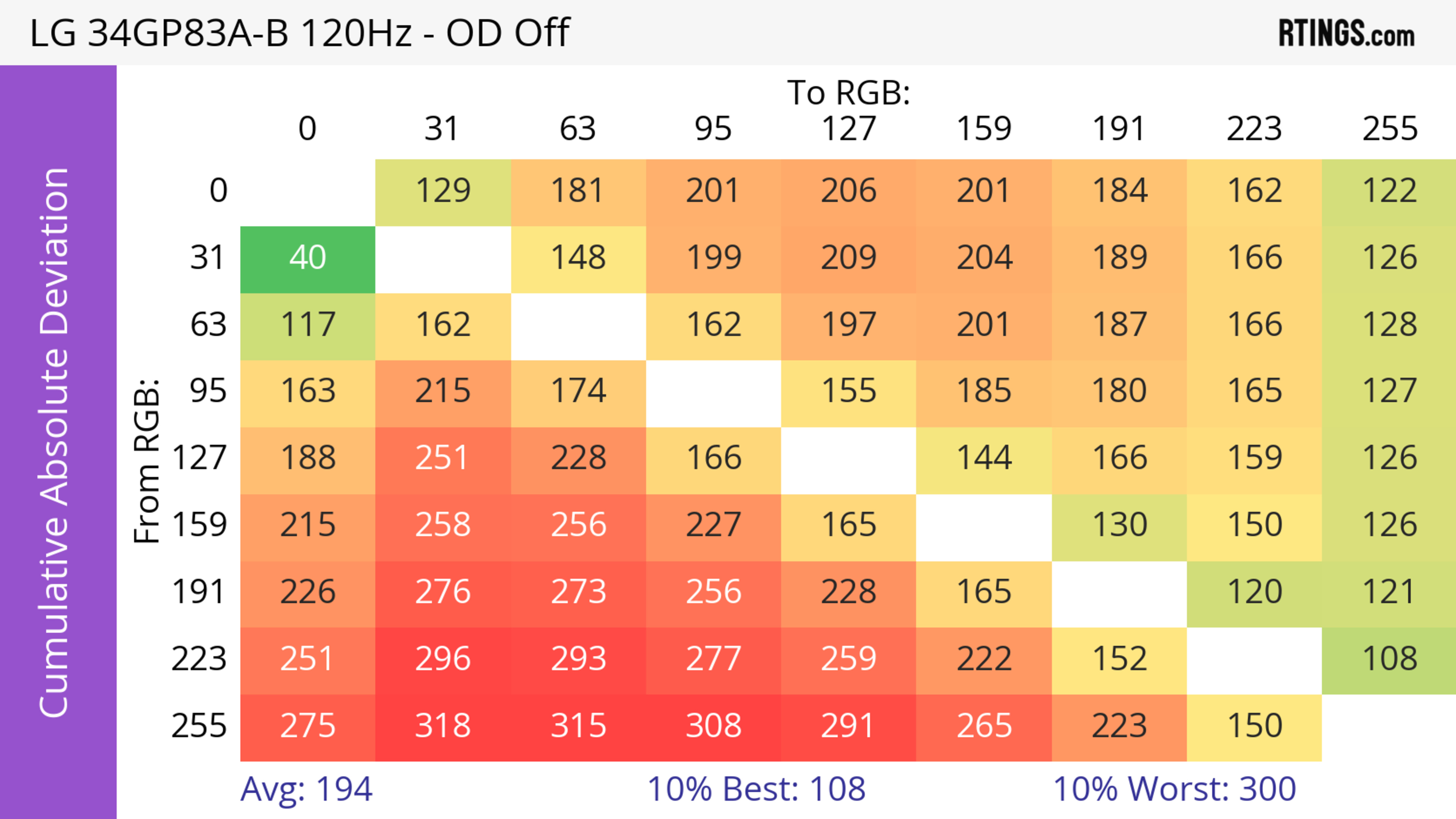 The LG UltraGear 34GP83A-B has good motion handling across its entire refresh rate range with VRR enabled in the recommended 'Fast' Response Time setting, though there's still some motion blur. The 'Fastest' overdrive setting has such a high CAD that it passes the limits of our chart, and you can see it in an alternative chart here.
