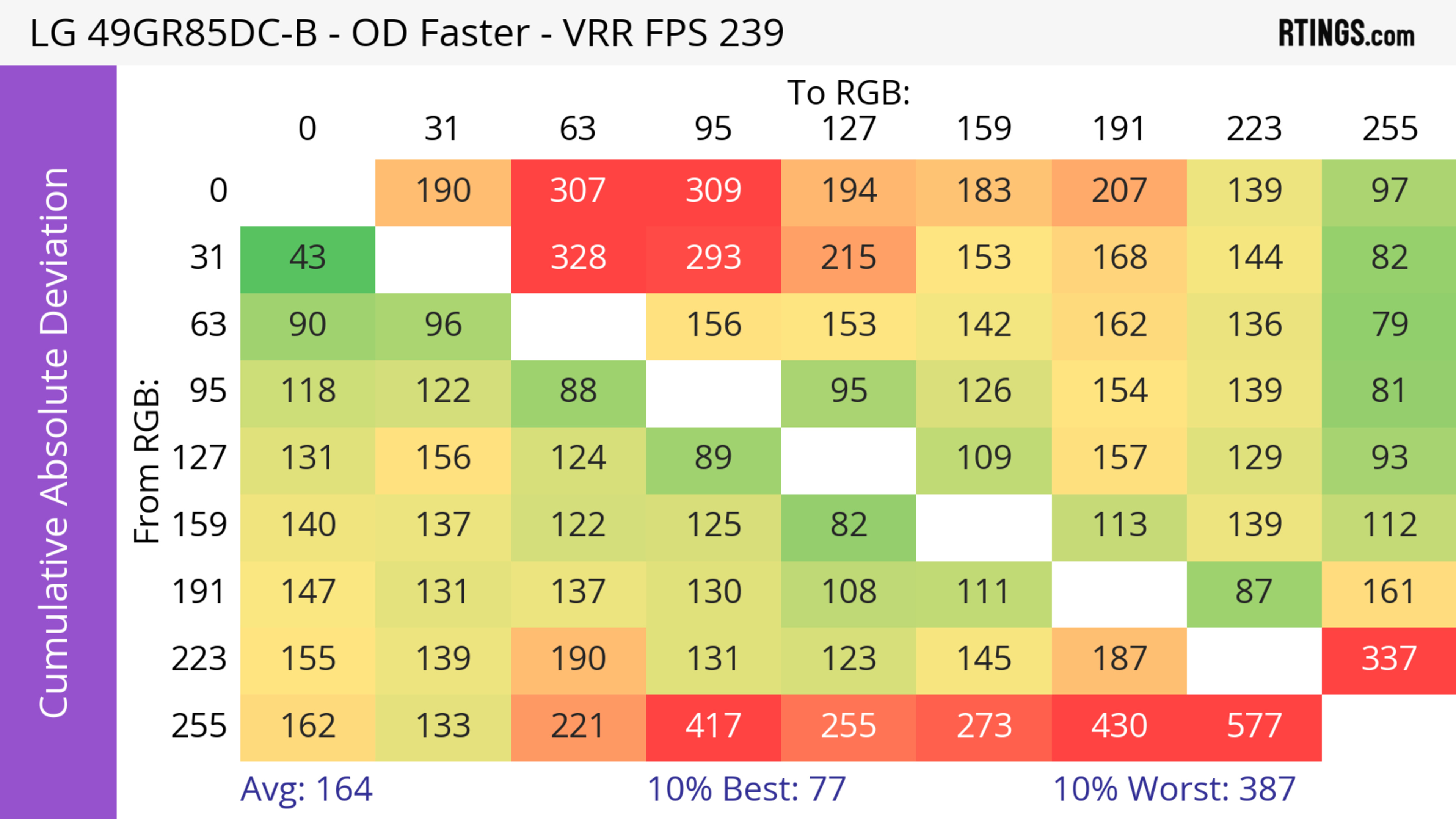 The LG 49GR85DC-B has good motion handling with VRR enabled. The biggest downside is that it has noticeable smearing, which is typical of VA panels, and it also has a bit of inverse ghosting. The 'Fast' Response Time setting is extremely consistent across its refresh rate range, and it has the lowest CAD with most refresh rates, besides at 240Hz.