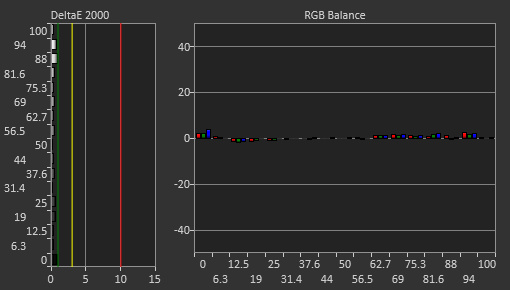 Unfortunately, this monitor has disappointing accuracy out of the box. The white balance is okay overall, but bright scenes are a bit off, and colors are bad, with noticeable inaccuracies in every color. The color temperature is a bit warm, and gamma is all over the place. Dark scenes are crushed a bit, and bright scenes are too bright.