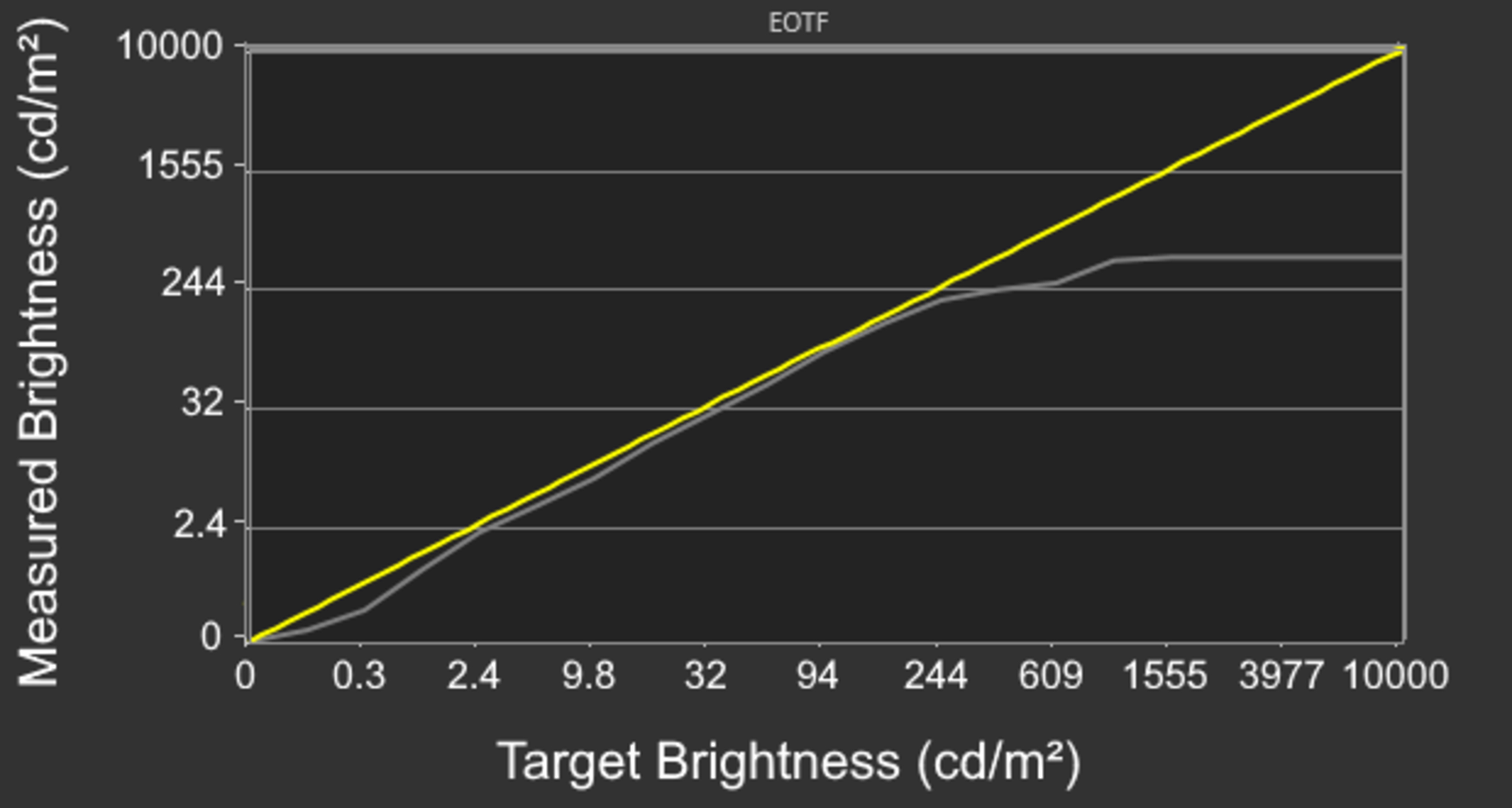 The MSI 271QRX has decent HDR brightness. Very small highlights pop against the rest of the image, though larger highlights don't. As of firmware FW.203 (also known as FW.018 and FW.109), which was released in November 2025, there's an 'EOTF Boost' mode that you can use. It has very accurate PQ EOTF tracking with a sharp cut-off at its peak brightness, so it isn't performing any tone mapping before your source does. This tracking is better than the 'Peak 1000 nits' mode, which has a slow roll-off before reaching its peak brightness. The 'EOTF Boost' mode also gets a bit brighter than the 'Peak 1000 nits' mode.