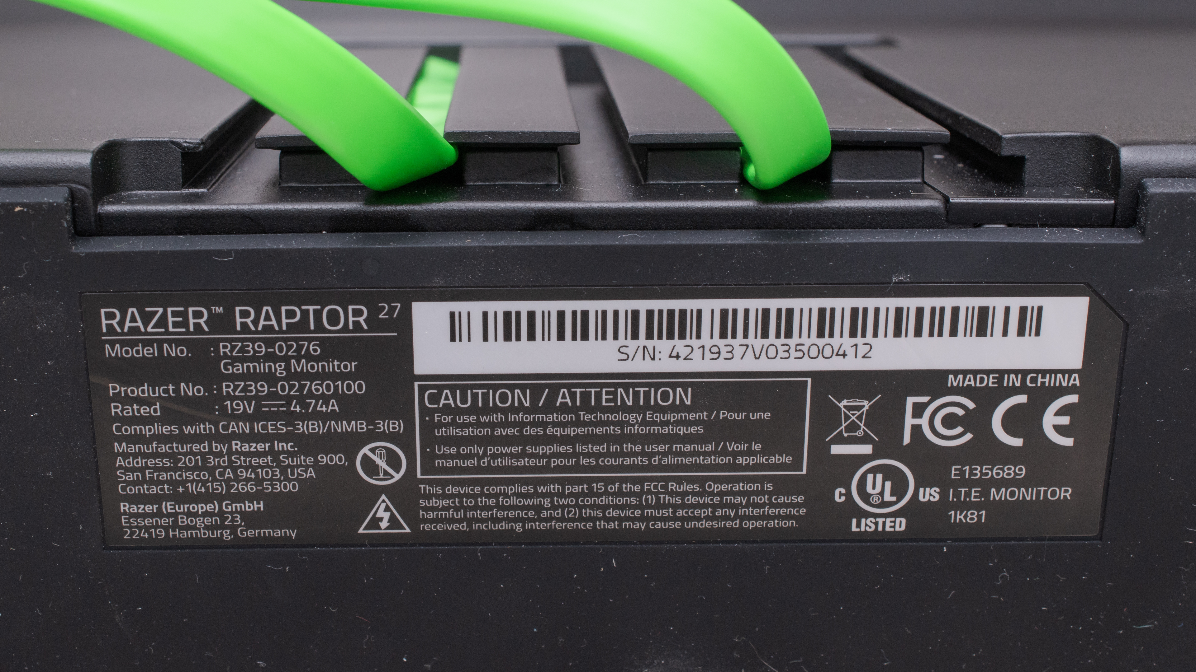 We tested the 27" Razer Raptor 27 144Hz, model number RZ39-0276, which is the first monitor made by Razer. At E3 2021, Razer announced an updated version of this monitor. The new version has a 165Hz refresh rate and is FreeSync Premium certified and THX certified, but otherwise appears to be unchanged.