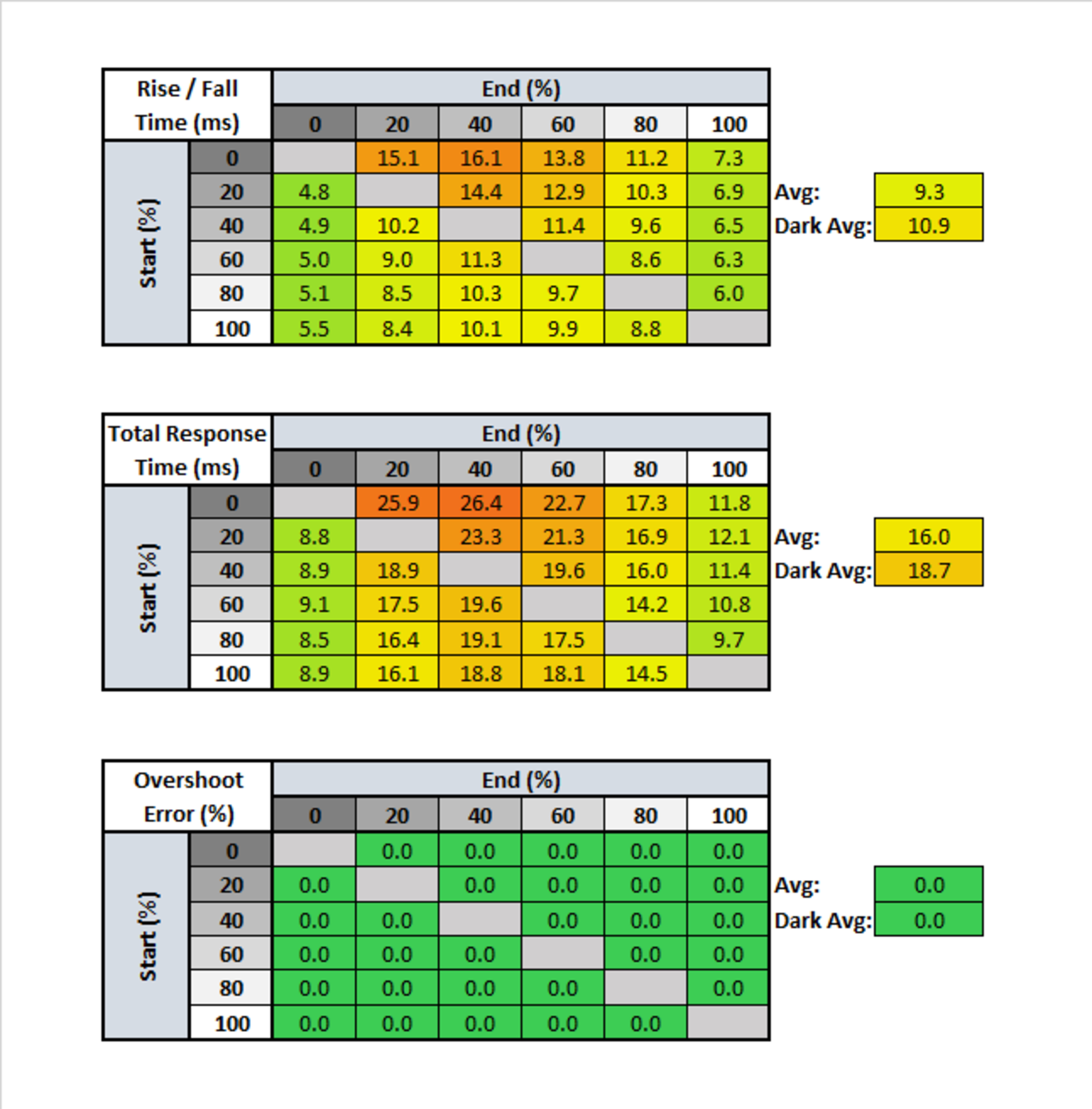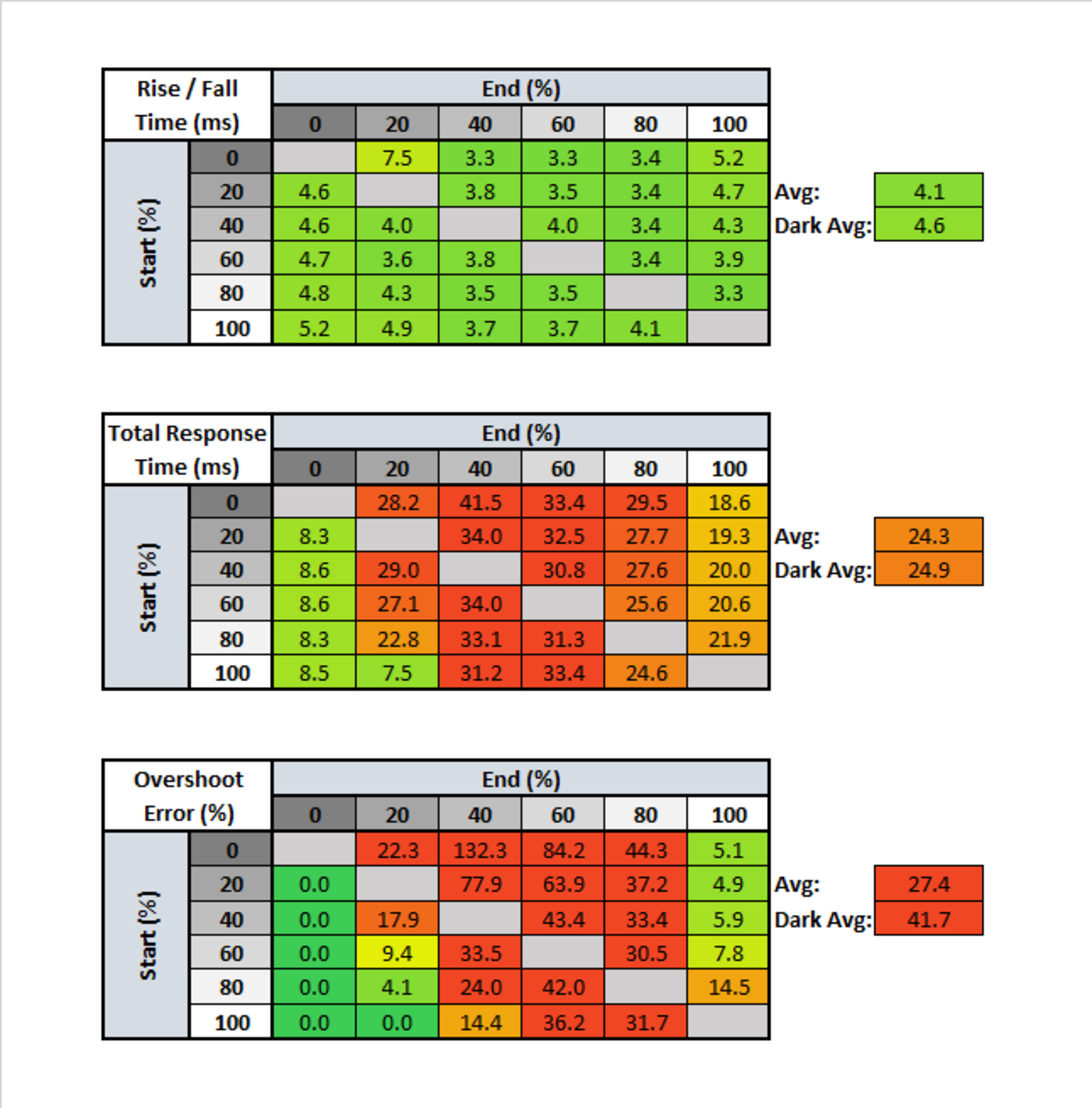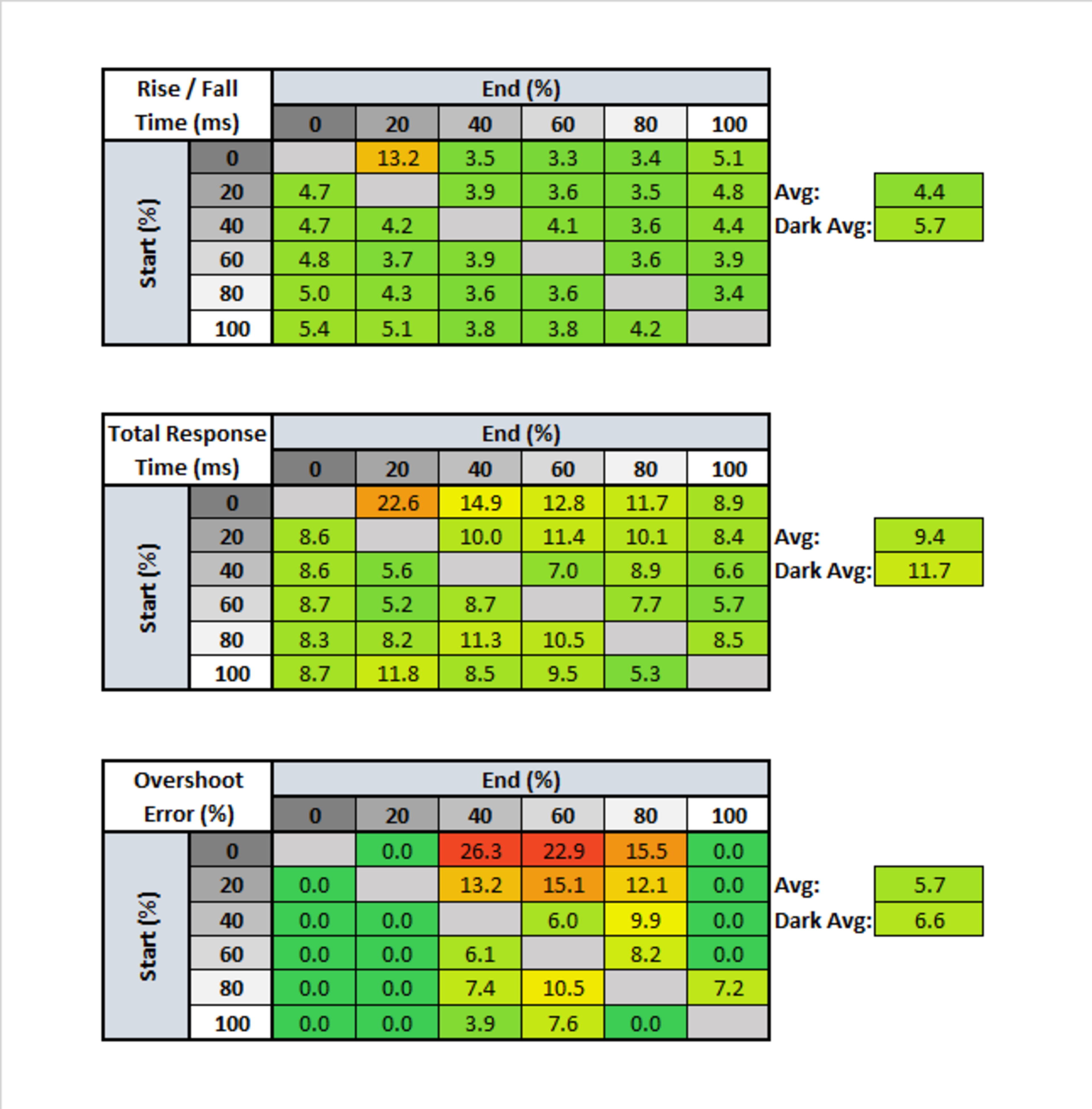 | Overdrive Setting | Response Time Chart | Response Time Tables | Motion Blur Photo |