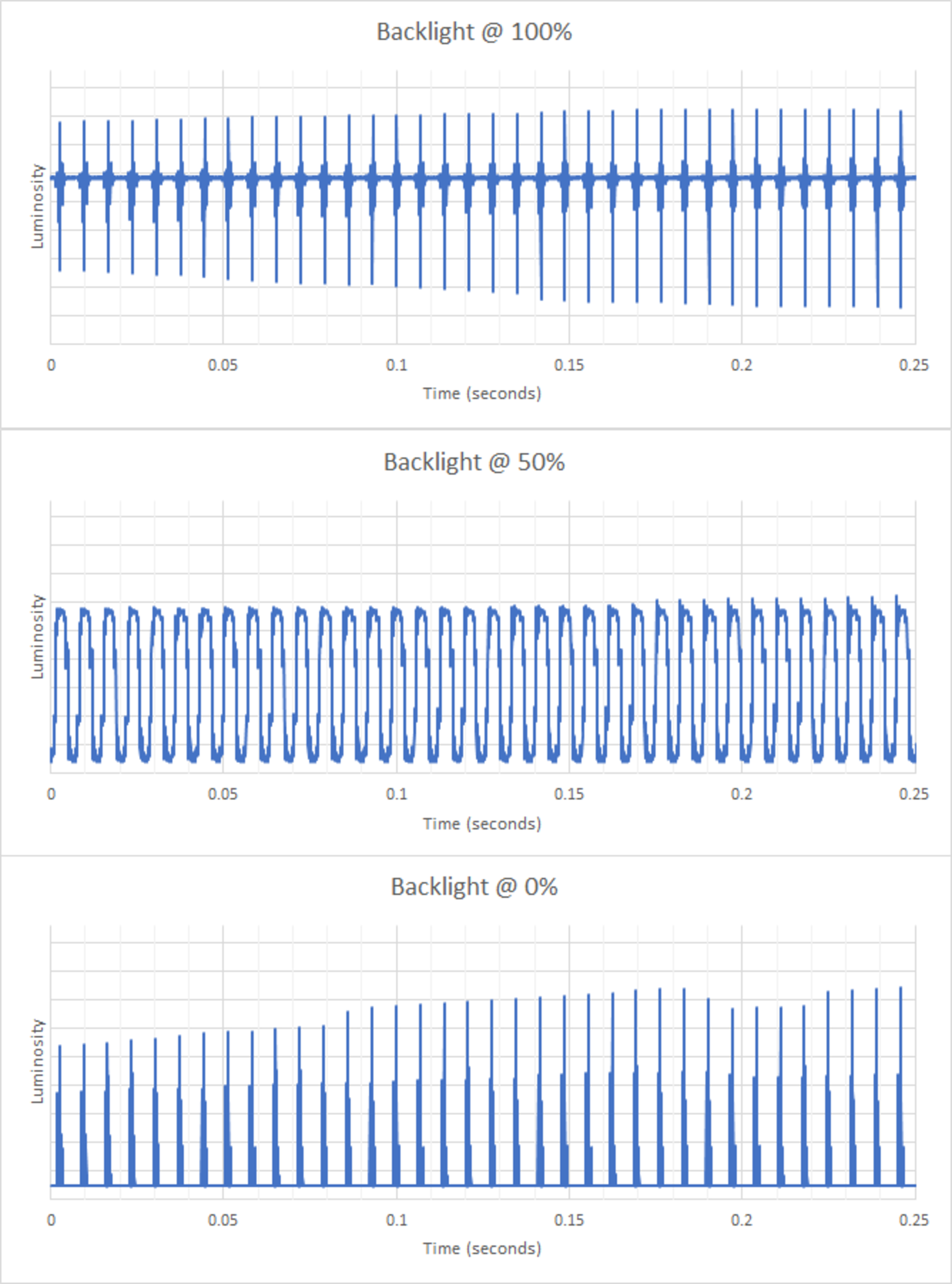 The Samsung 43QN90B uses pulse width modulation to dim its backlight at all brightness settings in Game Mode with the input label set to 'PC'. It always flickers at 960Hz with VRR enabled (pictured above), which is high enough that you won't notice it, and without VRR, it flickers at the same rate as the refresh rate, as you can see here. The flicker changes with other picture modes, which you can read more about in the TV review.