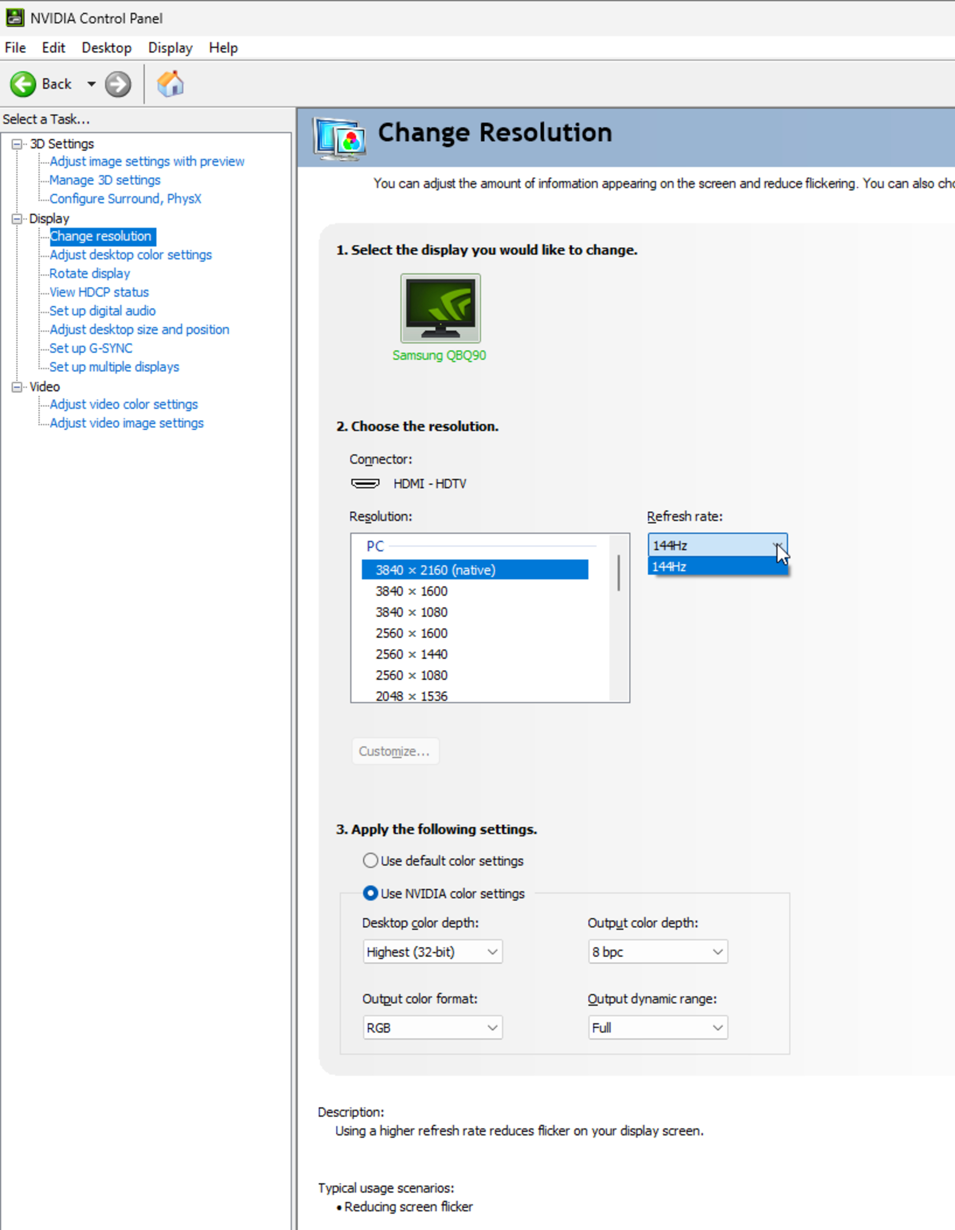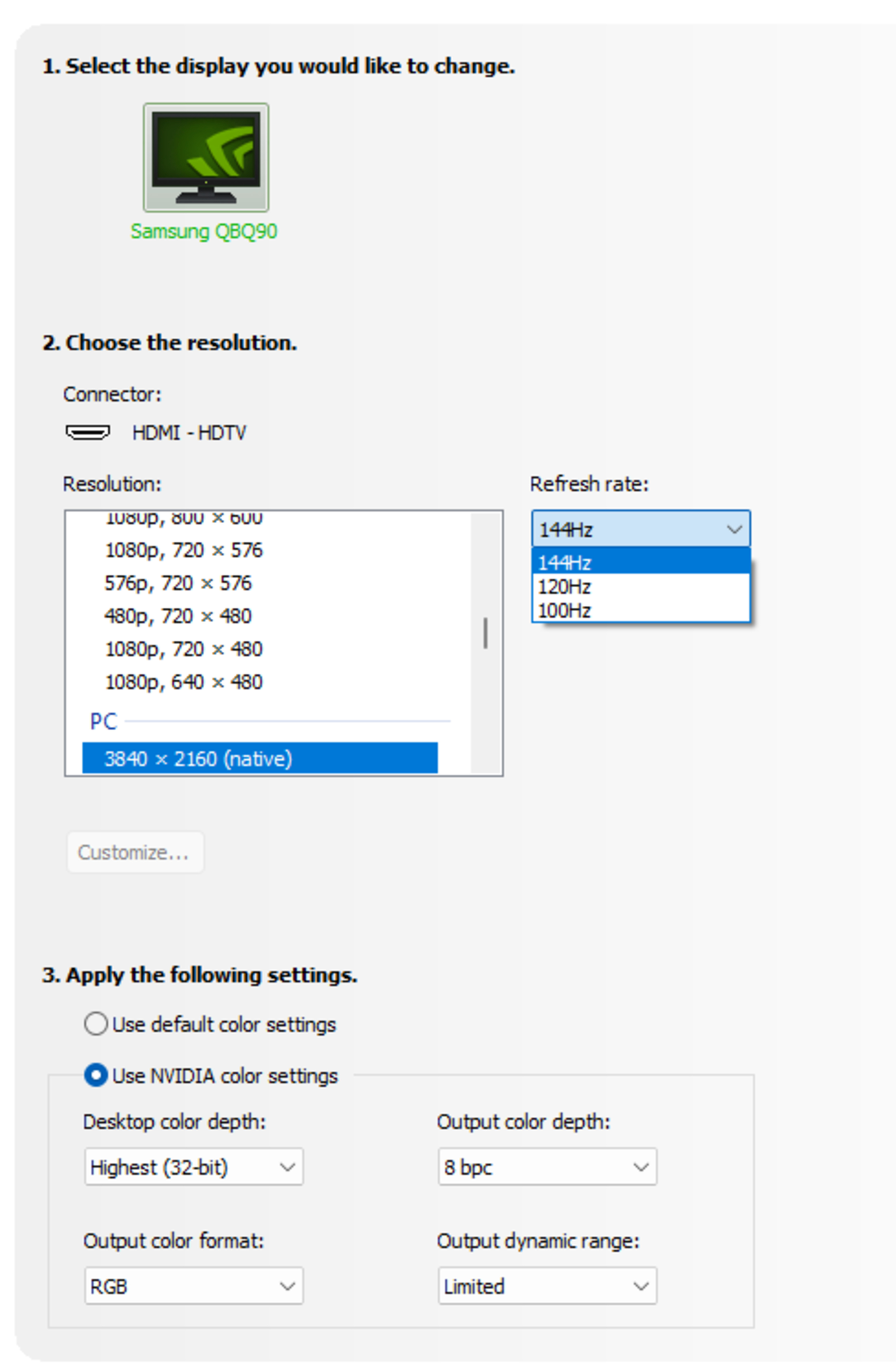 Originally with firmware 1448, we weren't able to set a 120Hz refresh rate in the NVIDIA Control Panel with VRR enabled, as you can see here. However, after checking again in August 2023, even with firmware 1448, 144Hz, 120Hz, and 100Hz are now all options in the NVIDIA Control Panel, as you can see here. Because the TV says that it's on the latest firmware and we didn't have to update anything, it's possible this is also a bug with the NVIDIA Control Panel. There aren't any issues with AMD graphics cards.