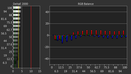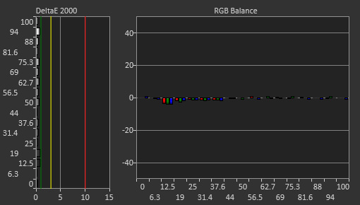 After calibration, the Samsung CRG90 has remarkable accuracy. Gamma follows the target curve almost perfectly, and most color and white balance errors are corrected.