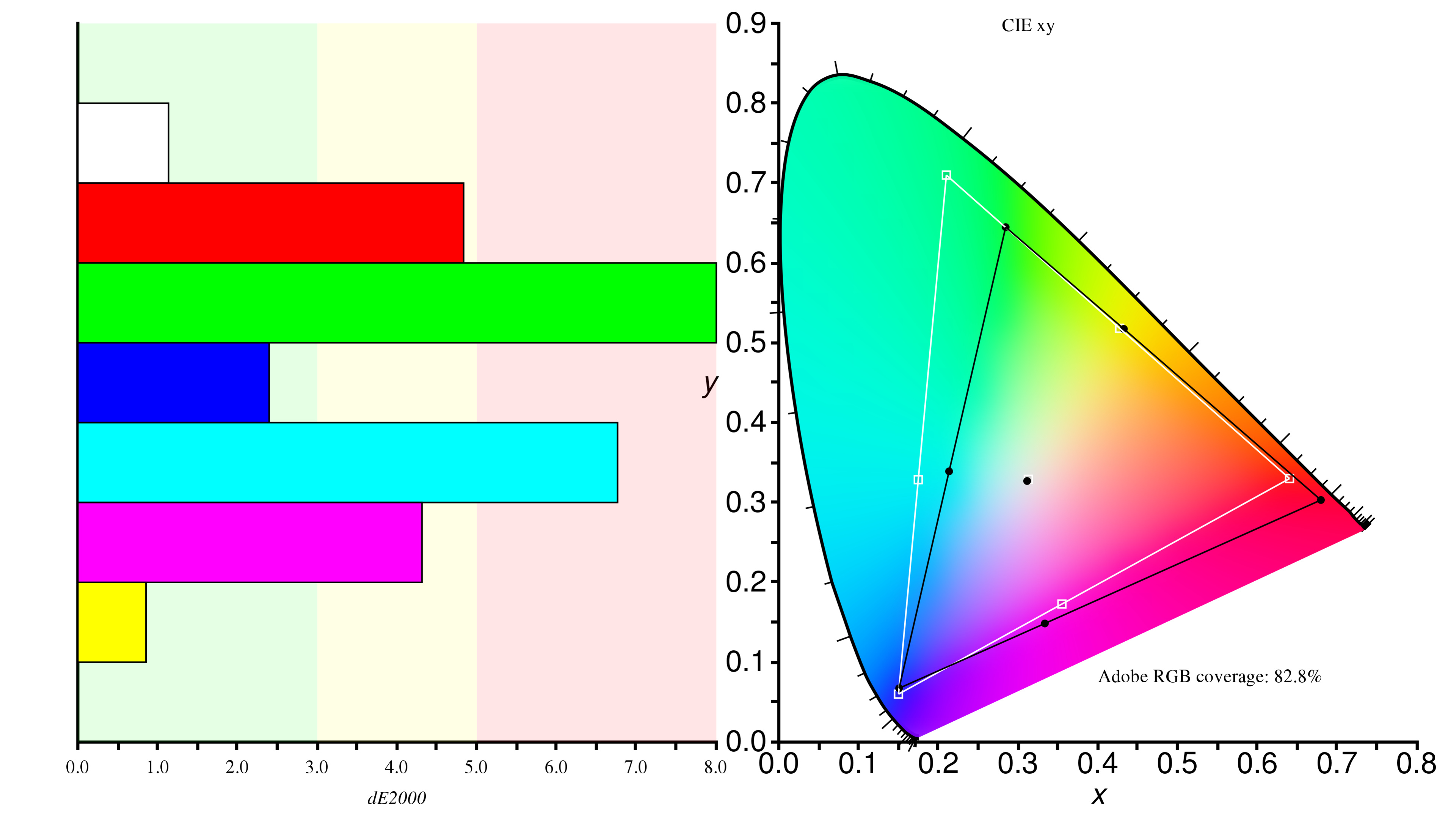 The Samsung CRG9 has an outstanding SDR color gamut. It has essentially perfect coverage of the sRGB color space used in most content, and great coverage of the wider Adobe RGB color space, which is mostly used for photo editing.