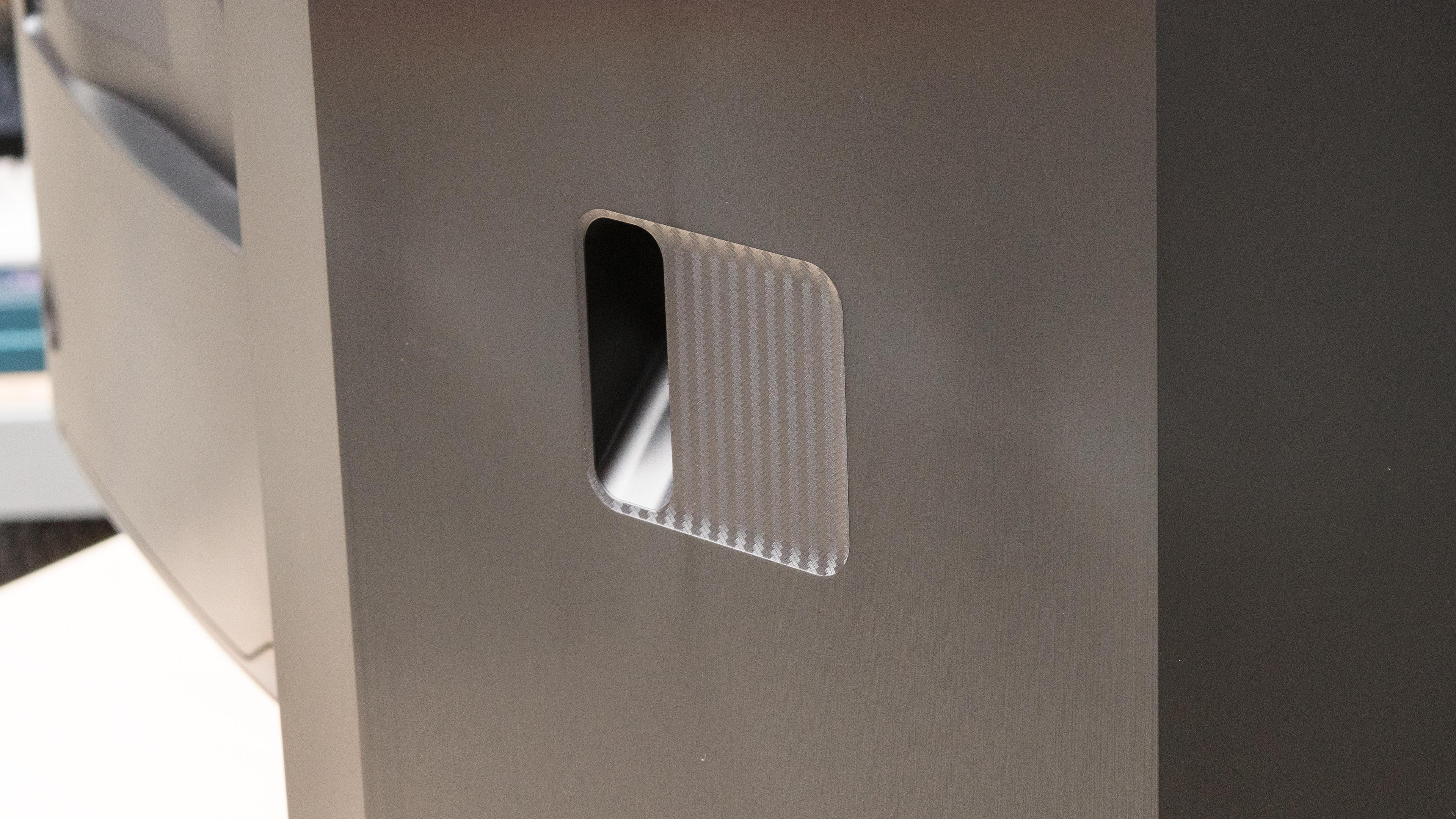 The Samsung Ark has great ergonomics. The height adjustment is incredibly high because you must raise the screen before rotating it into portrait mode. You can't rotate it until you raise the screen, as this prevents the screen from being damaged by hitting the desk. This also means that the height range in portrait mode is much smaller as you can only raise it by over just an inch. Luckily, the tilt range is the same in landscape and portrait mode, going from 15˚ to 35˚ in portrait mode. You can see the back of the monitor in portrait mode here.