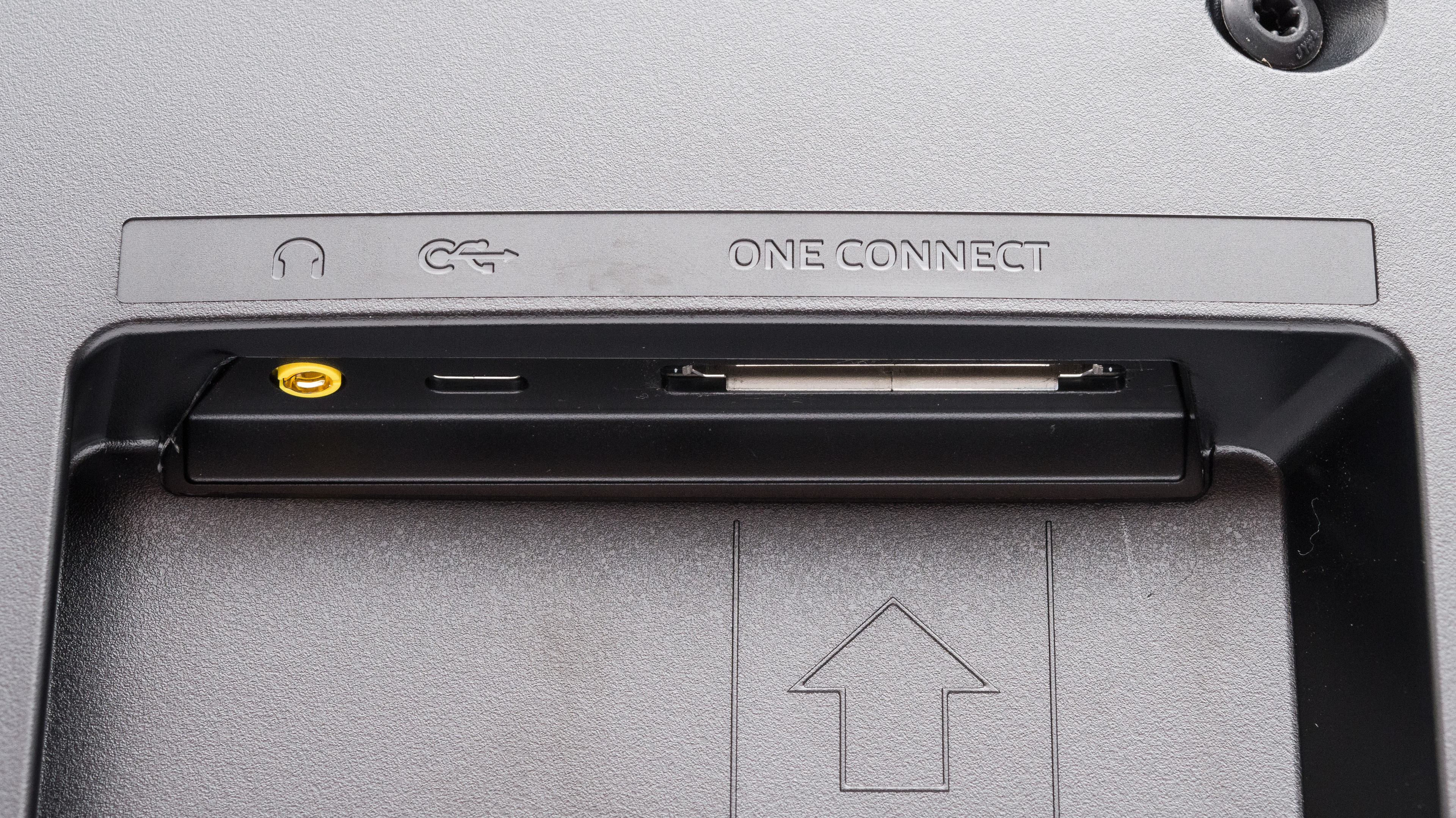 All the inputs are housed in the One Connect box. You connect it to the monitor using a single cable, and the input is in the back of the monitor, as you can see here. The monitor also has a USB-C port for a webcam and an audio output.