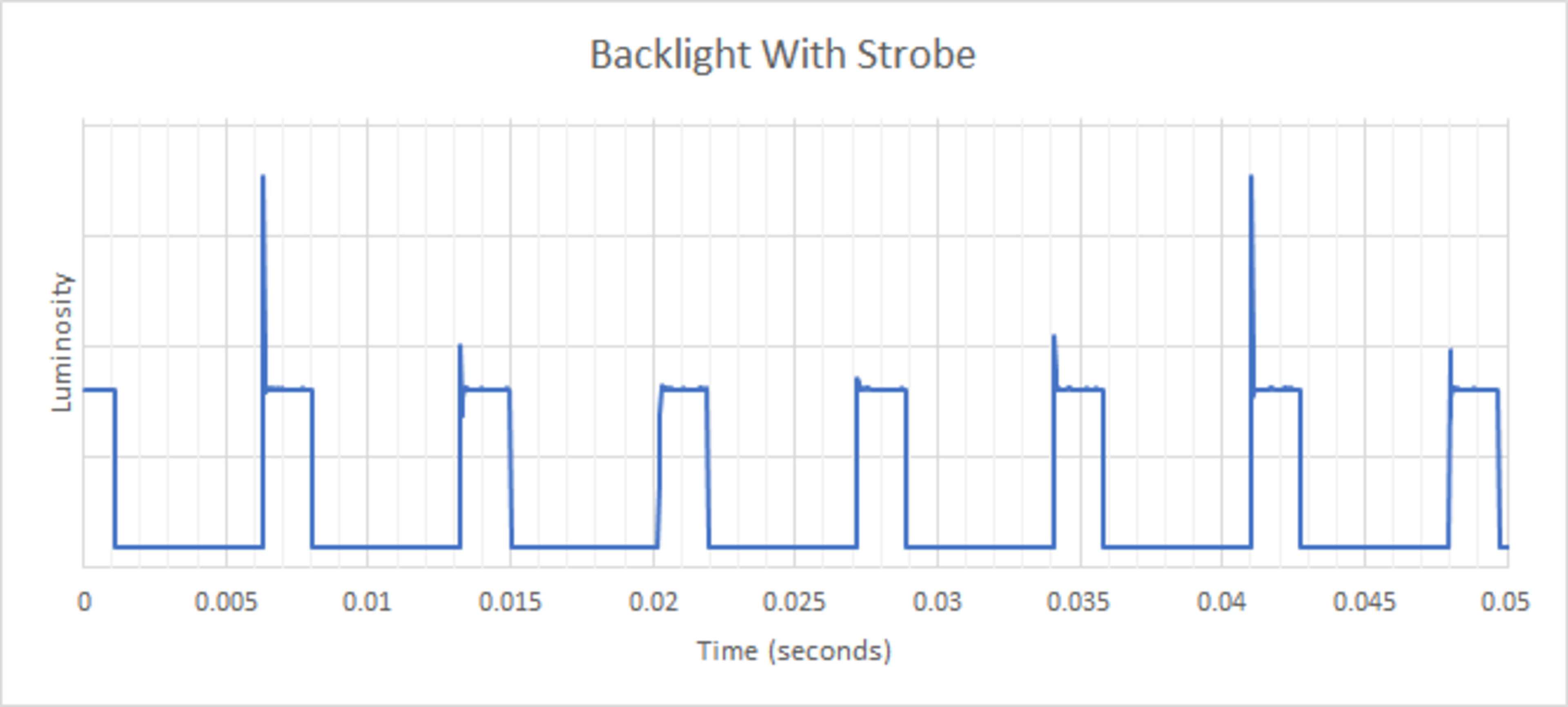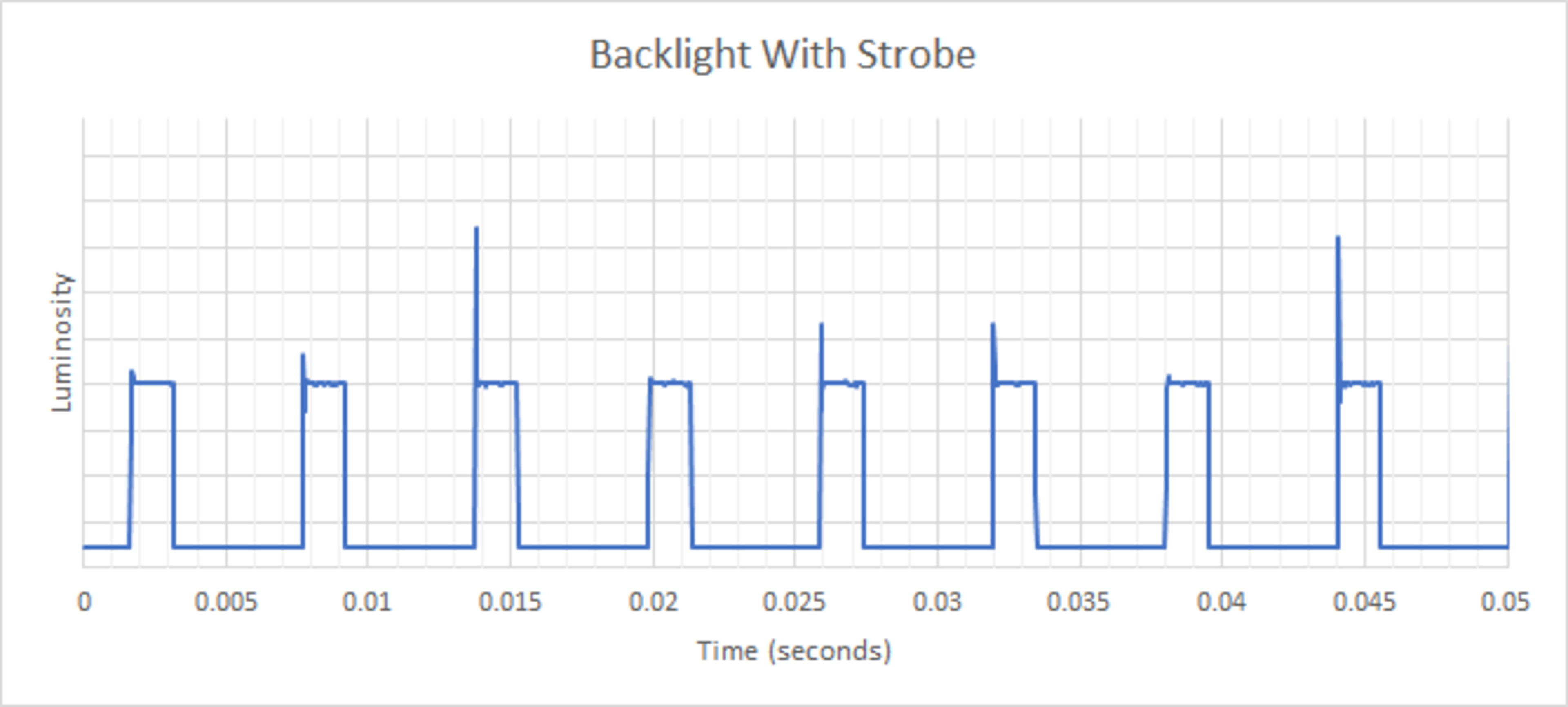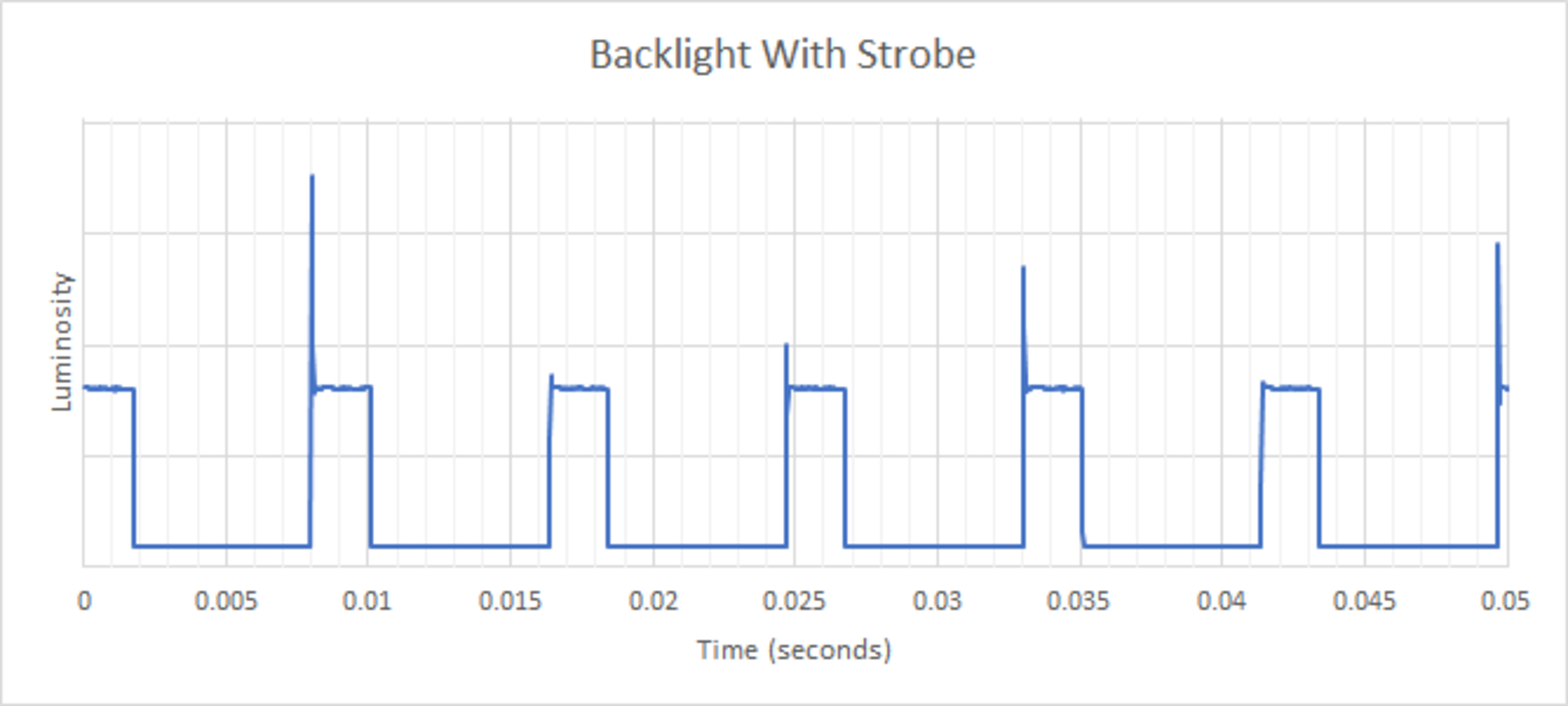 This monitor has an optional backlight strobing feature, otherwise known as black frame insertion. It only works with Refresh Rate in the OSD set to 165Hz, 144Hz, or 120Hz, and you can't enable VRR at the same time. While it reduces motion blur, there's image duplication, and it dims the screen. These results are with the refresh rate in the OSD set to 165Hz.