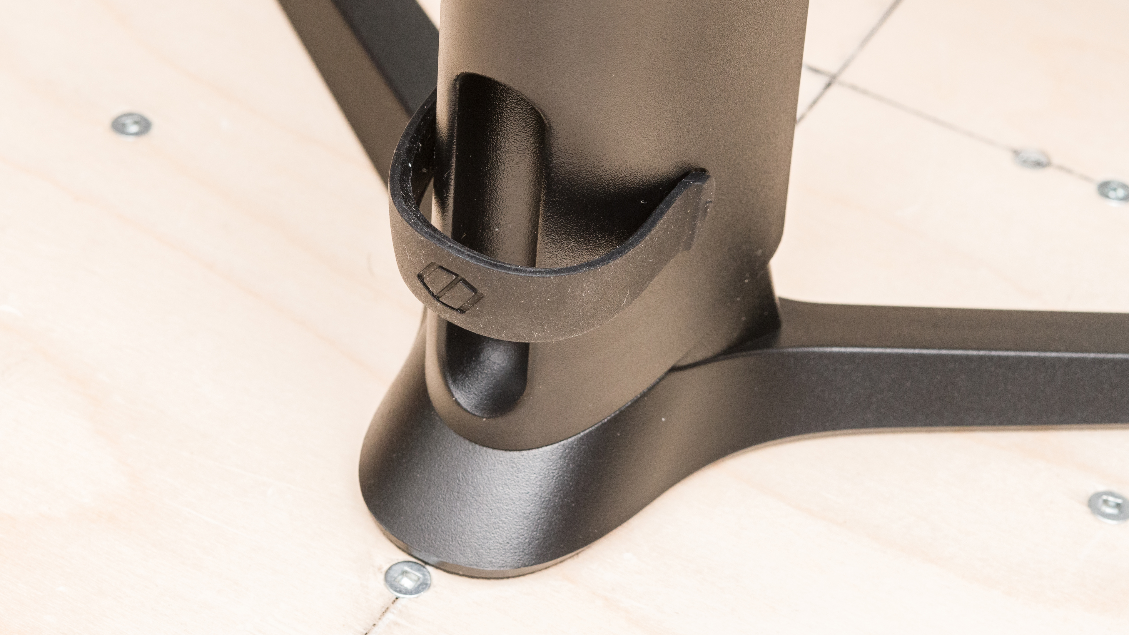This monitor has fantastic ergonomics, as you can adjust it in many ways. Since you can only rotate it into portrait mode in one direction, the bottom-facing inputs will always be facing to the left when rotated, as you can see here. The back of the stand also features a clip for cable management.