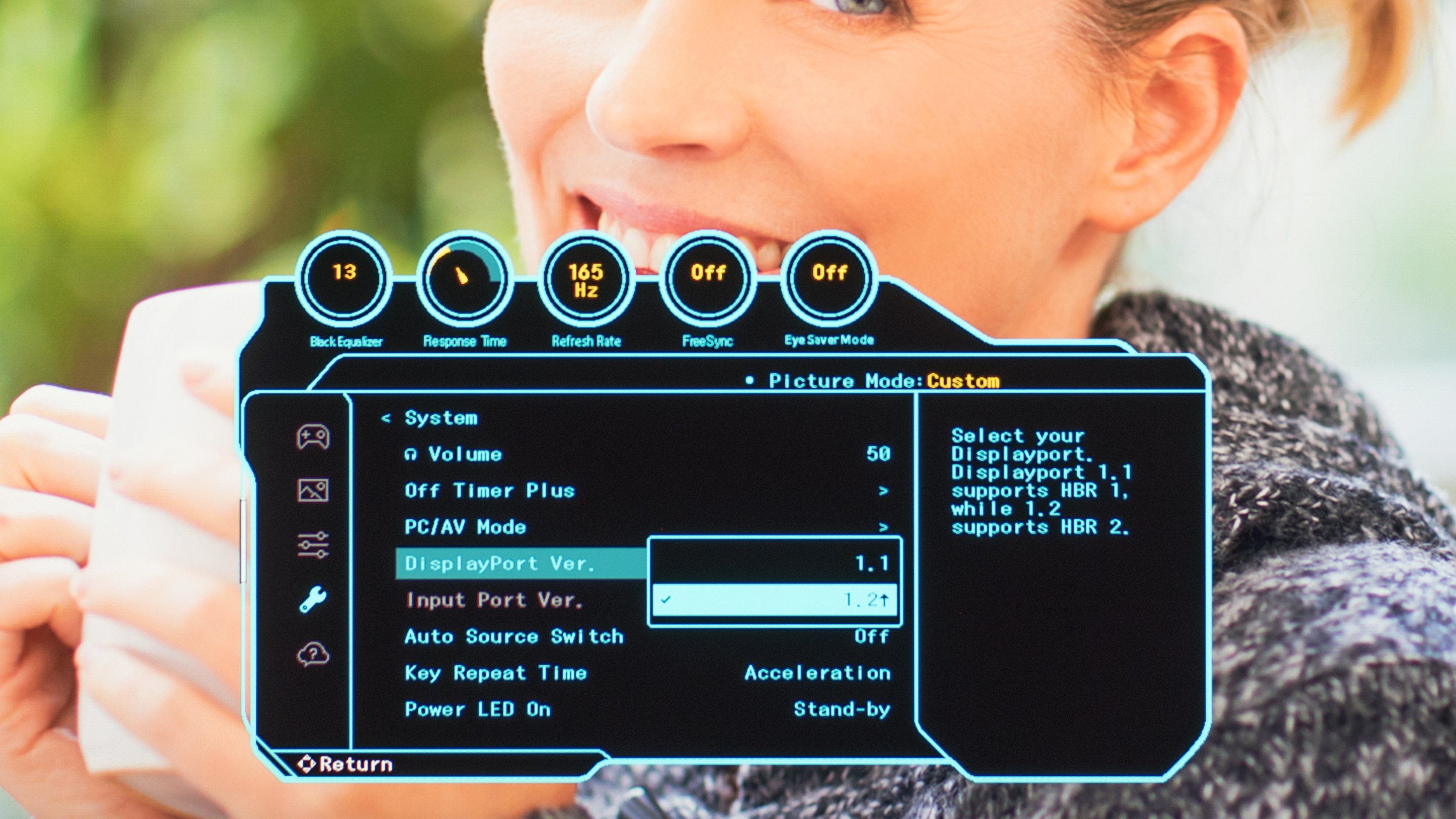 Although Samsung advertises that it supports DisplayPort 1.4, it's limited to DisplayPort 1.2 bandwidth. Even the on-screen display confirms that it supports DisplayPort 1.2, as you can see here.